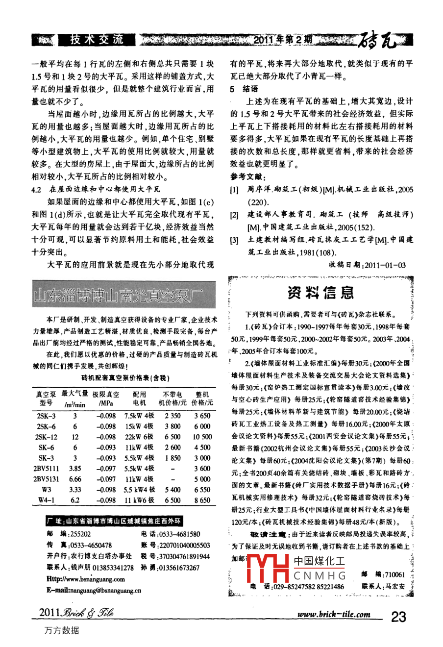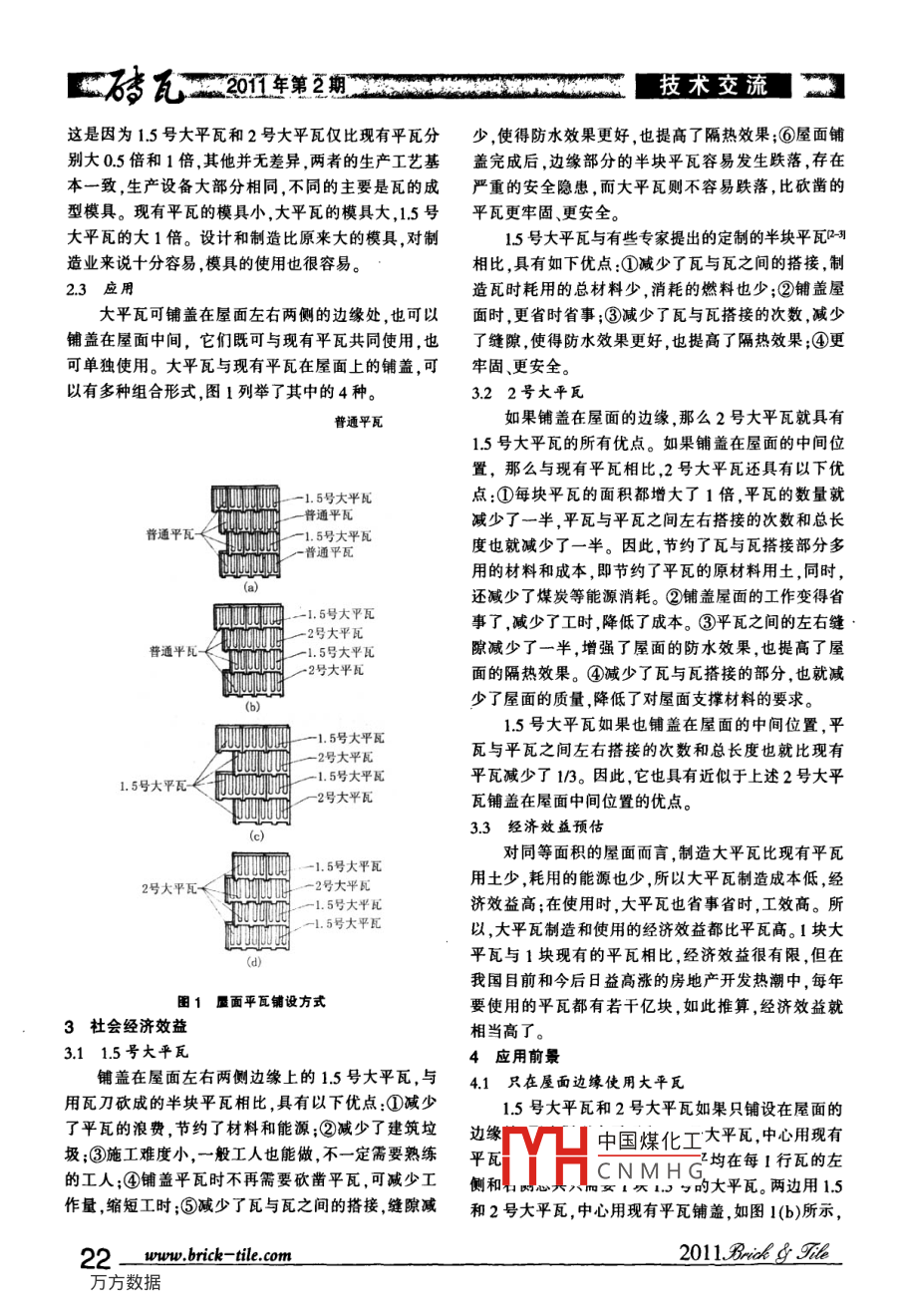 [技不稍們車2磚瓦大平瓦的設(shè)計及應(yīng)用湯先祥(揚州市職業(yè)大學(xué),江蘇揚州225002)摘要:闡迷了平瓦在建筑上的應(yīng)用現(xiàn)狀,設(shè)計了面積較大的大平瓦,并介紹了大平瓦的屋面鋪蓋方式生產(chǎn)特點、優(yōu)點,以及經(jīng)濟效益和應(yīng)用前景。關(guān)鍵詞:坡屋頂;大平瓦:設(shè)計;應(yīng)用中圖分類號:TU522062文獻標(biāo)識碼:B文章編號:1001-6945(2011)02-0021-03Design and application of big flat tileTANG Xian-riangAbstract: This article introduces a kind of big flat tile, and its covering ways, advantages, productioncharacteristice, economic benefits and application prospects.Key Words: slope roof, big flat tile, design, application1平瓦在建筑上的應(yīng)用現(xiàn)狀和范圍口要求平直,并且大小合適。這種手工砍瓦的做法缺自古以來,我國的房屋建筑一般都是采用坡屋點很多:一是浪費了平瓦;二是產(chǎn)生了建筑垃圾;三是頂坡屋頂上常用的屋面覆蓋材料是小青瓦。新中國要求瓦工必須要有熟練的砍鑿技術(shù);四是浪費工時。成立后,現(xiàn)代建筑逐漸增多,曾一度流行平屋頂,平屋為避免上述缺點,筆者設(shè)計了15號和2號大平瓦。頂便不再使用小青瓦了。平屋頂看上去新鮮洋氣,但21設(shè)計是有許多缺點,而且在長期的實踐使用和研究中,這15號大平瓦就是把現(xiàn)有的平瓦的寬邊增大,使些缺點都始終未能找到徹底解決的好方法。平屋頂存其有效面積等于現(xiàn)有平瓦的一塊半。它的主要作用是在的主要問題有:①屋面經(jīng)多次熱脹冷縮后,容易產(chǎn)代替一塊現(xiàn)有平瓦和被砍鑿成半塊的平瓦,用于鋪蓋生裂縫很難長期防水;②隔熱效果差;③平屋頂上常在屋面左右兩側(cè)的邊緣處,也可鋪在屋面的中間?,F(xiàn)有住戶存放雜物甚至搭建違章的矮棚;④平屋頂上有平瓦有Ⅰ型、Ⅱ型、Ⅲ型這3個型號叫,尺寸規(guī)格分常常散落著各種廢棄物,衛(wèi)生狀況差,影響市容;⑤平別為:400mm×240mm、380mmx225mm、360mmx屋頂造型單調(diào),形成的城市景觀不如坡屋頂豐富多220mm,因此1.5號大平瓦也應(yīng)有相應(yīng)的3個型號,彩。由于這些原因,“平改坡風(fēng)行一時坡屋頂重新被尺寸規(guī)格分別為:400mmx360mm380mm×3375mm、大力推廣和應(yīng)用。360 mmx 330 mm.坡形屋面上一般都要蓋瓦,由于平瓦的優(yōu)點較2號大平瓦就是把現(xiàn)有平瓦的寬邊增大,使其有多,所以現(xiàn)在越來越多的坡屋面都蓋上了平瓦。而小效面積等于兩塊現(xiàn)有平瓦,它的主要作用是同時代替青瓦的使用范圍,則基本局限于古典建筑和園林等兩塊現(xiàn)有平瓦,既可鋪在屋面邊緣,也可鋪在屋面中處,使用量已大大減少間?,F(xiàn)有平瓦有3個型號,所以2號大平瓦同樣也有2大平瓦的設(shè)計、制造和應(yīng)用相應(yīng)的3個刑號尺計和格分別:400mx480m、在坡屋面上鋪蓋平瓦時,一般在屋面左右兩側(cè)的380中國煤化工邊緣處都要鋪設(shè)半塊平瓦。半塊平瓦的獲得,一般是22CNMHG用瓦刀將一塊完整的平瓦砍半而成,這半塊平瓦的鑿大平瓦的生產(chǎn)工藝和現(xiàn)有平瓦的生產(chǎn)差異不大,-2011noggabewwwe.brick-tile.com_2〓磚瓦=1年期【技術(shù)流二這是因為15號大平瓦和2號大平瓦僅比現(xiàn)有平瓦分少,使得防水效果更好,也提高了隔熱效果;⑥屋面鋪別大05倍和1倍,其他并無差異,兩者的生產(chǎn)工藝基蓋完成后,邊緣部分的半塊平瓦容易發(fā)生跌落,存在本一致,生產(chǎn)設(shè)備大部分相同,不同的主要是瓦的成嚴(yán)重的安全隱患,而大平瓦則不容易跌落,比砍鑿的型模具?,F(xiàn)有平瓦的模具小,大平瓦的模具大,15號平瓦更牢固、更安全。大平瓦的大1倍。設(shè)計和制造比原來大的模具,對制15號大平瓦與有些專家提出的定制的半塊平瓦口習(xí)造業(yè)來說十分容易模具的使用也很容易。相比,具有如下優(yōu)點:①減少了瓦與瓦之間的搭接,制23應(yīng)用造瓦時耗用的總材料少,消耗的燃料也少;②鋪蓋屋大平瓦可鋪蓋在屋面左右兩側(cè)的邊緣處,也可以面時,更省時省事;③減少了瓦與瓦搭接的次數(shù)減少鋪蓋在屋面中間,它們既可與現(xiàn)有平瓦共同使用,也了縫隙,使得防水效果更好,也提高了隔熱效果:④更可單獨使用。大平瓦與現(xiàn)有平瓦在屋面上的鋪蓋可牢固、更安全。以有多種組合形式圖1列舉了其中的4種。3.22號大平瓦普通平瓦如果鋪蓋在屋面的邊緣,那么2號大平瓦就具有15號大平瓦的所有優(yōu)點。如果鋪蓋在屋面的中間位置,那么與現(xiàn)有平瓦相比,2號大平瓦還具有以下優(yōu)1.5號大平瓦點:①每塊平瓦的面積都增大了1倍,平瓦的數(shù)量就鋒通平瓦減少了一半,平瓦與平瓦之間左右搭接的次數(shù)和總長普通平瓦1.5號大平瓦普通平瓦度也就減少了一半。因此,節(jié)約了瓦與瓦搭接部分多用的材料和成本,即節(jié)約了平瓦的原材料用土,同時還減少了煤炭等能源消耗。②鋪蓋屋面的工作變得省畫m1.5號大平瓦事了,減少了工時降低了成本。③平瓦之間的左右縫:3大隙減少了一半,增強了屋面的防水效果,也提高了屋2號大平瓦面的隔熱效果。④減少了瓦與瓦搭接的部分,也就減少了屋面的質(zhì)量降低了對屋面支撐材料的要求。15號大平瓦如果也鋪蓋在屋面的中間位置,平1.5號大平瓦2號大平瓦瓦與平瓦之間左右搭接的次數(shù)和總長度也就比現(xiàn)有1.5號大平瓦1.5號大平瓦平瓦減少了1/3