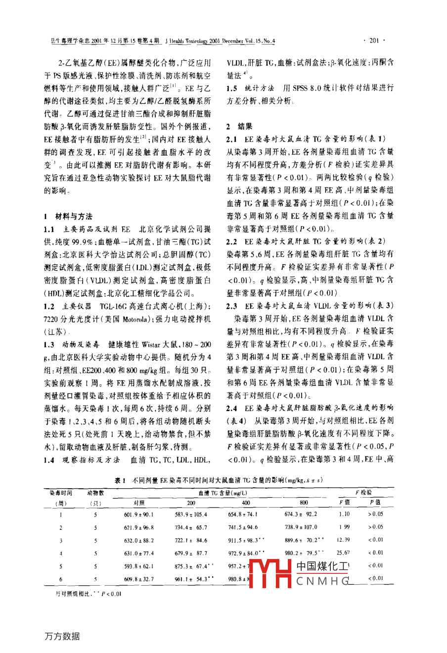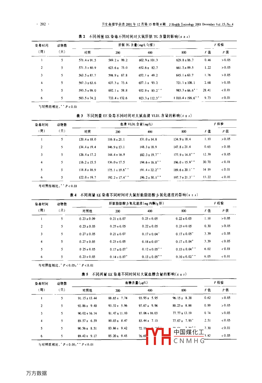生毒理學(xué)雜志20014年12月第15卷第4期 J Health Toxicology20010 December.15,No4論著二乙氧基乙醇對大鼠脂、糖代謝的影響房軍,常元勛',馬文軍1,崔京偉',劉永泉2,高星(1.北京醫(yī)科大學(xué)勞動衛(wèi)生教研室,北京10083;2.北京市海淀區(qū)衛(wèi)生監(jiān)督所;3.北京市預(yù)防醫(yī)學(xué)研究中心)【摘要】目的探討2乙氧基醉(EE〕染毒對大鼠某些脂代謝揹標(biāo)和血糖的影響及其可能機(jī)制。方法選取雄性Wsar大鼠隨機(jī)分為4組:對照組EE200400和800mg/kg組。每天胃染毒I次,每周6次,持續(xù)6周分別于每周后,將各組動物隨機(jī)處死5只、對血液及肝臟中的脂代謝指標(biāo)進(jìn)行測定,結(jié)果從第3周升始EE染毒大鼠血清甘油二酯(TC)含量(89.6±70.,2)mg/L顯著高于對照組(6320±82)mgL,血消極低密度脂蛋白(vm含蛙(17.9±14.0)mg/L顯著高于對照組(126.4:17.2)mg/L;肝臟脂肪酸β-氧化速度從第3周開始品著低丁對照組;肝臟TG含量僅在染毒第5和6周,中,高劑量組顯著高于對照組;血清含量從第4周開始僅中或高劑壘組顯著降低;血清總膽固醇(TC)、高密度脂蛋閂(HDL)和低密度脂蛋白(LL)含量未發(fā)牛顯著性改變。結(jié)論EE長期染毒可對大鼠胎糖代謝造成一定影響【關(guān)鍵詞】2乙氧基乙醇;脂代謝;大鼠中圖分類號:R4文獻(xiàn)標(biāo)識碼:A文章編號:1002-3127(2001)104-0200The effects of 2-ethoxyethanol on fat and glucose metabolism in rats FANC Jun, Chang Yuan-xun MA Wen-jun, t al Department of Occ ationa! Health, Beiing Medical lininersuy, Beiying 100083. China(Abstract] Objective To determine whether 2-ethoxyethanol( EE)can affect the fat and glucose metabolism and exploretheir possible mechanism Methods The rats were gavaged with 0, 200, 400 and 800 mg/kg EE daily, 6 days a week. for 6 weeksoxidation metabolism of fatty acid, the contents of TG in liver and TG, TC, glucose, VLDL, HDL and LDl, in serum were assayedat every week. Results The levels of TC( 889. 6+ 70. 2)mg/L and VLDL(177. 9+ 14)mg/L inom the third week compared with the control(632.0+ 88. 2)mg/L and( 126. 4# 17. 2tabolism of fatty acid in ral's liver was significantly decreased fron the third week and the levels of TG in liver were significantlyelevaled only at doses of 400 and 800 mg/kg EE at the fifth and sixth week. The level of glucose in serum were significantly re-luced just al doses of 400 or 800 mg/kg EE from the forth week. Bul no significant changes were detected in TC. HDL and LDL iserum. Conclusion The results indicated thal FE. could affect the metabolism of fat and glucose in rats【 Key words】:2- Ethoxyethanol; Fat metabolism;Rat者筒介;房軍,男,28歲,碘十,研究方向:環(huán)境彭理參考文獻(xiàn)mental antiandrogen: the fungicide vinclozolin alters ex differentiationi Crisp TM, Clegg Ed, Cooper RL, rt al. Environmental endocrineof the male rat. Toxicol Appl Pharmacol. 1994, 124: 46-52disruption: an effects assessment and analysis. F.nviron Health Peran JW. Carney EW. Evaluation of EDSTAC femalepubertal assay in CD rads using 17b-estradiol, steroid biosynthesis in-2 Garcia P, Saceda M, Kenney N. pt al. fffect of cadmium on estro-hibitors, and a thvroid inhibitor. Toxeol Si, 1999, 52: 269-277gen reeeptor levels and estrogen-indured responses in human breast i 61 Levy JR, Faber KA, Ayyash L. The effect of prenatal expoure kocancer cells. J Biol Chem, 1994. 269: I6896-16901lyloeslrogen genistein on sexual differentiation in rats. Proc Soc Exp31 Stoica A, Katenellenhogen BS, Martin MB. Activation of estrogen中國煤化工receptor-a by the heavy metal cadminm. Mol Endocrinol, 2000, 14inhibtion of rainbow trout545-553CN MH Activity by cadnium.Biol4 Grav LE. Ostby JS, Kelee WR, Developmental effects of an environ-eprd,200,63:25926(收橘日期:2000-12旦什毒理學(xué)雜志2001年12月第5卷第4期 5 Ileal Toxico200 Bete.5No42乙氧基乙醇(E)屬醇醚類化合物,廣泛應(yīng)用VLDL,肝臟TG,血糖:試劑盒法;氧化速度:丙酮含于巧S版感光液、保護(hù)性涂膜、清洗劑、防凍劑和航空量法“。燃料等生產(chǎn)和使用領(lǐng)域,接觸人群廣泛"。EE與乙1.5統(tǒng)計方法用SFSS8.0統(tǒng)計軟件對結(jié)果進(jìn)行醇的代謝途徑類似,均主要為乙醇/乙醛脫氫酶系所方差分析、相關(guān)分析代謝。乙醇可通過促進(jìn)甘油三酯合成和抑制肝臟脂肪酸3氧化而誘發(fā)肝臟脂肪變性。國外個例報道,2結(jié)果EE接觸者中有脂肪肝的發(fā)生2;國內(nèi)對EE接觸人2.1EE染毒對大鼠血清T含量的影響(表1)群的調(diào)查發(fā)現(xiàn),EE可引起接觸者血脂水平的改從染毒第3周開始,EE各劑量染毒組血清TC含量變。由此可以推測EE對脂眆代謝有影響。本研均有不同程度升高,方差分析(F檢驗)證實差異具究旨在通過亞急性動物實驗探討EE對大鼠脂代謝有非常顯著性(P<0.01)兩兩比較檢驗(q檢驗)的影響顯示,在染毒第3周和第4周EE高、中劑量染毒組血清TG含量非常顯著高于對照組(P<0.01);在染1材料與方法毒第5周和第6周EE各劑量染毒組血清T含量1.1主要藥品及試劑EE北京化學(xué)試劑公司提非常顯著高于對照組(P<0.01)供,純度99%;血糖單一試劑盒,甘油三酯(TG)試2.2EE染每對大鼠肝臟TG含量的影響(表2)劑盒:北京醫(yī)科大學(xué)怡達(dá)試劑公司;總膽固醇(TC)染毒第5、6周,EE各劑量染毒組肝臟TG含量均有測定試劑盒,低密度脂蛋白(DL)測定試劑盒極低不同程度升高。F檢驗證實差異有非常顯著性(P密度脂蛋白(VLD)測定試劑盒,高密度脂蛋白<0.01)。g檢驗顯示高、中劑量染毒組肝臟Tc含(HDL)測定試劑盒:北京化工精細(xì)化學(xué)品公司。量非常顯著高于對照組(P<001)12主要儀器TGLl6C高速臺式離心機(j