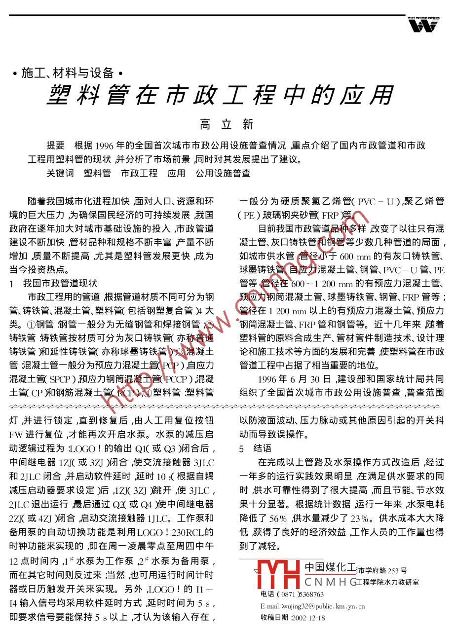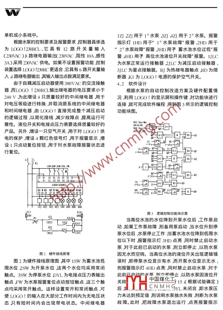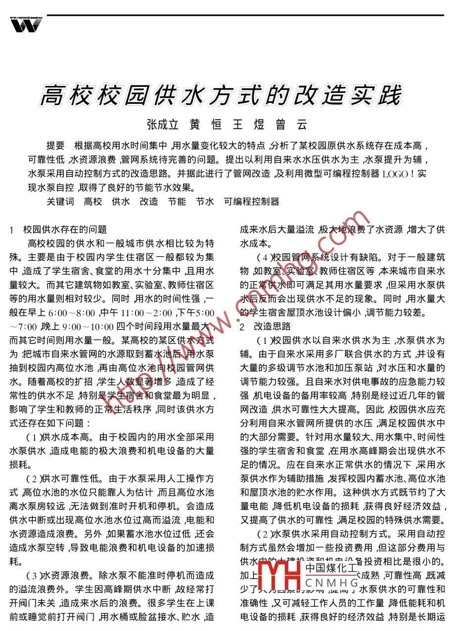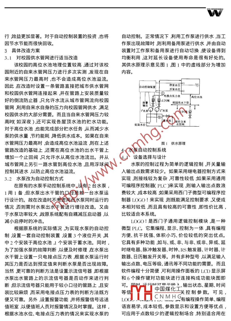 高校校園供水方式的改造實踐張成立黃恒王煜曾云提要根據(jù)高校用水時間集中用水量變化較大的特點分析了某校園原供水系統(tǒng)存在成本高可靠性低水資源浪費管網(wǎng)系統(tǒng)待完善的問題。提出以利用自來水水壓供水為主水泵提升為輔水泵采用自動控制方式的改造思路。并據(jù)此進行了管網(wǎng)改造及利用微型可編程控制器LOGO!實現(xiàn)水泵自控取得了良好的節(jié)能節(jié)水效果。關鍵詞高校供水改造節(jié)能節(jié)水可編程控制器1校園供水存在的問題成來水后大量溢流極大地浪費了水資源增大了供高校校園的供水和一般城市供水相比較為特水成本。殊。主要是由于校園內學生住宿區(qū)一般都較為集(4)校園管網(wǎng)系統(tǒng)設計有缺陷。對于一般建筑中造成了學生宿舍、食堂的用水十分集中且用水物如教室、實驗室、教師住宿區(qū)等本來城市自來水量較大。而其它建筑物如教室、實驗室、教師住宿區(qū)的正常供水即可滿足其用水量要求但采用水泵供等的用水量則相對較少。同時用水的時間性強水后反而會出現(xiàn)供水不足的現(xiàn)象。同時用水量大般在早上6:00~8:00中午11:00~2:00,下午5:00的學生宿舍屋頂水池設計偏小調節(jié)能力較差7:00晚上9:00~10:00四個時間段用水量最大,2改造思路而其它時間則用水量一般。某高校的某區(qū)供水方式(1)校園供水以自來水供水為主水泵供水為為把城市自來水管網(wǎng)的水源取到蓄水池后用水泵輔。由于自來水采用多廠聯(lián)合供水的方式并設有抽到校園內高位水池再由高位水池向校園管網(wǎng)供大量的多級調節(jié)水池和加壓泵站對水壓和水量的水。隨著髙校的擴招學生人數(shù)顯著增多造成了經(jīng)調節(jié)能勹較強。且自來水對供電事故的應急能力較常性的供水不足特別是學生宿舍和食堂最為明顯,強機電設備的備用率較高特別是經(jīng)過近幾年的管影響了學生和教師的正常生活秩序,同時該供水方網(wǎng)改造供水可靠性大大提高。因此校園供水應充式還存在如下問題分利用自來水管網(wǎng)所提供的水壓滿足校園供水中(1腆烘水成本高。由于校園內的用水全部采用的大部分需要。針對用水量較大、用水集中、時間性水泵供水造成電能的極大浪費和機電設備的大量強的學生宿舍和食堂在用水高峰期會出現(xiàn)供水不損耗。足的情況。應在自來水正常供水的情況下采用水2)供水可靠性低。由于水泵采用人工操作方泵供水作為輔助措施發(fā)揮校園內蓄水池、高位水池式高位水池的水位只能靠人為估計而且高位水池和屋頂水池的貯水作用。這種供水方式既節(jié)約了大離水泵房較遠無法做到準時開機和停機。會造成量電能降低機電設備的損耗獲得良好經(jīng)濟效益供水中斷或岀現(xiàn)高位水池水位過高而溢流電能和又提高了供水的可靠性滿足校園的特殊供水需要。水資源造成浪費。另外如果蓄水池水位過低還會(2冰泵供水采用自動控制方式。采用自動控造成水泵空轉導致電能浪費和機電設備的加速損制方式雖然會增加一些投資費用但這部分費用與耗。供水濃相九備投資相比是很小的3冰資源浪費。除水泵不能準時停機而造成加上弌成熟可靠性高既減的溢流浪費外。學生因高峰期供水中斷故經(jīng)常打少了頭叫問了水泵供水的可靠性和開閥門未關造成來水后的浪費。很多學生在上課準確性又可減輕工作人員的工作量降低能耗和機前或睡覺前打開閥門用水桶或臉盆接水、貯水造電設備的損耗獲得良好的經(jīng)濟效益特別是長期運66給水排水ol.29No.42003行效益更加顯著。對于自動控制裝置的投資也將自動控制。正常情況下利用工作泵進行供水當工因節(jié)水節(jié)能而很快回收。作泵出現(xiàn)故障時則利用備用泵進行供水并由自動3具體改造方案裝置對工作泵和備用泵進行自動切換使設備得到3.1對校園供水管網(wǎng)進行適當改造均衡利用這對延長設備使用壽命是很有好處的。該校園的高位水池地理位置較高通過對該校其供水原理示意見圖1圖1中的虛線部分為增加園附近的自來水管網(wǎng)壓力進行多次實測發(fā)現(xiàn)在自內容來水管網(wǎng)壓力最高時,也不會造成高位水池溢流。因此在改造時設置一條管路直接把城市供水管網(wǎng)自動控制裝置亭泵水位開泵水和校園供水管網(wǎng)連接起來并在管路上安裝質量較電接點壓力表高位水池好的倒流防止器只允許水流從城市管網(wǎng)流向校園止回閥校園供水干管管網(wǎng)利用自來水自身的壓力向校園管網(wǎng)供水滿足2”水泵校園供水的大部分需要。而且當自來水管網(wǎng)壓力較高時如深夜)還可實現(xiàn)各屋頂水池的貯水功能。都水池城市自來對于高位水池也能完成部分貯水任務從而減少水泵的供水量,節(jié)約能耗降低供水成本。如果在自來水管網(wǎng)壓力最高時會造成高位水池溢流則在上述圖1供水原理管路改造的基礎上還需在高位水池的岀水干管上4水泵自動控制系統(tǒng)增加一個止回閥只允許水從高位水池流出。并從4.1設備選擇與設計城市管網(wǎng)上另引一路水管到高位水池且用浮球閥水泵的控制過程為簡單的邏輯控制,開關量輸控制其進水以防止高位水池溢流。入輸出點數(shù)需求較少。如果采用繼電器控制方式來3.2水泵改為自動控制方式實現(xiàn)則