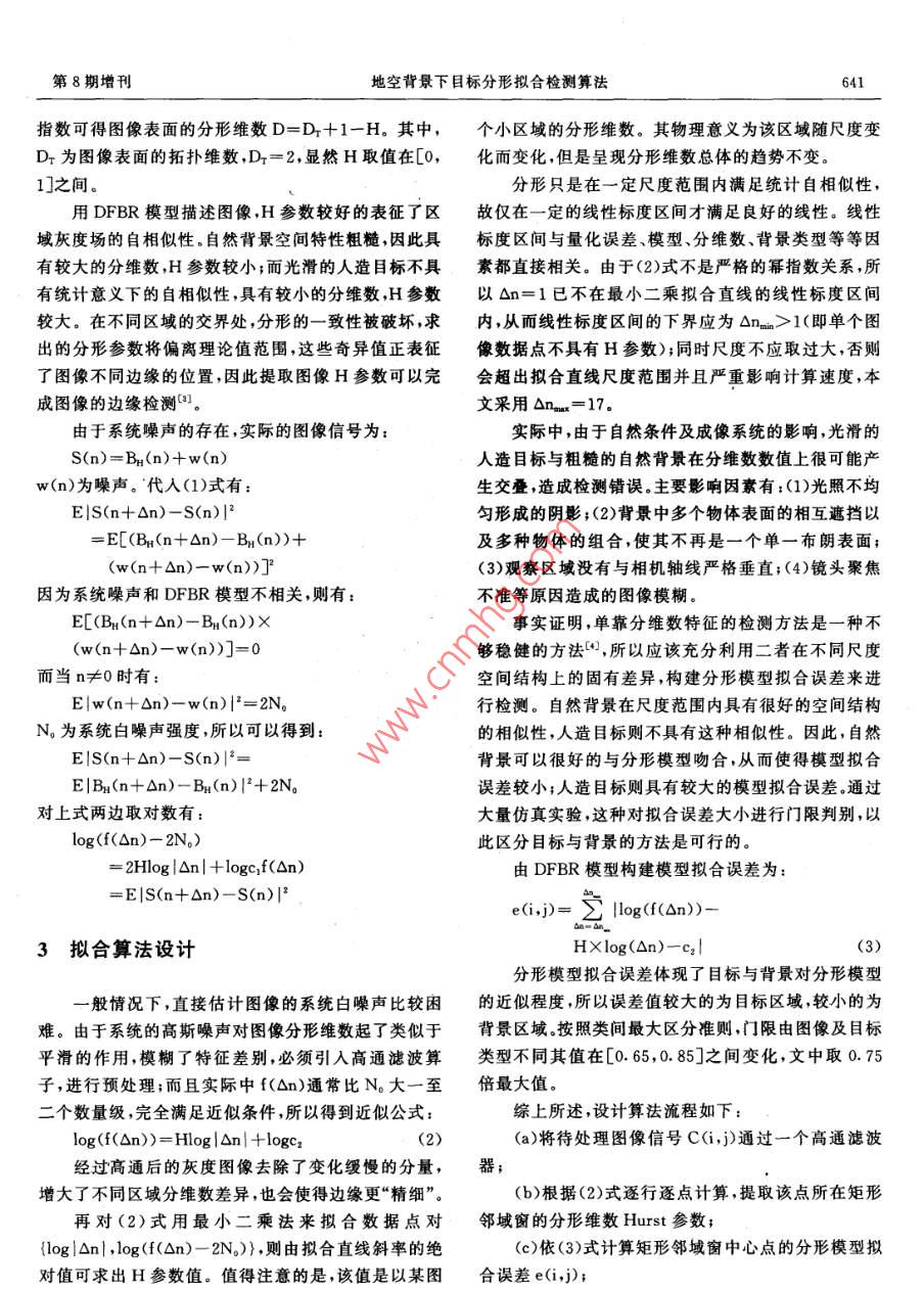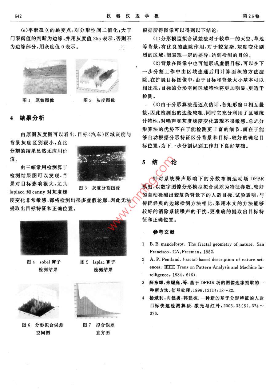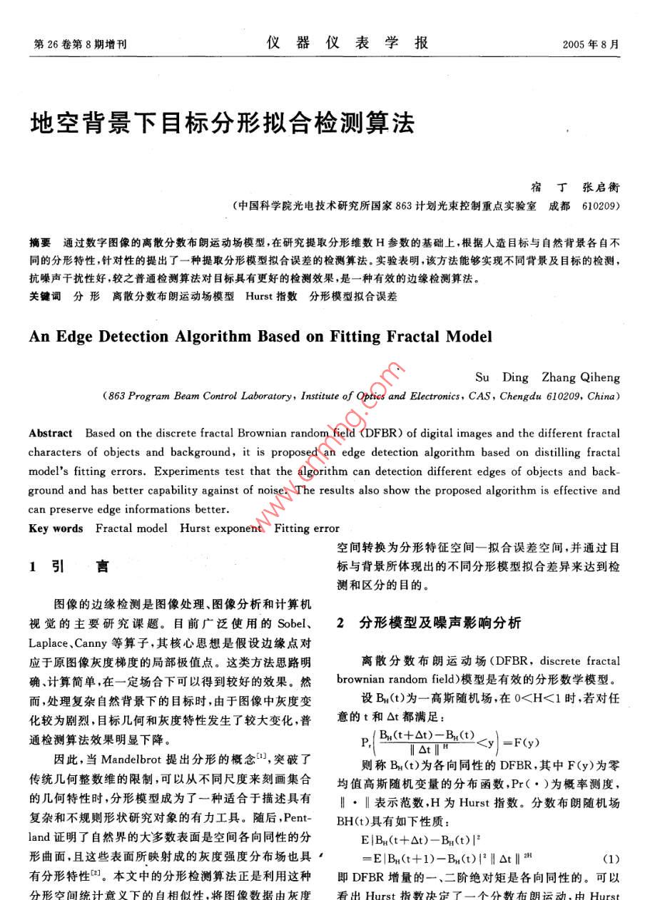 第26卷第8期增刊儀器儀表學(xué)報(bào)2005年8月地空背景下目標(biāo)分形擬合檢測(cè)算法宿丁張啟衡(中國(guó)科學(xué)院光電技術(shù)研究所國(guó)家863計(jì)劃光束控制重點(diǎn)實(shí)驗(yàn)室成都610209)摘要通過(guò)數(shù)字圖像的離散分?jǐn)?shù)布朗運(yùn)動(dòng)場(chǎng)模型,在研究提取分形維數(shù)H參數(shù)的基礎(chǔ)上,根據(jù)人造目標(biāo)與自然背景各自不同的分形特性,針對(duì)性的提出了一種提取分形模型擬合誤差的檢測(cè)算法。實(shí)驗(yàn)表明,該方法能夠?qū)崿F(xiàn)不同背景及目標(biāo)的檢測(cè),抗噪聲干擾性好,較之普通檢測(cè)算法對(duì)目標(biāo)具有更好的檢測(cè)效果,是一種有效的邊緣檢測(cè)算法,關(guān)鍵詞分形離散分?jǐn)?shù)布朗運(yùn)動(dòng)場(chǎng)模型 Hurst指數(shù)分形模型擬合誤差A(yù)n Edge Detection Algorithm Based on Fitting Fractal Modelg(863 Program Beam Controd Laboratory, Institute of Optics and Electronics, CAS, Chengdu 610209, China)Abstract Based on the discrete fractal Brownian random field (DFBR) of digital images and the different fractalcharacters of objects and background, it is proposed an edge detection algorithm based on distilling fractalmodels fitting errors. Experiments test that the algorithm can detection different edges of objects and background and has better capability against of noise The results also show the proposed algorithm is effective andcan preserve edge informations betterKey words Fractal model Hurst exponent Fitting error空間轉(zhuǎn)換為分形特征空間一擬合誤差空間,并通過(guò)目1引言標(biāo)與背景所體現(xiàn)出的不同分形模型擬合差異來(lái)達(dá)到檢測(cè)和區(qū)分的目的。圖像的邊緣檢測(cè)是圖像處理、圖像分析和計(jì)算機(jī)視覺(jué)的主要研究課題。目前廣泛使用的 Sobel、2分形模型及噪聲影響分析Laplace、 Canny等算子,其核心思想是假設(shè)邊緣點(diǎn)對(duì)應(yīng)于原圖像灰度梯度的局部極值點(diǎn)。這類(lèi)方法思路明離散分?jǐn)?shù)布朗運(yùn)動(dòng)場(chǎng)(DFBR, discrete fractal確計(jì)算簡(jiǎn)單在一定場(chǎng)合下可以得到較好的效果。然 brownian random field)模型是有效的分形數(shù)學(xué)模型。而,處理復(fù)雜自然背景下的目標(biāo)時(shí),由于圖像中灰度變?cè)O(shè)Bn(t)為一高斯隨機(jī)場(chǎng),在01(即單個(gè)圖出的分形參數(shù)將偏離理論值范圍,這些奇異值正表征像數(shù)據(jù)點(diǎn)不具有H參數(shù));同時(shí)尺度不應(yīng)取過(guò)大,否則了圖像不同邊緣的位置,因此提取圖像H參數(shù)可以完會(huì)超出擬合直線尺度范圍并且嚴(yán)重影響計(jì)算速度,本成圖像的邊緣檢測(cè)文采用△r由于系統(tǒng)噪聲的存在,實(shí)際的圖像信號(hào)為實(shí)際中,由于自然條件及成像系統(tǒng)的影響,光滑的S(n)=Bu(n)+w(n)人造目標(biāo)與粗糙的自然背景在分維數(shù)數(shù)值上很可能產(chǎn)(n)為噪聲。代入(1)式有生交疊,造成檢測(cè)錯(cuò)誤。主要影響因素有:(1)光照不均E|S(n+△n)-S(n)|2勻形成的陰影;(2)背景中多個(gè)物體表面的相互遮擋以=EL(Bu(n+An)-BH(n))+及多種物體的組合,使其不再是一個(gè)單一布朗表面;(w(n+△n)-w(n))]2(3)觀察區(qū)域沒(méi)有與相機(jī)軸線嚴(yán)格垂直;(4)鏡頭聚焦因?yàn)橄到y(tǒng)噪聲和DFBR模型不相關(guān),則有:不準(zhǔn)等原因造成的圖像模糊。EL(B1(n+△n)-B1(n))事實(shí)證明,單靠分維數(shù)特征的檢測(cè)方法是一種不(w(n+△n)-w(n))]=0夠穩(wěn)健的方法,所以應(yīng)該充分利用二者在不同尺度而當(dāng)n≠0時(shí)有:空間結(jié)構(gòu)上的固有差異,構(gòu)建分形模型擬合誤差來(lái)進(jìn)E|w(n+△n)-w(n)|2=2N。行檢測(cè)。自然背景在尺度范圍內(nèi)具有很好的空間結(jié)構(gòu)N。為系統(tǒng)白噪聲強(qiáng)度,所以可以得到的相似性,人造目標(biāo)則不具有這種相似性。因此,自然E|S(n+△n)-S(n)|2=背景可以很好的與分形模型吻合,從而使得模型擬合EIB(n+An)-BH(n)2+2N誤差較小;人造目標(biāo)則具有較大的模型擬合誤差通過(guò)對(duì)上式兩邊取對(duì)數(shù)有:大量仿真實(shí)驗(yàn),這種對(duì)擬合誤差大小進(jìn)行門(mén)限判別,以log(f(△n)-2N。)此區(qū)分目標(biāo)與背景的方法是可行的2Hlog|△n|+ logc, f(△n)由DFBR模型構(gòu)建模型擬合誤差為:=E|S(n+△n)-Sn)|2e(i,j)=∑llg(f(△n))3擬合算法設(shè)計(jì)HXlog(△n)-c2l分形模型擬合誤差體現(xiàn)了目標(biāo)與背景對(duì)分形模型般情況下,直接估計(jì)圖像的系統(tǒng)白噪聲比較困的近似程度,所以誤差值較大的為目標(biāo)區(qū)域,較小的為難。由于系統(tǒng)的高斯噪聲對(duì)圖像分形維數(shù)起了類(lèi)似于背景區(qū)域。按照類(lèi)間最大區(qū)分準(zhǔn)則,門(mén)限由圖像及目標(biāo)平滑的作用,模糊了特征差別,必須引入高通濾波算類(lèi)型不同其值在[0.65,0.85]之間變化,文中取0.75子,進(jìn)行預(yù)處理;而且實(shí)際中f(△n)通常比N。大一至倍最大值。二個(gè)數(shù)量級(jí),完全滿足近似條件,所以得到近似公式綜上所述,設(shè)計(jì)算法流程如下log(f(△n))=Hlog|△n|+logc2(2)(a)將待處理圖像信號(hào)C(i,j通過(guò)一個(gè)高通濾波經(jīng)過(guò)高通后的灰度圖像去除了變化緩慢的分量,器增大了不同區(qū)域分維數(shù)差異,也會(huì)使得邊緣更“精細(xì)”。b)根據(jù)(2)式逐行逐