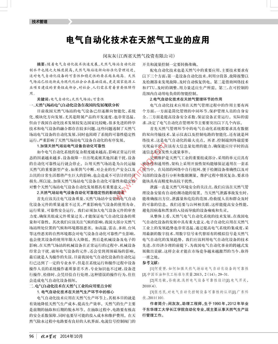 技術(shù)管理電氣自動(dòng)化技術(shù)在天然氣工業(yè)的應(yīng)用閔灰灰(江西省天然氣投資有限公司)摘要:隨著電氣自動(dòng)化技術(shù)快速發(fā)展,天然氣場(chǎng)站自動(dòng)化控開(kāi) 關(guān)和流量控制一定要轉(zhuǎn)換準(zhǔn)確。制水平也隨之大幅度提高,天然氣場(chǎng)站逐漸向標(biāo)準(zhǔn)化管理邁進(jìn),配電自動(dòng)化技術(shù)也是天然氣中的重要應(yīng)用,主要技術(shù)要求有這對(duì)電氣自動(dòng)化設(shè)備的可靠性和穩(wěn)定性的要求越來(lái)越高。天然以下三個(gè)方面:第一 -是設(shè)備自動(dòng)化技術(shù),利用分段器、故障報(bào)警以氣場(chǎng)站已經(jīng)逐漸成為現(xiàn)代化社會(huì)公共基礎(chǔ)設(shè)施,更是國(guó)家能源工及 檢測(cè)器來(lái)發(fā)現(xiàn)故障,及時(shí)自動(dòng)恢復(fù)供電。第二是借助網(wǎng)絡(luò)技術(shù)業(yè)項(xiàng)目建設(shè)的重要組成部分,對(duì)社會(huì)、人們需求有著重要保障作和FTU, 及時(shí)的調(diào)整,用力量適應(yīng)生產(chǎn)所需。第三,在可控制的用范圍內(nèi)自動(dòng)用電負(fù)荷的智能控制。關(guān)鍵詞:電氣自動(dòng)化;天然氣場(chǎng)站;可靠性2.電氣自動(dòng)化技術(shù)在天然氣管理環(huán)節(jié)的作用一.天然氣(場(chǎng)站電氣自動(dòng)化設(shè)備在我國(guó)的發(fā)展現(xiàn)狀分析電氣自動(dòng)化技術(shù)應(yīng)用在天然氣管理過(guò)程中的作用主要有兩目前我國(guó)天然氣場(chǎng)站的電氣設(shè)備已經(jīng)逐漸向智能化、系統(tǒng)個(gè)方面:一-方面是簡(jiǎn)化管理的中間環(huán)節(jié),保護(hù)管理人員的自身安化、模塊化方向發(fā)展,尤其是附屬產(chǎn)品的開(kāi)發(fā)速度,也非常迅猛,全,二方面是提高設(shè)備安全系數(shù),保證設(shè)備正常運(yùn)行。實(shí)際的需但由于我國(guó)自動(dòng)化技術(shù)發(fā)展較發(fā)達(dá)國(guó)家比較晚,很多先進(jìn)的科學(xué)求,決定了電氣自動(dòng)化在管理環(huán)節(jié)主要要突出以下幾個(gè)內(nèi)容。技術(shù)和電氣設(shè)備的融合都存在較多問(wèn)題,這些問(wèn)題遏制了天然氣首先天然氣管理環(huán)節(jié)中的電氣自動(dòng)化系統(tǒng)都要求具有數(shù)據(jù)場(chǎng)站電氣設(shè)備的自動(dòng)化發(fā)展,同時(shí)也阻礙了系統(tǒng)的可靠性穩(wěn)定性的雙向傳輸技術(shù),顯示儀表以及控制電路的智能化,還有就是網(wǎng)運(yùn)行,嚴(yán)重影響了天然氣場(chǎng)站電氣設(shè)備自動(dòng)化的有序發(fā)展。絡(luò)技術(shù),這是電氣自動(dòng)化的最大亮點(diǎn)。再者,控制端到終端需要1.加強(qiáng)天然氣場(chǎng)站電氣設(shè)備自動(dòng)化可靠性實(shí)現(xiàn)扁平化,應(yīng)該有大信息量處理的能力,確保能應(yīng)付平時(shí)的高如今電氣自動(dòng)化系統(tǒng)的復(fù)雜程度越來(lái)越高,影響正常運(yùn)行狀速 信息和突發(fā)性大流量事件。態(tài)的因素越來(lái)越多,設(shè)備故障--旦出現(xiàn)或被其他因素干擾,設(shè)備定期維護(hù)是天然氣工業(yè)的重要組成部分,采用的單元應(yīng)具有的自動(dòng)化可靠性運(yùn)行就會(huì)停止。公用天然氣場(chǎng)站是為公民運(yùn)輸模塊性和通用性,架構(gòu)上采用開(kāi)放性架構(gòu)能夠保證通用在--套系天然氣的重要新型產(chǎn)業(yè),如果供氣中斷,對(duì)企業(yè)的生產(chǎn)安全以及統(tǒng)當(dāng)中。在局部的網(wǎng)絡(luò)中自行組網(wǎng),便于檢測(cè)設(shè)備準(zhǔn)確性以及對(duì)公民的日常生活都將產(chǎn)生巨大的影響,也會(huì)造成不可估計(jì)的經(jīng)濟(jì)局部的設(shè)備進(jìn)行分析 和數(shù)據(jù)測(cè)量。維護(hù)過(guò)程中情況復(fù)雜,要求功損失,所以說(shuō),加強(qiáng)天然氣場(chǎng)站電氣設(shè)備自動(dòng)化可靠性和穩(wěn)定性能塊具有高精度和高抗干擾性。對(duì)整個(gè)天然氣場(chǎng)站電氣設(shè)備自動(dòng)化發(fā)展都具有重要意義。泄露一直是天然氣環(huán)境安全的關(guān)注點(diǎn),我們應(yīng)該在天然氣管2.天然氣場(chǎng)站電氣設(shè)備自動(dòng)化可靠穩(wěn)定性的影響因素理設(shè)備安裝有自動(dòng)檢測(cè)功能的裝置。當(dāng)天然氣泄露事故發(fā)生時(shí),首先應(yīng)該關(guān)注電氣設(shè)備質(zhì)量,天然氣場(chǎng)站中安裝的電氣自動(dòng)能準(zhǔn)確報(bào)出方位,泄露量和危險(xiǎn)的范圍,給救援人員和群眾及時(shí)化設(shè)備元件的質(zhì)量通常不過(guò)關(guān),嚴(yán)重影響電氣設(shè)備的使用壽命、的可靠的信息。我們還要與公網(wǎng)相關(guān)聯(lián),這樣能提高安全性能,運(yùn)行質(zhì)量、可靠性安全運(yùn)行。我們必須加大電氣設(shè)備元件的審查避 免因病毒和黑客的人侵而導(dǎo)致的設(shè)備癱瘓和失靈。力度,確保其組成元件質(zhì)量過(guò)關(guān),才能保證電氣自動(dòng)化設(shè)備的質(zhì)從整體上看,天然氣電氣自動(dòng)化系統(tǒng)的技術(shù)發(fā)展,在我國(guó)電量和可靠性。其次我們應(yīng)該關(guān)注氣候的影響,我國(guó)大部分天然氣氣自動(dòng)化設(shè)備的發(fā)展中具有重大意義,電子自動(dòng)化應(yīng)用在天然氣場(chǎng)站所處位置的氣候和環(huán)境都很惡劣。如