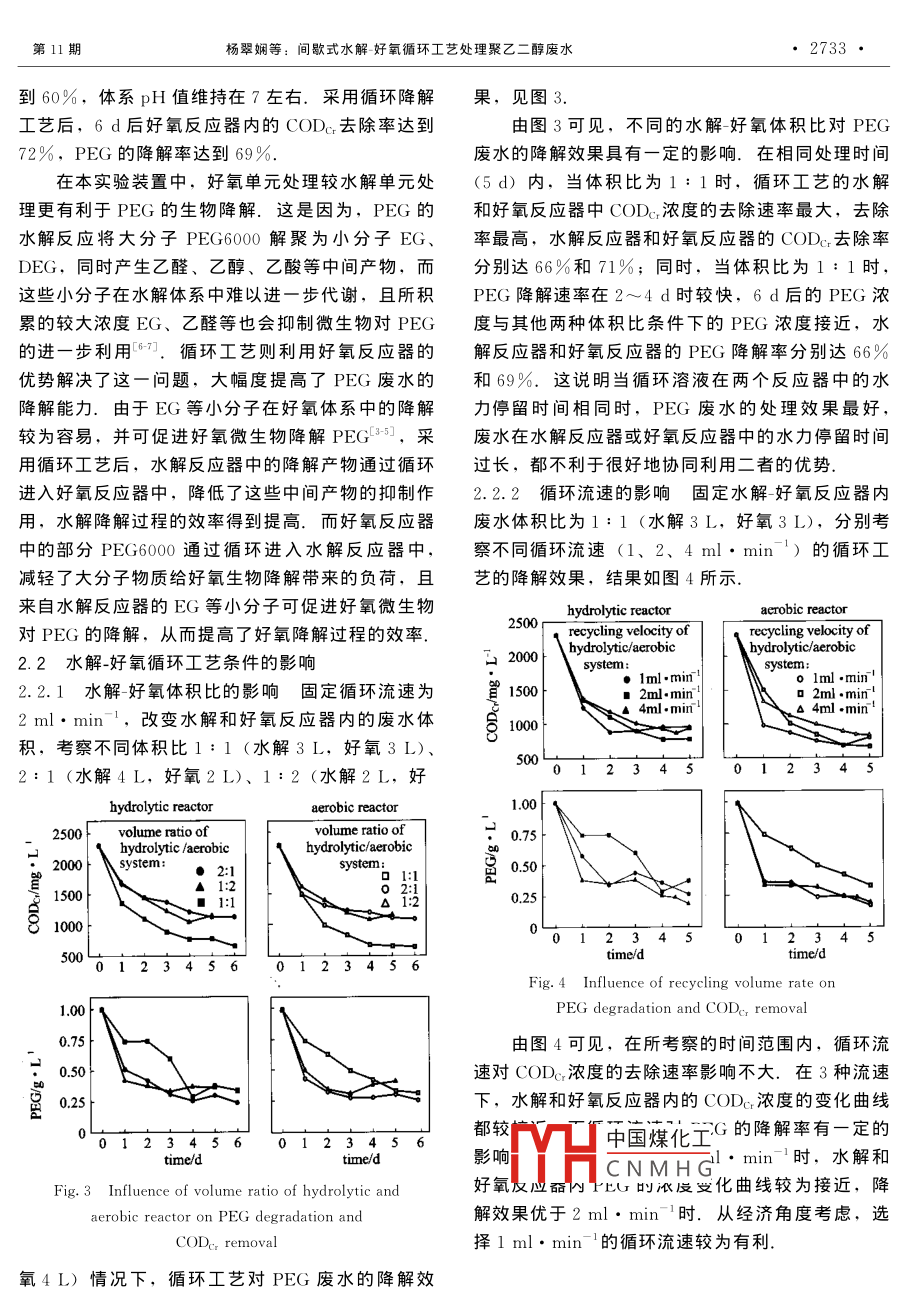 第57卷第11期化學報Vol.57 No. 112006年11月Journal of Chemical Industry and Engineering ( China)November 2006研究簡報間歇式水解好氧循環(huán)工藝處理聚乙二醇廢水楊翠嫻,李清彪,廖鑫凱,何寧, 盧英華,陳翠雪,洪金慶(廈門大學化學化工學院化學工程與生物工程系,化學生物學福建省重點實驗室,福建廈門361005)關鍵詞:水解;好氧;循環(huán)工藝; PEG廢水中圖分類號: TD 926.5文獻標識碼: A文章編號: 0438- 1157 (2006) 11- 2731- 04Treatment of PEG wastewater by batch-fed hydrolytic-aerobic recycling processYANG Cuixian, LI Qingbiao,LIAO Xinkai,HE Ning,LU Yinghua, CHEN Cuixue,HONG Jinqing( De partment of Chemical and Biochemical Engineering,Key Laboratory for Chemical Biology of Fujian Province, .School of Chemistry and Chemical Engineering,Xiamen University,Xiamen 361005,F(xiàn)ujian, China)Abstract: A novel batch-fed hydrolytic aerobic recycling process was used in the treatment of PEG-containing waste water and the performance of the process was studied. When the concentration of PEG6000and CODcr were l.0g. L-' and 2300 mg●L-' respectively, the hydrolytic-aerobic recycling process couldbetter degrade PEG than the single hydrolytic or aerobic sequencing batch reactor ( SBR) process. Therecycling rate and volume ratio of hydrolytic and aerobic system were two important parameters, whichinfluenced the treatment capacity of the recycling process. .Key words: hydrolytic; aerobic; recycling process; PEG- containing waste waterPEG在一定程度上可被專一性好氧菌或厭氧.引言菌降解53-8],Watson 和Jones'3] 利用污泥中分離出聚乙二醇( polyethylene glycol, 簡稱PEG)的好氧微生物降解PEG,發(fā)現(xiàn)PEG的分子量越屬于聚醚類高分子化合物,具有良好的溶解性、高,降解率越低.而Yamashita等8]也發(fā)現(xiàn),革蘭吸濕性、熱穩(wěn)定性,廣泛應用于許多工業(yè)領域中.陽性菌P seudonocardia可經(jīng)由多數(shù)人認可的有氧但由于PEG水溶性極強,不易熱解、水解,廢水代謝途徑降解PEG6000.厭氧處理對于降解大分處理中的膜過濾、活性炭過濾、O3氧化和H2O2子PEG尤為重要. Daryl 等[6]的研究表明,污泥中氧化等常規(guī)方法不能將其除去[-2],在環(huán)境中長期分離出的厭氧菌可較好地降解大分子PEG,12 d積累,對人類健康和自然生態(tài)環(huán)境造成危害.內(nèi)對PEG2000的降解率可達82%. Schink 等[7]進中國煤化工2006 -02 -24收到初稿,2006-05- 28收到修改稿.MYHCNMHG聯(lián)系人:李清彪、第一作者:楊翠嫻(1982- -), 女,碩士研Corresponding author: Prof. LI Qingbiao. E - mail: kelqb究生.@ xmu. edu. cn基金項目:國家自然科學基金項目(20076037).Foundation item: supported by the National Natural ScienceFoundation of China (20076037).●2732●學報第57卷-步發(fā)現(xiàn),PEG 的中間代謝產(chǎn)物會抑制其進-步左右,通過關閉或開啟蠕動泵3、5可以進行PEG降解、同時,本課題組的研究表明,水解-循環(huán)廢水的水解/好氧單元處理或循環(huán)處理,并控制循SBR工藝可有效地降解高濃度有機廢水[],因此,環(huán)流速.本文擬采用此工藝并利用好氧、水解活性污泥以降1.4 分析測定方法解PEG6000.反應周期內(nèi)定時取適量待測液,在3500 r●min-I轉(zhuǎn)速下離心15min除去懸浮菌體后分別測定.1材料和方法COD值、PEG含量和pH值,以分析生物降解效1.1 污泥果,化學耗氧量采用重鉻酸鉀法測定; PEG含量由廈門市污水處理廠泵站采集來的好氧活性污測定采用韓潤平等10]提出的硫氰鐵銨氯仿分光光泥經(jīng)馴化后接種于好氧反應器;由廈門市污水處理度法.廠儲泥池進泥口采集來的水解污泥經(jīng)馴化后接種于2結(jié)果與討論水解反應器.1.2模擬廢水的配制2.1單元降解與循環(huán)降解過程的比較所配制的每升模擬廢水中含: 1.0 g PEG6000、單元降解工藝及循環(huán)降解工藝對含PEG60000.819 g K2HPO、0.375 g KH2PO、0.5 g廢水的處理效果如圖2所示.NH4C1、0.25 g MgSO4●7H2O、0.5 g酵母粉、hydrolytie reactoraerobic reactor1.0 ml痕量元素(TE); 1.0 ml痕量元素中含:2500single processo single processCaCl2 0.04 mg,F(xiàn)eSO, ●7H2O 0.04 mg,MnSO,●recycling process0 recycling process2000H2O0.03 mg,ZnSO,●7H2O0. 02 mg,CuSO,●置15005H2O 0. 005 mg, CoCl2 ●6H2O 0. 005 mg,g 100Na2MO?!?H2O 0.005 mg.1.3 工藝流程與裝置500-0234560123456間歇式水解-好氧循環(huán)工藝的裝置與流程如圖11.00所示,實驗裝置主要由水解和好氧兩個反應器組成.水解反應器有效液體容積4L,磁力攪拌器控制攪拌速度為90 r. min-',溫度設定為37C;好品0.500.25氧反應器有效液體容積4 L,由空壓機進行曝氣,曝氣頭鼓氣量設定為0.5 L. min',溫度設定為00123456time/d30'C.兩反應器的污泥濃度保持在2000mg●L1Fig.2 Comparison of PEG degradation abilityof single and recycling process( two reactors' volume ratio: 1 : 1;recycling volume rate: 2 ml. min- 1 )PEG廢水采用單元處理工藝在水解反應器中r8品處理6d后,CODc去除率為35%,PEG降解率達3 sludge到23%,體系pH值基本維持在7左右,無明顯的exitussludge酸化中國煤化工藝后,水解反應器處ig. 1 Experimental flowsheet理PMYHCNMHG. 6 d后水解反應器內(nèi)的CODcr去除率達到71%,PEG的降解率達1一-hydrolytic reactor; 2- aerotic reactor; 3,5- pump;到66%.4- air compressor; 6- aeration equipment;7- gas flowmeter; 8,9- container; 10- timPEG廢水采用單元處理工藝在好氧反應器中.controller; 11- laminal cover; 12一 electrical beater處理6d后,CODcr去除率為63%,PEG降解率達第11期楊翠嫻等:間歇式水解好氧循環(huán)工藝處理聚乙二醇廢水,2733 ●到60%,體系pH值維持在7左右.采用循環(huán)降解果,見圖3.工藝后,6d后好氧反