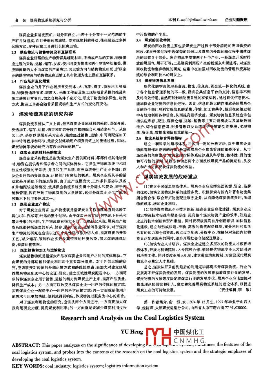 科技情報開發(fā)與經(jīng)濟(jì)SCI-TECH INFORMATION DEVELOPMENT & ECONOMY2007年第17卷第14期文章編號:1005- 6033(2007)14-0245-02收稿日期:2007-03-16煤炭物流系統(tǒng)研究與分析俞恒(太原煤炭運銷分公司,山西太原,030002)摘要:分析了 發(fā)展煤炭物流業(yè)的意義,介紹了煤炭物流系統(tǒng)的特點,就煤炭物流系統(tǒng)的研究內(nèi)容和發(fā)展煤炭物流的戰(zhàn)略重點進(jìn)行了探討。關(guān)鍵詞:煤炭行業(yè);物流系統(tǒng);物流信息系統(tǒng)中圖分類號:F25;F407.21文獻(xiàn)標(biāo)識碼:A煤炭行業(yè)是國家重要的基礎(chǔ)能源產(chǎn)業(yè),由于經(jīng)濟(jì)增長對能源產(chǎn)業(yè)的供應(yīng)鏈管理模式在企業(yè)間的8益推廣,為物流業(yè)的運作與成長創(chuàng)造總體拉動,在今后相當(dāng)- -段時間內(nèi) ,煤炭的絕對需求量還將呈穩(wěn)定上升了廣闊市場空間,帶來了豐厚的經(jīng)濟(jì)效益?,F(xiàn)代物流體系的構(gòu)建,有利于的趨勢。截至2006年10月,我國原煤產(chǎn)量20億1,同比增長8.1%。據(jù)專降低流通資金的占用,贏得煤炭產(chǎn)業(yè)大市場中物流運營的利潤份額。家預(yù)測,到2020年國內(nèi)市場對煤炭的需求量將達(dá)到24億t以上。一方1.3 有利于拓展市場和擴(kuò)大生存空間面,我國煤炭主要商品化產(chǎn)區(qū)集中在以山西為中心的北方產(chǎn)區(qū)(山西、陜有效地確立專業(yè)化物流的運行模式,立足于做強(qiáng)煤炭主業(yè),也為產(chǎn)西、內(nèi)蒙古西部地區(qū)集中了中國煤炭資源的60%);而煤炭的消費地卻大業(yè)的拓展延伸與再發(fā)展提供了物流運作的保證。對“供應(yīng)商資源、人力資都集中在經(jīng)濟(jì)較為發(fā)達(dá)的東部沿海和南方地區(qū),這就形成了長期以來煤源、倉儲資源、國內(nèi)外物流市場資源”等方面的整合,促進(jìn)了煤炭產(chǎn)業(yè)內(nèi)炭業(yè)“北煤南運"和“西煤東調(diào)”的基本格局。另-方面.進(jìn)行煤炭生產(chǎn)所部資源與外部市場資源的優(yōu)化配置與有機(jī)結(jié)合,可以有效地擴(kuò)大物流運需的原材料零部件、燃料等輔助材料的供應(yīng)量十分巨大,幾乎每個煤炭作的空間。集團(tuán)企業(yè)每年的物資采購都要超過億元,甚至幾十億元。這種長距離大2煤炭物流系統(tǒng)的特點量的煤炭及生產(chǎn)資料的運輸,造成了煤炭貨運量占國內(nèi)貨運總量的45%左右。因此.煤炭物流在我國流通領(lǐng)域中已占據(jù)重要位置。但是目前大部煤炭物流系統(tǒng)的活動是由煤炭生產(chǎn)的特點所決定的,煤炭生產(chǎn)過程分煤炭企業(yè)對物流的研究還比較少,煤炭物流系統(tǒng)尚未完全建立,因此實質(zhì)上是物資的流動過程。煤炎物流系統(tǒng)除了具有一般工業(yè)企業(yè)物流系加快對煤炭物流的研究就變得非常緊迫。統(tǒng)的特點外,還具有自身的特點。1發(fā)展煤炭物流業(yè)的意義2.1物流的節(jié)點多物流節(jié)點又稱物流據(jù)點,是整個物流系統(tǒng)指揮調(diào)度和信息的神經(jīng)中1.1有利于提升煤炭企 業(yè)的核心竟?fàn)幜?。企業(yè)生產(chǎn)所需的物資要經(jīng)過總庫、礦倉庫、井口倉庫等多個物流節(jié)點全新的現(xiàn)代物流理念、物流資源的有效整合,使企業(yè)生產(chǎn)經(jīng)營的全才能投入生產(chǎn)過程,煤炭產(chǎn)品也要經(jīng)過井底煤倉、地面煤倉、裝車站、集過程實現(xiàn)精確化、信息化、數(shù)字化高效化,提升了產(chǎn)業(yè)水平。配站等多次停頓才能發(fā)往用戶。1.2有利于提高企業(yè)整體經(jīng)濟(jì)效益2.2物流線路長化帶動和促進(jìn)運輸生產(chǎn)。-是要積極發(fā)展物流事業(yè)。堅持統(tǒng)- -規(guī)劃,合理[2]梁立華。 深化對跨越式發(fā)展的認(rèn)識[J].社會科學(xué)論壇,2005(8):布局,政策支持,企業(yè)唱戲,多元投資,按需投放;發(fā)展物流技術(shù)與市場營129-131.銷有機(jī)統(tǒng)一,實現(xiàn)上游供應(yīng)鏈和下游配送鏈緊密連接,實現(xiàn)信息流資金[3]陳國祥,依靠科技進(jìn)步 ,實現(xiàn)跨越式發(fā)展[J]中國農(nóng)墾經(jīng)擠,2004流、商品流源遠(yuǎn)流長的物流產(chǎn)業(yè)。二是要大力推廣應(yīng)用GPS技術(shù)。運輸(9):13.劇毒品、爆炸品的貨運車輛和長距離的客運車輛,都必須安裝GPS行車[4]佚名.中國鐵路實現(xiàn)跨越式發(fā)展 的現(xiàn)實可能性[ EB/OLJ.[2006-11-記錄儀,以強(qiáng)化安全教援和保障。有條件的客貨運車輛,都將通過GPS1:/://www teliu.cm.cn/zhuanti/ShowAricle. asp?AriclelD=2285.系統(tǒng)實現(xiàn)優(yōu)化配置、合理調(diào)度、有效監(jiān)控管理和多樣化服務(wù)。三是要建立[5]佚名. 鐵路跨越式發(fā)展三周年二十八件大事[EB/0L].[2006-11-健全全國客貨運信息網(wǎng)絡(luò)系統(tǒng)。進(jìn)一步完善以鐵道部信息中心為一級網(wǎng)16 ].:/:/.i.ne/htn//elhu/oieluej/19111.htmol.站、各鐵路局為二級網(wǎng)站的全國客貨運輸信息網(wǎng)絡(luò)建設(shè),積極推進(jìn)客貨(責(zé)任編輯:李敏)運輸電腦化服務(wù)管理的水平。參考文獻(xiàn)第-作者簡介:楊康恒,男,1961年11月勝, 1996年畢業(yè)于中央黨[1]賈玉川.如何提高鐵路多經(jīng)企業(yè)核心競爭 []理論學(xué)習(xí)與探索,校經(jīng)濟(jì)管理專業(yè),助理政工師,廣州鐵路(集團(tuán))公司有線電視臺辦公室,2006(1):38-39.廣