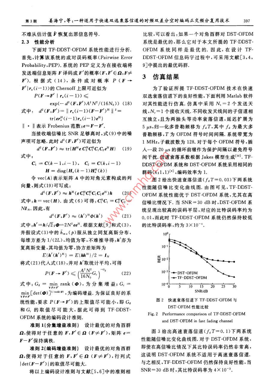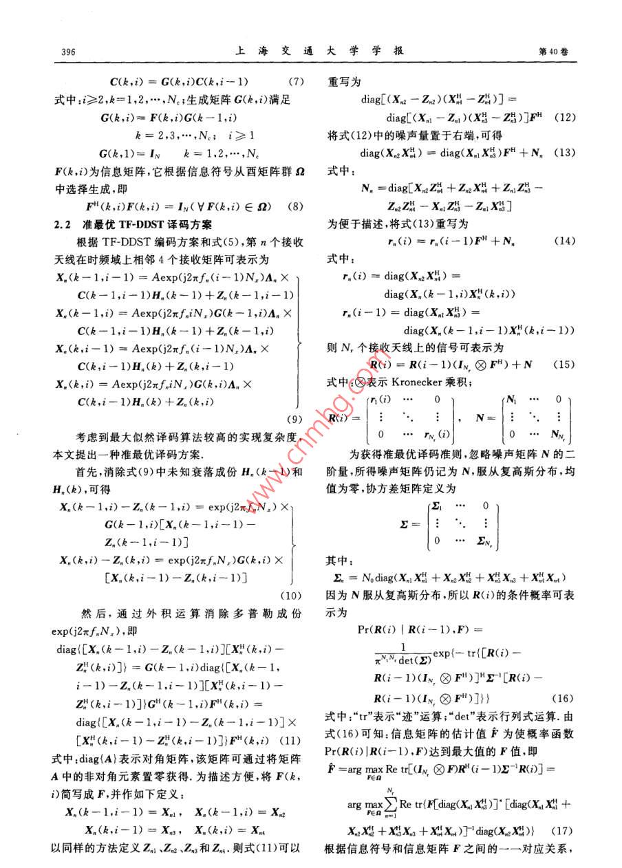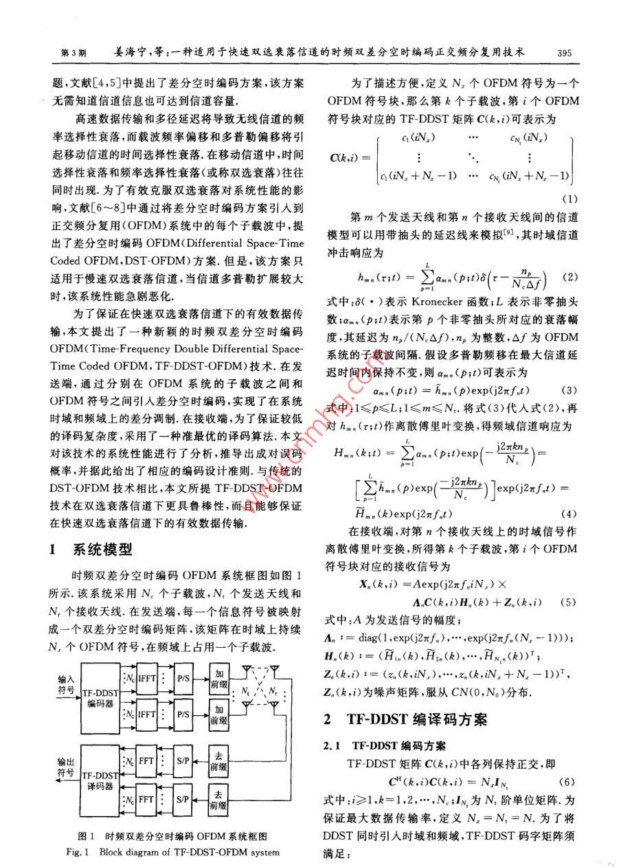 第40卷第3期上海交通大學(xué)學(xué)報(bào)Vol. 40 No. 32006年3月OURNAL OF SHANGHAI JIAOTONG UNIVERSITYMar.2006文章編號(hào):1006-2467(2006)03039405種適用于快速雙選衰落信道的時(shí)頻雙差分空時(shí)編碼正交頻分復(fù)用技術(shù)姜海寧,羅漢文,田繼鋒,宋文濤,徐友云(上海交通大學(xué)電子工程系,上海200240)摘要:為了保誣在快速雙選衰落信道下的有效數(shù)據(jù)傳輸,提岀了一種新穎的時(shí)頻雙差分空時(shí)編編碼正交頻分復(fù)用(OFDM)技術(shù).該技術(shù)通過(guò)分別在OFDM系統(tǒng)的子載波之間和OFDM符號(hào)之間引入差分空時(shí)編碼,實(shí)現(xiàn)了在系統(tǒng)時(shí)域和頻域上的差分調(diào)制,文中同時(shí)給出了相應(yīng)的準(zhǔn)最優(yōu)譯碼算法,并對(duì)系統(tǒng)性能進(jìn)行了分析和計(jì)算機(jī)仿真.結(jié)果表明,該技術(shù)在快速雙選衰落信道下能夠保持良好的誤碼率性能關(guān)鍵詞:差分空時(shí)編碼;雙選衰落;正交頻分復(fù)用中圖分類號(hào):TN914.3文獻(xiàn)標(biāo)識(shí)碼:ATime-Frequency Double Differential Space-Time Coded OFDMTechnique for Fast Doubly-Selective Fading ChannelJIANG Hai-ning, LUO Han-wen, TIAN Ji-feng, SONG Wen-tao, XU You-yun(Dept. of Electronic Eng, Shanghai Jiaotong Univ, Shanghai 200240, ChinAbstract: Doppler shift gives rise to time-selectivity, while multipath propagation introduces frequencyselectivity in mobile links. In order to guarantee the effect data transmission in fast time-selective andfrequency-selective(or doubly-selective) fading channel, a novel time-frequency double differential space-time coded OFDM technique was proposed. In this technique, double differential space-time coding isintroduced into both time domain and frequency domain in an OFDM system. A corresponding sub-optimaldecoding algorithm was also derived. The performance analysis and computer simulation prove therobustness of the new system to fast doubly-selective fading.Key words: differential space-time coding: doubly-selective fading; orthogonal frequency division modula-隨著移動(dòng)通信技術(shù)的發(fā)展,人們對(duì)無(wú)線信號(hào)傳的研究大都假設(shè)接收端完全已知信道信息(3.然而,輸?shù)乃俣群唾|(zhì)量提出了越來(lái)越高的要求.為了在獲信道容量的增加迫使天線數(shù)目遞增,移動(dòng)速度的提得更高信道容量的同時(shí)有效提高系統(tǒng)的性能增益,高也加強(qiáng)了信道參數(shù)反饋的及時(shí)性要求,這些將大人們提出了空時(shí)編碼技術(shù):3.目前,有關(guān)空時(shí)編碼大增加信道估計(jì)的難度和復(fù)雜度.為了解決這個(gè)問(wèn)收稿日期:200504-16基金項(xiàng)目:國(guó)家自然科學(xué)基金資助項(xiàng)目(60272079);國(guó)家高技術(shù)研究發(fā)展計(jì)劃(863)項(xiàng)目(2003AA123310)作者簡(jiǎn)介:姜海寧(1977),女,哈爾濱人,博士生,主要從事空時(shí)編碼技術(shù)及正交頻分復(fù)用技術(shù)的研究羅漢文(聯(lián)系人)男,教授,電話(Tel.):021-62932159; E-mail: heluo@sjtu,edu,cn第3姜海寧,等:一種適用于快速雙選衰落信道的時(shí)頻雙差分空時(shí)編碼正交頻分復(fù)用技術(shù)395題,文獻(xiàn)[4,5]中提出了差分空時(shí)編碼方案,該方案為了描述方便,定義N2個(gè)OFDM符號(hào)為一個(gè)無(wú)需知道信道信息也可達(dá)到信道容量OFDM符號(hào)塊,那么第k個(gè)子載波,第i個(gè)OFDM高速數(shù)據(jù)傳輸和多徑延遲將導(dǎo)致無(wú)線信道的頻符號(hào)塊對(duì)應(yīng)的 TF-DDST矩陣C(k,)可表示為率選擇性衰落,而載波頻率偏移和多普勒偏移將引起移動(dòng)信道的時(shí)間選擇性衰落.在移動(dòng)信道中,時(shí)間選擇性衰落和頻率選擇性衰落(或稱雙選衰落)往往c1(N2+N-1)…c(iN2+N-1)同時(shí)出現(xiàn).為了有效克服雙選衰落對(duì)系統(tǒng)性能的影響,文獻(xiàn)[6~8]中通過(guò)將差分空時(shí)編碼方案引入到(1)正交頻分復(fù)用(OFDM)系統(tǒng)中的每個(gè)子載波中,提第m個(gè)發(fā)送天線和第n個(gè)接收天線間的信道出了差分空時(shí)編碼OFDM( Differential Space-Time模型可以用帶抽頭的延遲線來(lái)模擬,其時(shí)域信道沖擊響應(yīng)為Coded OFDM. DST-OFDM)方案.但是,該方案只適用于慢速雙選衰落信道,當(dāng)信道多普勒擴(kuò)展較大(2)時(shí),該系統(tǒng)性能急劇惡化式中:6(·)表示 Kronecker函數(shù);L表示非零抽頭為了保證在快速雙選衰落信道下的有效數(shù)據(jù)傳數(shù);am(p;)表示第p個(gè)非零抽頭所對(duì)應(yīng)的衰落幅輸本文提出了一種新穎的時(shí)頻雙差分空時(shí)編碼度,其延遲為n/(N△∫),n為整數(shù),△為OFDMOFDM(Time-Frequency Double Differential Space-系統(tǒng)的子載波間隔.假設(shè)多普勒頻移在最大信道延Time Coded OFDM, TF-DDST-OFDM)技術(shù)在發(fā)遲時(shí)間內(nèi)保持不變,則am(p;t)可表示為送端,通過(guò)分別在OFDM系統(tǒng)的子載波之間和ama (p; t)=hm(P)exp(j2f, t) (3)OFDM符號(hào)之間引入差分空時(shí)編碼,實(shí)現(xiàn)了在系統(tǒng)式中:1≤p≤L;1≤m≤N將式(3)代入式(2),再時(shí)域和頻域上的差分調(diào)制.在接收端,為了保證較低的譯碼復(fù)雜度,采用了一種準(zhǔn)最優(yōu)的譯碼算法.本文對(duì)hn(τ;t)作離散傅里葉變換,得頻域信道響應(yīng)為對(duì)該技術(shù)的系統(tǒng)性能進(jìn)行了分析,推導(dǎo)出成對(duì)誤碼H-a (k: 0)=2am. (p: )exp(Na)概率,并據(jù)此給出了相應(yīng)的編碼設(shè)計(jì)準(zhǔn)則.與傳統