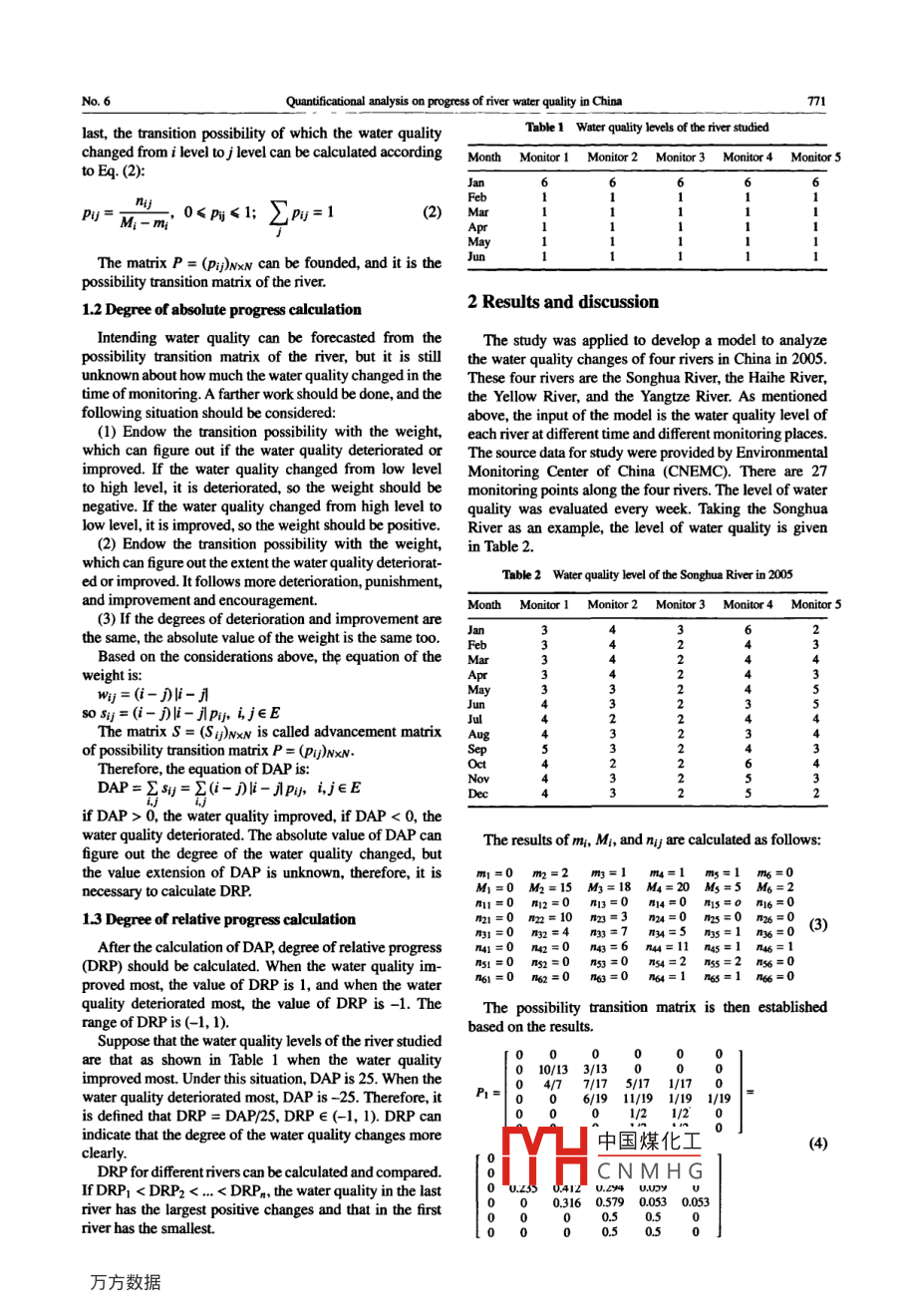 Available online at www.sciencedirect.comJOURNAL OFENVIRONMENTALScienceDirectSCIENCES'JESISSN 101-0742JLLEwww.josc.nc.cnQuantificational analysis on progress of river water quality in ChinaYUN Yi, ZOU Zhihong*, FENG Wei, RU MaiSchool of Eeconomics and Management, Beihang Universit, Bejing 100191, China. E-mail: winielowd81@163.comReceived 01 Jaouary 2008; revised 15 February 2008; acped 28 April 2008Abstractthe theory of Markov process was established. The transition possibility with a weight to calculate the degree of absolute advancementwas given based on the result of water quality evaluation. The concept of relative advancement was presented. It was used to evaluatethe extent of water quality changed in a period of time. The method was used to calculate the degrees of relative advancemeat for 4rivers in China, and the results were analyzed.Key words: water quality evaluation; pssibilit transition matrix; Markov process;, degree of advancementDOL: 10.1016/S1001-0742(08)62339-6Introductionvaried from -1 to 1. DRP is the output of the model and theinput of the model is the level of water quality at diferentRiver plluion is a serious problem in China. In recent time in difrent places.years, the govemment worked hardly to improve the water1.1 Establishing possibility transition matrixquality of rivers, and some delightful change has happened.It is necessary to know the dynamic change of waterAccording to the Environmental quality standards forquality in a period of time. Some traditional methods can surface water (GB3838-2002, State Environmental Protec-be used to evaluate the static state of river water quality tion Administration of China, 2002), the water quality ofon time in one place such as factor analysis models (Chen rivers was cassied into 6 levels: levelI, II, iI, IV, V,et al, 2002), fuzzy synthetic evaluation (Zou et al., 2006),under level V. In this study, we set E as 6 levels,E={1,2,matter element model (Wang et al, 2004), Logistic curve 3,4,5, 6].model (Jin et al, 2003), artificial neural network (Ni andTake a river as an example. There are k monitor places inBai, 2000) and Gary analysis method (Zhang et al, 2004). the river and n monitor samples in every place at diferentOn the basis of the results of water quality evaluation, times, in which each one can be defined as YI1,Y2, .. andyn.a quantitative value is needed to figure out how the river Therefore, there are tally nxk monitoring samples in thewater quality changed in a period of time, to check whether river. The sum of samples that have level i water quality isit is improved, and to compare the change level in diferent Mi. In the last monitoring, the number of samples that haverivers. A mathematical model based on Markov process is level i water quality is counted m: Thus, there are:0≤mdeveloped to quantify the change of water quality in rivers.≤k,0≤ Mi≤k andSm=kZM=nk,i∈E. .If the level of water quality is i in a monitor place at1 Mathematical modelone time and the level change toj level in the same place atanother time, then the sum of the changes can be calculatedMarkov process is a special stochastic process (Guan,as nyj. Thus, there is Eq. (1).1993), and has been used in forecasting (Wang et al, 2005;Yu et al, 2003;Li and Wang, 2002; Zhang etal, 2005;Ma 0≤mj≤(n-1)kZw=(n-1)k, ij∈E(1)and Yang, 2000; He and Xie, 1998; Zhong and Zeng, 1997;Jiang, 1996; Liu and Tan, 2002; He et al., 2003). Basedh the water qualityon Markov process theory, two concepts were imported:chang中國煤化工his river is njy/M;degree of absolute progress (DAP) and degree of relativeprogress (DRP). DAP is used to express how much theaccordMHsituation should beconsidCNMH G no psibsi twater quality changed in a period of time, and DRP is thechange in the last monitoring, in other words, the waterstandardized value of DAP, which means the value of DRPquality changed, but it was not be monitored at the last* Corresponding author. E-mail: zouzhihong@buaa.cdu.cnmonitoring. Thereby, m; should be subtracted from Mi. AtNo. 6Quantificational analysis on progress of river water quality in China77last, the transition possibility of which the water qualityTable 1 Water quality levels of the river studiedchanged from i level to j level can be calculated accordingMonth Monitor 1 Monitor 2Monitor3 Monitor4 Monitor 5to Eq. (2):anhiji=M:- m;'0≤pj≤1;Pv=12)MarAprMayThe matrix P = (p:)NxN can be founded, and it is theJunpossbility transition matrix of the river.2 Results and discussion1.2 Degree of absolute progress calculationIntending water quality can be forecasted from theThe study was applied to develop a model to analyzepossibility transition matrix of the river, but it is stillthe water quality changes of four rivers in China in 2005.unknown about how much the water quality changed in theThese four rivers are the Songhua River, the Haihe River,time of monitoring. A farther work should be done, and thethe Yellow River, and the Yangtze River. As mentionedfollowing situation should be considered:above, the input of the model is the water quality level of(1) Endow the ransition possibility with the weight,each river at diferent time and different monitoring places.which can figure out if the water quality deteriorated orThe source data for study were provided by Environmentalimproved. If the water quality changed from low levelMonitoring Center of China (CNEMC). There are 27to high level, it is deteriorated, so the weight should bemonitoring points along the four rivers. The level of waternegative. If the water quality changed from high level toquality was evaluated every week. Taking the Songhualow level, it is improved, so the weight should be positive.River as an example, the level of water quality is given(2) Endow the transition possibility with the weight,in Table 2.which can figure out the extent the water quality deteriorat-Table2 Water quality level of the Songhua River in 2005ed or improved. It follows more deterioration, punishmen
