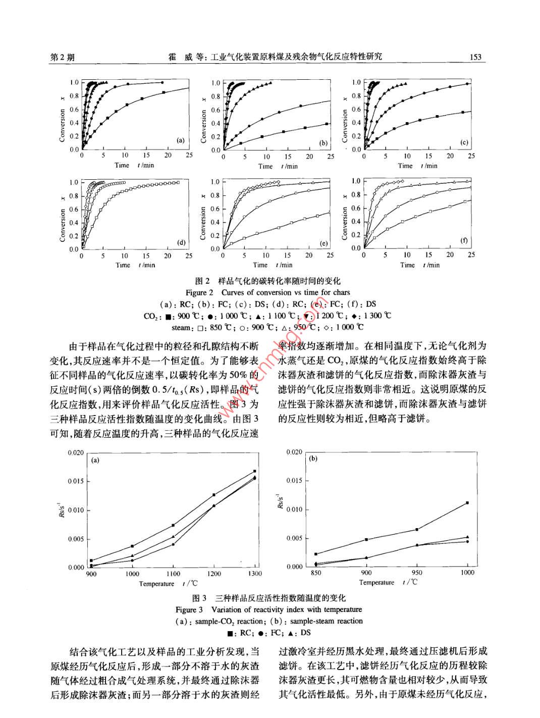 第41卷第2期燃料化學(xué)學(xué)報Vol.41 No.22013年2月Journal of Fuel Chemistry and TechnologyFeb. 2013文章編號: 0253-2409(2013 )02-0151-06工業(yè)氣化裝置原料煤及殘余物氣化反應(yīng)特性研究霍威',周志杰',王亦飛',于廣鎖',黃斌”, 張玉柱’(1.華東理工大學(xué)煤氣化及能源化工教育部重點實驗室,上海200237;2.神華寧夏煤業(yè)集團(tuán)煤炭化學(xué)工業(yè)分公司,寧夏銀川70004)摘要:考察了某工業(yè)氣化裝置中的原煤濾餅及除沫器灰渣在不同溫度下與水蒸氣和CO2的氣化反應(yīng)特性,采用掃描電子顯微鏡和吸附儀測試了樣品的初始結(jié)構(gòu)及表面特性。研究表明,采用相同氣化劑進(jìn)行氣化反應(yīng)時,原煤的氣化活性要高于除沫器灰渣,而除沫器灰渣的氣化活性則與濾餅相近但略好于濾餅。這主要是由于三種樣品的表面和內(nèi)部結(jié)構(gòu)存在很大的差異。由于水蒸氣和CO2與樣品的反應(yīng)機理存在差異,使得樣品的水蒸氣氣化活性比CO2氣化活性高三倍左右。關(guān)鍵詞:氣化反應(yīng)性;工業(yè)氣化裝置;水蒸氣氣化;二氧化碳?xì)饣袌D分類號: TQ54文獻(xiàn)標(biāo)識碼: AGasification reactivity of feed coal and residue from an industrial gasification plantHUO Wei' , ZHOU Zhi-je' , WANG Yi-fei' , YU Guang suo' , HUANG Bin2 , ZHANG Yu-zhu2(1. Key Laboratory of Coal Gasification and Energy Chemical Engineering, Ministry of Education,East China University of Science and Technology , Shanghai 200237, China;2. Shenghua Ningxia Coal Group Coal Chemical Industry Branch, Yinchuan 750004, China)Abstract: The gasification reactivity of raw coal, flter cake and the slag in demister from an industrialgasification plant was invetigated with steam and carbon dioxide as the gasification agent. The initial structureand surface characteristic of the samples were analyzed by scanning electron microscope and adsorptionapparatus. The results show that the gasification reactivity of the raw coal is better than that of the slag indemister, while the gasification reactivity of the slag is similar to or a bit better than that of filter cake, which ismainly atributed to the extraordinary difference of surface and intermal structure of these three samples. As aresult of different reaction mechanism with steam and CO2 , the gasification reactivity of the samples with steam isabout 3 times higher than that with CO2.Key words: gasification reactivity; industrial gasificaion plant; steam gasifcaion; carbon dioxide gasification中國煤炭資源豐富,煤炭產(chǎn)量持續(xù)增長,因此,CO2氣化反應(yīng)活性進(jìn)行研究,發(fā)現(xiàn)無煙煤焦與水蒸煤炭的合理利用尤為重要。近年來,氣流床煤炭氣氣氣化反應(yīng)的活性與無煙煤的煤化程度相對應(yīng),煤化技術(shù)成為煤炭高效潔凈利用的關(guān)鍵技術(shù)"。反化程度越高,水蒸氣反應(yīng)活性越小;而無煙煤與CO2應(yīng)活性高的煤炭在氣流床氣化過程中反應(yīng)速率快、氣化反應(yīng)的活性與煤中礦物質(zhì)的催化作用有關(guān)。效率高,并且能在保證穩(wěn)定生產(chǎn)能力的情況下,使氣Kora 等[3]) 發(fā)現(xiàn),褐煤和煙煤的水蒸氣氣化速率是化爐在較低溫度下運行,從而避免灰分結(jié)渣和影響CO2氣化速率的2~5倍。烏曉江等[41 對高灰熔點氣化過程。然而,在煤炭氣化的過程中會產(chǎn)生許多煤進(jìn)行了水蒸氣和CO2氣化反應(yīng)特性研究。氣化殘余物,這些殘余物主要是由轉(zhuǎn)化不完全的可Ahmed等[]考察了高壓下木屑片與水蒸氣和CO2燃物質(zhì)及無機礦物質(zhì)等組成。無論是從氣化整體的的氣化特性。Matsumoto 等[6]對生物質(zhì)焦進(jìn)行了水經(jīng)濟(jì)性,還是資源利用和環(huán)境保護(hù)的角度出發(fā),都需蒸 氣和CO2氣化反應(yīng)特性研究。要對氣化殘余物進(jìn)行轉(zhuǎn)化利用。因此,為了更好地為了更好地了解煤焦及其氣化后殘余物的氣化實現(xiàn)氣化殘余物的利用,有必要對其氣化反應(yīng)活性特性,本實驗針對某工業(yè)氣化裝置的原煤以及氣化進(jìn)行了解。后經(jīng)黑水處理的濾餅、粗合成氣處理系統(tǒng)中經(jīng)過除關(guān)于含碳物質(zhì)氣化反應(yīng)活性的研究,大多數(shù)研沫器后的灰渣,進(jìn)行了水蒸氣和CO2氣化反應(yīng)特性究者采用水蒸氣或CO2為氣化劑對其進(jìn)行研研究,比較了三者在不同溫度下的反應(yīng)特性差異以究[2-61。張林仙等21對中國六種無煙煤的水蒸氣和及在不同氣氛下的活性差異,為氣化殘余物的利用收稿日期: 201205-24;修回日期: 2012-07-26。聯(lián)系作者:于廣鎖,E-mail: gsyu@ ecust. edu. cn,Tel. : 021 64252974, Fax: 021 64251312。152燃料化學(xué)學(xué)報第41卷提供科學(xué)依據(jù)和設(shè)計基礎(chǔ)。應(yīng)特性。實驗步驟如下,首先打開氣路,調(diào)節(jié)控壓閥,待1實驗部分氣流穩(wěn)定后開始升溫。升溫階段,始終通入N2為1.1樣品的制備實驗采用某工業(yè)氣化裝置的原煤( raw coal,保護(hù)氣,以25C/min的升溫速率升溫至設(shè)定的氣RC)、濾餅( filter cake, FC)和除沫器灰渣(slag in化溫度,將N2切換為氣化劑,保持恒溫,直至反應(yīng)demister, DS)為原料,在氮氣氣氛下,將粒徑為80結(jié)束。當(dāng)氣化劑為CO2時,氣化溫度分別為900、~120 μm的樣品放置在熱天平的坩堝內(nèi),以1 000、1 100、1 200和1300 C ,流量為40 mL/min;當(dāng)25 C/ min的升溫速率升溫到850 C并保持30 min,氣化劑為水蒸氣,氣化溫度則為850、900、950、脫除揮發(fā)分,制得焦樣。某工業(yè)氣化裝