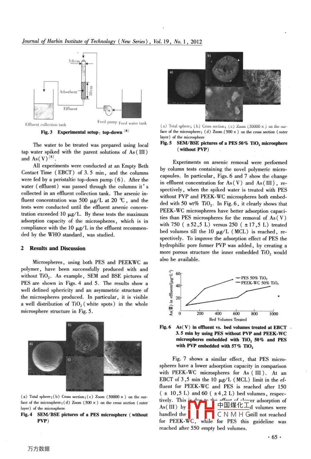 Jourmal of Harbin Institute of Technology ( New Series), Vol. 19, No. 1, 2012The removal of arsenic from ( ground) -water by adsorbent loadedin polymeric microspheresFICOLI A ', HOINKIS J', CRISCUOU A', FRANZ C', DE RYCKE M', BLOCKC', DEOWANSA', ISIAM R', DRIOU E 12(1. Intitute on Membrane Technology (ITM-CNR), Via Pietro Bucei, Cubo 17C, 87030 Rende (CS), Italy, a. figoli@ itm. cnr. it;2. Karlshrue University of Applied Sciences, Molukestr. 30 76133 , Karlshrue , Germany; 3. Sustainable Process MaterialsEngineering, GROUP T-Leuven Engineering College, Vesliustraat 13, 3000 Leuven, Belgium)Abstract: Arsenic is a natural tasteless and odourless element, existing in the earth' s crust at average levels ofbetween two and five thousands micrograms per liter ( parts per million). Arsenic is highly toxic to humans,,who are exposed to it primarily from air, food and water. The occurrence of arsenic in groundwater is due to ge-ological composition of soil. High concentrations of arsenic in water are the result of dissolution or desorption offerric oxides and the oxidation of mineral arsenopyrites. Arsenic in drinking water has an important impact onthe human health, especially in the less developed countries. Different methods exist to remove arsenic from aquatic media, and one of them is by adsorption. In this work, the adsorption of both As(II) and As( V) bymeans of novel microspheres has been investigated. In particular, TIO2 has been embedded into polymeric mi-crospheres PES ( PolyEtherSulphone) and PEEK-WC ( PolyEtherEther-Ketone). The main advantages of thisencapsulation adsorption material are: no loss of adsorbents into the water stream, easy to be used and scaled-Key words: arsenic removal, adsorption, TiO2,polymeric microspheresCLC number: X703Document code: AArticle ID: 1005-9113(2012 )010063-04Arsenic poisoning has now become one of the ma-within the European Union 3 and in the USA by thejor environmental worries in some Asian countries, in-EPA [In Bangladesh, the MCL of arsenic in drink-cluding Bangladesh, India, China and Vietnam in A- ing water is still 50 g/L. These new regulations imposesia, where millions of people have been exposed to ex-the development of efficient methods for arsenic removalcessive arsenic through contaminated drinking water.from drinking waters 5. In this context, novel micro-This problem is of global issue today including countriescapsules loaded with different concentration of TiO2in South America, Africa, in the US and also in Eu-( adsorbent) have been produced using a system whichrope to certain extent. Most of arsenic problems in deintegrates the traditional chemical capsule techniqueveloping countries today are caused by natural erosion.( coacervation or phase inversion) and the mechanfcalIn nature arsenic occurs in several chemical formscapsule technique ( pressure extrusion) 6. The micro-as organic or inorganie compounds with different molec- capsules have been characterized by Scanning Electronular sizes and different charges (0, -3, +3 and +5).Microscopy ( SEM ) and Back Scatering ElectronThe prevalent forms in water environments are the inor-( BSE). Furthermore, arsenic removal by means ofganic ones being arsenate ( AsO- ) and/ or arsenitecolumn tests ( containing the microspheres produced )( AsO,3- ). In general, inorganic forms of arsenic anhave been also reported ( Graeme, 1998).nore toxic than organic ones, and trivalent arseniccompounds are characterized by higher toxicity than1 Materials and Methodspentavalent ones ( Graeme, 1998).Long-term intake of arsenic contaminated water ishighly detrimental to humans resulting in severe and1.1 MaterialsThe polymer solvent was N , N-dimethylformamidepermanent impairment of human health. Conse-quently, in recent years, authorities have taken a more( DMF), while the coagulation bath solvents were iso-stringent atitude to arsenic in the environment. Thepropanol ( IPA) and deionized water ( DI). Both DMFand IPA wefrnm Carln Frba Reagents, It-new standard on the maximum contaminant level(MCL) of 10 g/L arsenic in drinking water is recom-aly, and wer中國煤化工_fication. The DImended by the WHOl2J and was recently accepted bothwater was prHCNMHGwatersystem.Received 2011 -11 -20.●63●Journal of Harbin Insiue of Technology (New Series), Vol. 19, No. 1, 2012Adsorbent'Efluent0←Efluent ollection tankFeed pump Feed water tank(a) Toal sphere; (b) Cross section; (c) Zoom (0000x) o the suFig.3 Experimental setup: top-down 間)face of thee micrrosphere; ((d) Zoom.(500x) on the cross section ( outerThe water to be treated was prepared using locallye)ad the nimskepitre ofa PES 50% To.mierophereFig.5 SEM/BSE pictures( without PVP)tap water spiked with the parent solutions of As( I1)and As(v)[8).Experiments on arsenic removal were performedAll experiments were conducted at an Empty Bethby column tests containing the novel polymerice micro-Contact Time ( EBCT) of 3.5 min, and the columnscapsules. In particular, Figs. 6 and 7 show the changewere fed by a peristaltic top-down pump (6). After thein efluent concentration for As(V) and As(II), re-water ( ffluent) was passed through the columns it' sspectively, when the spiked water is treated with PEScollected in an ffluent collection tank. The arsenic in-without PVP and PEEK-WC microspheres both embed-fluent concentration was 500 μg/L at 20 C, and theded with 50 wt% TI02 In Fig. 6, it clearly shows thattests were conducted until the efluent arsenic concen-PEEK-WC microspheres have better adsorption capaci-tration exceeded 10 μg/L. By these tests the maximumties than PES microspheres for the removal of As(V)adsorption capacity of the microspheres, which is inwith750( +52,5 L) versus 250(土17,5 L) treatedcompliance with the 10 μg/L in the efluent recommen-bed volumes till the 10 μg/L (MCL) is reached, re-ded by the WHO standard, was studied.spectively. To improve the adsorption efet of PES thehydrophilie pore former PVP was added, by creating a2 Results and Discus