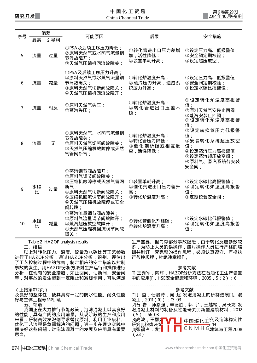 第6卷第29期中國(guó)化工貿(mào)易2014年10月中句開(kāi)China Chemical trade研究開(kāi)發(fā)HAZOP分析在天然氣制氫中的應(yīng)用馬新力1馬進(jìn)楊光(新疆華泰重化工有限責(zé)任公司,烏魯木齊830019)摘要:在天然氣制氫轉(zhuǎn)化部分的生產(chǎn)控制中,轉(zhuǎn)化壓力、溫度、流量及水碳比的控制非常重要,根據(jù) HAZOP分析流程,對(duì)以上要素進(jìn)行 HAZOP分析,分析岀要數(shù)發(fā)生偏差時(shí)可能岀現(xiàn)的后果,并對(duì)后果采取相應(yīng)的安全措施,避免事故的發(fā)生關(guān)鍵詞:溫度壓力流量水碳比 HAZOP分析措施HAZOP分析介紹二、轉(zhuǎn)化反應(yīng)中的 HAZOP分析危險(xiǎn)與可操作性( HAZOP)研究是一種可用于定天然氣與水蒸汽在轉(zhuǎn)化管內(nèi)發(fā)生以下反應(yīng)性分析或定量評(píng)價(jià)的危險(xiǎn)性評(píng)價(jià)方法,它以系統(tǒng)工程為CH4+H2O=co+3H2·Q基礎(chǔ)的,分析出生產(chǎn)過(guò)程中的危險(xiǎn)源及原因,并制定出CO+H,o=co, +h,+q相應(yīng)措施。通過(guò)分析生產(chǎn)運(yùn)行過(guò)程中工藝參數(shù)、操作控以上反應(yīng)是在轉(zhuǎn)化管中鎳基催化劑的催化作用下制岀現(xiàn)的偏差,以及這些偏差對(duì)系統(tǒng)的影響及后果,找進(jìn)行反應(yīng)的,該反應(yīng)過(guò)程與反應(yīng)物的溫度、壓力有關(guān)岀岀現(xiàn)偏差的原因,明確裝置生產(chǎn)過(guò)程中存在的主要危產(chǎn)出氫氣的多少與流量有關(guān),該反應(yīng)需控制水碳比(水險(xiǎn)、危害因素,并針對(duì)偏差的后果提出應(yīng)采取的措施。蒸氣分子的總數(shù)和碳原子總數(shù)的比值),反應(yīng)溫度由調(diào)節(jié)燃料氣流量進(jìn)行控制,壓力由調(diào)節(jié)原料氣壓力進(jìn)行控危險(xiǎn)和可操作性研究方法可按分析的準(zhǔn)備、完成分制,流量由調(diào)節(jié)原料氣流量進(jìn)行控制,水碳比由調(diào)節(jié)水析和編制分析結(jié)果報(bào)告三個(gè)步驟來(lái)完成。由各種專業(yè)人蒸氣及原料氣流量進(jìn)行控制,我們對(duì)以上最主要的反應(yīng)員〔如∶工藝、設(shè)備、安全、現(xiàn)場(chǎng)操作人員等)按照規(guī)控制操作過(guò)程進(jìn)行 HAZOP分析。定的方法對(duì)偏離設(shè)計(jì)的工藝條件進(jìn)行過(guò)程危險(xiǎn)和可操作分別對(duì)溫度、壓力、流量及水碳比等要素進(jìn)行分性研究析,分析結(jié)果見(jiàn)表1。表1 HAZOP分析結(jié)果偏差序號(hào)要素引導(dǎo)詞可能原因后果安全措施燃料氣流量調(diào)節(jié)閥故障開(kāi);①轉(zhuǎn)化管發(fā)生著火、爆設(shè)定轉(zhuǎn)化爐溫度高報(bào)警②原料天然氣流量降低或無(wú)流炸②轉(zhuǎn)化管、燒嘴燒壞②設(shè)定原料氣壓力報(bào)警值1溫度過(guò)量③蒸汽流量降低;③催化劑燒壞性降③設(shè)定蒸為壓力高報(bào)雪值④引風(fēng)機(jī)故障停造成轉(zhuǎn)化爐負(fù)低壓降低④廢熱鍋爐壓力升高,嚴(yán)設(shè)置備用電源⑤轉(zhuǎn)化管泄漏重時(shí)鍋爐爆炸′⑤設(shè)定轉(zhuǎn)化系統(tǒng)壓力高報(bào)警①設(shè)定轉(zhuǎn)化爐溫度低報(bào)警①燃料氣流量降低②原料氣流量升高2溫度減量蒸汽流量升高;①催化劑活性降低,轉(zhuǎn)化②定期分析轉(zhuǎn)化氣含量氣質(zhì)量不合格⑤系統(tǒng)壓力下降②裝置單耗升高④設(shè)定水碳比報(bào)警值⑤提高系統(tǒng)壓力在1.1MPa⑥轉(zhuǎn)化爐進(jìn)風(fēng)量過(guò)大以上⑥調(diào)節(jié)轉(zhuǎn)化爐進(jìn)風(fēng)量①PSA及后續(xù)工序故障停①裝置轉(zhuǎn)化管發(fā)生著火②原料天然氣流量調(diào)節(jié)閥故障爆炸設(shè)定壓力高報(bào)警值3壓力過(guò)量開(kāi)⊙設(shè)備、管線泄漏大量可②設(shè)定超壓放空值,超壓自③天然氣壓縮機(jī)回流閥故障燃?xì)怏w關(guān)③裝置安全閥起跳③安全閥定期校驗(yàn);①原料天然氣或水蒸氣流量調(diào)①轉(zhuǎn)化爐爐膛溫度上升較①設(shè)定壓力低報(bào)警值節(jié)閥故障關(guān)快,損壞轉(zhuǎn)化管②設(shè)定水碳比報(bào)警值4壓力減量②原料天然氣切斷閥故障關(guān);②轉(zhuǎn)化管進(jìn)出口壓差上③安全閥定期校驗(yàn)③超壓放空閥故障開(kāi)升,催化劑損壞④PSA及后續(xù)工序設(shè)定壓力PSA及后續(xù)工序壓力降低;③蒸汽流量低造H中國(guó)煤化工⑤安全閽起跳。結(jié)碳,催化劑失CNMHG設(shè)置雙閥道切斷閥w.chinachemicaltrade.comChina chemical trade中國(guó)化工貿(mào)易073中國(guó)化工貿(mào)易第6卷第29期研究開(kāi)發(fā)China Chemical trade201410月中間刊偏差序號(hào)要素引導(dǎo)詞可能原因后果安全措施①PSA及后續(xù)工序壓力降低5流量過(guò)量③原料天然氣或水蒸氣流量調(diào)①轉(zhuǎn)化管進(jìn)出口壓力差增①設(shè)定壓力高、低報(bào)警值節(jié)閥故障開(kāi)加,活性降低②安全閥定期校驗(yàn);③天然氣壓縮機(jī)回流故障關(guān)②裝置單耗升高③設(shè)定超壓放空①PSA及后續(xù)工序壓力升高②原料天然氣或水蒸氣流量調(diào)①轉(zhuǎn)化爐溫度升高①設(shè)定壓力高、低報(bào)警值6流量減量節(jié)閥故障關(guān)②蒸汽壓力升高,造成系②安全閥定期校驗(yàn)③原料天然氣切斷閥故障關(guān);統(tǒng)壓力升高;③設(shè)定水碳比報(bào)警值④天然氣壓縮機(jī)回流故障開(kāi);7流量相反