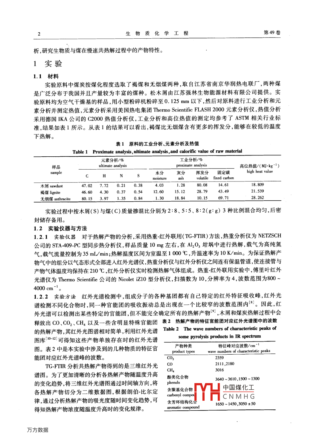 第49卷第1期生物質(zhì)化學(xué)工程Vol 49 No. 12015年1月Biomass Chemical EngineeringJan.2015doi:10.3969/jisn.16735854.2015.01.001研究報(bào)告—一生物質(zhì)能源·木屑與煤慢速共熱解產(chǎn)物特性研究孫云娟2,蔣劍春,許玉12,應(yīng)浩12,戴偉娣12(1.中國(guó)林業(yè)科學(xué)研究院林產(chǎn)化學(xué)工業(yè)研究所;生物質(zhì)化學(xué)利用國(guó)家工程實(shí)驗(yàn)室;國(guó)家林業(yè)局林產(chǎn)化學(xué)工程重點(diǎn)開放性實(shí)驗(yàn)室;江蘇省生物質(zhì)能源與材料重點(diǎn)實(shí)驗(yàn)室,江蘇南京210042;2.中國(guó)林業(yè)科學(xué)研究院林業(yè)新技術(shù)研究所,北京10001)摘要:采用 TG-FTIR聯(lián)用的分析方法對(duì)木屑與煤共熱解產(chǎn)物進(jìn)行分析,結(jié)果發(fā)現(xiàn),木屑與煤共熱解產(chǎn)物不是兩者單獨(dú)熱解的簡(jiǎn)單疊加,而是木屑與煤協(xié)同反應(yīng)相互促進(jìn)或抑制的結(jié)果。煤化程度越高木屑與煤共熱解過程中CO和CH,的產(chǎn)率越多,CO2的產(chǎn)率越少,液體和固體產(chǎn)物越多。木屑與煤摻混比例對(duì)于共熱解產(chǎn)物的影響規(guī)律性不是非常明顯,對(duì)于CO和CH4,摻混比例5:5時(shí)產(chǎn)率最低;CO2在共熱解溫度<500℃時(shí),摻混比例5:5時(shí)產(chǎn)率最高,而在共熱解溫度>500℃時(shí),隨著煤的摻混比例的增加產(chǎn)率逐漸減小。木屑與褐煤的共熱解固體產(chǎn)率隨著摻混比例的增加逐漸增大,木屑與無煙煤的共熱解固體產(chǎn)率正好相反。關(guān)鍵詞:生物質(zhì);煤;煤化程度;協(xié)同反應(yīng);共熱解中圖分類號(hào):TQ35;TK6文獻(xiàn)標(biāo)識(shí)碼:A文章編號(hào):16735854(2015)01-0001-06Characteristics of Sawdust and Coal Slow Co-pyrolysis ProductsSUN Yun-juan", JIANG Jian-chun, XU Yu, YING Hao,2, DAI Wei-di,(1. Institute of Chemical Industry of Forest Products, CAF; National Engineering Lab for Biomass Chemical Utilization; Keyand Open Lab. of Forest Chemical Engineering, SFA; Key Lab of Biomass Energy and Material, Jiangsu ProvinceNanjing 210042, China; 2. Research Institude of Forestry New Technology, CAF, Beijing 100091, China)Abstract: By using TG-FTIR method, the co-pyrolysis products of sawdust and coal were analyzed. It was found that co-pyrolysisproducts yield was not simple accumulation of mono-pyrolysis, but the result of inhibition or acceleration effect of synergisticreaction. With the increase of coal rank, the CO and CH, products yields increased, cO2 product yield decreased, and liquid andsolid products yields increased. The mixture ratio had less influence on the co-pyrolysis products. With the mixture ratio of 5: 5the CO and CHa yields were the minimum. When the co-pyrolysis temperature was less than 500t, CO, yield was the maximumin mixture ratio of 5: 5. While the co-pyrolysis temperature was over 500C, CO, yields decreased with the increase of mixtureation. Solid product yields of sawdust and lignite co-pyrolysis gradually increased as the sawdust ratio in blending raw materialpromoted. But solid product yields of sawdust and anthracite co-pyrolysis were going in the opposite directionKey words: sawdust; coal; coal rank; synergistic effect; co-pyrolysis生物質(zhì)和煤有著不同的物理化學(xué)性質(zhì),從而導(dǎo)致其共利用方法不同,熱解動(dòng)力學(xué)特征也有很大差異。生物質(zhì)與煤?jiǎn)为?dú)熱解的報(bào)道很多,技術(shù)比較成熟。但對(duì)于生物質(zhì)與煤共熱解反應(yīng)進(jìn)行研究的文獻(xiàn)相對(duì)較少,兩者反應(yīng)過程中是否存在協(xié)同反應(yīng)的認(rèn)識(shí)也各不相同。共熱解過程中是否存在協(xié)同反應(yīng),可以從反應(yīng)過程、反應(yīng)產(chǎn)物及反應(yīng)機(jī)理等方面進(jìn)行分析,相關(guān)的技術(shù)方法也可以參考生物質(zhì)與煤?jiǎn)为?dú)熱解。熱重紅外聯(lián)用技術(shù)( TG-FTIR)可以對(duì)熱解過程中氣態(tài)產(chǎn)物的形成和釋放特性進(jìn)行快速的在線分析而被廣泛采用2。作者利用 TG-FTIR技術(shù)對(duì)影響生物質(zhì)與煤共熱解過程的工藝條件進(jìn)行全面分收稿日期:2014-08-20中國(guó)煤化工基金項(xiàng)目:中國(guó)林科院林業(yè)新技術(shù)所基本科研業(yè)務(wù)費(fèi)專項(xiàng)資金( CAFINT2014KO4);“THCN G12BAA09B03);引進(jìn)國(guó)際先進(jìn)林業(yè)科學(xué)技術(shù)項(xiàng)目(20144-32)作者簡(jiǎn)介:孫云娟(1979—),女,河北唐山人,助理研究員博士,主要從事生物質(zhì)熱化學(xué)轉(zhuǎn)化研究工作。2生物質(zhì)化學(xué)工程第49卷析,研究生物質(zhì)與煤在慢速共熱解過程中的產(chǎn)物特性。1實(shí)驗(yàn)1.1材料實(shí)驗(yàn)原料中煤炭按煤化程度選取了褐煤和無煙煤兩種,取自江蘇省南京華潤(rùn)熱電聯(lián)廠,兩種煤是廣泛分布于我國(guó)并且產(chǎn)量較為豐富的煤種。松木屑由江蘇強(qiáng)林生物能源材料有限公司提供。實(shí)驗(yàn)原料均為空氣干燥基的樣品,用小型粉碎機(jī)粉碎至0.125mm以下,然后對(duì)原料進(jìn)行工業(yè)分析和元素分析并測(cè)定熱值,元素分析采用美國(guó)熱電集團(tuán) Thermo Scientific FLASH2000元素分析儀,熱值分析采用德國(guó)KA公司的C2000熱值分析儀,工業(yè)分析和高位熱值的測(cè)定均參考了ASTM相關(guān)行業(yè)標(biāo)準(zhǔn),結(jié)果如表1所示。從表1的結(jié)果可以看出,褐煤比無煙煤含有更多的揮發(fā)分,能夠在較低的溫度下熱解。表1原料的工業(yè)分析、元素分析及熱