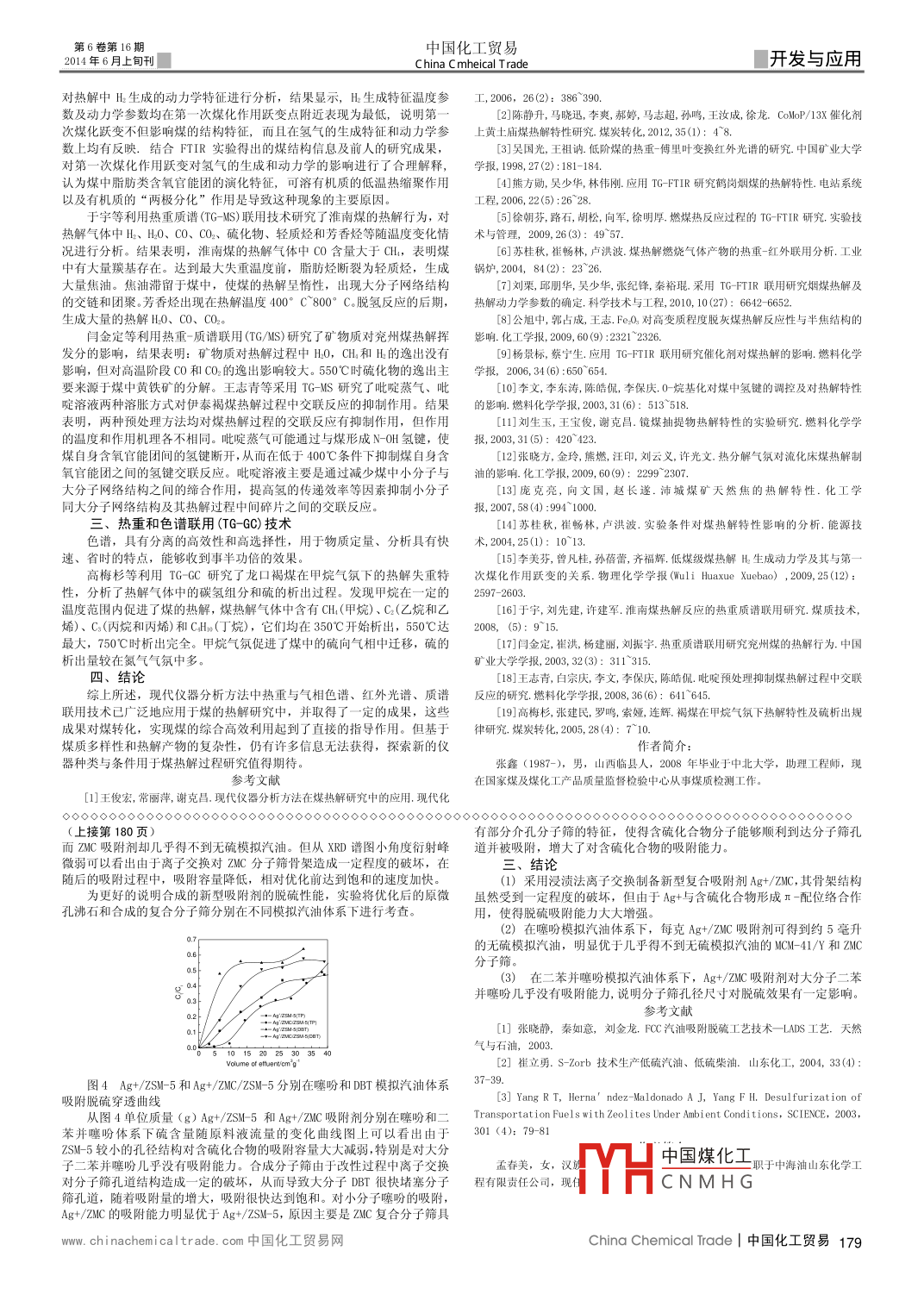 開發(fā)與應(yīng)用中國化工貿(mào)易第6卷第16期China C hemical T rade2014年6月上旬刊熱重與其他方法聯(lián)用技術(shù)在煤熱解研究中的應(yīng)用張鑫(國家煤及煤化工產(chǎn)品質(zhì)量監(jiān)督檢驗中心山西太原030012)摘要:對熱重-紅外(TG-FTIR)、熱重-質(zhì)譜(TG-MS)、熱重-色譜(TG-GC)等儀器聯(lián)用技術(shù)的特征性能進行了綜述,重點總結(jié)了其在煤熱解熱解氣體等分析研究中的應(yīng)用關(guān)鍵詞:熱重-紅外;熱重-質(zhì)譜;熱重-色譜;煤熱解Application of TG analysis associated with other technologies in the study of coal pyrolysisZhangxin(National Center of Supervision Inspection for Coal Coal Chemical Product Qualitytaiyuan 030012)Abstract: Performance of Thermo gravimetric- Infrared(TG-FTIR), Thermal gravimetric- mass spectrometry(TG-MS)and Thermalgravimetric- chromatography(TG-GC) techniques are reviewed. Also, its application in coal pyrolysis and analysis of pyrolysis gasare summarizedKeywords: Thermal gravimetric- Infrared (TG-FTIR); Thermal gravimetric- mass spectrometry (TG-MS): Thermal gravimetrichromatography (TG-GC): coal pyrolysis煤熱解是煤炭氣化、液化、焦化以及燃燒等各種轉(zhuǎn)化技術(shù)的基礎(chǔ)增加。公旭中等研究了共混合法負載FeO3對高變質(zhì)程度脫灰煤的熱解對煤熱解行為的硏究成果對煤轉(zhuǎn)化,實現(xiàn)煤的綜合高效利用具有直接的反應(yīng)行為的影響,結(jié)果顯示煤粉負載FeO3后熱解轉(zhuǎn)化率及熱解后自由基指導作用。隨著現(xiàn)代分析測試技術(shù)的更新與儀器性能的不斷提高,越來顯著增加。楊景標等研究了堿金屬、堿土金屬和過渡金屬對寶日希勒褐越多的分析儀器被應(yīng)用于煤熱解行為研究中,獲得了許多有意義的研究煤和包頭煙煤熱解的催化作用和熱解氣逸出的影響。研究結(jié)果表明,不成果。本文將對可用于煤熱解硏究中的主要現(xiàn)代分析儀器:熱重(TG)同催化劑對褐煤和煙煤熱解的催化效果順序分別為Ni>Fe~Ca>K和與紅外光譜(FTR)、質(zhì)譜(MS)、氣相色譜(GC)的聯(lián)用技術(shù)的特性以及Ca~FeK,而KCO3幾乎對煤的熱解沒有催化作用。最優(yōu)的催化近年來它們在煤熱解中的主要應(yīng)用進行綜合評述。劑作用下,褐煤和煙煤熱解轉(zhuǎn)化率増加值分別達到10.1%和6.4%。對、熱重和傅里葉紅外光譜聯(lián)用(TG-FTIR)技術(shù)熱解氣氛的硏究發(fā)現(xiàn),煙煤熱解氣中CH含量比褐煤高,不同催化劑對煤熱重分析和傅里葉紅外光譜聯(lián)用(TG-FTIR技術(shù)被廣泛應(yīng)用于煤、生熱解揮發(fā)產(chǎn)物CO、H0、CH1和C0增加幅度的影響不一致,催化效果與物質(zhì)等硏究領(lǐng)域。 TG-FTIR技術(shù)不但可以分析煤熱解過程中煤樣自身的質(zhì)溫度以及煤的變質(zhì)程度均有關(guān)系量變化行為,通過FTIR還可以對熱解過程中氣體產(chǎn)物的組成、生成和逸對煤進行不同溶劑或氣氛的處理,也可以顯著改變煤的熱解行為岀特性進行實時在線監(jiān)測,為研究煤熱解性危行為與機理提供許多有用李文等采用θ-烷基化的方法對霍林河褐煤進行預(yù)處理,用TG-FTIR研究處理前后煤中氫鍵的變化規(guī)律及熱解特性。結(jié)果表明:采用0-烷基化吳國光等較早應(yīng)用TG鬥IR研究了煤熱解過程中的加熱特性,研究方法處理霍林河原煤后,煤中氫鍵數(shù)量明顯減少,但不能使其完全消除:表明,煤的熱解行為與CO、CH析出造成的交聯(lián)溫度不同有關(guān)。波數(shù)為對于不同氫鍵的調(diào)控幅度,其隨氫鍵強度的增大而逐漸減少;經(jīng)調(diào)控以2650~2200cm處和850~400cm處是CO2的吸收峰,HO的吸收峰在后煤中的氫鍵在高溫區(qū)的穩(wěn)定性顯著增加,經(jīng)θ烷基化后,煤的熱解轉(zhuǎn)1750~1500cm處,CO的吸收峰在2200~1900cm處,CH的吸收峰在化率增加,初始溫度降低,失重速率加快。作者還提出了采用煤中含有3100~2800cm和1400~1100cm處,這些吸收峰的強弱與煤大分子網(wǎng)的高嶺土、伊利石等在3690cm-附近的固有紅外吸收峰作為標準,校正絡(luò)結(jié)枃和熱解溫度有關(guān)。這為煤炭的低溫熱解提供了理論依據(jù)。半焦結(jié)煤的漫反射紅外譜圖的方法。劉生玉等利用TG-FTIR考察了鏡煤四氫呋構(gòu)中羥基減少,CH、-CH和脂性C-H結(jié)構(gòu)減少,羧基含量減少直至完全喃抽提物的熱解行為,發(fā)現(xiàn)抽提物的熱解產(chǎn)物中僅含有少量CO,幾乎沒消失,θ-取代的C=C(Ar)振動吸收峰減弱,而芳環(huán)的特征吸收峰有増強有CO,推測煤分子結(jié)構(gòu)中可熱解產(chǎn)生CO-和C的含氧分子難以通過四氫的趨勢。能方勛等采用τ Gr-FTIR聯(lián)用技術(shù)硏究了鶴崗煙煤的熱解行為。呋喃溶劑抽提分離岀來。張曉方等硏究了模擬熱解氣反應(yīng)氣氛對流化床結(jié)果表明,在30℃/min的升溫速率時,煤的熱解分為4個階段,其中煤熱解拔頭制取熱解油產(chǎn)率的影響,利用TG-FTR分析了隨熱重溫度的在430~650℃區(qū)間出現(xiàn)劇烈的熱解反應(yīng),生成大量CH、CO2、C0以及變化焦油官能團組成變化規(guī)律。結(jié)果表明:以熱解氣為反應(yīng)氣氛時可以其它氣態(tài)產(chǎn)物,在700℃以上仍然有大量CO2和C0產(chǎn)生。FTIR的檢測獲得最大的焦油產(chǎn)率,達13%。反應(yīng)氣氛中含有H和CO2對焦油的生成不結(jié)果與TG曲線具有很好的一致性。徐朝芬等硏究了印尼褐煤(Y、神府利。但加入CO和CH可以提高焦油產(chǎn)率;加入H有利于生成酚羥