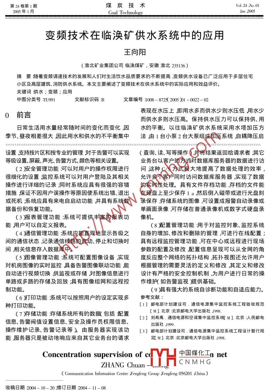 第24卷第1期煤炭技術(shù)Vol.24 ,No.012005年1月Coal TechnologyJan 2005煤炭通信網(wǎng)集中監(jiān)控張傳忠(河北省峰峰集團(tuán)公司通信信息中心,河北峰峰056201 )摘要闡述了煤炭通信網(wǎng)集中監(jiān)控系統(tǒng)建設(shè)的必要性和由此帶來(lái)的經(jīng)濟(jì)價(jià)值初步探討了煤炭通信網(wǎng)集中監(jiān)控系統(tǒng)的設(shè)計(jì)思路、系統(tǒng)結(jié)構(gòu)、監(jiān)控軟件應(yīng)具有的功能。關(guān)鍵詞集中監(jiān)控;交換設(shè)備;傳輸設(shè)備;環(huán)境量;安全管理;配置管理中圖分類(lèi)號(hào):TD65文獻(xiàn)標(biāo)識(shí)碼:A文章編號(hào):1008 - 8725( 2005 )1 - 0021-02本思想結(jié)合煤炭企業(yè)通信網(wǎng)現(xiàn)狀集中監(jiān)控系統(tǒng)在0前言結(jié)構(gòu)上可設(shè)計(jì)為一個(gè)分布式計(jì)算機(jī)監(jiān)控網(wǎng)絡(luò),系統(tǒng)我國(guó)大型煤炭企業(yè)通信網(wǎng)都是企業(yè)自建自維結(jié)構(gòu)可分為監(jiān)控中心、傳輸線路及現(xiàn)場(chǎng)監(jiān)控單元。的。傳統(tǒng)的企業(yè)通信網(wǎng)維護(hù)管理體制是分散的維護(hù)監(jiān)控中心主要功能為實(shí)時(shí)監(jiān)控通信網(wǎng)的交換設(shè)管理體制基本上是以生產(chǎn)礦井為單位進(jìn)行通信設(shè)備傳輸設(shè)備、動(dòng)力設(shè)備及環(huán)境量,對(duì)生產(chǎn)礦井程控備維護(hù)管理每個(gè)生產(chǎn)礦井都配備有-定的維護(hù)人機(jī)房.上報(bào)的各種信息進(jìn)行智能分析處理,實(shí)現(xiàn)告警員負(fù)責(zé)全部通信設(shè)備的維護(hù)工作實(shí)行輪班值守制。聯(lián)動(dòng)2。這種維護(hù)管理體制下維護(hù)人員勞動(dòng)強(qiáng)度大維護(hù)管現(xiàn)場(chǎng)監(jiān)控單元,負(fù)責(zé)采集程控交換機(jī)房交換設(shè)理水平不高,而且需要大量維護(hù)人員,已經(jīng)越來(lái)越不.備、傳輸設(shè)備、動(dòng)力設(shè)備及環(huán)境參量的數(shù)據(jù)并將數(shù)據(jù)能適應(yīng)企業(yè)的發(fā)展。盡快建設(shè)程控交換機(jī)、傳輸設(shè)定期上報(bào)監(jiān)控中心(告警信息實(shí)時(shí)上報(bào)),同時(shí)接收備、通信電源、機(jī)房空調(diào)集中監(jiān)控系統(tǒng)并充分發(fā)揮并執(zhí)行監(jiān)控中心發(fā)送來(lái)的遙控命令。現(xiàn)場(chǎng)監(jiān)控單元其作用是轉(zhuǎn)變企業(yè)通信網(wǎng)維護(hù)方式、提高維護(hù)質(zhì)量、可對(duì)交換設(shè)備、傳輸設(shè)備、高低壓配電設(shè)備、整流器、管理水平以及提高勞動(dòng)生產(chǎn)率的真正體現(xiàn)。那么,蓄電池、空調(diào)、環(huán)境參量進(jìn)行監(jiān)控,可以轉(zhuǎn)換智能開(kāi)如何架構(gòu)合理、穩(wěn)定、低成本的通信網(wǎng)集中監(jiān)控系關(guān)電源、智能空調(diào)等智能設(shè)備的監(jiān)控協(xié)議,并對(duì)其他統(tǒng)并充分發(fā)揮其作用是企業(yè)通信工程技術(shù)人員所監(jiān)控系統(tǒng)提供透明傳輸接口?;颈O(jiān)控單元主要由面臨的一個(gè)迫在眉睫的課題。各種監(jiān)控模塊及通訊設(shè)備組成。1企業(yè)通信網(wǎng)集中監(jiān)控系統(tǒng)設(shè)計(jì)思路根據(jù)企業(yè)對(duì)傳輸速率的不同需求及企業(yè)現(xiàn)有的傳輸資源情況傳輸線路可采用E1時(shí)隙分插、數(shù)字煤炭企業(yè)通信網(wǎng)集中監(jiān)控系統(tǒng)是利用多種監(jiān)測(cè)公務(wù)信道( V.11/RS-422. RS- 232 )2M專(zhuān)線、共享控制手段對(duì)分布的生產(chǎn)礦井的交換設(shè)備、傳輸設(shè)備、式E1總線以及PSTN、IP等方式傳輸數(shù)據(jù)并且可以通信電源、機(jī)房空調(diào)、蓄電池、高低壓配電等多種設(shè)混合組網(wǎng)。備和環(huán)境的各種參數(shù)、圖像、聲音等進(jìn)行遙測(cè)、遙信、3煤炭企業(yè)通信網(wǎng)集中 監(jiān)控系統(tǒng)的軟件遙調(diào)和遙控實(shí)時(shí)監(jiān)測(cè)其運(yùn)行參數(shù),診斷和處理故障,記錄和分析相關(guān)數(shù)據(jù)。通過(guò)多種靈活的傳輸方通信網(wǎng)集中監(jiān)控系統(tǒng)是-個(gè)實(shí)時(shí)性要求很強(qiáng)的式將這些監(jiān)控?cái)?shù)據(jù)和圖像傳輸?shù)街醒氡O(jiān)控中心,使網(wǎng)絡(luò)系統(tǒng)強(qiáng)調(diào)對(duì)通信設(shè)備故障事件的快速響應(yīng)和分散的遠(yuǎn)端與監(jiān)控中心連成--體。維護(hù)人員可以在故障告警的準(zhǔn)確性。因此采用多任務(wù)、實(shí)時(shí)性很強(qiáng).監(jiān)控中心進(jìn)行遠(yuǎn)距離監(jiān)控,可以準(zhǔn)確迅速地發(fā)現(xiàn)各的WindowsNT為網(wǎng)絡(luò)操作系統(tǒng)構(gòu)成的局域網(wǎng)系統(tǒng)用種故障和緊急情況,保障通信網(wǎng)的安全提高管理效作監(jiān)控系統(tǒng)的網(wǎng)絡(luò)平臺(tái)。用來(lái)完成對(duì)監(jiān)控系統(tǒng)的各率,從而實(shí)現(xiàn)通信局(站少人或無(wú)人值守的目的并.種數(shù)據(jù)進(jìn)行分析、處理、存儲(chǔ)等功能。應(yīng)用軟件的設(shè)對(duì)設(shè)備進(jìn)行集中監(jiān)控、集中維護(hù)和集中管理1。計(jì)應(yīng)采用模塊化結(jié)構(gòu),運(yùn)用多媒體技術(shù)進(jìn)行人機(jī)界面設(shè)中國(guó)煤化工展能力強(qiáng),升級(jí)簡(jiǎn)單。.2通信網(wǎng)集中監(jiān)控系統(tǒng)的