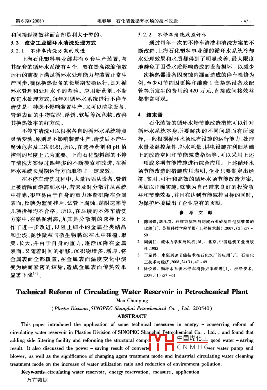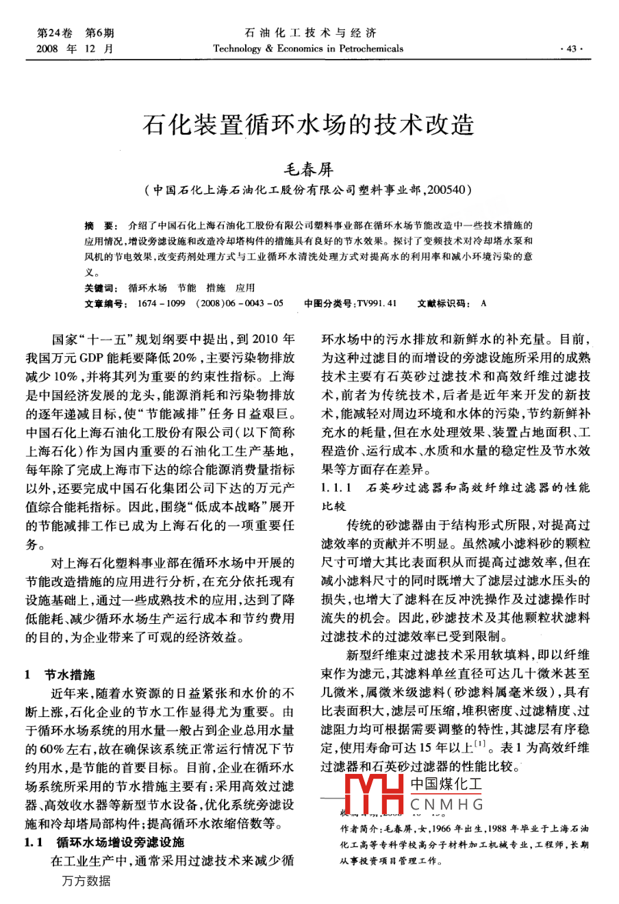 第24卷第6期石油化工技術(shù)與經(jīng)濟(jì)2008年12月Technology Economics in Petrochemicals石化裝置循環(huán)水場的技術(shù)改造毛春屏(中國石化上海石油化工股份有限公司塑料事業(yè)部,200540)摘要:介紹了中國石化上海石油化工股份有限公司塑料事業(yè)部在循環(huán)水場節(jié)能改造中一些技術(shù)措施的應(yīng)用情況,增設(shè)旁濾設(shè)施和改造冷卻塔構(gòu)件的措施具有良好的節(jié)水效果。探討了變頻技術(shù)對冷卻塔水泵和風(fēng)機(jī)的節(jié)電效果,改變藥劑處理方式與工業(yè)循環(huán)水清洗處理方式對提高水的利用率和減小環(huán)境污染的意關(guān)鍵詞;循環(huán)水場節(jié)能措施應(yīng)用文章編號:1674-1099(2008)06-0043-05中圖分類號:Tv991.41文獻(xiàn)標(biāo)識碼:A國家“十一五”規(guī)劃綱要中提出,到2010年環(huán)水場中的污水排放和新鮮水的補(bǔ)充量。目前,我國萬元GDP能耗要降低20%,主要污染物排放為這種過濾目的而增設(shè)的旁濾設(shè)施所采用的成熟減少10%,并將其列為重要的約束性指標(biāo)。上海技術(shù)主要有石英砂過濾技術(shù)和高效纖維過濾技是中國經(jīng)濟(jì)發(fā)展的龍頭,能源消耗和污染物排放術(shù),前者為傳統(tǒng)技術(shù),后者是近年來開發(fā)的新技的逐年遞減目標(biāo),使“節(jié)能減排”任務(wù)日益艱巨。術(shù),能減輕對周邊環(huán)境和水體的污染,節(jié)約新鮮補(bǔ)中國石化上海石油化工股份有限公司(以下簡稱充水的耗量,但在水處理效果、裝置占地面積、工上海石化)作為國內(nèi)重要的石油化工生產(chǎn)基地,程造價、運(yùn)行成本、水質(zhì)和水量的穩(wěn)定性及節(jié)水效每年除了完成上海市下達(dá)的綜合能源消費(fèi)量指標(biāo)果等方面存在差異。以外,還要完成中國石化集團(tuán)公司下達(dá)的萬元產(chǎn)1.L.I石英砂過濾器和高效纖維過濾器的性能值綜合能耗指標(biāo)。因此,圍繞“低成本戰(zhàn)略”展開比較的節(jié)能減排工作已成為上海石化的一項重要任傳統(tǒng)的砂濾器由于結(jié)構(gòu)形式所限,對提高過務(wù)濾效率的貢獻(xiàn)并不明顯。雖然減小濾料砂的顆粒對上海石化塑料事業(yè)部在循環(huán)水場中開展的尺寸可增大其比表面積從而提高過濾效率,但在節(jié)能改造措施的應(yīng)用進(jìn)行分析,在充分依托現(xiàn)有減小濾料尺寸的同時既增大了濾層過濾水壓頭的設(shè)施基礎(chǔ)上,通過一些成熟技術(shù)的應(yīng)用,達(dá)到了降損失,也增大了濾料在反沖洗操作及過濾操作時低能耗、減少循環(huán)水場生產(chǎn)運(yùn)行成本和節(jié)約費(fèi)用流失的機(jī)會。因此,砂濾技術(shù)及其他顆粒狀濾料的目的,為企業(yè)帶來了可觀的經(jīng)濟(jì)效益。過濾技術(shù)的過濾效率已受到限制。新型纖維束過濾技術(shù)采用軟填料,即以纖維節(jié)水措施束作為濾元,其濾料單絲直徑可達(dá)幾十微米甚至近年來,隨著水資源的日益緊張和水價的不幾微米,屬微米級濾料(砂濾料屬毫米級),具有斷上漲,石化企業(yè)的節(jié)水工作顯得尤為重要。由比表面積大,濾層可壓縮,堆積密度、過濾精度、過于循環(huán)水場系統(tǒng)的用水量一般占到企業(yè)總用水量濾阻力均可根據(jù)需要調(diào)整的特性,其濾層有序穩(wěn)的60%左右故在確保該系統(tǒng)正常運(yùn)行情況下節(jié)定,使用壽命可達(dá)15年以上。表1為高效纖維約用水,是節(jié)能的首要目標(biāo)。目前,企業(yè)在循環(huán)水過濾器和石英砂過濾器的性能比較。場系統(tǒng)所采用的節(jié)水措施主要有:采用高效過濾中國煤化工器、高效收水器等新型節(jié)水設(shè)備,優(yōu)化系統(tǒng)旁濾設(shè)CNMHG施和冷卻塔局部構(gòu)件;提高循環(huán)水濃縮倍數(shù)等。作者簡介:毛春屏,女,1966年出生,1988年畢業(yè)于上海石油1.1循環(huán)水場增設(shè)旁濾設(shè)施化工高等??茖W(xué)校高分子材料加工機(jī)械專業(yè),工程師,長期在工業(yè)生產(chǎn)中,通常采用過濾技術(shù)來減少循從事投資項目管理工作石油化工技術(shù)與經(jīng)濟(jì)第24卷第6期44Technology Economics in Petrochemicals2008年12月表1高效纖維過濾器和石英砂過濾器性能比較造前相同時間內(nèi)補(bǔ)水量約為18973×104m3,節(jié)項目高效纖維過濾器石英砂過濾器約補(bǔ)充水量45.85×10m3,折合水費(fèi)約98萬元過濾單元直徑/mm<0.01加上節(jié)約水處理劑折合的藥費(fèi)214.54萬元,合計過濾精度(濁度)/FTU取得效益為312.54萬元(當(dāng)時項目實際投入濾速/(m·h1)15~40110.32萬元),項目的投資回報率相當(dāng)好。截污容量/(kg·m3)1.2冷卻塔局部構(gòu)件改造過濾效率較高較低1.2.1冷卻塔局部構(gòu)件改造方案的制定濾料使用周期/a收水器是循環(huán)水冷卻塔內(nèi)部的重要構(gòu)件之濾層密度可調(diào)可控性可調(diào)可控不可調(diào)2~3其填料降溫性能如何直接影響到收水器的收自耗水量,%徹底不徹底水能力和冷卻塔的冷卻效果。上海石化塑料事業(yè)反洗效果(不存在跑料問題)(經(jīng)常跑砂)部聚烯烴裝置的循環(huán)水場在使用中存在冷卻塔飄噸水造價較低較高水嚴(yán)重的問題,原因是冷卻塔的收水器收水效果占地(制取相同水量)/m2不佳。為了改善這一情況,制定了如下改造方案從表1中看出,高效纖維過濾器與