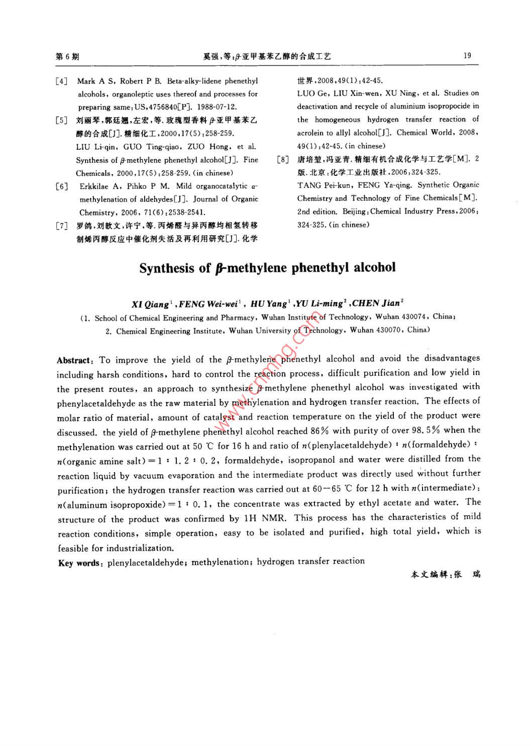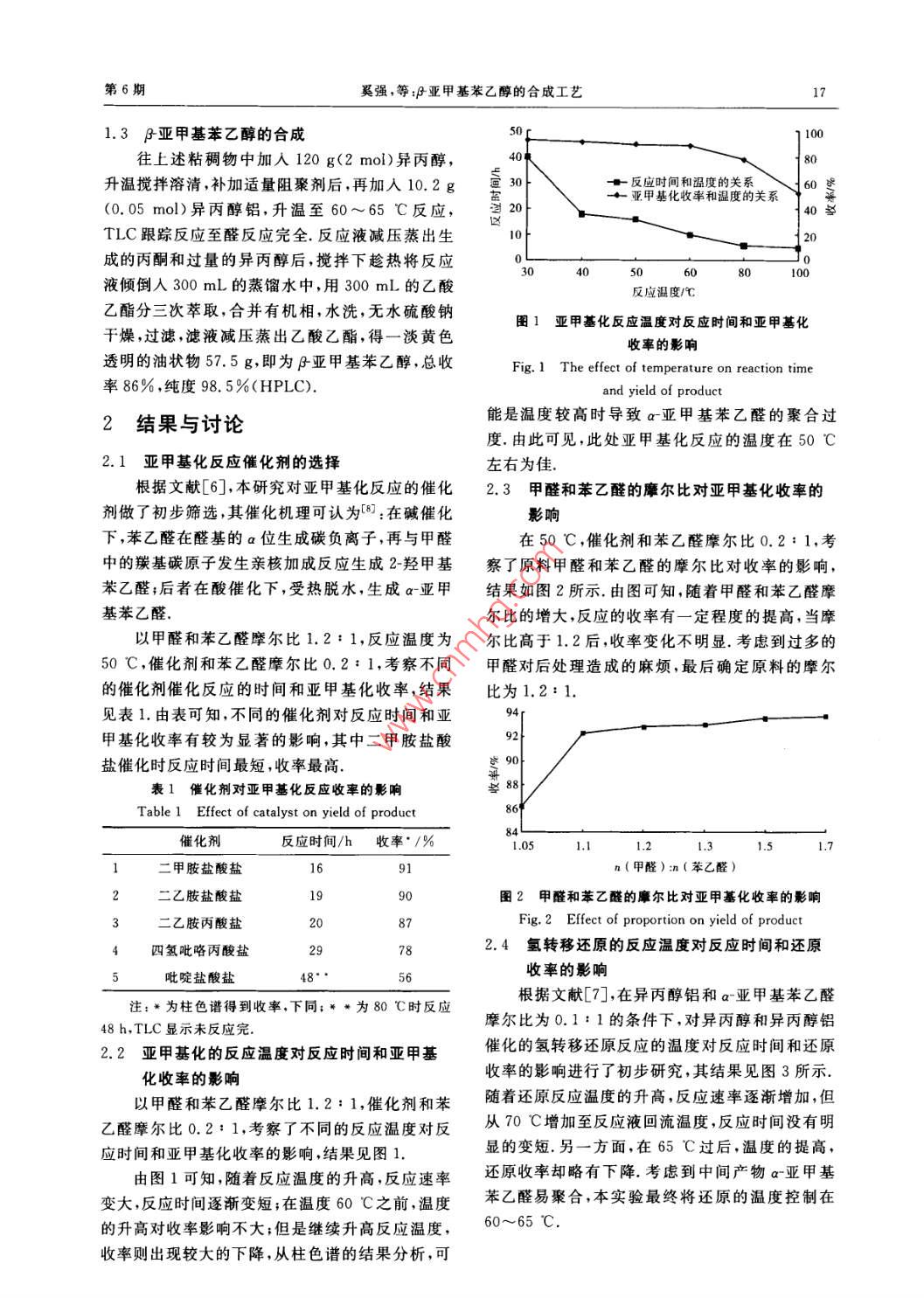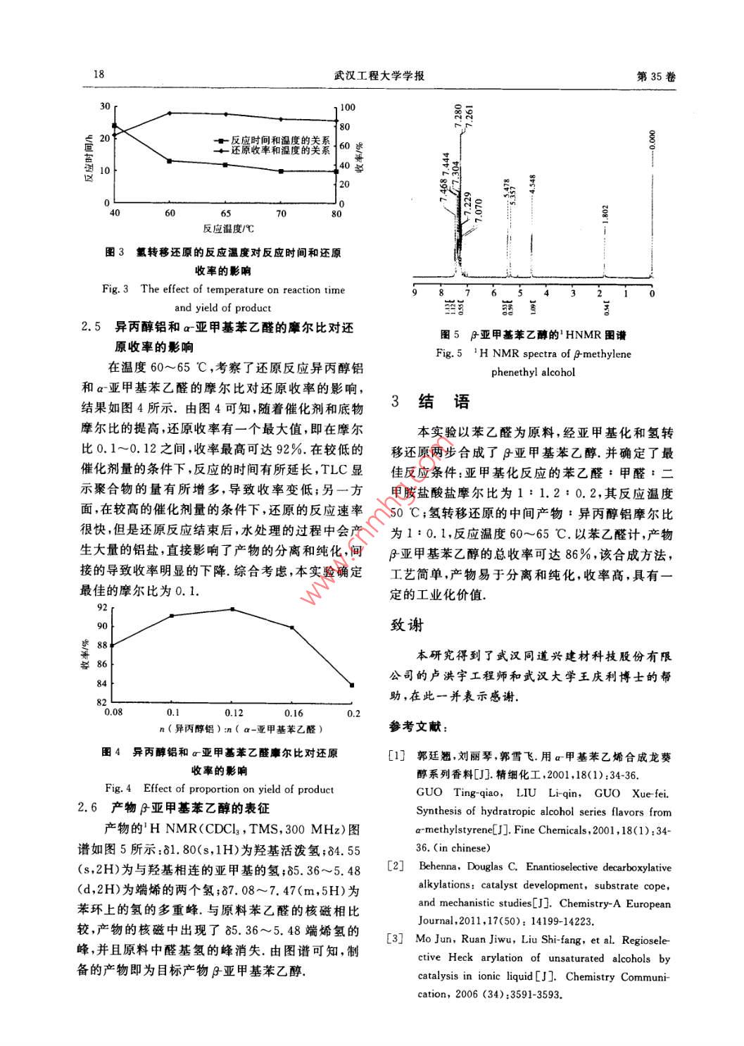 第35卷第6期武漢工程大學(xué)學(xué)報(bào) VoL. 35 No.62013年06月 J. Wuhan Inst. Tech.Jun.2013文章編號(hào):1674-2869(2013)06-0016-04亞甲基苯乙醇的合成工藝奚強(qiáng),馮薇偉,胡楊,余利民2,陳建2(1.武漢工程大學(xué)化工與制藥學(xué)院,湖北武漢430742.武漢理工大學(xué)化學(xué)工程學(xué)院,湖北武漢430070摘要:針對(duì)亞甲基苯乙醇合成工藝中反應(yīng)條件較苛刻、操作較復(fù)雜、產(chǎn)物難分離純化和總收率偏低的問(wèn)題,以苯乙醛為原料,經(jīng)亞甲基化反應(yīng)和均相氫轉(zhuǎn)移還原反應(yīng)兩步合成了亞甲基苯乙醇分別考察了兩步反應(yīng)投料比、催化劑的用量和反應(yīng)溫度等條件對(duì)產(chǎn)物收率的影響.結(jié)果表明,亞甲基化反應(yīng)在50℃,投料比為n(苯乙醛):n(甲醛):n(二甲胺鹽酸鹽)=11.2:0.2的條件下反應(yīng)16h最佳,反應(yīng)液經(jīng)減壓蒸出甲醛、異丙醇和水,中間產(chǎn)物無(wú)需進(jìn)一步純化,直接用于還原反應(yīng);氫轉(zhuǎn)移還原反應(yīng)于60~65℃下反應(yīng)12h,投料比n(a-亞甲基苯乙醛):n(異丙醇鋁)=1:0.1,反應(yīng)液用乙酸乙酯和水萃取、純化,得到亞甲基苯乙醇產(chǎn)物的總收率可達(dá)86%,純度98.5%以上,其結(jié)構(gòu)經(jīng)核磁共振氫譜確認(rèn).該合成工藝反應(yīng)條件溫和、操作簡(jiǎn)單、產(chǎn)業(yè)化價(jià)物易于分離和純化、收率高,具有一定的工業(yè)化價(jià)值關(guān)鍵詞:苯乙醛;亞甲基化;氫轉(zhuǎn)移還原中圖分類(lèi)號(hào):TQ243.4文獻(xiàn)標(biāo)識(shí)碼:aoi:10969/in.1-69203.06.000引言1實(shí)驗(yàn)部分亞甲基苯乙醇(-methylene phenethyl1.1儀器及試劑 alcohol),為一種透明的無(wú)色液體,具有柔和的玫DF-101S集熱式恒溫加熱磁力攪拌器,鞏義瑰香味,現(xiàn)多作為一種新型的香料,也可作為合成市予華儀器有限公司生產(chǎn);2XZ型雙級(jí)旋片式真其它香料的原料,是精細(xì)化工方面一種重要的空泵,鞏義市予華儀器有限公司生產(chǎn);二乙胺、丙中間體酸、四氫吡咯、吡啶、二甲胺鹽酸鹽、苯乙醛、甲醛現(xiàn)有的亞甲基苯乙醇的合成方法主要有三水溶液、異丙醇鋁、異丙醇、乙酸乙酯,均為國(guó)藥集種,方法一:通過(guò)格氏試劑的方法,該方法中的格團(tuán)化學(xué)試劑有限公司生產(chǎn)氏試劑較難制備2.方法二:利用heck反應(yīng),用鹵1.2a亞甲基苯乙醛的合成代苯和烯丙醇發(fā)生偶合反應(yīng)制備,反應(yīng)中使用了在N2保護(hù)下,在500mL的三口燒瓶中,加入貴金屬鈀為催化劑,回收使用不易3.方法三用240mL的異丙醇,攪拌下加入1.8g阻聚劑和甲基苯乙烯為原料,經(jīng)氯代、酯化和皂化反應(yīng)制60g(0.5mol)苯乙醛,攪拌均勻,滴加8.1g得,該路線較長(zhǎng),收率偏低5(0.1mol)二甲胺鹽酸鹽溶于48g質(zhì)量分?jǐn)?shù)37%本實(shí)驗(yàn)參考相關(guān)文獻(xiàn)7,以苯乙醛為原料,的甲醛水溶液(0.6mol)的混合溶液,控制滴加的經(jīng)亞甲基化和氫轉(zhuǎn)移還原兩步合成了亞甲基苯速率,使內(nèi)溫不超過(guò)50℃,滴加完畢后50℃保溫乙醇,并探討了投料比、催化劑的用量和反應(yīng)溫度反應(yīng),TLC跟蹤反應(yīng)至苯乙醛反應(yīng)完全反應(yīng)液常等條件對(duì)收率的影響在最佳反應(yīng)條件下,以苯乙溫減壓蒸出過(guò)量的甲醛,50℃減壓蒸出溶劑和生醛計(jì),產(chǎn)物β亞甲基苯乙醇的收率可達(dá)86%.同時(shí)成的水,并用異丙醇(20mL)帶兩次水,得一淺黃用HNMR對(duì)產(chǎn)物進(jìn)行了表征合成的路線如下:色粘稠物,即為a亞甲基苯乙醛粗品,不經(jīng)純化,H亞甲基化還原 OH直接用于氫轉(zhuǎn)移還原反應(yīng) CHO-收稿日期:2013-04-03作者簡(jiǎn)介:奚強(qiáng)(1966-),男,湖北浠水人,教授博士,碩士研究生導(dǎo)師研究方向:有機(jī)合成第6期奚強(qiáng)等亞甲基苯乙醇的合成工藝171.3亞甲基苯乙醇的合成50110往上述粘稠物中加入120g(2mol)異丙醇,4080升溫?cái)嚢枞芮?補(bǔ)加適量阻聚劑后,再加入10.2g30反應(yīng)時(shí)間和溫度的關(guān)系60(0.05mol)異丙醇鋁,升溫至60~65℃反應(yīng),20亞甲基化收率和溫度的關(guān)系40TLC跟蹤反應(yīng)至醛反應(yīng)完全.反應(yīng)液減壓蒸出生1020成的丙酮和過(guò)量的異丙醇后,攪拌下趁熱將反應(yīng)液傾倒入300mL的蒸餾水中,用300mL的乙酸00405060806080100反應(yīng)溫度/℃乙酯分三次萃取,合并有機(jī)相,水洗,無(wú)水硫酸鈉圖1亞甲基化反應(yīng)溫度對(duì)反應(yīng)時(shí)間和亞甲基化干燥,過(guò)濾,濾液減壓蒸出乙酸乙酯,得一淡黃色收率的影響透明的油狀物57.5g,即為亞甲基苯乙醇,總收 Fig. 1 The effect of temperature on reaction time率86%,純度98.5%(HPLC). and yield of product2結(jié)果與討論能是溫度較高時(shí)導(dǎo)致a亞甲基苯乙醛的聚合過(guò)度由此可見(jiàn),此處亞甲基化反應(yīng)的溫度在50℃2.1亞甲基化反應(yīng)催化劑的選擇左右為佳根據(jù)文獻(xiàn)[6],本研究對(duì)亞甲基化反應(yīng)的催化2.3甲醛和苯乙醛的摩爾比對(duì)亞甲基化收率的劑做了初步篩選,其催化機(jī)理可認(rèn)為8:在堿催化影響下,苯乙醛在醛基的a位生成碳負(fù)離子,再與甲醛在50℃,催化劑和苯乙醛摩爾比0.2:1,考中的羰基碳原子發(fā)生親核加成反應(yīng)生成2羥甲基察了原料甲醛和苯乙醛的摩爾比對(duì)收率的影響,苯乙醛;后者在酸催化下,受熱脫水,生成a亞甲結(jié)果如圖2所示由
