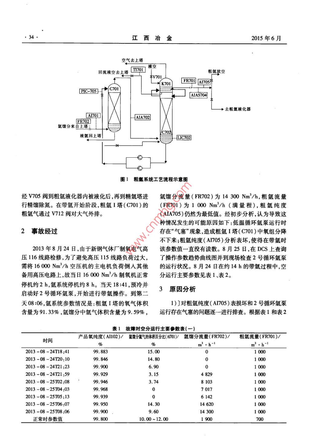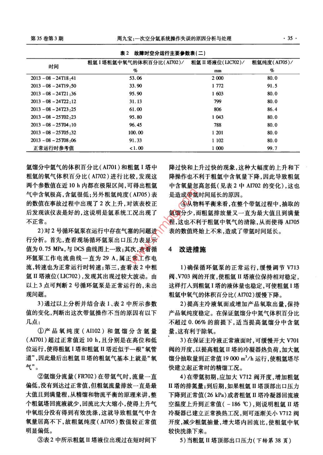 第35卷第3期江西冶ol.35,No.32015年6JIANGXI METALLURGY015文章編號(hào):1006-2777(2015)03003303次空分氬系統(tǒng)操作失誤的原因分析與處理周九寶(新余鋼鐵集團(tuán)有限公司,江西新余338001)要:新鋼氣體廠(chǎng)16000Nm3/h制氧機(jī)氬系統(tǒng)臨時(shí)停車(chē)后啟動(dòng)因操作不當(dāng)造成啟動(dòng)時(shí)間過(guò)長(zhǎng)。對(duì)這次操作不當(dāng)?shù)脑蜻M(jìn)行了分析與處理,并總結(jié)了縮短空分臨時(shí)停車(chē)后氬系統(tǒng)啟動(dòng)時(shí)間的操作方法。關(guān)鍵詞:空分設(shè)備;粗氬塔;循環(huán)氬泵;改進(jìn)操作中圖分類(lèi)號(hào):TB6577文獻(xiàn)標(biāo)志碼:BPrimary Air Separation Argon System Error Analysis and ProcessingZou JunbaoXinyu Iron and Steel Group Co, Ltd., Xinyu 338001 Jiangxi, ChinaAbstract: The start time of argon system is too long after temporary stop due to improper operation for 16 000 Nm/h oxygenator in gas plant. the reason of the impnis analyzed and processed, and the operation method for shortenstart-up time after the temporary stop is summarizedKey wordsseparation equipment; crude argon column; circulation argon pump i improved operation0前言提餾段氬餾分抽口處抽出約19000Nm3/h氬餾分,其中氬氣的體積含量為9%~1%,氧氣的體積含新鋼氣體廠(chǎng)16000Nmh制氧機(jī)采用常溫分量不超過(guò)90%,氮?dú)獾捏w積含量不超過(guò)0.06%。氬子篩吸附凈化、增壓透平膨脹機(jī)制冷、規(guī)整填料塔全餾分作為上升蒸氣由粗氬Ⅱ塔(C702)底部經(jīng)循環(huán)精餾無(wú)氫制氬、氧氮外壓縮的工藝流程,由DCS控氬泵加壓到0.8MPa后作為回流液在粗氬I塔制系統(tǒng)控制產(chǎn)品氧氮外壓縮流程。自2003年5月(C701)中進(jìn)行精餾,主要目的是初步洗滌含氧組投產(chǎn)以來(lái),該空分設(shè)備運(yùn)行一直比較穩(wěn)定,但203分。在粗氬I塔(C701)頂部得到氧氣體積比小于年8月24日一次空分臨時(shí)停車(chē)后,因在啟動(dòng)氬系統(tǒng)3%的蒸氣后上升到粗氬塔(C02)再進(jìn)行深度精餾。過(guò)程中發(fā)生了操作失誤,導(dǎo)致恢復(fù)時(shí)間過(guò)長(zhǎng)。本文粗氬塔頂部冷凝器(K701)是過(guò)冷后的液空冷源在就這次事故的原因分析和處理進(jìn)行介紹。冷凝器內(nèi)換熱后的液空蒸氣和相當(dāng)于2%總液空量的1粗氬系統(tǒng)工藝流程簡(jiǎn)介回流液空同時(shí)返回主塔提餾段。粗氬Ⅲ塔(C702)內(nèi)上升的蒸氣大部分被冷凝器(K701)冷凝成液體而成為本套空分設(shè)備的精液氯產(chǎn)品采用全低溫精餾法塔內(nèi)回流液剩下約為700Nm7/h的粗氬氣(其體制取。粗氬系統(tǒng)工藝流程示意圖見(jiàn)圖1。先從上塔積組成為:q(A)=99.8%,q(O2)≤2×106),收稿日期:2014-06-05作者簡(jiǎn)介:周九寶(1978-),男,江西新余人,技師,從事空氣分離生產(chǎn)工作江西冶金2015年6月空氣去上塔回流液空去上塔[m液空粗氫放空v701K70FR701AI705PC=705}C701去粗氬液化器AI701AIA702FR702氬餾分來(lái)自上塔液氬回上塔LIC702L°圖1粗氳系統(tǒng)工藝流程示意圖經(jīng)v705閥到粗氬液化器內(nèi)被液化后,再到精氬塔進(jìn)氬餾分流量(F70)為14300Nm3/h,粗氬流量行精餾除氮。在帶氬開(kāi)始階段,粗氬I塔(C701)的(FR701)為1000Nm3/h(滿(mǎn)量程),粗氬純度粗氬氣通過(guò)Ⅵ712閥對(duì)大氣外排。(AIA705)仍然為最低值。經(jīng)初步分析,認(rèn)為導(dǎo)致這種情況發(fā)生的可能原因如下:低溫循環(huán)氬泵運(yùn)行時(shí)2事故經(jīng)過(guò)存在“氣塞”現(xiàn)象,造成粗氬I塔(C701)中氧組分降不下來(lái);粗氬純度(A705)分析表壞,使得在帶氬時(shí)2013年8月24日,由于新鋼氣體廠(chǎng)制氧電氣高該參數(shù)值一直沒(méi)有讀數(shù)。8月25日,在DCS上查詢(xún)壓16線(xiàn)路檢修,為了避免高壓115線(xiàn)路負(fù)荷過(guò)大,了操作參數(shù)趨勢(shì)曲線(xiàn)圖并到現(xiàn)場(chǎng)檢查2號(hào)循環(huán)氬泵需將16000Nm3/h空壓機(jī)的主電機(jī)負(fù)荷倒入其他的運(yùn)行狀況。8月24日在約14h的帶氬過(guò)程中,空備用高壓電路上,故當(dāng)日16000Nm3/h制氧機(jī)正常分運(yùn)行主要參數(shù)見(jiàn)表1表2。停機(jī)約2h,氬系統(tǒng)停機(jī)約8h。當(dāng)天18:41,預(yù)冷并3原因分析啟動(dòng)好2號(hào)循環(huán)氬泵,開(kāi)始進(jìn)行帶氬操作。到第二天08:06,氬系統(tǒng)參數(shù)情況是:粗氬I塔的氧氣體積1)〕對(duì)粗氬純度(A705)表?yè)p壞和2號(hào)循環(huán)氬泵含量為9133%,氬餾分中氬氣體積含量為9.59%,運(yùn)行存在氣塞的問(wèn)題逐一進(jìn)行排查。根據(jù)表1和表2表1故障時(shí)空分運(yùn)行主要參數(shù)表(一)產(chǎn)品氧純度(AI02)/氯分氣的體積百分比(Am)y氬餾分流量(FR72)/粗氨流量(FR0I)時(shí)間2013-08-24T18:4115.002013-08-24T20:1099.84610006.9010002013-08-24121:593.1510002013-08-2502:0899.94681032013-08-25104:0399.96807017l0002013-08-25105:1399.939061422013-08-25106:099.95014.30146202013-08-25T08:069,6014300正常時(shí)參數(shù)值99.80010.00~12.001900第35卷第3期周九寶:一次空分氬系統(tǒng)操作失誤的原因分析與處理35表2故障時(shí)空分運(yùn)行主要參數(shù)表(二)粗氯1塔粗氬中氧氣的體積百分比(Am2)/粗氬Ⅱ塔液位(LC702)/粗氨純度(A705)/時(shí)間%2013-08-24T18:4153.06200080.02013-08-24T19:50177291.52013-08-24T21:3695.160380.02013-08-24T22:1231.13013-08-24T23:252013-08-25102:23104380.02013-08-25m04:1096.4580.02013-08-25105:3212080.02013-08-25108:0691.3311080.0正常運(yùn)行時(shí)參考