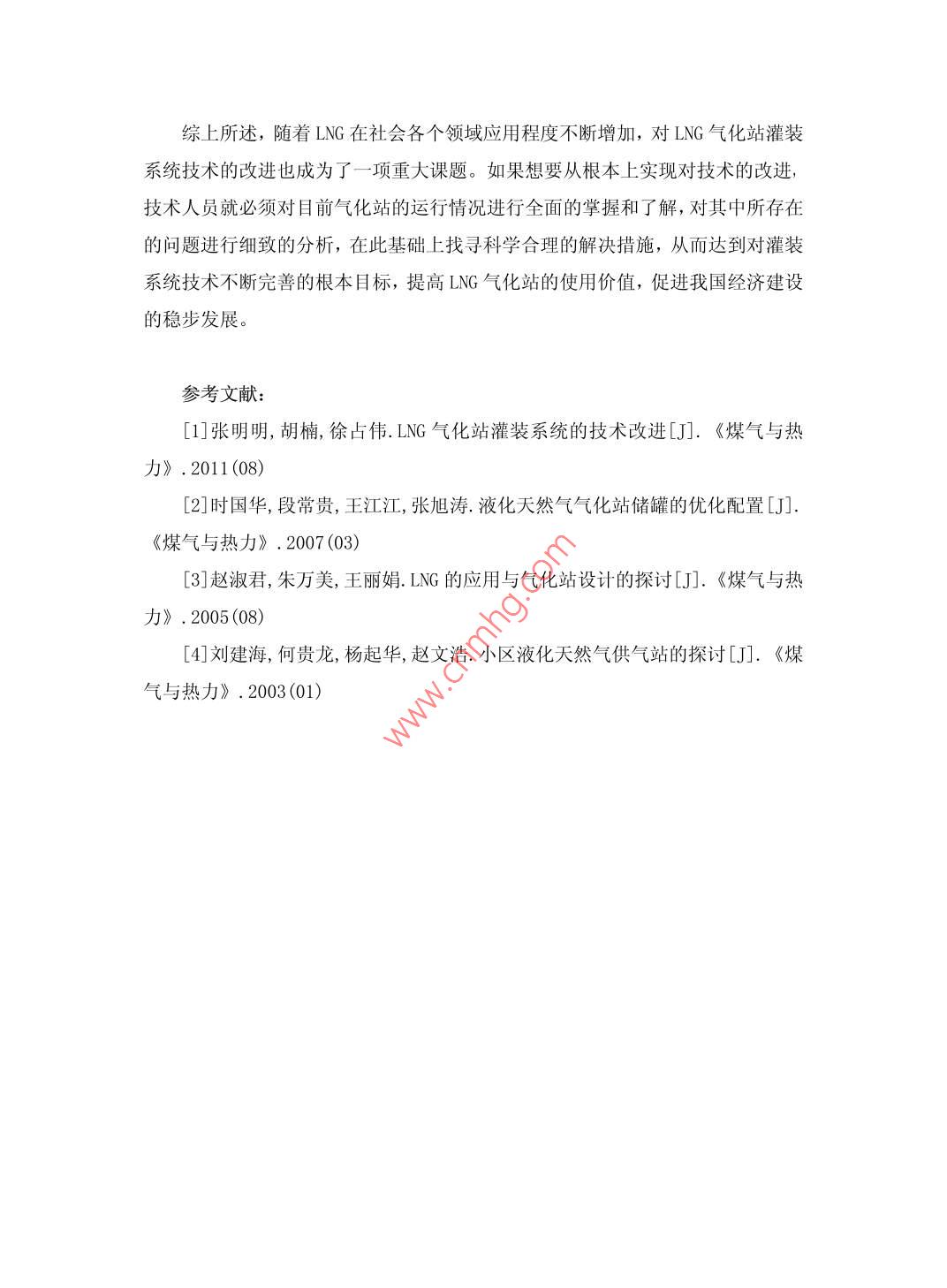 研究如何改進LNG氣化站灌裝系統(tǒng)技術張治國龔劍中國市政工程西北設計研究院有限公司甘肅蘭州 730000摘要:近幾年來,隨著LNG在社會各個領域中的廣泛應用,LNG氣化站灌裝系統(tǒng)技術也得到了相關部門人員的高度重視。LNG氣化站是一一個接收、儲存和分配LNG的基地,其本身具有低溫儲存的特點。為了能夠滿足氣化站正常供氣工作,對LNG氣化站灌裝系統(tǒng)技術進行改進是不容忽視的。本文通過對LNG氣化站灌裝鋼瓶使用過程中存在的問題進行分析,簡要介紹對系統(tǒng)技術改進的重要性,從而在此基礎上采取科學的方案改進系統(tǒng)技術,促進氣化站的正常供氣工作。關鍵詞: LNG 氣化站;灌裝系統(tǒng);技術Abstract: in recent years, with the wide application of LNG in all areas ofsociety, flling system of LNG gasification station has been attached greatimportance to related dept.. LNG vaporizing station is a receiving, storage anddistribution of the LNG base, its itself has the characteristics of lowtemperature storage. In order to meet the normal supply of gas station, LNGstation flling system improved techniques can not be ignored. In this paper, byanalyzing the existing flling cylinder of LNG gasification station problems in theuse process are briefly introduced, the importance of improvement of thesystem, and on this basis to take scientific scheme to improve the system,work to promote the normal gas gasification station.Keywords: LNG gasification station; flling system; Technology中圖分類號: TU74文獻標識碼: A文章編號: 2095-2104 (2013)隨著我國國民經濟發(fā)展腳步的不斷加快,燃氣公司也像雨后春筍般涌現(xiàn),LNG氣化站作為城市備用和調峰氣源,目前在市場經濟中也占據(jù)了- -定的位置。燃氣公司如果想要實現(xiàn)對LNG資源的有效運作,使企業(yè)的投資收益最大化,那么就必須對LNG氣化站灌裝系統(tǒng)技術進行不斷的完善與優(yōu)化,努力將其投資省、建設周期短以及運行安全可靠等特點充分的發(fā)揮出來,以此來促進燃氣公司的可持續(xù)發(fā)展。一、LNG 氣化站灌裝鋼瓶使用中存在的問題從我國目前LNG氣化站灌裝鋼瓶使用現(xiàn)狀來看,雖然其所采用的技術能夠基本滿足系統(tǒng)運行的需要,但是在一-些特殊環(huán)境下,系統(tǒng)的運行和使用仍然存在一些有待解決的問題。比如說410L低溫絕熱LNG鋼瓶,正常情況下,在LNG鋼瓶使用的過程中,其本身的充裝質量最大為167kg,允許范圍內的總重量大約為487kg。對于這種類型的LNG鋼瓶,在對其進行灌裝的時候,應該提前在機械的臺秤上設置相關的目標質量值,質量值的范圍應該控制在允許的范圍內,待到質量值滿足要求之后,工作人員打開充液閥門進行充液,充液完成后關閉充液閥門即可。但是,目前在LNG氣化站使用過程中,經常會出現(xiàn)由于機械臺秤本身的誤差、人工操作的時間差以及員工的誤操作等因素而導致的灌裝超量的現(xiàn)象發(fā)生,從而影響到LNG灌裝計量的準確性和鋼瓶的安全性。這種現(xiàn)象嚴重違反了《城市燃氣設計規(guī)范》中灌裝量不能夠大于其容積90%的規(guī)定。給LNG氣化站灌裝鋼瓶的安全使用也造成了很大的威脅。因此,相關技術人員必須充分認識其重要性,采取相應的措施將其有效解決,以此來確保LNG灌裝使用的安全性。二、如何改進LNG氣化站灌裝系統(tǒng)技術為了能夠將上述問題有效解決,針對問題發(fā)生的原因,相關技術人員經過一-段時間的研究、探討和實踐,在原有設計的基礎上對LNG氣化站灌裝系統(tǒng)的相關技術進行了調節(jié)和改進,利用先進的技術方案來對機械臺秤本身的誤差、人工操作的時間差以及員工的誤操作等因素而導致的灌裝超量問題進行有效解決。2.1LNG灌裝的技術改進方案目前,在我國LNG氣化站灌裝系統(tǒng)中,所采用的幾乎都是配置較為完善的LPG充裝秤產品,因為LNG本身所具有的深冷性質以及--些部件本身所具有的缺點,所以,我國目前還不存在某個廠商生產成品的LNG灌裝秤。此外,由于LNG加氣機的價格相對來說比較昂貴,類型也多種多樣,因此,我國廠站目標還不具備相應的LNG加氣業(yè)務,所以在對LNG灌裝的技術改進過程中,技術人員并沒有考慮使用LNG加氣機來進行單- -的LNG鋼瓶灌裝,而是快決定采用電子秤、灌裝控制等主要裝置進行集成的方式來完成既定的方案目標。具體的實施方案為:利用電子臺秤來替代系統(tǒng)中原有的機械臺秤,這樣做是為了減少臺秤所產生的誤差,然后在LNG灌裝臺上安裝-一個 負責控制稱重的儀表柜,在液相管道上安裝一- 個氣動緊急切斷閥ESV,在系統(tǒng)運行的時候,ESV會發(fā)出相應的信號,系統(tǒng)便會根據(jù)信號來正確運行。其次,系統(tǒng)中還使用阻燃鎧裝電纜將電子臺秤和稱重控制儀表柜連接起來,此外,還應該連接稱重控制儀表柜和氣動緊急切斷閥,使這幾個部分能夠初步實現(xiàn)互相連鎖;安裝儀表風管道至氣動緊急切斷閥;另外,為防止管道內產生封閉LNG而導致超壓,在氣動緊急切斷閥和出液閥之間增加1個低溫全啟式安全閥。改進或的LNG灌裝工藝流程能夠在很大程度上避免由于機械臺秤本身的誤差、人工操作的時間差以及員工的誤操作等因素而引起的問題,確保了系統(tǒng)運行的穩(wěn)定性和安全性。2.2技術要點及注意事項為了能夠將LNG氣化站灌裝系統(tǒng)技術的改進工作順利完成,在系統(tǒng)改進過程中,技術人員必須要做到對相關的技術要點和