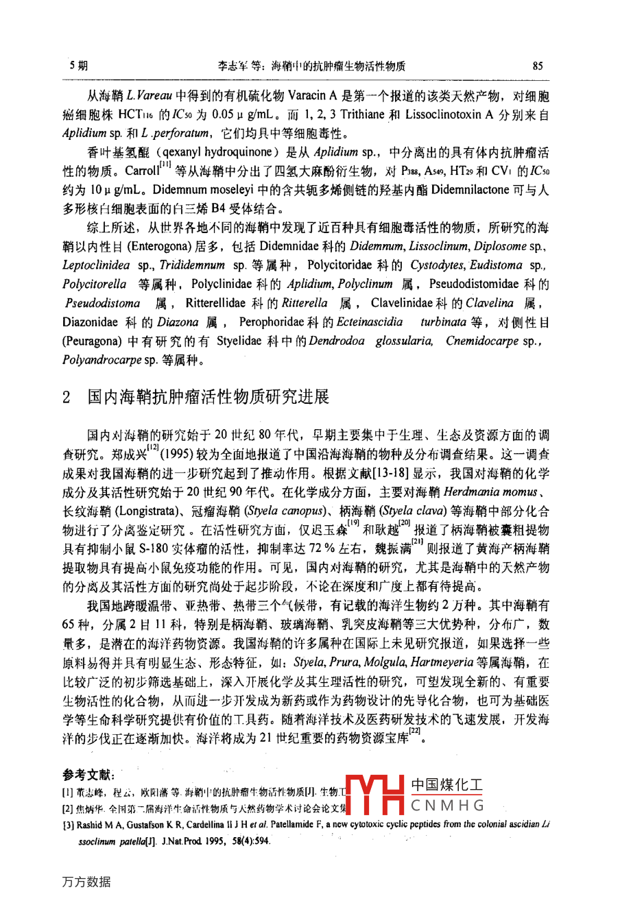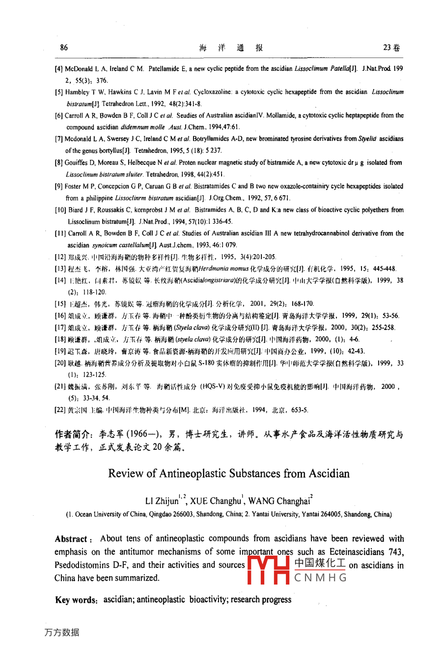第23卷第5期海洋通報Vol 23, No52004年10月MARINE SCIENCE BULLETINoct,2004海鞘中的抗腫瘤生物活性物質(zhì)李志軍,薛長湖,王長海(1.中國海洋大學(xué),山東青島266003:2煙臺大學(xué),山東煙臺264005)摘要:綜述了海鞘中發(fā)現(xiàn)的數(shù)上種抗腫瘤活性物質(zhì),包括其活性、來源等,對其中重要者,如:Ecteinascidin743和 Psedodistomins D-F等活性物質(zhì)抗腫瘤的作用機(jī)理作了較詳細(xì)的介紹。并概述了國內(nèi)該領(lǐng)域的研究狀況關(guān)鍵詞:海鞠:抗腫瘤:生物活性:研究進(jìn)展中圖分類號:R9791;Q5文獻(xiàn)標(biāo)識碼:A文章編號:1001-63922004)05008205海洋是生物進(jìn)化的發(fā)源地,海洋中蘊(yùn)藏著極其豐富的海洋生物資源,約占地球生物物種總數(shù)的80%。海洋生物以它獨(dú)特的生活方式—一棲息、運(yùn)動、洄游、攝食、排泄、繁殖生長、御敵等,生活在復(fù)雜而多變的海洋環(huán)境里,獨(dú)特的生活環(huán)境和漫長的進(jìn)化歷程可使這些海洋生物體內(nèi)蘊(yùn)含了許多結(jié)構(gòu)新穎、活性獨(dú)特的化合物。至今已發(fā)現(xiàn)的具有抗腫瘤、抗病毒、調(diào)節(jié)免疫系統(tǒng)以及作用于心腦血管系統(tǒng)等生理活性的海洋生物活性物質(zhì)5000余種。僅以抗腫瘤方面活性為例:估計約有10%的海洋動物和35%的海洋植物的提取物,表現(xiàn)出刈P38白血病細(xì)胞、KB細(xì)胞(口腔表皮癌細(xì)胞)等哺乳動物腫瘤細(xì)胞的細(xì)胞毒活性。自20世紀(jì)60—70年代以來,已從海洋生物海綿中發(fā)現(xiàn)一系列具有生理活性的化合物,從而掀起了海洋天然產(chǎn)物研究的熱潮。同時,人們的目光也投向了海鞘和珊瑚。近年來,在海鞘中發(fā)現(xiàn)了許多結(jié)構(gòu)新穎、活性獨(dú)特的化合物,引起了天然產(chǎn)物化學(xué)和藥物化學(xué)研究人員的高度重視。海鞘化學(xué)成分的研究遂漸成了海洋天然產(chǎn)物化學(xué)研究的熱點(diǎn)之一,海鞘也成了除海綿之后人類獲取有顯著生理活性物質(zhì)的重要海洋生物資源。本文對海鞘中具細(xì)胞毒活性的化合物主要有生物堿類、肽類、聚醚類、萜類、大環(huán)內(nèi)酯類及多硫化合物等進(jìn)行了綜述。1國外海鞘抗腫瘤活性物質(zhì)研究進(jìn)展1.1生物堿從海鞘分離出的化合物其抗腫瘤活性研究是重點(diǎn)之一,而且具有抗腫瘤細(xì)胞毒活性最多的當(dāng)屬生物堿類化合物。20世紀(jì)70年代初,人們就發(fā)現(xiàn)海鞘 Ecteinascidia turbinata提取液具有體外細(xì)胞毒活性和體內(nèi)的腫瘤抑制活性。從 Ecteinasidia turbinata中分離出的生物堿Ecteinasidins(簡稱E)729,743在體內(nèi)外試驗(yàn)中均顯示抑癌活性,對鼠白血病細(xì)胞株P(guān)38的Cs為093μgmL。美國國家癌癥研究所(NC的 Yves pommier博士認(rèn)為:E743的作用機(jī)制是全新的,不同于現(xiàn)有的抗癌藥物。E743已被歐盟承認(rèn)為治療組織肉瘤的罕用藥物。目前,該藥還處于治療乳腺癌、直腸癌、卵巢癌、非中國煤化工黑色素癌、骨肉瘤和皮瘤的一期試驗(yàn)。除 Ecteinascidians743外,手活性的生物堿CNMHG收稿日期:20030718;收修改稿日期:20031225期李志軍等:海鞘的抗腫瘤生物活性物質(zhì)豪具細(xì)胞毒活性化合物(海蔚生物堿)Tab. I Cytotoxic compounds from ascidian(alkaloids)名稱來源生物活性/μg·mtPseudodistominsAPseudodistoma kanokkoC:2.5(L)DiplamineDiplosoma sp0.02(L2m)ClavepictinesCl-10(L12m)Clavering sp/Cu: 0.5(HCTu)Lkianol AAkademik oparin/Csn: I(KB)ICn: -0.25(P,kk, Asg)CystamineCystodytes dellechiajeiIC,: 1.0(CEM)E: latinIC, 53(HCT)Staurosporine aglyconeEudistoma sp20(As3.2(P1y)PseudodistomicPseudodistom ic kankoC23(L1)26(KB)SulcationMicrocosmus /ulgar見表1)。同時人們?nèi)栽诓粩嗟蒯娪眯碌姆椒◤牟煌暮G手袑ふ倚碌目鼓[瘤活性的生物堿。例如從 Micronesian ascidian中發(fā)現(xiàn)了具有DNA損傷誘導(dǎo)活性的哌啶生物堿Psedodistomins D-F;從 Didemnum種海鞘中發(fā)現(xiàn)了海鞘綱第一個吡咯丫啶( Pyrroloacridine)生物堿 Plakinidine D。另一方面,對這些生物堿的作用機(jī)理展開了深入的硏究,如發(fā)現(xiàn)Et743和 Ascididemin對多藥物抗性( Multidrug Resistance MDR)細(xì)胞等同樣具有細(xì)胞毒作用,而MDR是影響腫瘤治療效果的一個重要因素,其物質(zhì)基礎(chǔ)是腫瘤細(xì)胞表面P糖蛋白的過量表達(dá)。試驗(yàn)結(jié)果同時顯示,該生物堿作用于富含GC的DNA片段,其對腫瘤細(xì)胞的抑制作用與拓?fù)洚悩?gòu)酶I,Ⅱ無關(guān),而早期卻曾有研究顯示它在75 mmol/L濃度時能抑制拓?fù)洚悩?gòu)酶ⅡI。1.2肽類海鞘中的生物活性肽以環(huán)肽居多。第一個得到的有細(xì)胞毒作用的環(huán)肽是Ulithiacyclamide,是從 lis soclinum patella分離得到的。它對白血病細(xì)胞L的!C0為0.35μgmL。隨后, Rinehart等從 Didemnide科的 Trididemnmum solidum中成功地分離得到環(huán)肽 Didemnins,并證實(shí)它們具有抗腫瘤細(xì)胞毒活性。通過對抗腫瘤活性最強(qiáng)的 Didemnin作用機(jī)理的研究表明, Didemnins既能抑制蛋白質(zhì)的合成,也能抑制 DNA, RNA的合成,對黑色素瘤B6細(xì)胞周期作用的研究表明,它可殺傷各期細(xì)胞,尤以G至S期細(xì)胞敏感。Didemnin B在11年開始的I/Ⅱ期臨床試驗(yàn)中顯示,其對非何杰金淋巴瘤和腦膠質(zhì)母細(xì)胞瘤有一定療效,遺憾的是,在隨后進(jìn)行的針對變態(tài)前列腺癌、了宮頸鱗狀細(xì)胞癌、小細(xì)胞肺癌、骨髓瘤