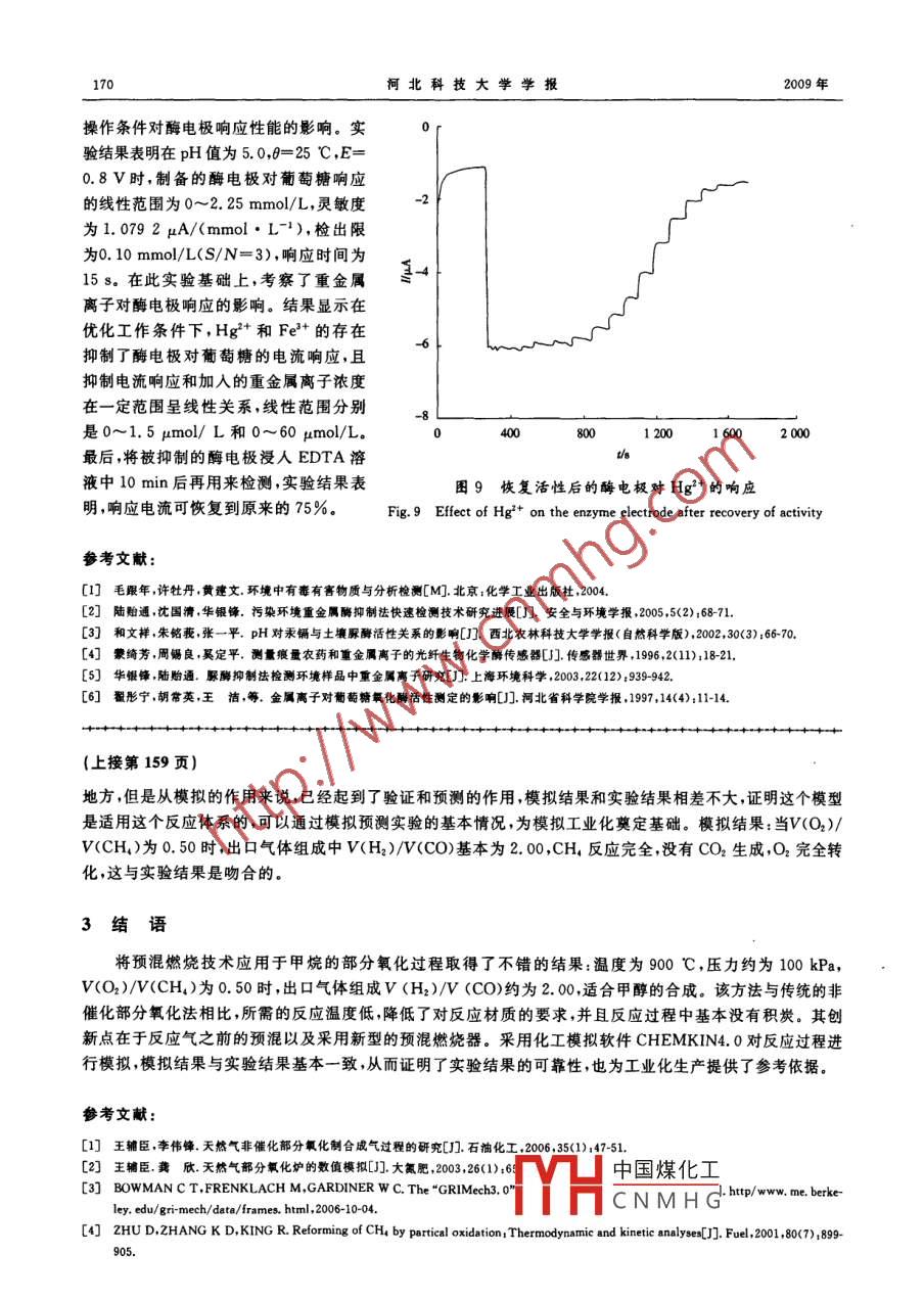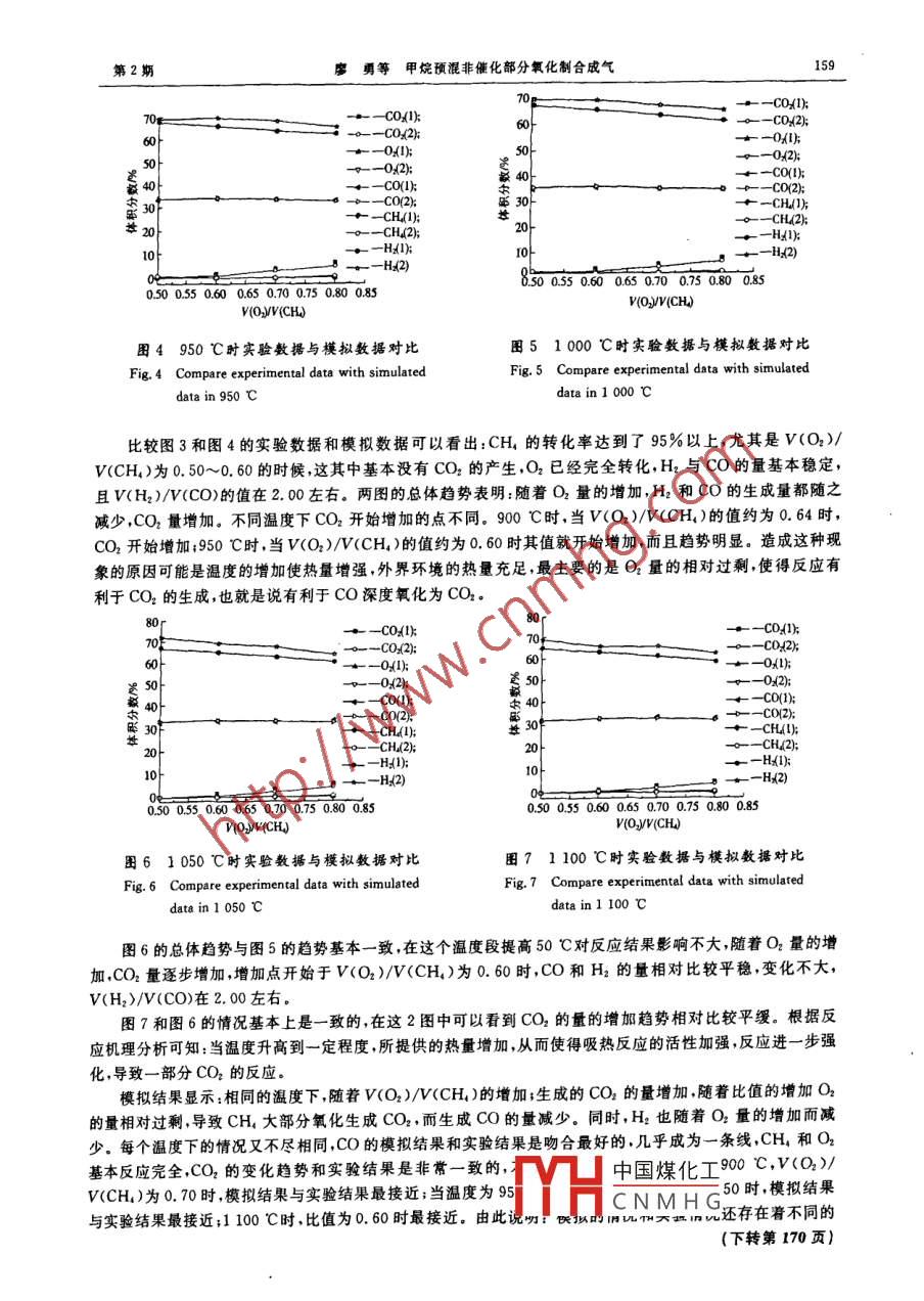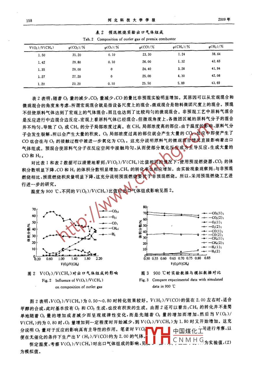 第30卷第2期河北科技大學學報vo.30,No.22009年6月Journal of Hebei University of Science and TechnologyJune 2009文章編號:1008-1542(2009)020156-04甲烷預(yù)混非催化部分氧化制合成氣廖勇1,楊會龍2,李智勇,李青1,劉潤靜1(1.河北科技大學化學與制藥工程學院,河北石家莊050018;2.河北科技大學總務(wù)處,河北石家莊摘要:隨著以天然氣為原料制得合成氣繼而生產(chǎn)高品質(zhì)液態(tài)烴工藝的日益成熟,天然氣非催化部分氧化工藝越來越引起人們的關(guān)注。設(shè)計了一種預(yù)混非催化部分氧化工藝,采用自制預(yù)混燃燒器,對非預(yù)混和預(yù)混非催化部分氧化工藝進行了對比實驗。采用 CHEMKIN4.0中的預(yù)混燃燒模型,對實驗過程進行了模擬,模擬結(jié)果與實驗結(jié)果基本一致。結(jié)果表明:預(yù)混優(yōu)于非預(yù)混非催化部分氧化工藝,溫度低,無積炭,進一步驗證了適合甲醇合成的最佳實驗條件是V(O2)/V(CH)為0.50,溫度為900℃,壓力約為100kPa,出口氣體中V(H2)/V(CO)約為2.00。關(guān)鍵詞:甲烷;非催化部分氧化;預(yù)混;合成氣; CHEMKIN4.0;模擬中圖分類號:TE646文獻標識碼:APremixed non-catalytic partial oxidation of methane to synthesis gasLIAO Yong, YANG Hui-long, LI Zhi-yong, LI Qing, LIU Run-jing1. College of Chemical and Pharmaceutical Engineering, Hebei University of Science and Technology, Shijiazhuang Hebei050018. China: 2. Office of General Services, Hebei University of Science and Technologhuang Hebei 050018. ChinaAbstract: Non-premixed and premixed non-catalytic partial oxidation process were studied. Premixed combustor was used tonon-catalytic partial oxidation process, with H2/CO ratio close to 2 in outlet gas. Effects of O/ CH, on composition of outlet gaswas studied in the constant temperature. The premixed combustion module of CHEMKIN4 0 was used to simulate experimentalprocess, whose results were consistent with the experimental results. Process conditions optimazied to prepare methanol werefollows: Reaction temperature 900 C, O/CH, ratio 0. 50, pressure 100 kPa, H/CO ratio close to 2. 00.Key words: methane non-catalytic partial oxidation; premix; synthetic gas: CHEMKIN4. 0:simulation在高溫、高壓、無催化劑的條件下,碳氫化合物與氧氣進行部分燃燒反應(yīng)生產(chǎn)合成氣(CO+H2)的過程,稱為非催化部分氧化。該工藝形成于20世紀50年代早期,主要用于以渣油或天然氣為原料生產(chǎn)合成氣非催化部分氧化工藝得到的合成氣中H2和CO的體積比接近2,適合于甲醇等合成的理論要求,無需進行變換反應(yīng)和合成氣凈化就可以直接進行合成。隨著以天然氣為原料制得合成氣繼而生產(chǎn)高品質(zhì)液態(tài)烴工藝的日益成熟,天然氣非催化部分氧化工藝越來越引起人們的關(guān)注1,2,寧夏石化分公司和蘭州石化總廠是目前中國僅有的2家將渣油非催化空氣氧化法制合成氣改成天然氣非催化空氣氧化法的廠家。反應(yīng)過程中甲烷和空氣分別進入德士古燒嘴里噴入氣化爐,即非預(yù)混非催化部分氧化制合成氣法。由于工藝要求爐內(nèi)溫度高達1400℃,如大大縮短了燒嘴的使用壽命,導(dǎo)致燒嘴的經(jīng)常替換而增加成本,且反應(yīng)過程積炭多,后續(xù)工藝處理復(fù)中國煤化工:非預(yù)混非催化部CNMHG收稿日期:20081211修回日期:20090303;貴任編輯:張士堂作者簡介:廖勇(1984-),男,四川綿陽人,碩士研究生,主要從事無機納米粉體材料制備方面的研充聯(lián)系人:劉潤靜教授第2期瘩勇等甲烷預(yù)混非催化部分氧化制合成氣157分氧化法需要解決的主要問題筆者設(shè)計了一種預(yù)混非催化部分氧化工藝,在常壓條件下對甲烷的非催化部分氧化過程進行了研究,考察了入口氣體比例對出口氣體組成的影響,并采用 CHEMKIN4.0對實驗結(jié)果進行了模擬對比。1實驗部分1.1工藝裝置圖非催化部分氧化工藝裝置見圖1.2模型選擇采用化工模擬軟件 CHEMKIN4.0,選用預(yù)混燃燒模型,采用目前甲烷燃燒模擬的通用燃燒機理GR1-1.214反應(yīng)機理及其相關(guān)的熱力學和傳遞數(shù)據(jù)庫1.3反應(yīng)裝置1)自制非預(yù)混反應(yīng)裝置非預(yù)混瓷套管反應(yīng)器是由2個內(nèi)徑不同的瓷管組成的,1-甲烷鋼瓶:2一氧氣鋼瓶:3-控制柜;4-預(yù)混燃燒器內(nèi)徑為6mm,外徑為12mm。5一管式電阻爐:6-反應(yīng)管;7-冷卻器;8-熱電偶(1);2)預(yù)混反應(yīng)裝置9一熱電偶(2);10-熱電偶(3);11-熱電偶(4);該裝置由預(yù)混器、電爐和出口氣體處理器3部分組成。12-熱電偶(5)預(yù)混器主要由預(yù)混部分和噴嘴部分組成,與非預(yù)混裝置相比圖1非催化部分氧化工藝裝置較,其不同點在于原料氣首先進入預(yù)混器進行預(yù)混合。在預(yù)Fg.1 Non-catalytic partial oxidation process混器中氣體被充分混合預(yù)熱后,再以一定的速度由噴嘴噴出,進入反應(yīng)器內(nèi)。進入噴嘴前后氣體速度的變化是由于噴嘴的變徑作用而產(chǎn)生的。2結(jié)果與討論2.1非預(yù)混燃燒工藝實驗非預(yù)混實驗過程中,O2走環(huán)隙CH,走內(nèi)管,目的是使CH4噴出后與O2充分擴散混合,從而降低積炭的產(chǎn)生。固定CH4的流量(156mL/min),改變O2的流量,從而改變V(O2)/V(CH4)比值,用氣相色譜儀和奧氏氣體分析儀測定出口氣體中各組分的含量,結(jié)果見表1。表1非預(yù)混燃燒實驗出口氣體組成V(O)/V(CH)g(CO2)/%0)/%(0)%cH%H)%49.70460.307.7526.45由表1可以看出,出口氣體以CO2為主占出口氣體組成的40%~51%也就是說在O2過量的情況下,主要發(fā)生的是CH4的完全