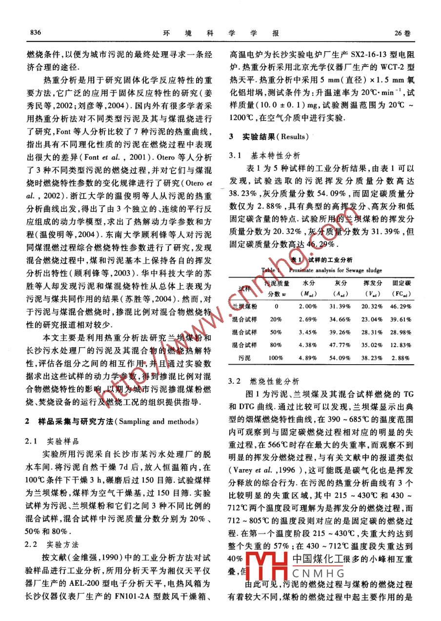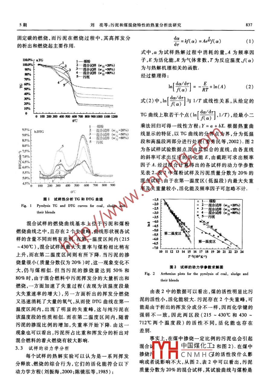 第26卷第5期環(huán)境科學(xué)學(xué)報Vol 26. No 52006年5月Acta Scientiae CircumstantiaeMay,2006劉亮,李錄平,周孑民,等,2006,污泥和煤混燒特性的熱重分析法研究[J].環(huán)境科學(xué)學(xué)報,26(5):835-839Liu L, Li L P, Zou J M, et al. 2006. Investigation on the co-combustion characteristics of coal and sewage sludge by thermogravimetric analysis[ J].Actacientiae Circumstantiae, 26(5): 835-839污泥和煤混燒特性的熱重分析法研究劉亮2,李錄平2,周子民1,那曉忠2,閆宏杰1.中南大學(xué)能源科學(xué)與工程學(xué)院,長沙4100782,長沙理工大學(xué)能源與動力工程學(xué)院,長沙410076收稿日期:2005-11-22修回日期:2006-04-24錄用日期:2006-0424摘要:為了解城市污泥和煤粉混燒的燃燒規(guī)律,利用熱重分析法對蘭壩煤粉和某城市污泥及兩試樣混合物的燃燒特性進行了研究實驗結(jié)果表明,在加熱速度20℃min1、20-1200℃的溫度范圍內(nèi),污泥的熱重曲線存在2個明顯的失重區(qū)域在混燃過程中,煤和城市污泥基本上保持了各自的揮發(fā)分析出特性,混合試樣的燃燒曲線處于污泥和煤粉燃燒曲線之間對實驗數(shù)據(jù)進行分析處理,得到了反應(yīng)動力學(xué)參數(shù)活化能E和頻率因子A.在摻混比例較小時(污泥質(zhì)量分數(shù)為20%)對煤的活性幾乎沒有什么影響;而摻混比例較大時(污泥質(zhì)量分數(shù)為50%80%),存在2個反應(yīng)區(qū)間,在第一溫度段(大約<430℃)混合試樣的反應(yīng)特性類似于污泥,而在高溫區(qū)段(6>430℃)混合試樣的燃燒特性則類似于煤關(guān)鍵詞:燃燒;煤泥混合物;熱重分析法;實驗研究文章編號:0253-2468(2006)05-083505中圖分類號:X703文獻標(biāo)識碼:AInvestigation on the co-combustion characteristics of coal and sewage sludge bythermogravimetric analysisLIU Liang,, LI Luping, ZoU Jiemin, YAN Xiaozhong, YAN HongjieSchool of Energy Science and Engineering, Central South University, Changsha 410078School of Energy and Power Engineering, Changsha University of Science Technology, Changsha 410076Received 22 November 2005;received in revised form 24 April 2006accepted 24 April 2006Abstract: An experimental investigation on the combustion characteristics of the blends of Lanba's coal and Changsha's sewage sludge is conducted byith a ramp of 20Cmin-Iwithin the temperature range 20 -1200C. The investigation reveals that there are obviously twotemperature zones where sludge weight loses promptly. Although the sludge- coal blends exhibit a transitional behavior from that by sludge to that by coethe sewage sludge and coal have basically maintained their own devolatilisation characteristics respectively during the pyrolysis. The reactive kineticsparameters E and A were obtained through the experimental data processing. The experimental results show that, the reactivity of the blend with 20 wtof the sludge, is similar to that of the parent coal. However, there are two temperature zones with obviously different reactivity for the blendswt% and 80 wt. of the sludge respectively. In the lower temperature zone( less than 430C), the reactivity of the blend is similar to that of the sludgeand, in the higher temperature zone( greater than 430C), the reactivity of the blend is close to that of the parent coalKeywords: combustion; sewage sludge-coal blends; thermogravimetry: experimental investigation1前言( Introduction)值,是一種有效的污泥處理方法,然而,這種處理方法也存在可能加大NO,和痕量元素排放等缺點污泥的焚燒處理技術(shù)包括污泥焚燒或與煤混( Werther et al.,1999; Spliethoff et al.,198).燒,可使污泥減容、穩(wěn)定化和無害化( Calvo et al由于污泥的揮發(fā)分、灰分及固定碳等技術(shù)特性2004;王紅等,1999; Werther et al.,1999;指標(biāo)跟煤不同,燃燒過程就會明顯有別于煤粉.因Nadziakiewicz et al.,2003),并能回收污泥中的熱此需要分析污泥及其與煤混燒的特性,掌握污泥的基金項目:湖南省自然科學(xué)基金資助項目(No.03JY5028)中國煤化工Supported by the Hunan Provincial Natural Science Foundation of China(No, 03JJY作者藺介:劉亮(1967-),男,副教授,Emal: luliang@ crust. edu,cm;*通訊什CNMHGBiography:LIULiang(1967--),male,associateprofessor,E-mail:liuliang@csust.edu.cn;Correspondingauthor環(huán)境科學(xué)學(xué)報燃燒條件,以便為城市污泥的最終處理尋求一條經(jīng)高溫電爐為長沙實驗電爐廠生產(chǎn)SX2-16-13型電阻濟合理的途徑爐.熱重分析采用北京光學(xué)儀器廠生產(chǎn)的WCT2型熱重分析是用于研究固體化學(xué)反應(yīng)特性的重?zé)崽炱?熱重分析中采用5mm(直徑)x1.5mm氧要方法,它廣泛的應(yīng)用于固體反應(yīng)特性的研究(姜化鋁坩堝測試條件為:升溫速率為20℃min1,秀民等,2002;劉彥等,2004).國內(nèi)外有很多學(xué)者采樣質(zhì)量(10.0±0.1)mg,試驗測溫范圍為20℃用熱重分析法對不同類型污泥及其與煤混燒進行1200℃,在空氣介質(zhì)中進行實驗了研究,Font等人分析比較了7種污泥的熱重曲線,熱重曲線,3實驗結(jié)果( Results)指出具有不同理化性質(zhì)的污泥在燃燒過程中表現(xiàn)出很大的差異( Font et al.,2001).Oeo等人分析3.1基本特性分析了3種不同類型污泥的燃燒過程,并對它們與煤混表1為5種試樣的工業(yè)分析結(jié)果,由表1可以燒時燃燒特性參數(shù)的變化規(guī)律進行了研究( Otero et發(fā)現(xiàn),試驗選取的污泥揮發(fā)分質(zhì)量分數(shù)高達al.,2002).浙江大學(xué)的溫俊明等人從污泥的熱重3823%,灰分質(zhì)量分數(shù)54.09%,而固定碳質(zhì)量分分析曲線出發(fā),得出了由3個獨立的連續(xù)的平行反數(shù)僅為288%,具有典