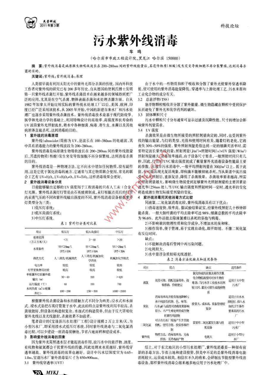 科技論壇污水紫外線消毒(哈爾濱市市政工程設(shè)計院,黑龍江哈爾濱150000摘要:紫外線消毒是病原微生物吸收波長在20-280mm間的紫外線能量后,其遺傳物質(zhì)(核酸)發(fā)生突變導(dǎo)致細胞不再分裂繁殖,達到消轟殺菌的目的。關(guān)鍵詞:紫外線;紫外線消毒;原理人類很早就有利用太陽光中的紫外光部分殺菌的傳統(tǒng)。國內(nèi)外科技由于水中的一些物質(zhì)和粒子吸收和分散了紫外光使紫外穿透率降工作者對紫外線的研究已有200多年歷史,自從德國的賀利氏博十發(fā)明低,使可使用的紫外消毒能量降低。穿透率與上游處理工藝污水來源和第一只紫外線殺菌燈開始紫外線殺菌技術(shù)在越來越多的領(lǐng)域得到更廣工業(yè)化合物的成分有關(guān)。泛的應(yīng)用,尤其是在空氣殺菌物體表面殺菌和水處理殺菌方面。自從32總懸浮物(TSs)1982年加拿大開始應(yīng)用實際的紫外線水處理工廠以后,美國、歐洲、印懸浮物顆粒吸收并分散了紫外能量。微生物隱藏在顆粒中受到保護度已經(jīng)廣泛采用該技術(shù),從2005年開始,中國的新建自來水廠和污水處從而避免了紫外光和化學(xué)藥劑的破壞理廠也逐步采用紫外線殺菌技術(shù)。紫外線消毒技術(shù)是基于現(xiàn)代防疫學(xué)、33固體顆粒尺寸醫(yī)學(xué)和光動力學(xué)的基礎(chǔ)上,利用特殊設(shè)計的高效率、高強度和長壽命的污水中顆粒尺寸分布通??娠@示過濾及沉降性能。尺寸的增加會影UV波段紫外光照射流水,將水中各種細菌病毒、寄生蟲,水藻以及其他響紫外劑量需求病原體直接殺死,達到消毒的目的34UV強度1紫外線的消毒原理殺菌效果是由微生物所接受的照射劑量決定的,同時,也受到紫外紫外線( ultraviolet)簡稱為UV,是波長在100-380m的電磁波,其線的輸出能量,與燈的類型,光強和使用時間有關(guān),隨著燈的老化,它將中具有消毒能力的紫外線波段為200-280m喪失309%-50%的強度。紫外照射劑量是指達到一定的細菌滅活率時需紫外線消毒是病原微生物吸收波長在200-280m間的紫外線能量要特定波長紫外線的量:照射劑量(Jm2)=照射時間(s)×UV強度(wW/m2)后,其遺傳物質(zhì)(核酸)發(fā)生突變導(dǎo)致細胞不再分裂繁殖,達到消毒殺菌照射劑量越大,消毒效率越高,由于設(shè)備尺寸要求,一般照射時間只有幾的目秒因此,燈管的UvC輸出強度就成了衡量紫外光消毒設(shè)備性能最主要紫外線消毒是一種物理方法,它不向水中增加任何物質(zhì)沒有副作的參數(shù)。在城市污水消毒中,一般平均照射劑量在300J/m2以上。低于此用,這是它優(yōu)于氯化消毒的地方,它通常與其它物質(zhì)聯(lián)合使用,常見的聯(lián)值,有可能出現(xiàn)光復(fù)活現(xiàn)象,即病菌不能被徹底殺死,當從渠道中流出接合工藝有UV+HO2UV+HO2+O3、UV+TO2,這樣消毒效果會更好受可見光照射后,重新復(fù)活,降低了殺菌效果。殺菌效率要求越高,所需2紫外線消毒設(shè)備分類的照射劑量越大。影響微生物接受到足夠紫外光照射劑量的主要因素是日前能夠輸出足夠的UV強度用于工程消毒的只有人工汞(合金)透光率(254mm處),當UVC輸出強度和照射時間一定時,透光率的變化汞蒸氣壓的不同和紫外線輸出強度的不同,紫外線消毒設(shè)備根據(jù)紫外4紫外線消毒同其他消毒方式比較燈類型分為三類:同液氯、二氧化氯消毒比較,紫外線消毒具有以下優(yōu)點1)低壓燈系統(tǒng)1)消毒速度快,效率高。據(jù)試驗結(jié)果證實,經(jīng)紫外線照射幾十秒鐘即2)低壓高強燈系統(tǒng);能殺菌。一般大腸桿菌的平均去除率可達98%細菌總數(shù)的平均去除率3)中壓燈系統(tǒng)為966%。此外還能去除液氯難以殺死的芽孢與病毒。表1紫外燈分類對比表2)不影響誰的物理性質(zhì)和化學(xué)成分,不增加水的臭和味。3)操作簡單,便于管理,易于實現(xiàn)自動化,即開即用。不像二氧化氯低壓燈低壓高強燈有反應(yīng)時間(萬立方米/天)水質(zhì)條件ss≤20g/LS≤20/L1)不能解決消毒后管網(wǎng)中再污染問題UT=50UT≥502)電耗較大。3)水中懸浮雜質(zhì)妨礙光線透射。清洗方式人清沆機械清冼人清洗徹機械加化機械加化學(xué)清洗表2消毒方法優(yōu)缺點和適用條件缺點燈管更換費用比較適用條件單根紫外燈的紫外能氯化形的余氯及某些含氯輸出(g)30-40效果可靠攬設(shè)備簡單,投化合物低濃度時對水牛物有適用于大中型運行盜度(℃毒客;當虧水含工業(yè)廢水比例較大時,氯化可能斗成致密物污水廠水利負荷(m/d根紫00-2001000-2000消效率高并能有效地降解虧適用于出水水根據(jù)紫外線殺菌設(shè)備和水的接觸方式不同分為兩類:浸水式和水面式。浸水式是把石英燈管置于水中,此法的特點是紫外線利用率較高,殺兔氧水由與溫度對效彩投資大成本高設(shè)備管明線質(zhì)好排入水的衛(wèi)生條件菌效能好,但設(shè)備的構(gòu)造較復(fù)雜。水面式的構(gòu)造簡單,但由于反光罩吸收很小,不產(chǎn)生難處理的或生物要求高的污水紫外光線以及光線散射,殺菌效果不如前者積素性殘出物筆者設(shè)計的《寶清縣污水處理廠工程》設(shè)計規(guī)模2萬立方米/,為以在現(xiàn)場產(chǎn)生并小型污水廠,即采用浸水式低壓燈系統(tǒng)同時紫外線消毒與二氧化氯消氧化氯物已使用方,投客易需劃有二氧化氯發(fā)生器與投適陽于中小甲配設(shè)備毒比較,可以少建