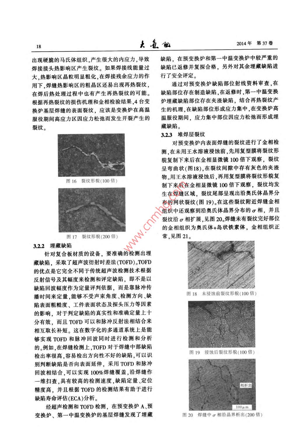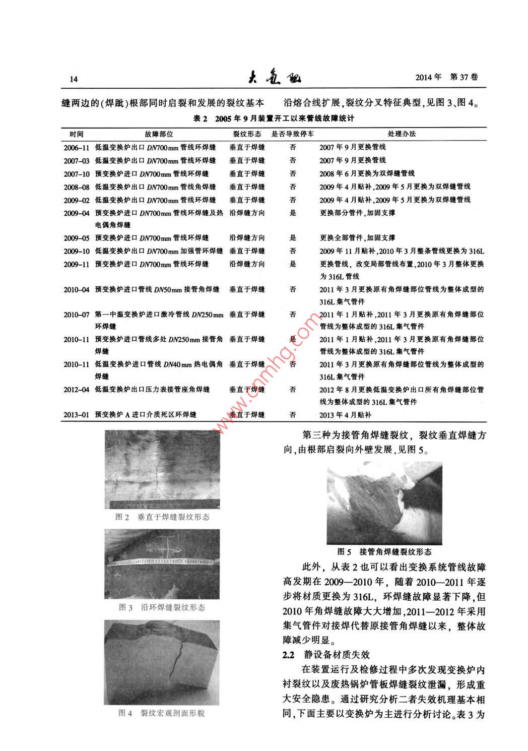 2014年2月Feb.2014第37卷第1期Large Scale Nitrogenous Fertilizer IndustryVol 37 No. 1水煤漿變換系統(tǒng)材料失效情況總結(jié)及應(yīng)對措施李敏(中國石化金陵分公司,江蘇南京210033)摘要:水煤漿變換系統(tǒng)不銹鋼管線及設(shè)備多次發(fā)生材質(zhì)失效,對此開展全面失效分析,并通過材質(zhì)升級、風(fēng)險分析及安全評定聲發(fā)射在線監(jiān)測等手段保證裝置安穩(wěn)長運行。關(guān)鍵詞:水煤漿變換系統(tǒng)奧氏體不銹鋼應(yīng)力腐蝕1概述中溫換熱器中國石化金陵分公司(簡稱金陵石化)煤化工裝置采用CE水煤漿加壓氣化技術(shù),其中變換系統(tǒng)第一區(qū)第二區(qū)中溫變采用一氧化碳耐硫變換工藝,由2臺并聯(lián)的預(yù)變變換爐區(qū)人變換熾?yún)^(qū)換爐串聯(lián)2臺中溫變換爐和1臺低溫變換爐組甲烷化換熱器廢熱鍋爐成,變換爐間有廢熱鍋爐取熱調(diào)溫,經(jīng)水分離器后變換氣廢熱鍋爐廢熱鍋爐送至NHD脫硫脫碳工段。變換系統(tǒng)流程見圖1。圖1凈化裝置變換系統(tǒng)流程表1工藝氣干基主要成分及狀態(tài)溫度/壓力/工藝氣(干基)主要成分,%項目℃MPaHSH,預(yù)變換爐前介質(zhì)第一中溫變換爐進口至第二中溫變換爐出口28042034-3.81(出口)/40(進口)0141(出口)22(進口)0.355(出口)/365(進口)低溫變換爐后介質(zhì)2600.30.3由于變換系統(tǒng)設(shè)備及管線長期在臨氫含硫、特點是溫度較低且屬于含有HSCH、CO2、H2的濕高溫高壓介質(zhì)下運行(主要介質(zhì)成分見表1),存在態(tài)介質(zhì),管線材質(zhì)均為d720mm×18mm單焊縫不氫腐蝕、回火脆化、蠕變、連多硫酸應(yīng)力腐蝕等損銹鋼管,SUS321材質(zhì)Crl8NlT),其余管徑管傷機理。從2005年9月裝置投產(chǎn)以來,變換系統(tǒng)線極少發(fā)生焊縫開裂表2為2005年9月裝置開不銹鋼管線及設(shè)備多次發(fā)生腐蝕失效故障,對裝工以來管線故障統(tǒng)計。從表2可以看出,管線裂紋置安穩(wěn)長生產(chǎn)造成了重大威脅。目前國內(nèi)外煤化主要存在3種形態(tài),一種為裂紋在垂直焊縫方向工領(lǐng)域在此環(huán)節(jié)的材料選型并未形成指導(dǎo)性標(biāo)準幾乎等距排列,裂紋長度約130-140mm,起源于焊規(guī)范,對失效原因、監(jiān)控措施以及材質(zhì)選型,通過縫內(nèi)表面,穿過焊縫并于熱影響區(qū)發(fā)生分叉,具有和科研單位、高校合作在實踐中摸索安全穩(wěn)定運較典型應(yīng)力腐蝕裂紋形態(tài),見圖2。另一種為沿環(huán)行的方法。焊縫方向開裂,裂紋是單支的,長度較長,由管內(nèi)壁焊縫根部啟裂,向外壁發(fā)展。由變徑管內(nèi)壁環(huán)焊2材質(zhì)失效情況說明21管線焊縫失效收稿日期:2013-08-14;收到修改稿日期:2013-12-26。變換系統(tǒng)不銹鋼管線失效部位集中在預(yù)變換作者簡介:李敏,男,1980年2月出生,工程師,本科學(xué)歷,畢業(yè)于南京工業(yè)大學(xué)材料學(xué)院腐蝕與防護專業(yè),現(xiàn)任中國石化金陵爐進口以及低溫變換爐出口2條DN00m管線分公司煤化工運行部設(shè)備管理科副科長。聯(lián)系電話:025-的環(huán)焊縫以及接管角焊縫上,其失效部位的共同58972025;E-maillim.jlsh@sinopec.com14瓦留2014年第37卷縫兩邊的(焊趾)根部同時啟裂和發(fā)展的裂紋基本沿熔合線擴展,裂紋分叉特征典型,見圖3、圖4。表22005年9月裝置開工以來管線故障統(tǒng)計時間故障部位裂紋形態(tài)是否導(dǎo)致停車處理辦法2006-11低溫變換爐出口DM00mm管線環(huán)焊縫垂直于焊縫2007年9月更換管線2007-03低溫變換爐出口DN700mm管線環(huán)焊縫垂直于焊縫2007年9月更換管線2007-10預(yù)變換爐進口DN700mm管線環(huán)焊縫垂直于焊縫2008年6月更換為雙焊縫管線200808低溫變換爐出口DN700mm管線角焊縫垂直于焊縫200902低溫變換爐出口DN700mm管線環(huán)焊縫垂直于焊縫否否否否否是2009年4月貼補,2009年5月更換為雙焊縫管線2009年4月貼補,2009年5月更換為雙焊縫管線2009-04預(yù)變換爐進口DN700mm管線環(huán)焊縫及熱沿焊縫方向更換部分管件,加固支撐電偶角焊縫200905預(yù)變換爐進口DM00mm管線環(huán)焊縫沿焊縫方向是更換全部管件,加固支撐2009-10低溫變換爐出口D№00mm加強管環(huán)焊縫垂直于焊縫否009年1l月貼補,2010年3月整條管線更換為316L2009-11預(yù)變換爐進口DN700mm管線環(huán)焊縫沿焊縫方向是更換管線,改變局部管線布置,2010年3月整體更換為316L管線201004預(yù)變換爐進口管線DN50mm接管角焊縫垂直于焊縫2011年3月更換原有角焊縫部位管線為整體成型的316L集氣管件201007第一中溫變換爐進口激冷管線DN250mm垂直于焊縫否01年1月貼補,2011年3月更換原有角焊縫部位環(huán)焊縫管線為整體成型的316L集氣管件2010-11預(yù)變換爐進口管線多處DN250mm接管角垂直于焊縫是011年1月貼補,2011年3月更換原有角焊縫部位焊縫管線為整體成型的316L集氣管件2010-11低溫變換爐進口管線DN40mm熱電偶角垂直于焊縫否2011年3月更換原有角焊縫部位管線為整體成型的焊縫316L集氣管件2012-04低溫變換爐出口壓力表接管座角焊縫垂直于焊縫2012年8月更換低溫變換爐出口所有角焊縫部位管線為整體成型的316L集氣管件013-01預(yù)變換爐A進口介質(zhì)死區(qū)環(huán)焊縫垂直于焊縫013年4月貼補第三種為接管角焊縫裂紋,裂紋垂直焊縫方向,由根部啟裂向外壁發(fā)展,見圖5。圖2垂直于焊縫裂紋形態(tài)圖5接管角焊縫裂紋形