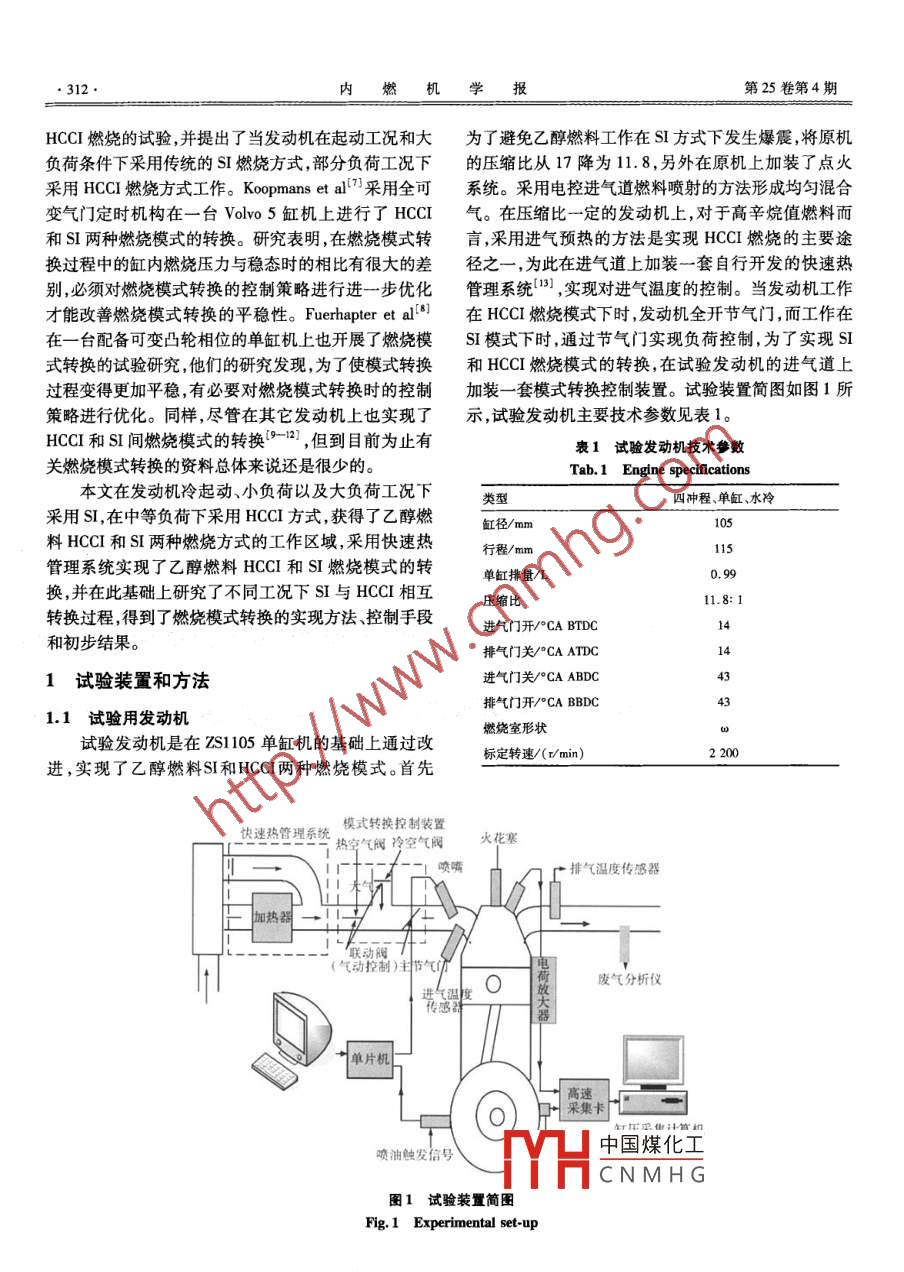 第25卷(2007)第4期內(nèi)燃機(jī)學(xué)報(bào)Transactions of CSICEVol.25(2007)No.4文章編號:1000-0909(2007)04-0311-0525050乙醇燃料SI-HCCI-SI燃燒模式轉(zhuǎn)換過程的研究郭英男,彭亞平,譚滿志,黃為鈞,劉發(fā)發(fā),李華(吉林大學(xué)內(nèi)燃機(jī)系,吉林長春130022)摘要:在一臺單缸試驗(yàn)機(jī)上進(jìn)行了乙醇燃料均質(zhì)壓燃(HCI)和火花點(diǎn)燃(SI)兩種燃燒模式相互轉(zhuǎn)換的試驗(yàn)研究。結(jié)果表明,采用進(jìn)氣熱管理系統(tǒng),可以實(shí)現(xiàn)乙醇燃料在兩種燃燒方式間的轉(zhuǎn)換。在S向HCCI轉(zhuǎn)換過程中,由于混合氣瞬間變稀,而高溫?zé)釟膺M(jìn)到缸內(nèi)有一定的時(shí)間,轉(zhuǎn)速和平均有效壓力下降,經(jīng)過約4個(gè)工作循環(huán)后,隨著高溫?zé)釟膺B續(xù)、均勻地進(jìn)到缸內(nèi),實(shí)現(xiàn)了連續(xù)穩(wěn)定的HCCI燃燒,因此轉(zhuǎn)速和平均有效壓力上升,并且很快達(dá)到穩(wěn)定。在HCC向SI轉(zhuǎn)換過程中,由于存在火花點(diǎn)火,對混合氣的溫度不是很敏感,因此過渡時(shí)間減少,發(fā)動(dòng)機(jī)很快達(dá)到穩(wěn)定狀態(tài)。關(guān)鍵詞:乙醇;均質(zhì)壓燃;燃燒模式轉(zhuǎn)換;快速熱管理系統(tǒng)中圖分類號:TK401文獻(xiàn)標(biāo)志碼:AStudy on the Transition Mode of Ethanol SI-HCCI-SI Combustion ModeTransitionGUO Ying-nan, PENG Ya-ping TAN Man-zhi, HUANG Wei-jun, LIU Fa-fa, LI HuaDepartment of Intermal Combustion Engine, Jilin University, Changchun 130022, China)Abstract: Mode transition of ethanol combustion between homogeneous charge compression ignition(HCCI)and spark ignition( SI)was investigated in a single cylinder diesel engine. Experimental resultsshowed that combustion mode transition could be realized with the Fast-Thermo Management system, Dur-ng the transition process form SI to HCCI, the mixture becomes the leaner and a time is needed for thehomogeneous charge of high temperature entering into the cylinder, leading to decrease in engine speedand mean effective pressure. After 4 cycles, with the entering of high temperature intake charge into thecylinder, the HCCI combustion is realized and increases the engine speed and the mean effective pressureand engine is operated stably. During the transition process form HCCI to SI, with aid of spark ignitionthe transition period decreases and engine quickly gets its stable operationKeywords: Ethanol; HCCI; Combustion mode transition; Fast-thermo management system引言化學(xué)反應(yīng)動(dòng)力學(xué)的影響,過濃和過稀的混合氣將分別導(dǎo)致爆震燃燒和失火,因此發(fā)動(dòng)機(jī)工作在HCCI發(fā)動(dòng)機(jī)采用均質(zhì)壓燃(HCCI)方式工作時(shí),均質(zhì)混模式下的運(yùn)行范圍較窄。在發(fā)動(dòng)機(jī)冷起動(dòng)、怠速工況合氣在壓縮行程末期實(shí)現(xiàn)壓燃,混合氣在缸內(nèi)幾乎是時(shí),難以形成HCI穩(wěn)定燃燒所需要的條件;在大負(fù)荷同時(shí)著火,不存在火焰?zhèn)鞑?。由于采用的是均勻的稀工況時(shí),由于混合氣變濃,燃燒反應(yīng)速度加快,出現(xiàn)爆混合氣,缸內(nèi)燃燒溫度低,NO,和碳煙的排放極低,因震燃燒,因此難以在全工況范圍內(nèi)采用HCCI方式工此被認(rèn)為是一種能同時(shí)滿足降低油耗和排放的新型燃作,在實(shí)際應(yīng)用中采用HCCI和傳統(tǒng)的S或壓燃(CI燒方式。燃燒方式結(jié)合的方法是解決HCCI工作范圍窄的方案從上世紀(jì)70年代首次提出HCCl的概念-2),到之目前為止全球范圍內(nèi)已經(jīng)開展了廣泛的試驗(yàn)和模擬研究。研究表明,HCCI的著火與燃燒主要是受混合氣的ThYHE中國煤化工燒模式轉(zhuǎn)換的是CNMHG動(dòng)機(jī)上進(jìn)行了關(guān)于收稿日期200612-17;修回日期:20003.19。01CB2020)基金項(xiàng)目:國家重點(diǎn)基礎(chǔ)研究發(fā)展規(guī)劃資助項(xiàng)目作者簡介:郭英男,教授,E-mail; guoyu@ju.edu312內(nèi)燃機(jī)學(xué)報(bào)第25卷第4期HCCI燃燒的試驗(yàn),并提出了當(dāng)發(fā)動(dòng)機(jī)在起動(dòng)工況和大為了避免乙醇燃料工作在S方式下發(fā)生爆震,將原機(jī)負(fù)荷條件下采用傳統(tǒng)的SI燃燒方式部分負(fù)荷工況下的壓縮比從17降為11.8,另外在原機(jī)上加裝了點(diǎn)火采用HCCI燃燒方式工作。 Koopmans et al”采用全可系統(tǒng)。采用電控進(jìn)氣道燃料噴射的方法形成均勻混合變氣門定時(shí)機(jī)構(gòu)在一臺 Volvo5缸機(jī)上進(jìn)行了HCI氣。在壓縮比一定的發(fā)動(dòng)機(jī)上,對于高辛烷值燃料而和SI兩種燃燒模式的轉(zhuǎn)換。研究表明,在燃燒模式轉(zhuǎn)言,采用進(jìn)氣預(yù)熱的方法是實(shí)現(xiàn)HCCI燃燒的主要途換過程中的缸內(nèi)燃燒壓力與穩(wěn)態(tài)時(shí)的相比有很大的差徑之一,為此在進(jìn)氣道上加裝一套自行開發(fā)的快速熱別,必須對燃燒模式轉(zhuǎn)換的控制策略進(jìn)行進(jìn)一步優(yōu)化管理系統(tǒng),實(shí)現(xiàn)對進(jìn)氣溫度的控制。當(dāng)發(fā)動(dòng)機(jī)工作才能改善燃燒模式轉(zhuǎn)換的平穩(wěn)性。 Fuerhapter et al在HCCI燃燒模式下時(shí)發(fā)動(dòng)機(jī)全開節(jié)氣門,而工作在在一臺配備可變凸輪相位的單缸機(jī)上也開展了燃燒模SI模式下時(shí),通過節(jié)氣門實(shí)現(xiàn)負(fù)荷控制,為了實(shí)現(xiàn)SI式轉(zhuǎn)換的試驗(yàn)研究,他們的研究發(fā)現(xiàn),為了使模式轉(zhuǎn)換和HCCI燃燒模式的轉(zhuǎn)換,在試驗(yàn)發(f