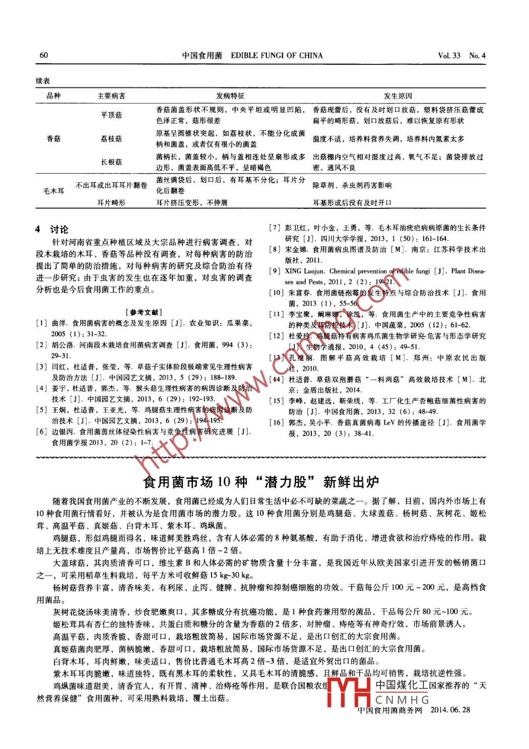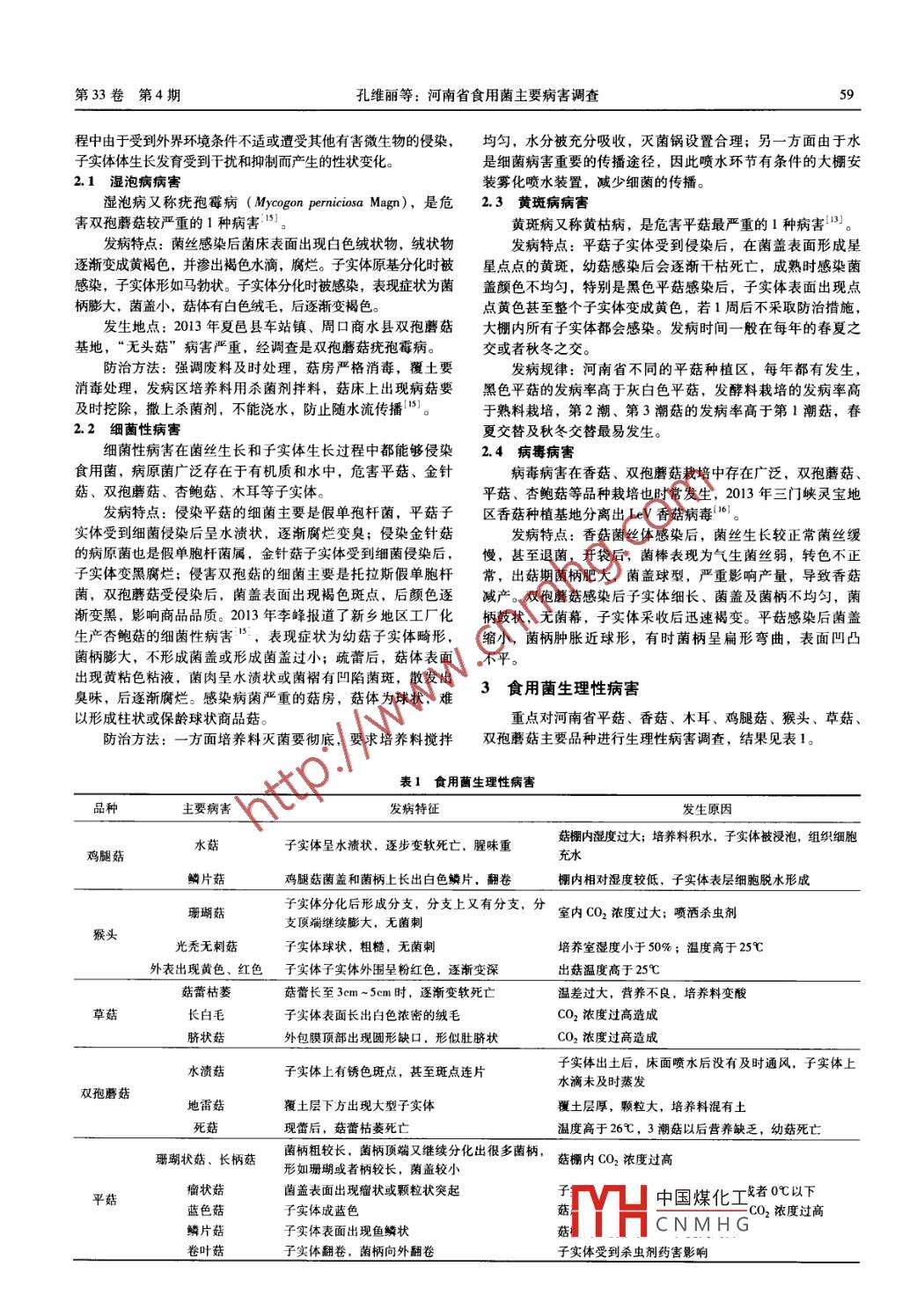 中國(guó)食用菌2014, 33 (4); 57~60CN53-1054/Q ISSN 1003- -8310EDIBLE FUNGI OF CHINA〈病蟲(chóng)害防治>河南省食用菌主要病害調(diào)查*孔維麗,康源春",張玉亭,袁瑞奇,孔維威,韓玉娥,祝秀花.(河南省農(nóng)業(yè)科學(xué)院植物營(yíng)養(yǎng)與資源環(huán)境研究所,河南鄭州450002)摘要:河南省食用菌規(guī)模化種植基地發(fā)展迅速,但病害的發(fā)生影響了食用菌產(chǎn)業(yè)的健康發(fā)展。重點(diǎn)對(duì)雙孢蘑菇、香菇、平菇、雞腿菇、草菇、猴頭、毛木耳等大宗品種的菌絲體病害、子實(shí)體病害進(jìn)行調(diào)查,并提出綜合防控指建議。關(guān)鍵詞:河南省;食用菌;病害調(diào)查中圖分類號(hào): S646.9 文獻(xiàn)標(biāo)志碼: A文章編號(hào): 1003-8310 (2014) 04- 0057-04Main Diseases Investigation of Edible M lushroom in Henan ProvinceKONG Wei-li ,KANG Yuan-chun ,ZHANG Yu-ting, YUAN Rui-qi, KONG Wei-wei ,Han Yu-e ,ZHU Xiu-hua( Institute of Plant Nutrition, Agricultural Resources and Environmental Science ,Henan Academy of Agricultural Sciences ,Zhengzhou Henan 450002)Abstract: In recent years, the production bases of edible mushrooms developed rapidly in Henan province, while various diseases had af-fected sustainable and sound development of edible mushroom industry. The paper focused on mycelia diseases and fruiting body diseases ofedible mushrooms, such as Agaricus bisporus ,Lentinula edodes , Pleurotus ostreatus ,Coprinus comatus,Volvariella volvacea , Hericium eri-naceus, Auricularia polytricha et al. At last, the suggestions of integrated control of edible mushroom diseases were put forward.Key words: Henan province; Edible mushroom; Disease investigation河南省位于中國(guó)中東部,屬暖溫帶一亞熱帶,全省年2013年閆紅等|)]對(duì)三門(mén)峽地區(qū)草菇子實(shí)體常見(jiàn)生理性病害進(jìn)平均氣溫在12C~ 16C,山地丘陵占全省總面積的44. 3%,行調(diào)查,姜宇等('!對(duì)三門(mén)峽地區(qū)猴頭生理性病害進(jìn)行分析,平原和盆地占55.7%。復(fù)雜多樣的土地類型及氣候條件為王炯等s對(duì)雞腿菇生理性病害的發(fā)生原因進(jìn)行總結(jié)。2013 年食用菌發(fā)展提供了有利的條件。2003 年河南省食用菌產(chǎn)量河南省食用菌產(chǎn)業(yè)技術(shù)體系重點(diǎn)對(duì)雙孢蘑菇、香菇、平菇、達(dá)1.696x10°t,產(chǎn)值達(dá)5.96x10° 元,雙雙躍居全國(guó)第一,雞腿菇、草菇、猴頭、毛木耳等大宗品種病害進(jìn)行調(diào)查,總截止2012年河南省食用菌總產(chǎn)量達(dá)到4.50x10°l,產(chǎn)值結(jié)了近期發(fā)生的主要菌絲體病害和子實(shí)體病害,為今后食用1. 90x10"元,形成了- "批全國(guó)重要的食用菌種植基地,如菌病害的防治工作提供基礎(chǔ)材料。以西峽、盧氏、靈寶為代表的香菇基地;輝縣等為代表的1菌絲體病害平菇基地;夏邑縣、西平縣為代表的雙孢蘑菇基地;魯山.縣、周口西華縣為代表毛木耳基地。但是,隨著基地的連菌絲體病害是指菌株生長(zhǎng)過(guò)程中,菌絲受到環(huán)境條件不續(xù)種植,食用菌病害存在連年發(fā)生并有加重的趨勢(shì)。食用適或遭受其他有害微生物的侵染,菌絲體生長(zhǎng)發(fā)育受到干擾菌病害是指食用菌在生長(zhǎng)過(guò)程中,由于環(huán)境條件不適或遭和抑制。經(jīng)調(diào)查河南省重點(diǎn)種植區(qū)代表性的病害主要有疣疤受其他有害微生物的侵染,使其菌絲體或子實(shí)體正常的生病病害、黏菌病害、鏈孢霉病害、綠霉病害、爪菌病害、鬼長(zhǎng)發(fā)育受到干擾和抑制,導(dǎo)致生長(zhǎng)發(fā)育緩慢、畸形、枯菱傘病害等。甚至死亡等生理、組織及形態(tài)上的異?,F(xiàn)象,從而降低產(chǎn)1.1 疣疤病病害量和品質(zhì)"疣疤病是由木棲柱孢霉引起的1種菌絲體病害,主要危1993年胡公洛等12)對(duì)河南省三門(mén)峽盧氏縣,洛陽(yáng)地區(qū)的害毛木耳品種[1。新安縣、欒川縣,南陽(yáng)地區(qū)的淅川、桐柏等地區(qū)段木栽培食發(fā)病特點(diǎn):在毛木耳菌種袋或者栽培袋中,已經(jīng)長(zhǎng)滿菌用菌進(jìn)行調(diào)查,發(fā)現(xiàn)河南省段木上病原菌共有31個(gè)屬44種。絲體的部位感染病菌后, 初現(xiàn)深褐色圓形病斑,之后病斑迅*項(xiàng)目來(lái)源:河南省現(xiàn)代農(nóng)業(yè)產(chǎn)業(yè)技術(shù)體系(S2010 -03 - C04);現(xiàn)代農(nóng)業(yè)產(chǎn)業(yè)技術(shù)體系建中國(guó)煤化工作者簡(jiǎn)介:孔維麗(1976-), 女,助理研究員,從事食用菌栽培方面研究。E-mail: kongwei**通信作者:康源春,研究員,從事食用菌栽培方面研究。TYHCNMHG收稿日期: 2014-05-29第33卷第4期孔維麗等:河南省食用菌主要病害調(diào)查59程中由于受到外界環(huán)境條件不適或遭受其他有害微生物的侵染,均勻,水分被充分吸收,滅菌鍋設(shè)置合理;另一方面由于水子實(shí)體體生長(zhǎng)發(fā)育受到干擾和抑制而產(chǎn)生的性狀變化。是細(xì)菌病害重要的傳播途徑,因此噴水環(huán)節(jié)有條件的大棚安2.1濕泡病病害裝霧化噴水裝置,減少細(xì)菌的傳播。濕泡病又稱疣孢霉病( Mycogon perniciosa Magn),是危2.3黃斑病病害害雙孢蘑菇較嚴(yán)重的1種病害:1。黃斑病又稱黃枯病,是危害平菇最嚴(yán)重的1種病害3。發(fā)病特點(diǎn):菌絲感染后菌床表面出現(xiàn)白色絨狀物,絨狀物發(fā)病特點(diǎn):平菇子實(shí)體受到侵染后,在菌蓋表面形成星逐漸變成黃褐色,并滲出褐色水滴,腐爛。