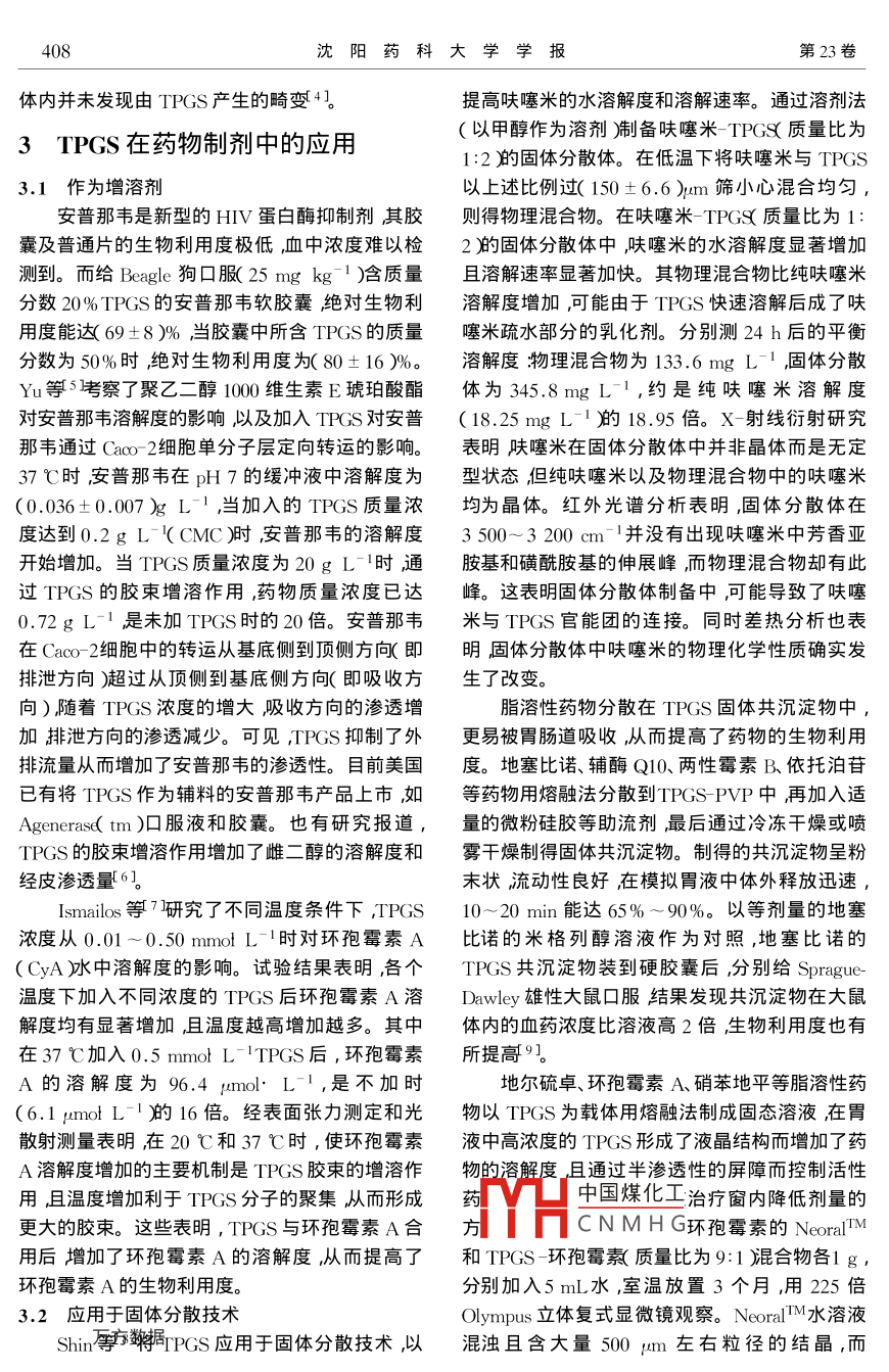 第23卷第6期沈陽(yáng)藥科大學(xué)學(xué)報(bào)Vol.23No.62006年6月Journal of Shenyang Pharmaceutical UniversityJun. 2006 p.407文章編號(hào): 1006 2858( 2006 )06 -0407- 06聚乙二醇1000維生素E琥珀酸酯應(yīng)用進(jìn)展于永新1,俞紅凱2,王中彥?( 1.中國(guó)醫(yī)科大學(xué)附屬第四醫(yī)院遼寧沈陽(yáng)110032 ; 2.沈陽(yáng)藥科大學(xué)藥學(xué)院遼寧沈陽(yáng)110016 )摘要:目的對(duì)聚乙二醇1000維生素E琥珀酸酯TPGS )的理化性質(zhì)、在藥物制劑與臨床治療中的應(yīng)用進(jìn)行綜述。方法依據(jù)近期國(guó)外公開(kāi)發(fā)表的文獻(xiàn)與專利對(duì)TPGS的研究應(yīng)用及理化性質(zhì)與安全性進(jìn)行分類、歸納和整理。結(jié)果TPGS在制劑研究中可作為增溶劑、吸收促進(jìn)劑、乳化劑、增塑劑以及脂溶性藥物傳遞系統(tǒng)的載體在臨床上可治療維生素E缺乏癥改善維生素E缺乏患者體內(nèi)維生素E水平。結(jié)論TPGS作為一種安全有效的藥用輔料與維生素E補(bǔ)充劑在藥學(xué)領(lǐng)域應(yīng)用前景廣闊將會(huì)得到廣泛應(yīng)用。關(guān)鍵詞:聚乙二醇1000 維生素E琥珀酸酯;藥用輔料;維生素E中圖分類號(hào):R 94文獻(xiàn)標(biāo)識(shí)碼:A聚乙二醇1000維生素E琥珀酸酯( Da-ooo-子性表面活性劑1。當(dāng)其與難溶性藥物形成膠pherol polyethylene glycol 1000 succinate ,TPGS ,Vita-束或乳劑時(shí)將顯著增加藥物在胃腸中的吸收從min E TPGS ,Tocophersolan )是維生素E的水溶性而提高生物利用度。與其他表面活性劑相比,衍生物,由維生素E琥珀酸酯( VES )的羧基與聚TPGS具有生育酚酯的結(jié)構(gòu),從而有-定的抗氧乙二醇PEG)1000酯化而成相對(duì)分子質(zhì)量約為化性,這有助于增加制劑的穩(wěn)定性2。有報(bào)道,1 513 ,已載入《美國(guó)藥典》。TPGS最早由美國(guó)TPGS對(duì)P糖蛋白有抑制作用轉(zhuǎn)運(yùn)受P-糖蛋白Eastman公司生產(chǎn)并上市,在國(guó)外現(xiàn)已廣泛應(yīng)用阻滯的藥物如阿霉素、紫杉醇、長(zhǎng)春堿、秋水仙堿于制劑研究中作為增溶劑、吸收促進(jìn)劑、乳化劑、等與TPGS合用后都明顯增加了在胃腸道內(nèi)的增塑劑以及水難溶性和脂溶性藥物傳遞系統(tǒng)的載吸收提高了生物利用度3。體如固體分散體、眼部給藥的載體、鼻腔內(nèi)給藥的載體等。2 TPGS的安全性毒理學(xué)研究表明,TPGS 作為維生素E營(yíng)養(yǎng)1 TPGS 的理化性質(zhì)補(bǔ)充劑或作為藥用輔料應(yīng)用時(shí)是很安全的。.TPGS為淡黃色的蠟狀固體近乎無(wú)味能溶Eastman公司的研究人員發(fā)現(xiàn),成年大鼠口服于水,也能溶于乙醇等大多數(shù)極性有機(jī)溶劑。室TPGS.維生素E琥珀酸酯和聚乙二醇1000的溫下在水中溶解度的質(zhì)量分?jǐn)?shù)為20%,若超過(guò)此LDso值均超過(guò)7g kg~'。飼料中TPGS含量質(zhì)量濃度將形成高黏度的液晶相。隨著在水中濃度分?jǐn)?shù)為0.002%、0.2%、2.0%時(shí),喂飼雄性和雌的增加液晶相的結(jié)構(gòu)逐漸變化從各向同性的球性大鼠90d結(jié)果顯示,TPGS對(duì)受試動(dòng)物的體質(zhì)狀膠束到圓筒狀膠束、正反六角形膠束、反球狀膠量、器官質(zhì)量、血液學(xué)、血清化學(xué)、食物消耗量、顯束,最后成薄層片狀液晶態(tài)。TPGS熔點(diǎn)約微形態(tài)學(xué)以及生長(zhǎng)率均無(wú)不良影響。按上述方法39 C,且有較高的降解溫度在200C下穩(wěn)定在喂飼175d后,受試組的生育指數(shù)與對(duì)照組相比空氣中穩(wěn)定,但遇堿不穩(wěn)定。室溫時(shí)臨界膠束濃無(wú)明顯差異并且新生大鼠均正常。對(duì)母子兩代度的質(zhì)量分?jǐn)?shù)約為0.02% ,親水親油平衡值大I中國(guó)煤化工查結(jié)果顯示沒(méi)有因.(HLB)約為13~ 17。 由于TPGS的兩親性質(zhì)及YHCNMH改變。在幼鼠胚胎器官良好的水溶性,對(duì)親脂性物質(zhì)而言是很好的非離組織形成期間對(duì)母鼠喂飼TPGS,生下來(lái)的幼鼠收稿日期2005 07-05作者簡(jiǎn)介:于永新( 1970- ) ,男(漢族)遼寧沈陽(yáng)人主管藥師主要從事醫(yī)院藥學(xué)工作Tel. 024- 62043627 E mailSpugr冉窮數(shù)據(jù)hoo. como .408沈陽(yáng)藥科大學(xué)學(xué)報(bào)第23卷體內(nèi)并未發(fā)現(xiàn)由TPGS產(chǎn)生的畸變4。提高呋噻米的水溶解度和溶解速率。通過(guò)溶劑法(以甲醇作為溶劑)制備呋噻米- TPGS( 質(zhì)量比為3 TPGS在藥物制劑中的應(yīng)用1:2的固體分散體。在低溫下將呋噻米與TPGS3.1作為增溶劑以上述比例過(guò)( 150土6.6 );xm篩小心混合均勻,安普那韋是新型的HIV蛋白酶抑制劑其膠則得物理混合物。在呋噻米TPGS( 質(zhì)量比為1:囊及普通片的生物利用度極低,血中濃度難以檢2)的固體分散體中,呋噻米的水溶解度顯著增加測(cè)到。而給Beagle狗口服( 25 mg kg-1 )含質(zhì)量且溶解速率顯著加快。其物理混合物比純呋噻米分?jǐn)?shù)20%TPGS的安普那韋軟膠囊絕對(duì)生物利溶解度增加,可 能由于TPGS快速溶解后成了呋用度能達(dá)( 69+8 )% ,當(dāng)膠囊中所含TPGS的質(zhì)量噻米疏水部分的乳化劑。分別測(cè)24 h后的平衡分?jǐn)?shù)為50%時(shí),絕對(duì)生物利用度為( 80士16 )%。溶解度:物理混合物為133.6 mg L-1 ,固體分散Yu等5]考察了聚乙二醇1000維生素E琥珀酸酯體為345.8mg L-1 ,約是純呋噻米溶解度對(duì)安普那韋溶解度的影響以及加入TPGS對(duì)安普(18.25mg L-1的18.95倍。X-射線衍射研究那韋通