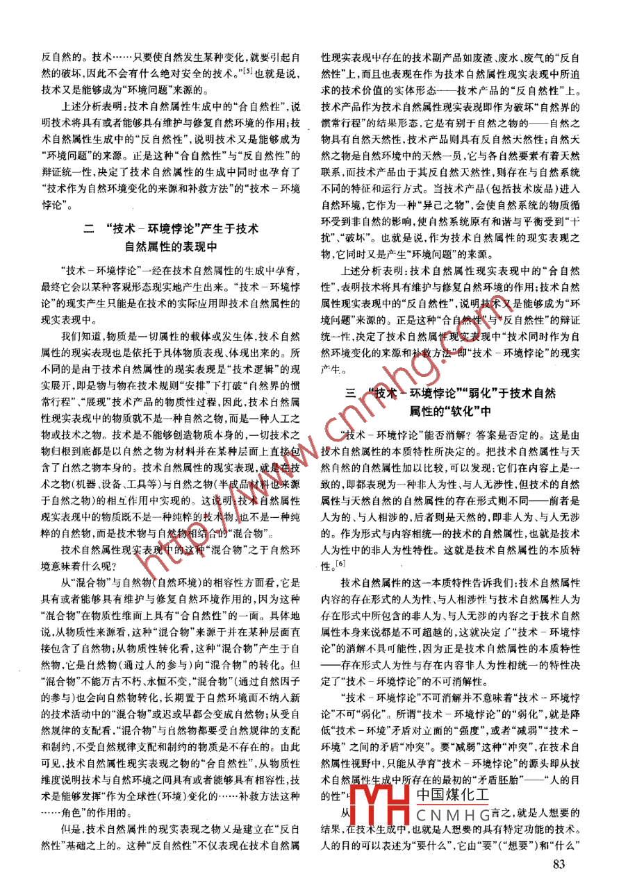 第23卷,第1期科學(xué)技術(shù)與辯證法Vol.23 No.12006年2月Science ,Technology and DialecticsFeb. ,2006“技術(shù)一環(huán)境悖論”與技術(shù)自然屬性鄒成效(江蘇工業(yè)學(xué)院法政系,江蘇常州213016)摘要:從技術(shù)自然屬性角度審視“技術(shù)-環(huán)境悖論”,可以發(fā)現(xiàn):技術(shù)同時(shí)作為自然環(huán)境變化的來源與補(bǔ)救方法,這一矛盾在技術(shù)自然屬性的生成中孕育,在技術(shù)自然屬性的表現(xiàn)中產(chǎn)生,在技術(shù)自然屬性的“軟化”中“弱化”。這一認(rèn)識(shí)對(duì)于深入理解技術(shù)的辯證本性以及技術(shù)在自然維度上的“后現(xiàn)代”轉(zhuǎn)向具有重要意義。關(guān)鍵詞:技術(shù)-環(huán)境悖論;技術(shù)自然屬性;弱化;軟化中團(tuán)分類號(hào):N031.文獻(xiàn)標(biāo)識(shí)碼:A文章編號(hào):003 - 5680(2006)01 - 0082 - 03技術(shù)既是產(chǎn)生環(huán)境問題的來源,同時(shí)也是解決環(huán)境問題合到自然規(guī)律所提供的“可能性空間”中即一種合目的性與的手段,保羅●格瑞(Paul Gray)把“技術(shù)同時(shí)作為(自然)環(huán)境合規(guī)律性相統(tǒng)一的過程。由于技術(shù)自然屬性的生成過程是變化的來源和補(bǔ)救方法的這種特性描述成技術(shù)發(fā)展的‘悖-個(gè)合自然規(guī)律性過程,人們常常把技術(shù)自然屬性直接埋解論””[1。格于布勒在(技術(shù)與全球性變化》- -書中從統(tǒng)計(jì)分為技術(shù)的“合自然規(guī)律性”。4析的角度對(duì)技術(shù)與環(huán)境的這種矛盾關(guān)系作了進(jìn)一步考察,指技術(shù)自然屬性作為技術(shù)“合白然規(guī)律性" ,其生成之中同出研究“技術(shù)及其作為全球性(環(huán)境)變化的起因和補(bǔ)救方法時(shí)畢育了“技術(shù)-環(huán)境悖論"。這可從兩方面來解讀:這種雙重角色”即“技術(shù)-環(huán)境悖論”,“將自然環(huán)境從不利的-方面,技術(shù)自然屬性的生成是一個(gè)合自然規(guī)律性過人類干擾中解放出來"是我們時(shí)代面臨的重要課題。[2]文章程。這意味著生成的技術(shù)將具有或者能夠具有維護(hù)自然環(huán)試圖從技術(shù)自然屬性的角度對(duì)“技術(shù)-環(huán)境悖論”的孕育、產(chǎn)境 修復(fù)自然生態(tài)的功能,因?yàn)樽匀画h(huán)境作為“影響人類的、生以及“弱化"問題作-初步探討。自然形成的物質(zhì)、能量和現(xiàn)象的總體”,它是-一個(gè)受自然規(guī)律支配的過程。與自然環(huán)境受自然規(guī)律支配-樣,技術(shù)自然屬一“技術(shù)-環(huán)境悖論"孕育于技術(shù)性的生成并不是技術(shù)主體的任意所為,它也是一個(gè)受自然規(guī)自然屬性的生成中律支配的過程。也就是說,技術(shù)自然屬性生成中的“合自然“技術(shù)-環(huán)境悖論”不是憑空出現(xiàn)的,它有一個(gè)從“孕育”性"即合 自然規(guī)律性,表明技術(shù)是具有或者能夠具有維護(hù)和到“生產(chǎn)”的過程。從技術(shù)自然屬性的角度看,"技術(shù)-環(huán)境修復(fù)自然生態(tài)與環(huán)境作用的。悖論”孕育于技術(shù)自然屬性的生成中。另一方面,技術(shù)自然屬性生成中的“合自然性”同時(shí)又是技術(shù)是生成的,技術(shù)自然屬性也是生成的。其生成的一建 立在技術(shù)的“反自然性”即反自然天然性基礎(chǔ)之上的。技般機(jī)理是:技術(shù)主體根據(jù)自己的目的預(yù)設(shè)在自然規(guī)律所提供術(shù)自然屬性的生成過程表明:不論是技術(shù)主體對(duì)構(gòu)成技術(shù)生的對(duì)自然物質(zhì)過程支配的“可能性空間”中尋找、選擇并實(shí)際成要素如機(jī)器、設(shè)備.工具材料的選擇,還是對(duì)所選擇要素使用具有“如何做”性質(zhì)的作用因子(機(jī)器、設(shè)備、工具材料的作用方式與程序的設(shè)計(jì)以及按照設(shè)計(jì)將它們實(shí)際相互作等)以及發(fā)明作用因子的作用方式與程序(技術(shù)規(guī)則) ,用以用后根據(jù)預(yù)設(shè)目的對(duì)其“結(jié)果”所作的調(diào)整,從根本上說,都作為人的目的因插人到自然因果轉(zhuǎn)化的鏈條中,以使“原因是對(duì)天然自然的一-種“千擾" 、“破壞”。技術(shù)自然屬性的生(自然因+目的因)- - ~結(jié)果"向符合人的目的的轉(zhuǎn)化。[5技成,正是在對(duì)天然自然的“干擾”、“破壞”中實(shí)現(xiàn)的。這也就術(shù)自然屬性的生成,就是這樣-種把人的預(yù)期目的能動(dòng)地整是中山秀太郎所說的:“所謂技術(shù),從其出現(xiàn)的那天起,就是中國煤化工[收稿日期] 2005 -09-09[基金項(xiàng)目]江蘇省 哲學(xué)社會(huì)科學(xué)資助項(xiàng)目(項(xiàng)目編號(hào):05SJD720020)MYHCNMHG[作者簡介]鄒成效(1957-),湖北荊州人,教授, 主要研究方向?yàn)榧夹g(shù)哲學(xué)。8反自然的。技.....只要使自然發(fā)生某種變化,就要引起自性現(xiàn)實(shí)表現(xiàn)中存在的技術(shù)副產(chǎn)品如廢渣.廢水、廢氣的“反自然的破壞,因此不會(huì)有什么絕對(duì)安全的技術(shù)。"[5]也就是說,然性"上,而且也表現(xiàn)在作為技術(shù)白然屬性現(xiàn)實(shí)表現(xiàn)中所追技術(shù)又是能夠成為“環(huán)境問題”來源的。求的技術(shù)價(jià)值的實(shí)體形態(tài)一-技術(shù)產(chǎn)品的