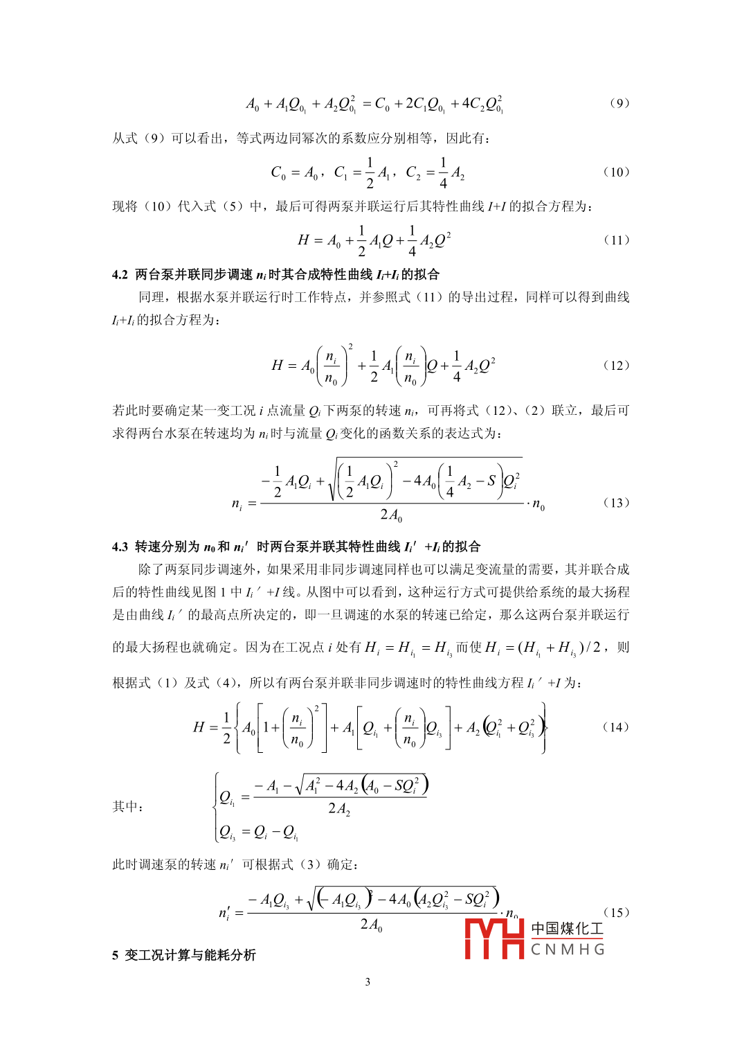 循環(huán)水泵非同步調(diào)速運(yùn)行時(shí)的不合理性分析張敏吉林市燃?xì)鉄崃υO(shè)計(jì)研究院有限公司吉林132000摘要:盡管人們對(duì)水泵采用變速調(diào)節(jié)所帶來的節(jié)能效果早已熟知,但對(duì)供暖系統(tǒng)循環(huán)水泵并聯(lián)運(yùn)行究競(jìng)應(yīng)采用何種調(diào)節(jié)方式才能使其節(jié)能效果更好,仍然還存在著一-定的認(rèn)識(shí)問題。本文以兩臺(tái)供暖循環(huán)水泵并聯(lián)為例,用解析的方法對(duì)變工況下分別采用同步調(diào)速與非同步調(diào)速運(yùn)行狀況及能耗進(jìn)行了分析和計(jì)算,闡明了目前較為普遍采用的非同步調(diào)速運(yùn)行方式的不合理性并對(duì)由此所引發(fā)的問題進(jìn)行了討論。關(guān)鍵詞:循環(huán)水泵;工況變化;變速調(diào)節(jié);經(jīng)濟(jì)分析中圖分類號(hào): U464. 138+. 1文獻(xiàn)標(biāo)識(shí)碼: A文 章編號(hào):1前言關(guān)于如何進(jìn)一步提高泵系統(tǒng)的運(yùn)行效率一直是人們所關(guān)注的焦點(diǎn)問題之--。為了能滿足熱負(fù)荷的變化及調(diào)節(jié)靈活的需要,--般供暖循環(huán)水泵常以并聯(lián)運(yùn)行方式居多。但在并聯(lián)運(yùn)行時(shí)究竟應(yīng)如何調(diào)節(jié)才能達(dá)到最佳節(jié)能效果卻有不同認(rèn)識(shí),有關(guān)資料[1]就認(rèn)為,“隨著節(jié)能的需要和調(diào)節(jié)流量的方便,調(diào)速水泵與恒速水泵并聯(lián)將是必然趨勢(shì)”。通過對(duì)目前一-些供暖系統(tǒng)有關(guān)循環(huán)水泵并聯(lián)運(yùn)行方式的調(diào)查,確認(rèn)有不少系統(tǒng)就是采用這種非同步調(diào)速的方法進(jìn)行調(diào)節(jié)的。那么,是否認(rèn)為這種運(yùn)行方式一定就是最合理的?下面筆者將以兩臺(tái)循環(huán)水泵并聯(lián)調(diào)速運(yùn)行為例,通過理論計(jì)算并對(duì)其結(jié)果進(jìn)行分析,證明這-運(yùn)行方式的不合理性之所在。2水泵的特性曲線與工況點(diǎn)的變化圖1所示為兩泵并聯(lián)運(yùn)行特性曲線,其中0點(diǎn)為設(shè)計(jì)工況,i點(diǎn)為變化工況。如果流量由原來的設(shè)計(jì)值Q0變化到Q,我們可采用調(diào)速的方法來達(dá)到這一-目 的,其調(diào)節(jié)方式有兩種,即兩臺(tái)泵同時(shí)調(diào)速或一臺(tái)泵保持額定轉(zhuǎn)速而另一臺(tái)泵調(diào)速。為了研究這兩種調(diào)節(jié)方式的運(yùn)行狀況,這里首先應(yīng)了解水泵在不同運(yùn)行工況下其特性曲線的變化情況。一般情況下,泵樣本中的相關(guān)特性總是以額定轉(zhuǎn)速no下的曲線來表示的。離心泵的H-Q和n-Q特性曲線一般可分別用一個(gè)多項(xiàng)通式表示。為使其擬合計(jì)算的簡(jiǎn)化且又能滿足工程實(shí)際需要,這里僅取多項(xiàng)式中前三項(xiàng)為擬合的形式,如在額定轉(zhuǎn)速no下它們的特性曲線方程可表示為:η-QH4H= A0+ AQ+ A2Q2(1)η= BQ+B2Q2+ B,Q' J/G(mx)li+hi閉式循環(huán)系統(tǒng)的管路特性曲線方程、n- 般表示為:*1H=sQ2(2)in"i+no .式中H- 水泵的揚(yáng)程,mH2O;中國(guó)煤化工YHCNMH G圖1兩并聯(lián)水泵不同調(diào)節(jié)方式的特性曲線11-單臺(tái)泵額定轉(zhuǎn)速no時(shí)的特性曲線;Q - -水泵的流量,m3/s;1-單臺(tái)泵非額定轉(zhuǎn)速mi時(shí)的特性曲線;n -水泵的效率,%;1+1-兩臺(tái)泵并聯(lián)同步額定轉(zhuǎn)速o時(shí)的特性曲線:S- -管路系統(tǒng)的阻力數(shù),s2/m*;I+1I-兩臺(tái)泵并聯(lián)同步非額定轉(zhuǎn)速mn:時(shí)的特性曲線;A0、A小、 A2-泵H-Q曲線擬合系數(shù);I' +1-兩臺(tái)泵非同步轉(zhuǎn)速時(shí)no+mn的特性曲線;B1、B2、 Bs 一泵n-Q曲線擬合系數(shù)。G(na)-管路特性曲線 (或0、i點(diǎn)的等效曲線);3單臺(tái)泵特性曲線的擬合[213.1單臺(tái)泵額定轉(zhuǎn)速no時(shí)其特性曲線I的擬合nea'、na" -01、i點(diǎn)和iv is 點(diǎn)的等效曲線?,F(xiàn)以“SLWR-250-250”型水泵為例,求得各擬合系數(shù)分別為Ao= 83.6304、41=294.2162.A2 =-4055. 1990; Bi= 14.6636、B2= 11.2635、B 3=-810.2534,因此可得其曲線方程H-Q和n-Q分別為:H = 83.6304 + 294.2162Q - 4055.1990Q2(3)η= 14.6636Q+ 11.2635Q2 - 810.2534Q33.2單臺(tái)泵非額定轉(zhuǎn)速n;時(shí)其特性曲線I;的擬合為適應(yīng)變流量Qi的需要,根據(jù)泵的相似理論有no Q。 Ho2i_(H)2,并將該式代入式(1)中可得泵在非額定轉(zhuǎn)速n;時(shí)的特性曲線1I擬合方程為:n;H=4[" |一+4.-Q+A2Q2(4)no)4兩臺(tái)泵并聯(lián)時(shí)合成的特性曲線擬合4.1兩臺(tái)泵并聯(lián)同為額定轉(zhuǎn)速no時(shí)其合成特性曲線I+I的擬合圖1中的曲線I+I為兩臺(tái)同型號(hào)水泵并聯(lián)運(yùn)行合成后的特性曲線。該曲線與管路特性曲線G的交點(diǎn)0為兩臺(tái)泵并聯(lián)運(yùn)行時(shí)的工作點(diǎn),且每臺(tái)泵的工作點(diǎn)為01。關(guān)于特性曲線I+I的方程仍可參照式(1) 進(jìn)行擬合?,F(xiàn)假定該曲線的方程為:H =C。+CQ +C2Q2(5)式中:Co、C1C2-為兩臺(tái)泵并聯(lián)后合成曲線的擬合系數(shù)。根據(jù)“并聯(lián)運(yùn)行時(shí)各泵的流量相疊加、揚(yáng)程不變”的原理可知,在工況點(diǎn)0處有:Qo =2Qo,Ho=Ho,(6)因?yàn)閳D中工況點(diǎn)0,仍在曲線I上,故應(yīng)滿足方程式(1), 即有:Hq=Ao+AQo+A2Q(7)而工況點(diǎn)0在曲線I+I,故也應(yīng)滿足方程式(5), 即H=Co+CQo+C2O中國(guó)煤