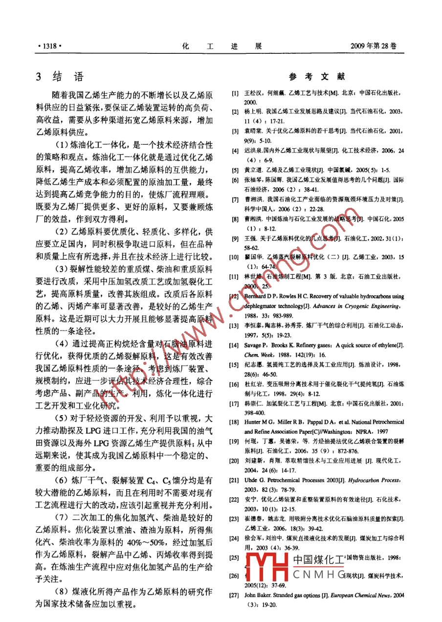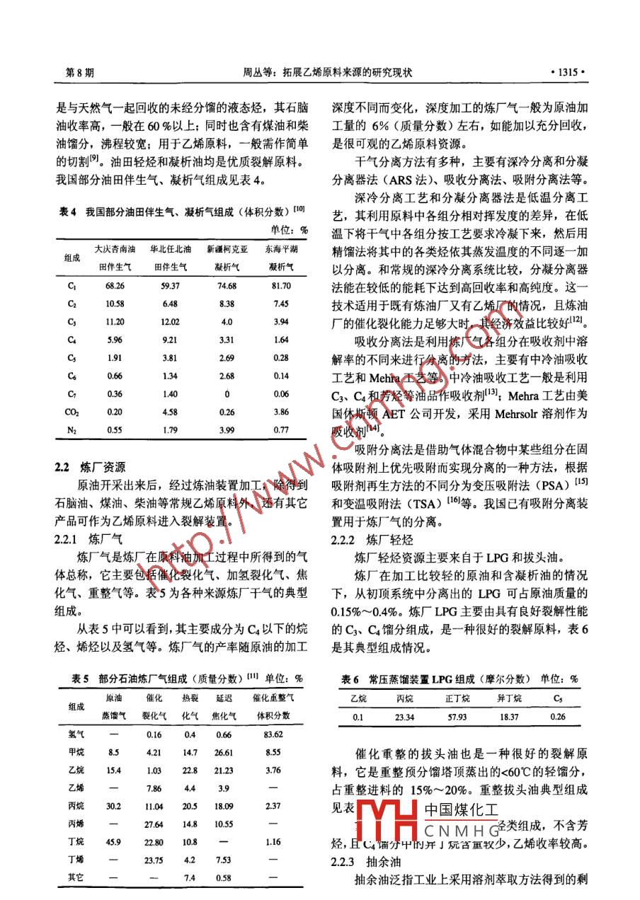 化工進展2009年第28卷第8期CHEMICAL INDUSTRY AND ENGINEERING PROGRESS●1313.進展與述評》拓展乙烯原料來源的研究現(xiàn)狀周叢,茅文星(中國石油化工股份有限公司北京化工研究院,北京100013)摘要: 介紹了世界乙烯原料的發(fā)展趨勢及我國乙烯原料的發(fā)展歷史、現(xiàn)狀;結(jié)合我國乙烯原料供應(yīng)緊張的現(xiàn)狀,對于如何拓寬乙烯原料來源、擴大原料供應(yīng),從而緩解原料供需矛盾,保證我國乙烯工業(yè)的穩(wěn)定發(fā)展進行了討論;介紹了多種解決乙烯原料來源的技術(shù)途徑,并對其應(yīng)用前景進行了展望。關(guān)鍵詞:乙烯;原料;生產(chǎn);來源中圖分類號: TQ 221.21文獻標識碼: A文章編號: 1000-6613 (2009) 08 - 1313-06Discussion about the exploitation of ethylene raw material resourcesZHOU Cong, MAO Wenxing(Bejjing Research Institute of Chemical Industry, SINOPEC, Beijing 100013, China)Abstract: The development trends of world ethylene industry raw materials is introduced, and thedevelopment situation of China ethylene industry raw materials is analyzed. According to the situationof insufficient ethylene supply, the exploitation of ethylene material resources is discussed. Differentapproaches to solve the problem are introduced, and their potentials in application are also estimated.Key words: ethylene; material; production; resource石油化工是推動國民經(jīng)濟發(fā)展的支柱產(chǎn)業(yè)之烯原料來源及其質(zhì)量的好壞對裝置達標、節(jié)能降耗、一,而乙烯工業(yè)是石化工業(yè)的龍頭,具有舉足輕重經(jīng)濟效益都有重大的影響。的地位"。全球乙烯產(chǎn)量的99%以上通過乙烯裝置1乙烯原料概況得到。我國的乙烯產(chǎn)業(yè)從20世紀60年代初起步,一直保持快速發(fā)展,近年來更是有飛躍性的發(fā)展:1.1 世界乙烯原料構(gòu)成2005年世界乙烯產(chǎn)量為10446萬噸,我國乙烯產(chǎn)量從世界范圍來看,工業(yè)化國家的乙烯原料普遍則達到755.5萬噸,上升到世界第二位;到2007年,以輕質(zhì)原料為主,其原料的選擇在注重優(yōu)質(zhì)化的同我國乙烯產(chǎn)量更是首次突破千萬噸大關(guān),約為1028時,也十分注重根據(jù)資源情況和市場變化,選用較萬噸,僅次于美國。廉價的原料,努力降低原料費用。乙烯生產(chǎn)成本的高低對石化企業(yè)競爭力的強弱目前,在生產(chǎn)乙烯的原料方面,石腦油仍占主起決定性作用,而在影響乙烯生產(chǎn)效益的因素中,導(dǎo)地位,且所占份額有所增加:以乙烷為原料的乙原料的影響是最大的。乙烯生產(chǎn)采用什么原料不僅烯裝置,主要集中在北美和中東地區(qū),其所占份額決定著乙烯成本的高低,而且也決定下游產(chǎn)品的種已有所下降:丙烷、丁烷作為乙烯原料比例變化不類、產(chǎn)量、成本和綜合利用。乙烯原料經(jīng)濟性的好大;中國煤化工原料,只是對石腦壞對乙烯裝置的能耗、物耗、成本有至關(guān)重要的作CNMHG,)-03-22.用。所以說與技術(shù)、設(shè)備、管理相比,原料對乙烯第一作者簡介:周叢(1975- -),男,高級工程師,從事石油化工領(lǐng)裝置效益的影響是第-位的。在一-般情況下,根據(jù)域乙烯技術(shù)研發(fā)工作。電話010 - 59202284: B - mail原料的不同,原料占乙烯總成本的60%~80%。乙zhoucbriciacnc.●1314.化I進展2009年第28卷油的調(diào)劑和補充,而且隨著燃料市場的供求影響以這也給我國擴大進口原料造成了困難。及油品改質(zhì)加工的發(fā)展,柴油所占比例下降。世界隨著國內(nèi)成品油(汽、煤、柴油)需求量的不乙烯原料組成變化見表1.斷增長,乙烯原料受化工以及燃料市場的制約愈加明顯,乙烯原料的供求矛盾逐年突出。隨著以乙烯表1世界乙烯原料組成(質(zhì)量分數(shù))單位: %為龍頭的石化工業(yè)的發(fā)展,預(yù)計中國原油加工量和石腦油乙烷丙烷丁燒柴油其它乙烯產(chǎn)量之比將從目前的40: 1降至20: 1,化工用1997 年51.3.16.92.油短缺的情況會更加嚴重,乙烯原料供應(yīng)難度隨之2005年55.025.92.55.8增加8)。因此,要解決乙烯原料供應(yīng)緊張的狀況,僅僅依靠加大國內(nèi)原油開采力度、擴大原料油進口是1.2 我國乙烯原料現(xiàn)狀不夠的,還需要立足現(xiàn)有乙烯原料基礎(chǔ),拓寬乙烯我國輕烴資源少,原油較重,還有部分原料芳原料來源,為我國的厶烯生產(chǎn)提供必要的原料補充。烴含量較高,不適合作乙烯原料。由于用作乙烯原料的石腦油較少,我國歷史上長期采用大量常壓柴2擴大乙烯原料來源油作為裂解原料(直至1992 年,柴油仍占我國乙烯我國傳統(tǒng)的乙烯裂解原料是原油煉制得到的液原料的52.70%,石腦油僅占35.70%) ,這也影響了體產(chǎn)品,主要有石腦油、柴油及部分二次加工油等。乙烯綜合收率舊。近年來,隨著對柴油的改質(zhì)加工,本文圍繞拓展裂解原料問題,在現(xiàn)有原料基礎(chǔ)上, .加大輕烴資源的利用以及國外進口油品的增加,我對 如何拓寬裂解裝置的原料來源、促進乙烯原料多國油品不斷向輕質(zhì)化、優(yōu)質(zhì)化發(fā)展,柴油所占比重元化進行討論。逐年下降。目前,我國乙烯生產(chǎn)原料以石腦油為主,2.1 輕烴資源其它原料為補充。我國乙烯原料組成的變化見表2。在烯烴生產(chǎn)中,采用不同的原料建廠,投資差別很大。采用乙烷、丙烷原料,由于烯烴收率高,表2我國乙烯原料組成 (質(zhì)量分數(shù))單位: %副產(chǎn)品很少,工藝較簡單,相對的投資較少