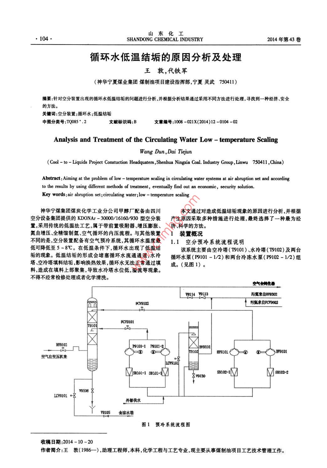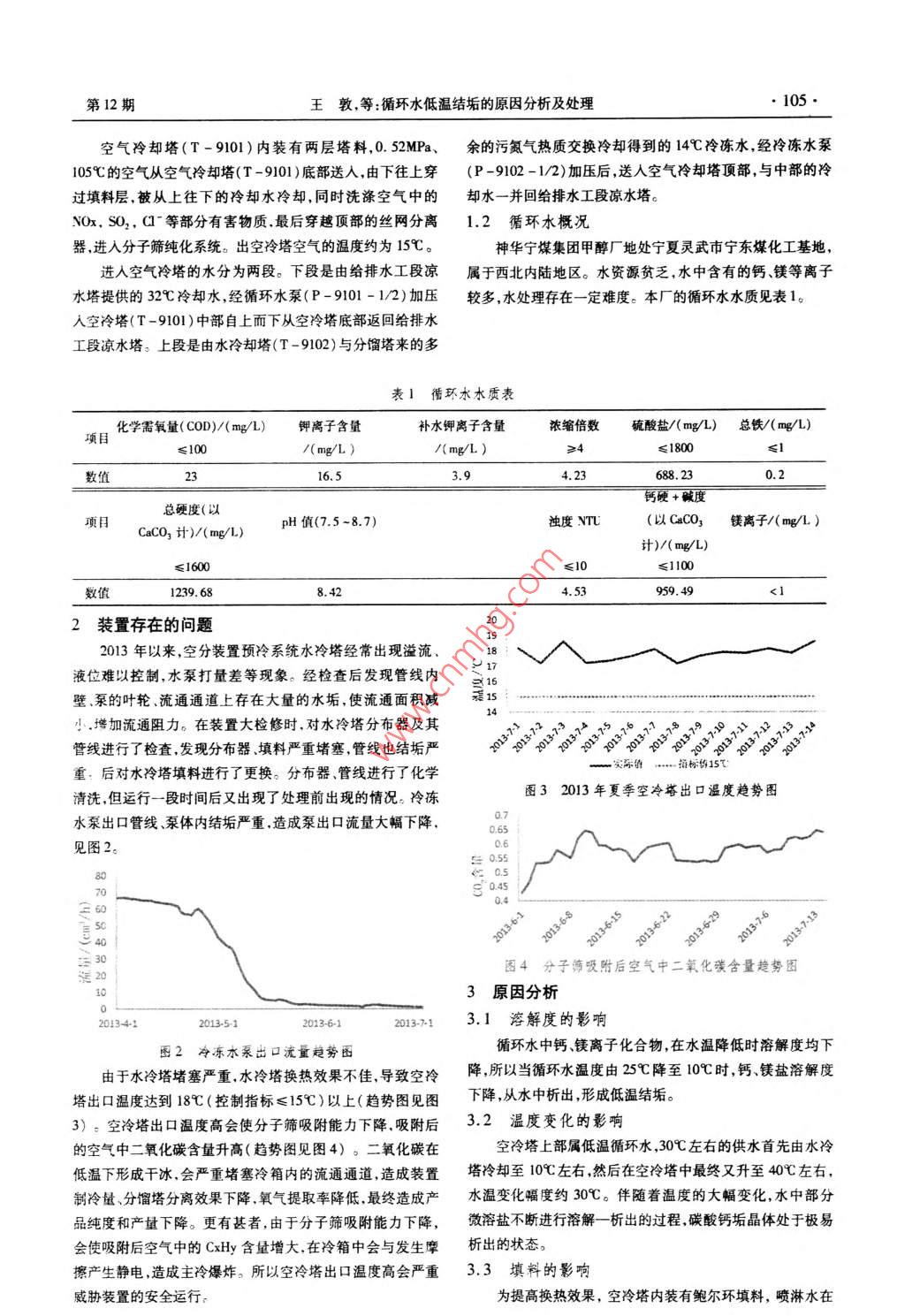 山東化工●104.SHANDONC CHEMICAL INDUSTRY2014年第43卷循環(huán)水低溫結垢的原因分析及處理王敦,代鐵軍(神華寧夏煤業(yè)集團煤制油項目建設指揮部,寧夏靈武750411)摘要:針對空分裝置出現(xiàn)的循環(huán)水低溫結垢的問題進行分析,并根據(jù)分析結果通過采用不同方法進行處理,尋找到-種經(jīng)濟、安全的方法。關鍵詞:空分裝置;循環(huán)水;低溫結垢中圖分類號:TQ085*.2文獻標識碼:B文章編號:1008 -021X(2014)12 -0104 -02Analysis and Treatment of the Circulating Water Low - temperature ScalingWang Dun , Dai Tiejun(Cool - to - Liquids Project Constuction Headquaters ,Shenhua Ningxia Coal. Industry Group , Linwu 750411 ,China)Abstract:Aiming at the problem of low - temperature scaling in circulating water systems at air abnuption set and accordingto the results by using different methods of treatment, eventually find out an economie, security solution.Key words:air abruption set;circulating water;low - temperature scaling神華寧煤集團煤炭化學工業(yè)分公司甲醇廠配備由四川本文通過對造成低溫結垢現(xiàn)象的原因進行分析,并根據(jù)空分設備集團提供的KDONAr - 3000/16160/930型空分裝產(chǎn)生原因采取多種措施進行處理,最終選擇了一種最為經(jīng)置,采用傳統(tǒng)的低溫法工藝,屬于帶前置吸附器、增壓膨脹、濟、科學的方法。氮自增壓、全精餾制氬、空氣循環(huán)的內(nèi)壓流程。與其他裝置1裝置概況不同的是,空分裝置配備有空氣預冷系統(tǒng),其循環(huán)水溫度最1.1 空分預冷系統(tǒng)流程說明低可降低至5 ~8C。在低溫條件下,循環(huán)水出現(xiàn)了低溫結該系統(tǒng)主要由空冷塔(T9101 )、水冷塔( T9102)及兩臺垢的現(xiàn)象。低溫結垢的形成會堵塞循環(huán)水流通通道,水冷循環(huán)水泵(P9101 - 1/2)和兩臺冷凍水泵(P9102 - 1/2)組塔、空冷塔填料結垢,影響換熱效果,循環(huán)水無法正常通過填成。(見圖1)。料造成在填料上部聚集,導致水冷塔水位低,溢流等現(xiàn)象。不得不經(jīng)常檢修處理或者化學清洗??諝馓嘶?94 9u3污復來自09302RC79102轉氮來自PC79602PC7910119101_山1H79101P0101-1 P9101-K 3910119102.Y9101⑥)89101墅氣自空壓機來L0Y9102M 801022891309106L9101 8外部風水9105擊涼水塘圖1預冷系 統(tǒng)流程圖收稿日期:2014-10-20作者簡介:王教(1986- -) ,助理工程師,本科,化學工程與工藝專業(yè),現(xiàn)主要從事煤制油項目工藝技術管理工作。第12期王敦,等:循環(huán)水低溫結垢的原因分析及處理,105●空氣冷卻塔(T- 9101)內(nèi)裝有兩層塔料,0.52MPa、余的污氮氣熱質交換冷 卻得到的14C冷凍水,經(jīng)冷凍水泵105C的空氣從空氣冷卻塔(T - 9101 )底部送入,由下往上穿(P -9102 - 1/2)加壓后,送人空氣冷卻塔頂部,與中部的冷過填料層,被從上往下的冷卻水冷卻,同時洗滌空氣中的卻水-并回給排水I段涼水塔。NOx,sO,C-等部分有害物質.最后穿越頂部的絲網(wǎng)分離1.2循環(huán)水概況器,進入分子篩純化系統(tǒng)。出空冷塔空氣的溫度約為15C。神華寧煤集團甲醇廠地處寧夏靈武市寧東煤化工基地,進人空氣冷塔的水分為兩段。下段是由給排水工段涼屬于西北內(nèi)陸地區(qū)。水資源貧乏,水中含有的鈣、鎂等離子水塔提供的329冷卻水,經(jīng)循環(huán)水泵(P -9101 - 1/2)加壓較多,水處理存在- -定難度。本廠的循環(huán)水水質見表1。入空冷塔(T -9101 )中部自上而下從空冷塔底部返回給排水工段涼水塔。.上段是由水冷卻塔(T - 9102)與分餾塔來的多表]循環(huán)水水質表項目化學需氧量( COD)/(mg/L)鉀離子含量補水鉀離子含量濃縮倍數(shù)硫酸鹽/(mg/L)總鐵/( mg/L)≤100/(mg/L)/(mg/L )>4≤1800≤數(shù)值2316.53.94.23688. 230.鈣硬+堿度總硬度(以目CaCO,計)/(mg/L)pH值(7.5-8.7)濁度NTL(以CaCO3鎂離子/(mg/L)計)/( mng/L)≤1600≤10≤11001239.688.424.53959.49<2裝置存在的問題202013年以來,空分裝置預冷系統(tǒng)水冷塔經(jīng)常出現(xiàn)溢流.∪1718液位難以控制,水泵打量差等現(xiàn)象。經(jīng)檢查后發(fā)現(xiàn)管線內(nèi)三16壁泵的葉輪、流通通道上存在大量的水垢,使流通面積減乘1516小.增加流通阻力。在裝置大檢修時,對水冷塔分布器及其管線進行了檢查,發(fā)現(xiàn)分布器.填料嚴重堵塞,管線也結垢嚴重.后對水冷塔填料進行了更換。分布器、管線進行了化學---實際值... 箱標飾15T清洗,但運行- -段時間后又出現(xiàn)了處理前出現(xiàn)的情況。冷凍圖32013年夏季空冷塔出口溫度趨勢圖水泵出口管線、泵體內(nèi)結垢嚴重.造成泵出口流量大幅下降,0.65 i見圖2D.6|生0.558070 L8 0.452.4三60三40注30圖4分子篩吸附后空氣中二氧化碳含量趨勢圖送210|3原因分析20134.12013-5-12013-6-12013-7-13.1溶解度的影響32 冷凍水泵出口流量趨勢圖循環(huán)水中鈣、鎂離子化合物,在水溫降低時溶解度均下由于水冷塔堵塞嚴重.水冷塔換熱效果不佳.導致空冷降,所以當循環(huán)水溫度由25C降至10C時,鈣、鎂鹽溶解度塔出口溫度達到18C(控制指標≤15C)以上(趨勢圖見圖下降,從水中析出,形成低溫結垢。3)??绽渌隹跍囟雀邥狗肿雍Y吸附能力下降.吸附后3.2溫度變化的影響的空氣中二氧化碳含量升高(趨勢圖見圖4)。二氧化碳在空冷塔上部屬低溫循環(huán)水,30C左右的供水首先由水冷低溫下形成干冰.會嚴重堵塞冷箱內(nèi)的流通通道,造成裝置塔冷卻至10C左右,然后在空冷塔中最終又升至40C左右,制冷量、分餾塔分離效果下降.氧氣提取率降低.最終造成產(chǎn)水溫