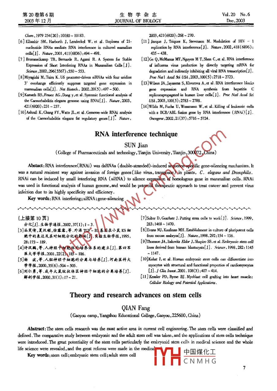 第20卷第6期生物學(xué)雜志Vol.20 No.62003年12月.JOURNAL OF BIOLOCYDe,2003文章編號:1008 - 9632(2003)06 - 0005 - 03RNA干擾與技術(shù)孫劍,2(1. 天津大學(xué)藥物科學(xué)與技術(shù)學(xué)院,天津 300072;2. 軍事醫(yī)學(xué)科學(xué)院基礎(chǔ)所,北京 100850)摘要:RNA 干擾(RNA iterference, RNAi)是由雙鏈RNA誘導(dǎo)的、序列特異的基因沉默機(jī)制。它是自然存在于植物、線蟲和.果蠅中抵抗外來基固(包括病毒、轉(zhuǎn)座子)入侵的方式。在哺乳動(dòng)物細(xì)胞中,能夠人工誘導(dǎo)RNA干擾,沉黷有同源序列基因表達(dá)。這一新技術(shù)具有特異性、高效性。因此,正被用來研究人類基固組的功能腫瘤和抗病毒感染等。關(guān)鍵詞;RNA干擾;小干擾RNA;基因沉默中圖分類號:Q52,Q75文默標(biāo)識(shí)碼:ARNA干擾( RNA interference, RNAi)是由雙鏈RNAdependent RNA Polymerase , RdRP)的作用下,合成新的雙誘導(dǎo)的能在細(xì)胞內(nèi)有效地抑制有互補(bǔ)序列內(nèi)源性基鏈RNA。再由Dicer 作用,產(chǎn)生新的小干擾RNA,完成因的現(xiàn)象。它是1998年Fire 等在研究反義核苷酸時(shí)發(fā)小干擾RNA的放大過程[3]。現(xiàn),在線蟲體內(nèi),雙鏈RNA ( double stranded RNA,2小干擾RNA誘導(dǎo)哺乳動(dòng)物細(xì)胞內(nèi)RNA干擾技術(shù)dsRNA)能有效地抻制有互補(bǔ)序列內(nèi)源性基因,而且抑2.1 化學(xué)合成的小干擾RNA制效果優(yōu)于單鏈反義RNA。因此提出了雙鏈RNA誘盡管雙鏈RNA在植物和果蠅細(xì)胞中誘導(dǎo)RNA干導(dǎo)的RNA干擾(。隨后的研究證實(shí),RNA干擾是自然擾將雙鏈RNA轉(zhuǎn)入常用的哺乳動(dòng)物細(xì)胞內(nèi)(如人胚腎存在于植物、真菌、果蠅等生物中,序列特異的基因沉293細(xì)胞、小鼠成纖維細(xì)胞NH3T3等)未引起特異、有默( gene-silencing)機(jī)制。效的RNA干擾現(xiàn)象[4]。這可能與大于30個(gè)堿基的雙鑒于RNA干擾的特異性和高效率,目前,國外正研鏈RNA在哺乳動(dòng)物細(xì)胞內(nèi)引起非特異的蛋白合成抑制究如何在哺乳動(dòng)物細(xì)胞中誘導(dǎo)RNA干擾的技術(shù),來研等細(xì)胞毒效應(yīng)有關(guān)[5]。在改用化學(xué)合成的21個(gè)堿基究基因的功能。并希望RNA干擾技術(shù)應(yīng)用于臨床,治小干擾RNA后,可以在哺乳動(dòng)物細(xì)胞內(nèi)引起特異的療腫瘤、病毒感染等疾病。已經(jīng)取得了良好的實(shí)驗(yàn)結(jié)RNA干擾現(xiàn)象06。這使RNA干擾技術(shù)應(yīng)用于哺乳動(dòng)果。本文著重介紹RNA千擾的原理和哺乳動(dòng)物細(xì)胞內(nèi)物成為可能。誘導(dǎo)RNA干擾的技術(shù)。化學(xué)合成法人工制備小干擾RNA,一般是分別合RNA干擾的原理成21個(gè)堿基的意義鏈和反意鏈。在細(xì)胞外,將意義鏈RNA干擾是由雙鏈RNA誘導(dǎo)的。在細(xì)胞內(nèi),雙鏈和反意鏈混合。適當(dāng)?shù)臏囟认?互補(bǔ)堿基配對形成小RNA前體由核酸酶II(RNase II) - Dicer處理為21 ~23干擾RNA。然后,采用傳統(tǒng)轉(zhuǎn)染的方法,如lipfectarnin個(gè)堿基的小RNA,才能誘發(fā)RNA干擾。因此,稱這類轉(zhuǎn)染、電打孔等將小干擾RNA導(dǎo)入細(xì)胞、誘導(dǎo)RNA干小RNA為小干擾RNA( smalll interfering RNA, siRNA)。擾。此法操作簡單、快速。只是引起的RNA干擾效應(yīng)小干擾RNA是由19~ 21個(gè)堿基配對形成的雙鏈,并在往往是暫時(shí)的,難以持久。因此,目前正探討哺乳動(dòng)物其3'末端有兩個(gè)游離末配對的核苷酸。它在與解螺旋細(xì)胞內(nèi)表達(dá)小干擾RNA,能維持長久的.可誘導(dǎo)的RNA酶、核酸酶等結(jié)合形成RNA誘導(dǎo)的沉默復(fù)合物(RNA-干擾效應(yīng)。inducing silencing complex, RISC)后,能引導(dǎo)RISC與互補(bǔ)2.2 細(xì)胞內(nèi)表達(dá)的小干擾RNAmRNA結(jié)合將mRNA降解[2]。在轉(zhuǎn)錄后水平,抑制基這種方法是將表達(dá)小干擾RNA的載體轉(zhuǎn)染細(xì)胞,因的表達(dá),因而,又稱為基因轉(zhuǎn)錄后沉默(pot-在細(xì)胞內(nèi)表達(dá)小干擾RNA,誘導(dǎo)RNA干擾。根據(jù)產(chǎn)transcriptional gene silecing, PTGC)。生小干擾RNA的方法不同,可大概分為兩種類型:第在小干擾RNA誘導(dǎo)的RNA干擾過程中,可能還存-種類型是將意義鏈和反義鏈表達(dá)在同一條RNA鏈在小千擾RNA的放大過程,以維持它的RNA干擾誘導(dǎo)上,中間隔有3~9個(gè)堿基。因而,可以折疊、堿基.功能。此過程推測是以小于擾RNA為引物,互補(bǔ)配對,形成柄=環(huán)(stem-loop) 樣結(jié)構(gòu)的RNA[7]。 在構(gòu)mRNA為模板,在RNA依賴性RNA合成酶(RNA-建表達(dá)質(zhì)粒時(shí),將小干擾RNA序列按5'→3'和3'→5'收稿日期:2003-06-11作者筒介:孫鍘(1963- ),男,山東諸城人,軍事醫(yī)學(xué)科學(xué)院博士生、副教授中國煤化工TYHCNMHG5第20卷第6期生物學(xué)雜志Vol.20 No.62003年12月JOURNAL OF BIOLOGYDec ,2003的方向插入質(zhì)粒。因此,轉(zhuǎn)錄的RNA產(chǎn)物是意義鏈-.過堿基互補(bǔ)形成雙鏈的小干擾RNA{8]。在構(gòu)建表達(dá)質(zhì)隔-反義鏈。第二種類型是將意義鏈和反義鏈表達(dá)在粒時(shí),意義鏈和反義鏈序列分別插人同一質(zhì)粒上的兩不同的RNA鏈。然后,在細(xì)胞內(nèi),意義鏈和反義鏈通個(gè)表達(dá)盒(圖1)。promoter_Antisense] C Sensc_C AmtisenseJ-5'一+ 3'3'←5']轉(zhuǎn)錄轉(zhuǎn)錄轉(zhuǎn)錄后堿基配對SenseAntisense堿基配對柄環(huán)樣RNA小千擾RNA圖1兩種在細(xì)胞內(nèi)表達(dá)小干擾 RNA的方法示意圄Figu