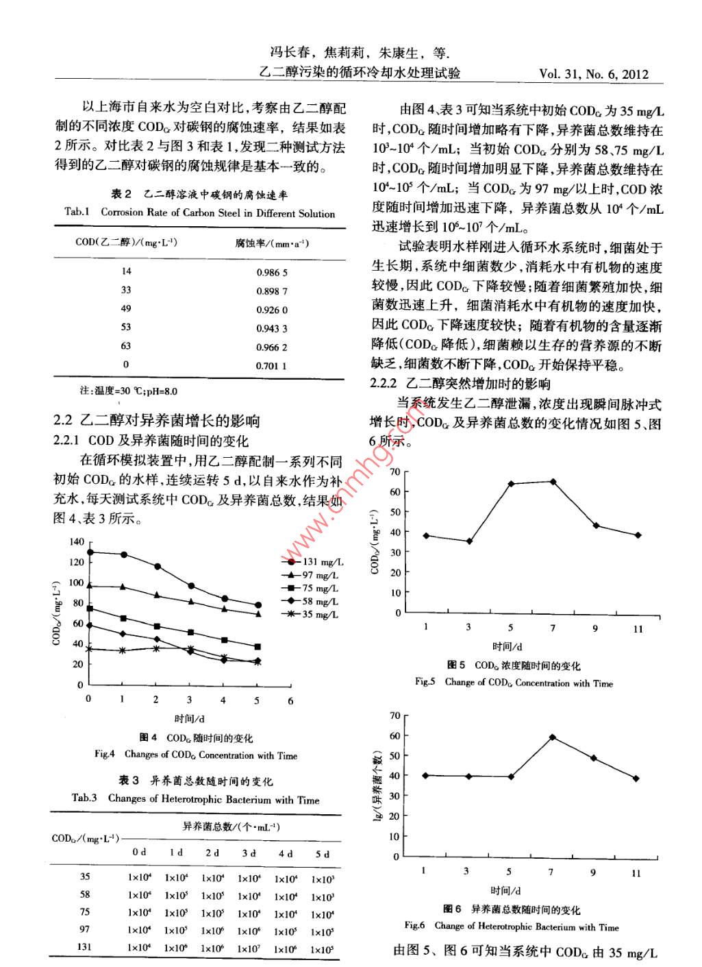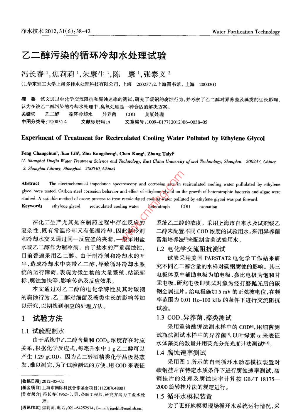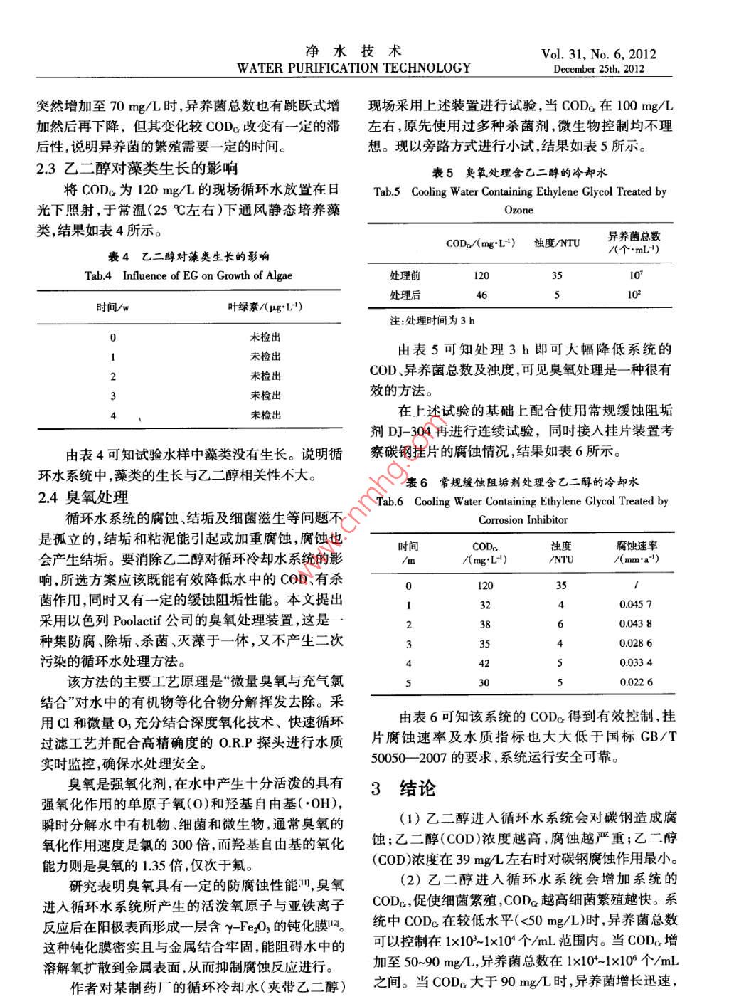 凈水技術(shù)2012,31(6):38-42Water Purification Technology乙二醇污染的循環(huán)冷卻水處理試驗馮長春',焦莉莉,朱康生1,陳康1,張?zhí)┝x2(1華東理工大學(xué)上海多佳水處理科技有限公司,上海200237;2上海圖書館,上海200030)摘要該文通過電化學(xué)交流阻抗和腐蝕速率的測試,研究了碳鋼的廣蝕行為,并考察了乙二醇對異養(yǎng)菌及藻類的生長影響,認(rèn)為在被乙二醇污染的冷卻水處理中,臭氧處理是一種合適的解決方案。關(guān)鍵詞乙二醇循環(huán)冷卻水異養(yǎng)菌COD臭氧處理中圖分類號:TQ08514文獻標(biāo)識碼:A文章編號:1009-01772012)06-003805Experiment of Treatment for Recirculated Cooling Water Polluted by Ethylene GlycolFeng Changchun, Jiao Lili, Zhu Kangsheng, Chen Kang, Zhang Taiy(. Shanghai Duojia Water Treatment Science and Technology, East China University of and Technology, Shanghai 200237, china;2. Shanghai Library, Shanghai 200030, China)Abstract The electrochemical impedance spectroscopy and corrosion rate in recirculated cooling water pullulated by ethyleneglycol were tested. Carbon steel corrosion behavior and effect of ethylene glycol on the growth of heterotrophic bacteria and algae werestudied. a suitable method of ozone process to treat recalculated cooling water polluted by ethylene glycol was put forwardKeywordsling waterCOD在化工生產(chǎn)尤其是在制藥過程中存在反應(yīng)的系統(tǒng)乙二醇的濃度。采用上海市自來水及試劑級乙復(fù)雜性,既有常溫冷卻又有低溫冷卻,因此制冷劑二醇來配置不同COD濃度的試驗用水采用異養(yǎng)菌和冷卻水交叉通過同一反應(yīng)釜的夾套,一般采用鹽富集培養(yǎng)法來配制含菌試驗用水。水或乙二醇作為制冷劑,由于鹽水的嚴(yán)重腐蝕性,1.2電化學(xué)交流阻抗測試目前普遍采用乙二醇。由于制冷劑和冷卻水的互試驗采用美國 PARSTAT2電化學(xué)工作站來研串,造成冷卻水中夾帶乙二醇,導(dǎo)致循環(huán)冷卻水系究不同乙二醇含量的水樣對碳鋼腐蝕的影響。其三統(tǒng)的運行障礙,表現(xiàn)為微生物的大量繁殖、粘泥超電極體系中輔助電極為鉑電極、參比電極為飽和甘標(biāo)腐蝕加快等影響傳熱及反應(yīng)效果。汞電極,研究電極即測試對象為經(jīng)打磨拋光后的碳本文通過對乙二醇的電化學(xué)特性及其對碳鋼鋼金屬掛片。給電極施加5mV的正弦波電位在頻的腐蝕行為、乙二醇對細菌及藻類生長的影響等加率范圍為001Hz-100kHz的條件下進行交流阻抗以研究,以期找到相應(yīng)的處理方法。試驗。1試驗方法1.3COD、異養(yǎng)菌、藻類測試1.1試驗配制水采用重鉻酸鉀法測水樣中的COD,用細菌測試瓶法測試水樣中的異養(yǎng)菌,以葉綠素α來表征由于系統(tǒng)中乙二醇含量和COD濃度存在對應(yīng)水體藻類的數(shù)量并用熒光分光光度計法測試4關(guān)系,根據(jù)化學(xué)反應(yīng)式每毫升水中1g乙二醇可以產(chǎn)生129gCOD。因為乙二醇酒精類化學(xué)品極易蒸14腐蝕速率測試發(fā),難以測完,為了試驗測試的方便,用COD來表征采用圖1所示的自制循環(huán)水動態(tài)模擬裝置對碳鋼掛片在特定水質(zhì)條件下進行腐蝕速率測試,碳[收稿日期]2012-0502鋼掛片的處理及腐蝕速率計算按GB/T18175[基金項目上海市國際科技合作基金項目(1230704800)2000旋轉(zhuǎn)掛片法的規(guī)定進行。作者筒介馮長春(1962-),男高級工程師,研究方向為工業(yè)水處1.5循環(huán)水模擬裝置理[通訊作者]焦莉莉,電話:021-64252574;E-mail:jiaolilic@mail.sh.cn。為了更好地模擬現(xiàn)場循環(huán)水系統(tǒng)運行情況,采凈水技術(shù)Vol.31,No.6,2012WATER PURIFICATION TECHNOLOGYDecember 25th. 2012◆COD=39mgL-COD=72 g/L6A-CODG=110 mg/L.10005001000150020001-控制裝置;2-水泵;3-加熱器;4試驗水浴;zre/ohms5-恒溫水浴;6-轉(zhuǎn)子流量計;7-掛片圖3碳鋼在乙二醇溶液中的交流阻抗圖圖1腐蝕速率測試裝置Fig 3 EIS of Carbon Steel in Solution of EGFig 1 Test Device of Corrosion Rate表1乙二醇溶液中的等效電路參數(shù)用圖2裝置來進行乙二醇對異養(yǎng)菌生長影響的研Tab 1 Circuit Parameters in Solution of EGCOD/(mg“L4)Rs/nRet/s181834l103301387溶液電阻、電荷轉(zhuǎn)移電阻及低頻容抗弧最小,對碳鋼腐蝕影響最大;當(dāng)COD。為39mg/時,溶液電阻、電荷轉(zhuǎn)移電阻及低頻容抗弧最大,對碳鋼的腐蝕作用最小;當(dāng)cOD繼續(xù)增加時,溶液電阻、電荷轉(zhuǎn)移電阻及低頻容抗弧呈減小的趨勢,即對碳鋼的腐蝕隨COD,的增加而增大。碳鋼在乙二醇溶液中腐蝕的原因是由于乙二醇在電極上的活化性能比較高,容易發(fā)生氧化反1-抽氣;2-冷卻塔;3-填料;4-溫控儀;應(yīng),水中的溶解氧為乙二醇在電極上氧化提供必要5-恒溫水槽;6-加熱棒;7-水泵;8-管道條件。文獻[6-7]表明當(dāng)溶解氧小于1mg/L時可能圖2循環(huán)模擬裝置引起碳鋼的腐蝕,乙二醇氧化的中間產(chǎn)物醛類化合Fig 2 Dynamic Simulation Device of Circulated Cooling Water物可以吸附在電極表面上對電極產(chǎn)生毒化作用,乙2結(jié)果與討論二醇最終氧化為乙二酸,使水中的H濃度增加,從而進一步加速了碳鋼的腐蝕。21乙二醇對碳鋼腐蝕的影響乙二醇具有親水極性基團羥基,可以在金屬表211電化學(xué)測試面形成吸附膜刈,阻止金屬表面與水接觸,對金屬腐試驗考察了由乙二醇配制的不同COD濃度的蝕起抑制作用。但是乙二醇必須達到一定的濃度,水樣中碳鋼的腐蝕電化學(xué)性能,其交流阻抗測試結(jié)吸附膜才能覆蓋