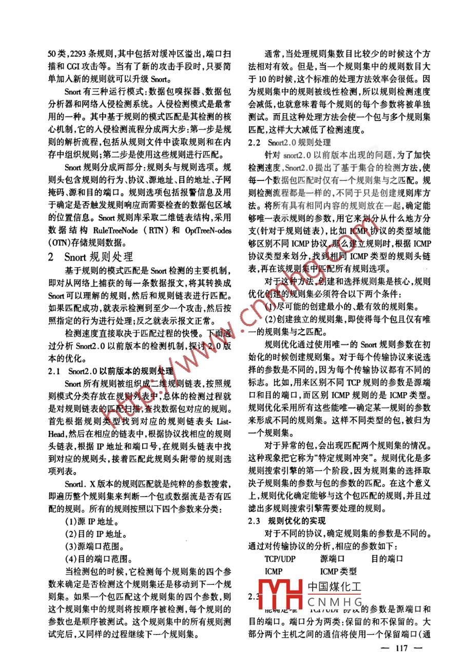 信息技術(shù)2008年第8期Tnfomatin Fohasigy中圖分類號:TP393.08文獻標(biāo)識碼:A 文章編 號:1009 - 2552(2008)08 - 0116- 03Snort系統(tǒng)規(guī)則優(yōu)化朱偉(中南大學(xué)信息科學(xué)與工程學(xué)院,長沙410083)摘要: Snort入侵檢測系統(tǒng)的效率直接取決于用于檢測規(guī)則的規(guī)則集質(zhì)量。創(chuàng)建理想的規(guī)則集,是使Snort檢測速度得到提高的關(guān)健?,F(xiàn)講述了Snort 規(guī)則優(yōu)化的具體過程,優(yōu)化時出現(xiàn)的問題及對問題的解決辦法。關(guān)鍵詞:人侵檢測;規(guī)則優(yōu)化;模式匹配Rule optimizer of Snort systemZHU Wei(College of Information Science and Engineering, Central University, Changsha 410083, China)Abstract: The fficiency of set inspection technologies is directly linked to the quality of the set that used forruleinspection of Snort. It is the rule optimizer' s key step to create a rule setthat is ideal for use in setinspection technology. This paper introduced the Snort rule optimizer technology, and question prob-blyappeared and the solution.Key words: model matching; intnusion detection system; nule optimizer0引言專家系統(tǒng)按鍵監(jiān)視系統(tǒng).模型推理、狀態(tài)轉(zhuǎn)換和模人侵檢測系統(tǒng)( IDS: Intnusion Detection System)是式匹配等。自動進行人侵檢測的監(jiān)視和分析過程的硬件或軟件異常檢測系統(tǒng)試圖發(fā)現(xiàn)- -些未知入侵行為,誤產(chǎn)品。人侵檢測系統(tǒng)作為一種主動的安全防護技用檢測系統(tǒng)是標(biāo)識一些已知的人侵行為。異常檢測術(shù),提供了對內(nèi)部攻擊外部攻擊和誤操作的實時保主要缺陷在于誤警率高,尤其在用戶數(shù)目眾多或工護,在網(wǎng)絡(luò)系統(tǒng)受到危害之前攔截和響應(yīng)人侵。作行為經(jīng)常改變的環(huán)境中;但對具體系統(tǒng)依賴性小。人侵檢測系統(tǒng)根據(jù)信息源的不同分為兩類:基誤用檢測由于依賴具體特征庫進行判斷,準(zhǔn)確度要于主機的IDS和基于網(wǎng)絡(luò)的IDS?;谥鳈C的IDS高很多;但對具體系統(tǒng)依賴性大。數(shù)據(jù)源有:系統(tǒng)日志、應(yīng)用程序日志等。基于網(wǎng)絡(luò)的1 Snort 概述IDS數(shù)據(jù)源是網(wǎng)絡(luò)上的數(shù)據(jù)包。人侵檢測方法主要Snort 是-一個用C語言編寫的符合GPL要求的采用兩類:異常入侵檢測和濫用人侵檢測。開放源代碼軟件, Snort運行在Libpeap 庫函數(shù)基礎(chǔ)異常入侵檢測是假定所有人侵行為都是與正常之上,支持多種軟硬件平臺。Snort 作為人侵檢測系行為不同的。為實現(xiàn)該類檢測,IDS建立正?;顒咏y(tǒng)的代表,屬于基于網(wǎng)絡(luò)和誤用檢測的入侵檢測軟的“規(guī)范集”,當(dāng)主體的活動違反其統(tǒng)計規(guī)律時,認(rèn)為件系統(tǒng)。同時它也能作為網(wǎng)絡(luò)數(shù)據(jù)包嗅探器和日志可能是“人侵”行為。主要方法有概率統(tǒng)計方法、預(yù)記錄工具。它采用基于規(guī)則的網(wǎng)絡(luò)搜索機制,對數(shù)測模式生成神經(jīng)網(wǎng)絡(luò)方法數(shù)據(jù)挖掘技術(shù)和狀態(tài)機據(jù)包進行內(nèi)容的模式匹配,從中發(fā)現(xiàn)入侵和探測行為。方法等。中國煤化工時在短時間內(nèi)調(diào)整誤用入侵檢測是將符合已知入侵特征的行為視YHCNMHF類來說,Snort共有為人侵,它預(yù)先對已知的攻擊方法進行分析,提取其特征,以規(guī)則形式存放, -且發(fā)現(xiàn)真實的信息與規(guī)則收稿日期: 2007- 10-22作者簡介:朱偉(1977- ).男,2008年畢業(yè)于中南大學(xué)計算機應(yīng)用專中的特征相匹配,則認(rèn)為是攻擊行為。主要方法有:業(yè),碩士,研究方向為網(wǎng)絡(luò)入侵檢測。一116一.50類,2293條規(guī)則,其中包括對緩沖區(qū)溢出,端口掃通常,當(dāng)處理規(guī)則集數(shù)目比較少的時候這個方描和CGI攻擊等。當(dāng)有了新的攻擊手段時,只要簡法相對有效。但是,當(dāng)-個規(guī)則集中的規(guī)則數(shù)目大單加人新的規(guī)則就可以升級Snorto于10的時候,這個標(biāo)準(zhǔn)的處理方法效率會很低。因Snort有三種運行模式:數(shù)據(jù)包嗅探器數(shù)據(jù)包為規(guī)則集中的規(guī)則被線性檢測,所以規(guī)則檢測速度分析器和網(wǎng)絡(luò)人侵檢測系統(tǒng)。人侵檢測模式是最常會減低,也就意味著每個規(guī)則的每個參數(shù)將被單獨用的一種。其中基于規(guī)則的模式匹配是其檢測的核測試。而且這種處理方法會使-一個包與多個規(guī)則集心機制,它的人侵檢測流程分成兩大步:第-步是規(guī)匹配,這樣大大減低了檢測速度。則的解析流程,包括從規(guī)則文件中讀取規(guī)則和在內(nèi)2.2 Snort2.0 規(guī)則處理存中組織規(guī)則;第二二步是使用這些規(guī)則進行匹配。針對snort2.0以前版本出現(xiàn)的問題,為了加快Snort 規(guī)則分成兩部分:規(guī)則頭與規(guī)則選項。規(guī)檢測速度,Snor2.0提出了基于集合的檢測方法,使則頭包含規(guī)則的行為、協(xié)議源地址、目的地址子網(wǎng)每一個數(shù)據(jù)包匹配時僅有一個規(guī)則集與之匹配。規(guī)掩碼源和目的端口。規(guī)則選項包括報警信息及用則檢測流程都是一樣的,不同于只是創(chuàng)建規(guī)則庫方于確定是否觸發(fā)規(guī)則響應(yīng)而需要檢查的數(shù)據(jù)包區(qū)域法。將所有具有相同內(nèi)容的規(guī)則放在一起,確定能