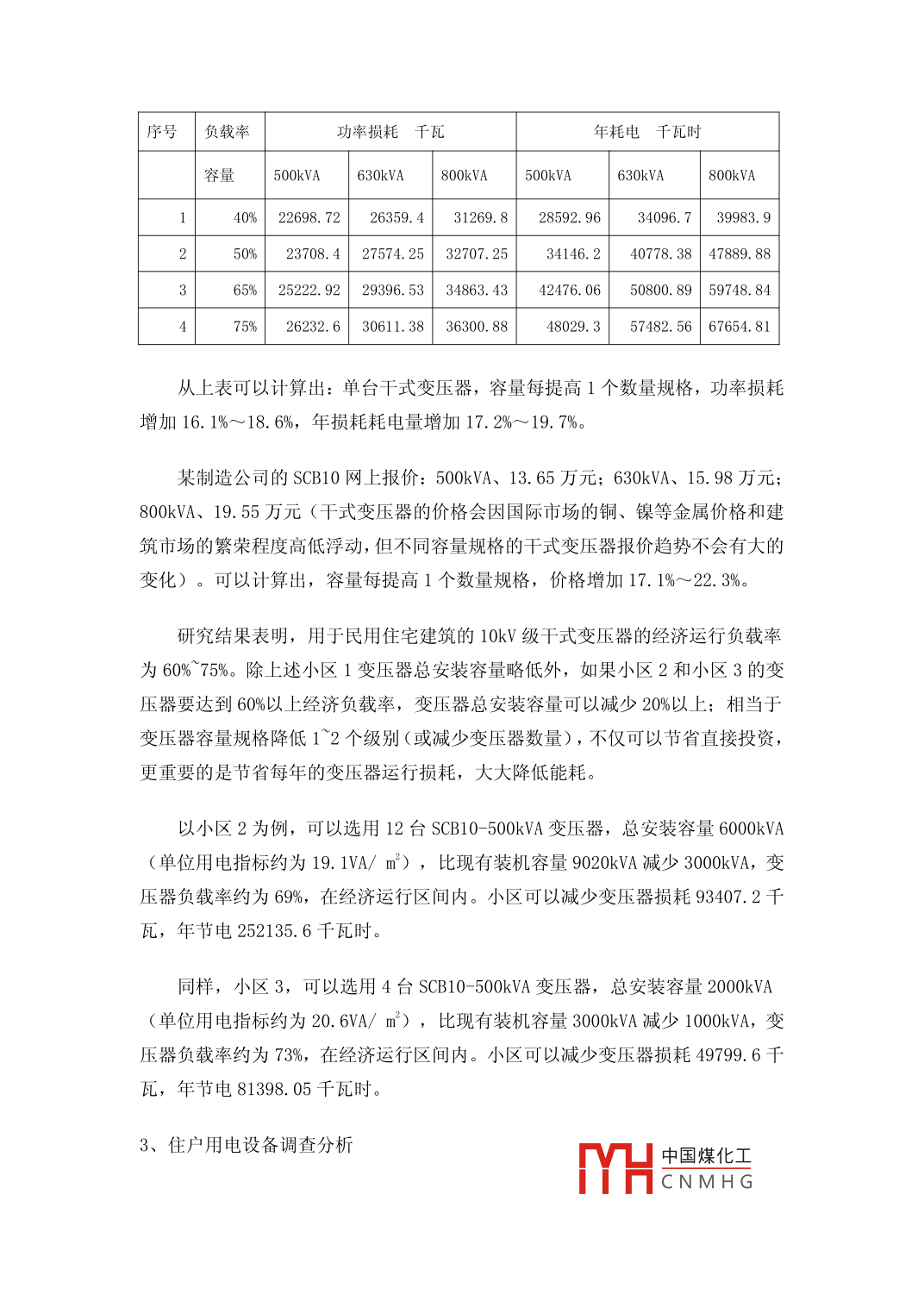 住宅用電與節(jié)能張將重慶大學電氣學院重慶4101331摘要根據(jù)國家節(jié)能政策并結合最新《住宅建筑電氣設計規(guī)范》JGJ242-2011要求,針對一些地區(qū)片面放大住宅用電負荷情況,通過對中原地區(qū)一些典型住宅小區(qū)的用電負荷調(diào)查分析,提出符合實際情況和節(jié)約能源的住宅小區(qū)用電負荷設計選取的建議。關鍵詞住宅用電負荷變壓器負載率節(jié)能中途分類號:S2104文獻標識碼:A文章編號:《住宅建筑電氣設計規(guī)范》JGJ242-2011對不同面積的住宅最低用電負荷作出了明確規(guī)定:“建筑面積《60m,3kw:60m<建筑面積《90m,4kW;90m<建筑面積《150m,6kW;建筑面積>150m,6kW+超出部分(按40~50W/m2計算)。”通過對中原地區(qū)幾個典型規(guī)模小區(qū)實際住戶用電情況的調(diào)査,結合住宅建筑電氣設計標準的發(fā)展史(住宅負荷指標:70年代,2W/m;80年代,10W/m;90年代,10wW/m;2000年后50~60W/m3),談談住宅、住宅小區(qū)用電負荷計算與節(jié)能的關系1、住宅小區(qū)調(diào)查情況小區(qū)1某省會城市單位多層(5-7層,無電梯)住宅小區(qū),為70~80年代興建的住宅小區(qū),總建筑面積約33300m,總戶數(shù)508,小區(qū)入住率95%。住戶用電實際配置標準(按當時的規(guī)范規(guī)定)如下:建筑面積60m以下,202戶,1.5kW,戶內(nèi)配電箱主進斷路器為In=20A,電表5(20)A;60m<建筑面積《90m2,284戶,2kW,戶內(nèi)配電箱主進斷路器為In=25A,電表5(20)A:90m2<建筑面積《150m2,12戶,2.5kW,戶內(nèi)配電箱主進斷路H中國煤化工40)CNMHGA。從變電所到每幢住宅樓有一路~220/380V電源(根據(jù)不同單元數(shù),所用的電纜大小不等),每個單元(18戶)主進斷路器In=100A。住宅變壓器安裝容量630kVA(單位負荷指標約為18.9VA/m),運行20多年,平均負載率在81%左右,高峰時段也無過負荷跳閘事故。若要滿足現(xiàn)行《住宅建筑電氣設計規(guī)范》要求,按照需要系數(shù)法計算,住宅變壓器安裝容量需要2*630kVA,計算負載率在83%。小區(qū)2同上城市某高層住宅小區(qū),為2001-2004年建成的小區(qū),建筑層數(shù)1232層(建筑高度<100m),總建筑面積314290m,其中住宅建筑面積245000m2,總戶數(shù)1463戶,小區(qū)入住率80%左右。戶型比例分別為建筑面積60m以下,360戶,戶內(nèi)配電箱主進斷路器為In=40A,電表10(40)A;60m<建筑面積《90m,862戶,戶內(nèi)配電箱主進斷路器為In=50A,電表15(60)A;90m<建筑面積《150m2,120戶,戶內(nèi)配電箱主進斷路器為In=63A,電表15(60)A;建筑面積》150m2,120戶,戶內(nèi)配路器In=80A電表電箱主進斷20(80)A;建筑面積>150m2,考慮戶式中央空調(diào),戶內(nèi)配路器為三相In=63A,電表電箱主進斷15(60)A(按照建設單位等方面對高檔小區(qū)的要求,每戶用電配置容量分別為單相6kW,8kW,10kW,12kW和三相8kW,另有樓王1戶,建筑面積600m2,按三相12kW配電)。按每且單元分段電纜(每段不超過10層)進線,In=315~400A。住宅變壓器總安裝容量9020kVA(單位負荷指標約為28.7VA/m2),住宅變電所均設置在高層住宅樓地下室,其中容量為630kVA變壓器4臺,容量為500kVA變壓器13臺,設計變壓器負載率為75%。(根據(jù)當?shù)毓╇姴块T的要求,住戶按照38VA/m2計算,變壓器總安裝容量為9310kVA,計算負載率約72.7%。)實際調(diào)查發(fā)現(xiàn),變壓器負載率平均約為35.6%,即使考慮另外20%全部入住,負載率為44.5%,不足50%小區(qū)3中國煤化工CNMHG同上城市西區(qū)的一個多層住宅小區(qū),2006年按照國家“70-90”政策要求建設。小區(qū)共有住戶1092戶,住宅總建筑面積96900平方米,其中90平方米及其以下住宅占75.1%?,F(xiàn)小區(qū)入住率達到85%戶型比例分別為建筑面積60m以下,280戶,用電負荷4kW,戶內(nèi)配電箱主進斷路器為In=32A,電表10(40)A:60m建筑面積《90m2,520戶,用電負荷6kW,戶內(nèi)配電箱主進斷路器為In=40A,電表10(40)A;90m《<建筑面積《150m2,292戶,用電負荷8kW,戶內(nèi)配電箱主進斷路器為In=50A,電表15(60)A。每個單元(12戶)獨立進線,主進斷路器In=100~160A設計住宅變壓器總安裝容量3000A(單位負荷指標約為31.0VA/m2),選用容量為500kVA的箱式變電站6臺,設計變壓器負載率為81%。(住戶按照每平方米0.03VA設計,低于當?shù)毓╇姴块T每平方米0.038VA要求)實際調(diào)查發(fā)現(xiàn),變壓器負載率平均約為35%,即使考慮另外15%全部入住,載率為41.2%,不足表1小區(qū)2和小區(qū)3實際安裝容量統(tǒng)計用電安裝功率(kW)變壓器(kVA)單位「規(guī)格60m60-90m90150150m其它合計630500合計負載率小區(qū)/標準88*3戶/臺數(shù)36012011463170.75合計21606896120014402411720252065009020小區(qū)標準戶/臺數(shù)28052000000a60.81合計1203120120030002、變壓器損耗和成本分析以SCB10系列10kV級無勵磁調(diào)壓干式變壓器為例,500kVA、630kVA和800kVA三種住宅小區(qū)常用規(guī)格的損耗在負荷率40%、50%、65%和75%情況下的綜合功率損耗分析見表2。(本計算的技術參數(shù)參考一家公司10kV級無勵磁調(diào)壓干式變壓器系列產(chǎn)品說明書,計算公式略)表2變壓器損耗分析表中國煤化工CNMHG序號負載率功率損耗千瓦年耗電千瓦時容量500kVA630kVA800kVA500VA40%22698.7226359.431269.828592.9634096.73998950%23708.427574.2532707.2534146.240778.3847889.8865%25222.9229396.5334863.4342476.0650800.8959748.8475%26232.63061.383630.8848029.357482.5667654.81從上表可以計算出:單臺干式變壓器,容量每提高1個數(shù)量規(guī)格,功率損耗增加16.1%~18.6%,年損耗耗電量增加1.2%~19.7%。某制造公司的SCB10網(wǎng)上報價:500kVA