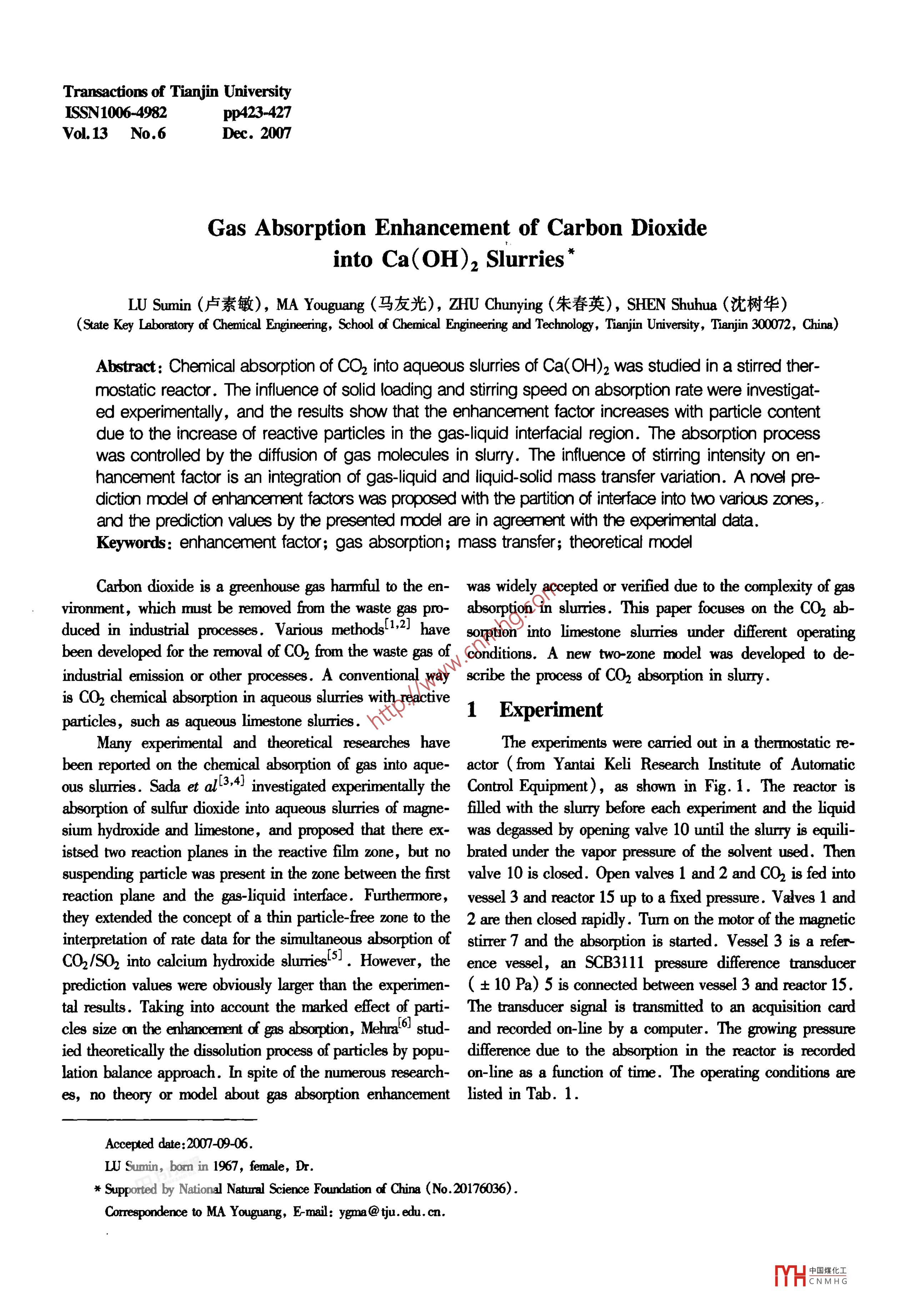 Transactions of Tianjin UniversityISSN10064982VoL 13 No, 6DeC.2007Gas absorption Enhancement of Carbon Dioxideinto Ca(oH), SlurriesLU Sumin(盧素敏), MA Youguang(馬友光), ZHU Chunying(朱春英), ShEN Shuhua(沈樹華)(State Key Laboratory of Chemical Engineering, School of Chemical Engineering and Technology, Tianjin University, Tianjin 300072, China)Abstract: Chemical absorption of CO, into aqueous slurries of Ca(OH)2 was studied in a stirred ther-mostatic reactor. The intluence of solid loading and stirring speed on absorption rate were investigat-ed experimentally, and the results show that the enhancement factor increases with particle contentdue to the increase of reactive particles in the gas-liquid intertacial region. The absorption processs controlled by the diffusion of gas molecules in slurry. The influence of stirring intensity on en-hancement factor is an integration of gas-liquid and liquid-solid mass transfer variation a novel pre-diction model of enhancement factors was proposed with the partition of interface into two variaus zonesand the prediction values by the presented model are in agreement with the experimental dataKeywords: enhancement factor; gas absorption; mass transfer; theoretical modelCarbon dioxide is a greenhouse gas harmful to the en- was widely accepted or verified due to the complexity of gasvironment, which must be removed from the waste gas pro- absorption in slurries. This paper focuses on the COduced in industrial processes. Various methods [1, 2] have sorption into limestone slurries under different operatingbeen developed for the removal of CO2 from the waste gas of conditions. A new two-zone model was developed to de-industrial emission or other processes. A conventional way scribe the process of CO2 absorption in slurryis CO chemical absorption in aqueous slurries with reactive1 Experimentparticles, such as aqueous Iimestone slurriesMany experimental and theoretical researchesThe experiments were carried out in a thermostatic rebeen reported on the chemical absorption of gas into aque- actor( from Yantai Keli Research Institute of Automaticous slurries sadala et al l3, 4]investigated experimentally the Control Equipment), as shown in Fig. 1. The reactor isabsorption of sulfur dioxide into aqueous slurries of magne- filled with the slurry before each experiment and the liquidsium hydroxide and limestone, and proposed that there ex- was degassed by opening valve 10 until the slurry is equiliistsed two reaction planes in the reactive film zone, but no brated under the vapor pressure of the solvent used. Thensuspending particle was present in the zone between the first valve 10 is closed Open valves 1 and 2 and co is fed intoreaction plane and the gas-liquid interface. Furthermore, vessel 3 and reactor 15 up to a fixed pressure. Valves 1 andthey extended the concept of a thin particle-free zone to the 2 are then closed rapidly. Turn on the motor of the magneticinterpretation of rate data for the simultaneous absorption of stirrer 7 and the absorption is started. Vessel 3 is a refCO2/S02 into calcium hydroxide slurries 5. However, the ence vessel, an SCB3111 pressure difference transducerprediction values were obviously larger than the experimen-( 10 Pa)5 is connected between vessel 3 and reactor 15tal results. Taking into account the marked effect of parti- The transducer signal is transmitted to an acquisition cardcles size on the enhancement of gas absoption, Mehra[6l stud- and recorded on-line by a computer. The growing pressureied theoretically the dissolution process of particles by popu- difference due to the absorption in the reactor is recordedlation balance approach. In spite of the numerous research- on-line as a function of time. The operating conditions arees,no theory or model about gas absorption enhancement listed in Tab. 1Accepted date: 2007-09-06LU Sumin, born in 1967 female, DrSupported by National Natural Science Foundation of China(No. 20176036)CorrespondencetoMAYouguang,E-mail:yema@tu.edu.cn中國煤化Transactions of Tianjin University VoL 13 No 6 2007Co and CacO, takes place only within a thin liquidfm7,8](2) The resistance of mass transfer insecanneglected(3)The particles with equalSUSd in the slurry, and completely immersed into the liquid, and the average distance between the gas-liquid interface and the particles can be estimated according to the film1513Bh。12(4) The gas-liquid interface is divided into two zonesuncovered part(Zone I )and covered part( Zone I)asnown In1gnd the ratefor the1-CO2 inlet valve; 2--Junction valve; 3-Balance tank; 4-Preasure trans- covered part is considered to be equal to that in a homogemitter; 5-Preaeure difference transmitter( connected with the computer) 6- neous reaction system without particlesvalve; 10-vacuum valve; 11--Gae stirrer: 12--liquid stirrer; 13--BafileThen the total gas absorption rate through the entire14--Stainleas steel top: 15-Stainleas steel reactor; 16--Thenmostatic bathgas-liquid interfawntten asFig, Ir吧 for gas absorpt(1-∮)naiAITab 1 Experimental conditionsTemperature/t Initial pressure/kPa Gae purity/% Stiring speed/(rs-I)1599.5NATthe influence of the product CaCO3 on theNAgas absorption, the absorption experiments were carried outSolidby the addition of only CaCO3 particles in pure water. FromFig. 2, the influence of CaCO particles on absorption rate(a) sketch map of mass transfer in the gas-liquid boundary layerof CO, is negligible13131.1◆3rb07_4z(b)Concentration profile of A and B in Zone Ilaco, concentration(mase ratio)%ig. 3 Schematic drawing of mass transier and comumtratioig 2 Variation of enhancement factor with Caco, conceaprole cf A and B in Zone HIn terms of the above assumptions, the mass transfer2 Modeling of absorptionrate is calculated individually in the two zones, and mean-time, the mass transfer is assumed to take place only in theFor the chemical absorption process of Co2 into aque- x-direction in each zoneous slurries of Ca(oh )2, the f