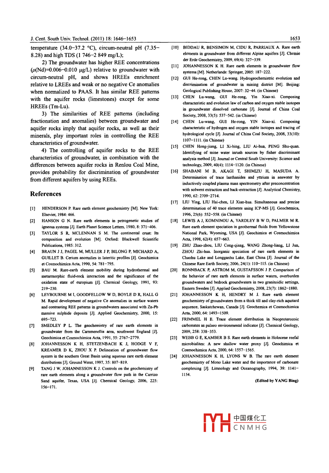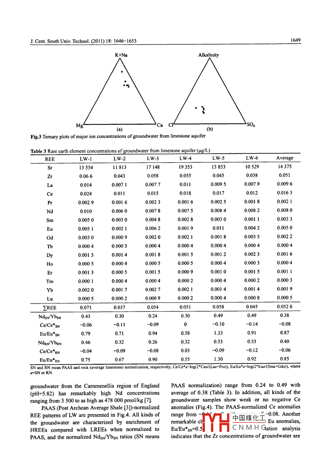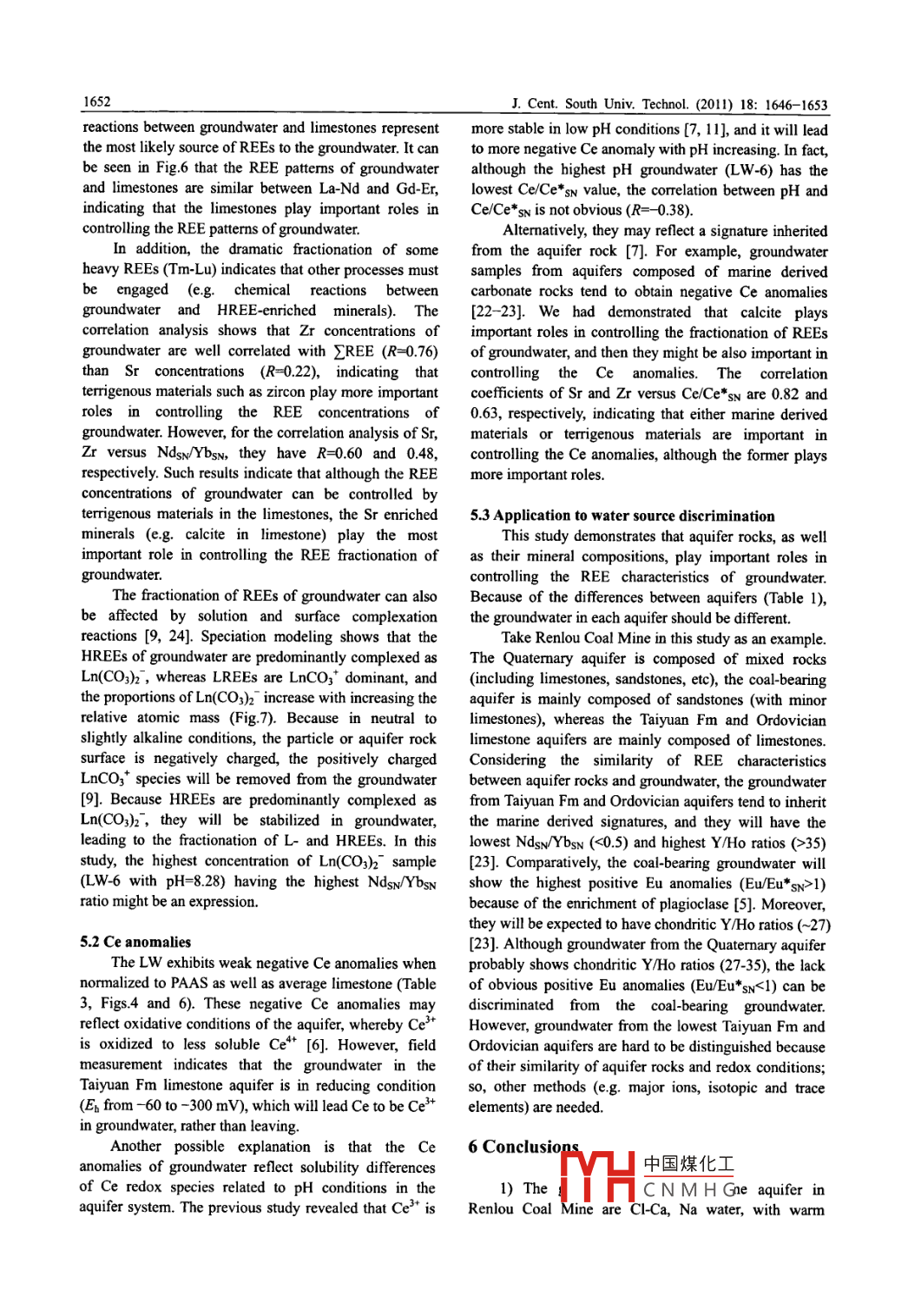 J Cent. South Univ. Technol (2011)18: 1646-1653DOl:10.1007/s11771-011-08842Geochemistry of rare earth elements in groundwater fromdeep seated limestone aquifer in Renlou Coal Mine, Anhui Province, ChinaSUN Lin-hua(孫林華), GUI He-rong(桂和榮), CHEN LU-wang陳陸望), CHEN Song(陳松School of Earth Sciences and Engineering, Suzhou University, Suzhou 234000, China;2. School of Resources and Environmental Engineering, Hefei University of Technology, Hefei 230009, Chinao Central South University Press and Springer-Verlag Berlin Heidelberg 2011Abstract: Rare earth element(REE) concentrations were measured by ICP-Ms for groundwater collected from deep seated TaiyuanFm limestone aquifer(from -400 to -530 m)in Renlou Coal Mine, northern Anhui Province, China. It can be concluded that thegroundwater is warm (340-372C)Cl-Ca, Na type water with circum-neutral pH(7. 35-8.28)and high total dissolved solids(TDs1 746-2 849 mg/L). The groundwater exhibits heavy REEs enrichment relative to light REEs compared with Post Archean AverageShale(Paas), as well as their aquifer rocks(limestone). The enrichment of REEs is considered to be controlled by terrigeneousmaterials(e. g. zircon) in aquifer rocks, whereas the fractionation of REEs is controlled by marine derived materials( e.g. calcite), to aless extent, terrigeneous materials and inorganic complexation. The Ce anomalies normalized to PaAs and aquifer rocks are weak,which probably reflects the signature of the aquifer rock rather than redox conditions or pH. The similarities of rEe patterns betweengroundwater and aquifer rocks imply that aquifer rocks play important roles in controlling the ree characteristics of groundwateand then provide a probability for discrimination of groundwater sources by using rEEsKey words: rare earth elements; geochemistry; water-rock interaction; limestone aquifer; groundwaterthe similarity between groundwater and aquifer rockI IntroductionREE patterns. Indeed, many groundwater samplesexhibit REE pattems that closely resemble the REEBecause of their unique characteristics [1], rare patterns of the rocks through which they flow. However,earth elements(REEs)were highly interested by many for some of the groundwater samples, they have highlygeologists and thus had been used in studying many fractionated REE patterms compared with the aquifergeological processes: magma generation, crustal rocks [11]evolution, weathering process, provenance ofThe deep coal mining in northern Anhui Province,sedimentation and water-rock interactions etc [2-6]. China, provides us opportunities to trace REEHowever, for the ree study of water systems, much characteristics of groundwater in deep seatedattention had been paid towards the surface water environment. Additionally, because the discrimination ofgeochemistry of REEs, with less study focused on REEs water source is important in the safety of coal minein groundwater systems although the number of such production, a series of studies based on major ions,investigations is increasing [7-11. Especially, because isotopic and trace elements had been published inof the difficulty of sampling, the similar work related to previous literatures [12-15]. Heoweverthe methodthe deep seated environment is still far from related to REEs had not been reported yet, which mightunderstanding.be useful in water source discrimination because of 1)The previous work revealed that REE abundances the relative stability of REEs during water-rockand their characteristics (Ce and Eu anomalies, interactions, 2)the similarity of ree patterns betweenfractionation of light and heavy REEs etc)in groundwater and aquifer rock, and 3)different rockgroundwater systems were mainly controlled by the compositions of the aquifersrocks through which they flowed over, pH, redoxIn this work, the preliminary results of reeconditions, solution chemistry, organic and/or inorganic concentrations, distribution patterns, as well as inorganiccomplexation, colloidal and particulate matter transport speciation modelling of the groundwater from limestone[9]. The most significant finding among these studiesaquifer (LW)d between -400 and -530 m in中國煤化工Foundation item: Project(40873015)supported by the NaNatural Science Foundation ofFive- year Scientific and Technologcal Program of Anhui Province, ChinaCNMHGed by the EleventhReceived date: 2010-07-28: Accepted date: 2010-11-26CorrespondingauthorSunLin-hua,Phd;Tel:+86-557-2871038;E-mail:sunlinh@126.comJ. Cent. South Univ. Technol. (2011)18: 1646-16531647Renlou Coal Mine Anhui Province, China, are reported, aquifer, the Coal bearing aquiferand the controlling factors for the REE concentration, previous study [12]),the Taiyuanmaquifer in thefractionation and Ce anomaly are discussed based on the Ordovician limestone aquifer. The characteristics of eachcomparison of REEs of groundwater, average shale and aquifer synthesized according to the previous work [12]aquifer rocks. It will provide additional information are listed in Table 1. Hydrodynamic conditions of theseabout the water-rock interactions in deep seated four aquifers are different based on carbon and oxygenenvironment,and provide new information for water isotopic study [13]. Due to shallow depth and coalsource discrimination by using REEsmining, Quatemary aquifer is an"open"system; Coalbearing aquifer is relatively "closed"with only small2 Hydrogeological settingamount of groundwater in it, which can be recharged bythe upper Quaternary and lower Taiyuan Fm AquiferThe Renlou Coal Mine is located southwest to ( Fig. 2); the limestone aquifers(including Taiyuan FmSuzhou City, northern Anhui Province, China(Fig. 1), and the Ordovician limestone aquifer)are also closedwhich belongs to the northeastern part of the Huaibei systems, whereas the groundwater in them flows quicklymining area. The Renlou Coal Mine is separated by thenorth Jiegou Fault and south Xuting Fault from Suntuan 3 Methodsand Xutuan coal mines in north and south, re