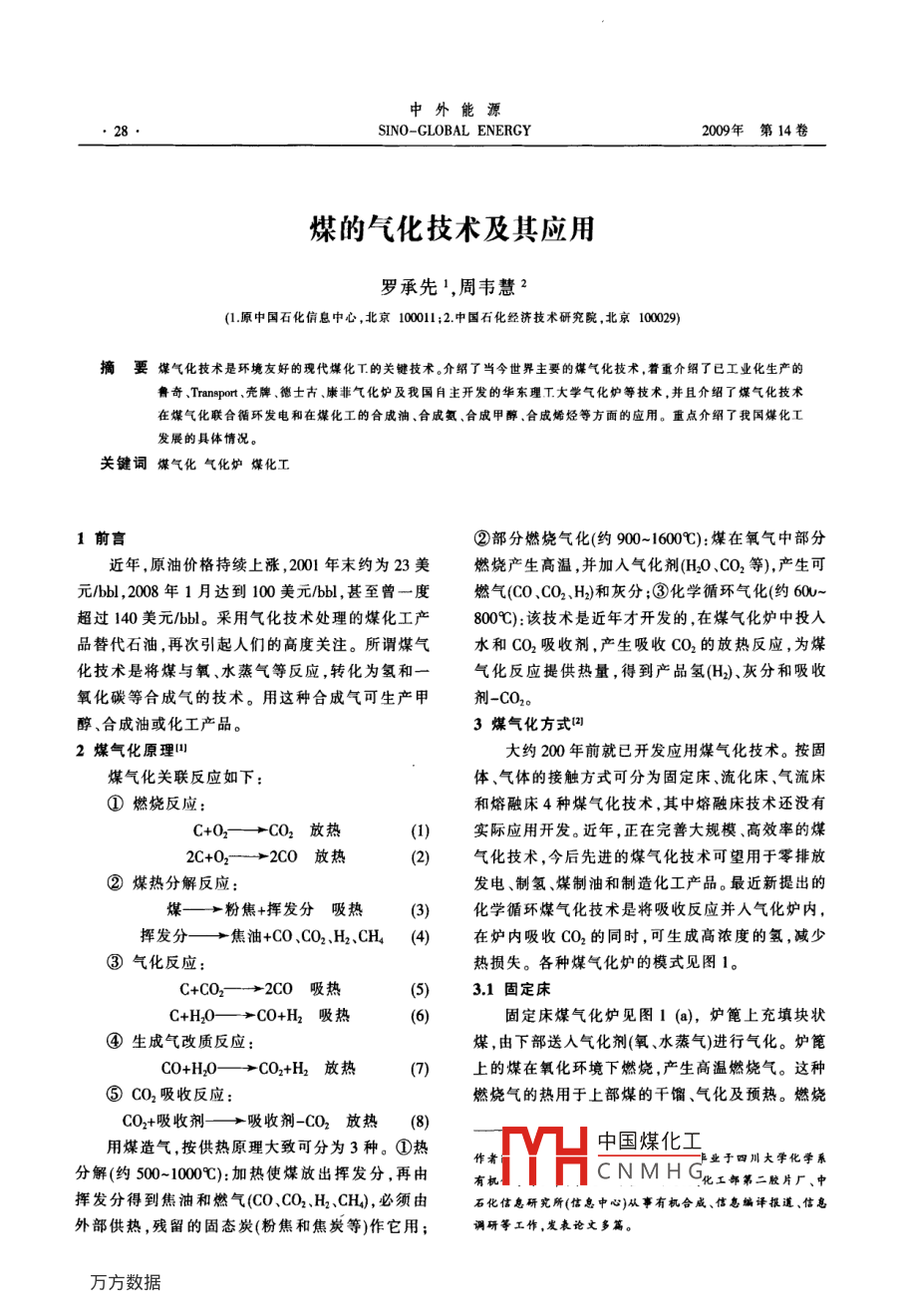 中外能源SINO-GLOBAL ENERGY2009年第14卷煤的氣化技術(shù)及其應(yīng)用羅承先1,周韋慧2(1.原中國(guó)石化信息中心,北京10011;2.中國(guó)石化經(jīng)濟(jì)技術(shù)研究院,北京10009)摘要煤氣化技術(shù)是環(huán)境友好的現(xiàn)代煤化工的關(guān)鍵技術(shù)。介紹了當(dāng)今世界主要的煤氣化技術(shù),著重介紹了已工業(yè)化生產(chǎn)的魯奇、 Transport、殼牌、德士古、康非氣化爐及我國(guó)自主開發(fā)的華東理工大學(xué)氣化爐等技術(shù),并且介紹了煤氣化技術(shù)在煤氣化聯(lián)合循環(huán)發(fā)電和在煤化工的合成油、合成氨、合成甲醇、合成烯烴等方面的應(yīng)用。重點(diǎn)介紹了我聞煤化工發(fā)展的具體情況關(guān)鍵詞煤氣化氣化爐煤化工1前言②部分燃燒氣化(約900~1600℃):煤在氧氣中部分近年,原油價(jià)格持續(xù)上漲,2001年末約為23美燃燒產(chǎn)生高溫,并加入氣化劑(HO、CO2等),產(chǎn)生可元/bl,2008年1月達(dá)到100美元/hbl,甚至曾一度燃?xì)釩O、CO2、H2)和灰分;③化學(xué)循環(huán)氣化(約60超過140美元/bl。采用氣化技術(shù)處理的煤化工產(chǎn)800℃):該技術(shù)是近年才開發(fā)的,在煤氣化爐中投入品替代石油,再次引起人們的高度關(guān)注。所謂煤氣水和CO2吸收劑,產(chǎn)生吸收CO2的放熱反應(yīng),為煤化技術(shù)是將煤與氧、水蒸氣等反應(yīng),轉(zhuǎn)化為氫和氣化反應(yīng)提供熱量,得到產(chǎn)品氫(H)灰分和吸收氧化碳等合成氣的技術(shù)。用這種合成氣可生產(chǎn)甲劑-CO2醇、合成油或化工產(chǎn)品。3煤氣化方式12煤氣化原理山大約200年前就已開發(fā)應(yīng)用煤氣化技術(shù)。按固煤氣化關(guān)聯(lián)反應(yīng)如下:體、氣體的接觸方式可分為固定床、流化床、氣流床①燃燒反應(yīng):和熔融床4種煤氣化技術(shù),其中熔融床技術(shù)還沒有C+O2→CO2放熱實(shí)際應(yīng)用開發(fā)。近年,正在完善大規(guī)模、高效率的煤2C+O22CO放熱氣化技術(shù),今后先進(jìn)的煤氣化技術(shù)可望用于零排放煤熱分解反應(yīng)發(fā)電、制氫、煤制油和制造化工產(chǎn)品。最近新提出的煤—·粉焦+揮發(fā)分吸熱(3)化學(xué)循環(huán)煤氣化技術(shù)是將吸收反應(yīng)并入氣化爐內(nèi),揮發(fā)分—焦油+CO、CO2、H2CH4(4)在爐內(nèi)吸收CO2的同時(shí),可生成高濃度的氫,減少氣化反應(yīng)熱損失。各種煤氣化爐的模式見圖1。C+CO2>2C0吸熱(5)3.1固定床C+H2O>CO+H2吸熱固定床煤氣化爐見圖1(a),爐篦上充填塊狀④生成氣改質(zhì)反應(yīng)煤,由下部送入氣化劑(氧、水蒸氣)進(jìn)行氣化。爐篦CO+H2O—CO2+H2放熱刀)上的煤在氧化環(huán)境下燃燒,產(chǎn)生高溫燃燒氣。這種⑤CO2吸收反應(yīng)燃燒氣的熱用于上部煤的干餾、氣化及預(yù)熱。燃燒CO2+吸收劑—吸收劑-CO2放熱(8)用煤造氣,按供熱原理大致可分為3種。①熱中國(guó)煤化工業(yè)于四川大學(xué)化學(xué)系分解(約500-1000℃):加熱使煤放出揮發(fā)分,再由CNMH化工部第二膠片廠、中揮發(fā)分得到焦油和燃?xì)?CO、CO2H2、CH),必須由石化信息研究所(信息中心)從事有機(jī)合威、信息編譯報(bào)道、信惠外部供熱,殘留的固態(tài)炭(粉焦和焦炭等)作它用;調(diào)研等工作,發(fā)第1期羅承先等,煤的氣化技術(shù)及其應(yīng)用狀態(tài)的溫度為1200-1400℃C,但上部在1000℃以下安裝了氣化劑噴嘴,由這里噴入氧和水蒸氣,形成成為還原環(huán)境,進(jìn)行氣化。煤中的灰分通過爐篦落高溫區(qū),熔融狀爐渣經(jīng)排料孔下降,使粉焦高溫氣入爐底移出爐外。煤通過各反應(yīng)區(qū)域,逐步被氣化,化。該爐型為BGC-魯奇氣化爐(BGC:英國(guó)氣體公氣化顯熱用于干燥和熱分解,因此,氣化的冷氣效司),爐內(nèi)最高溫度1500℃以上,合成氣組成為:H2率[(生成氣的熱值供應(yīng)煤的熱值)×10%高,但單30%、C060%左右,與氣流床氣化爐的合成氣組成位容積的煤處理量小,大型化困難。目前,運(yùn)轉(zhuǎn)中的大體相同。熔融狀爐渣也與氣流床氣化爐的情況固定床氣化爐主要有魯奇氣化爐和BGC-魯奇爐。樣,落入爐底水槽,被造粒排出。德國(guó) SVZ Schwarze煤氣煤氣煤氣煤氣Pumpe公司已將這種爐型應(yīng)用于各種廢棄物氣化的商業(yè)化裝置。水蒸氣煤閘循環(huán)焦油水蒸氣水旋轉(zhuǎn)分配器灰分水洗冷卻水蒸氣水蒸氣·氧水蒸氣·氧灰分灰分灰分(a)固定床(b)流化床(c)氣流床d)熔融旋轉(zhuǎn)爐篦圖1各種煤氣化爐模式圖水冷卻3.1.1魯奇氣化爐固定床中魯奇氣化爐(結(jié)構(gòu)如圖2所示)實(shí)績(jī)最水蒸氣+O2灰閘好,目前,商業(yè)爐還在運(yùn)轉(zhuǎn)中。一定大小的煤塊通過閘斗進(jìn)入爐的頂部,沿反應(yīng)床向下移動(dòng),經(jīng)旋轉(zhuǎn)分配器分散后,依次經(jīng)干燥區(qū)、干餾區(qū)、氣化區(qū)和燃燒區(qū)。爐內(nèi)的煤被旋轉(zhuǎn)爐篦支撐,由其下向爐內(nèi)吹入圖2魯奇氣化爐結(jié)構(gòu)氣化劑(氧、水蒸氣)。通過氣化區(qū)的粉焦在燃燒區(qū)燃燒產(chǎn)生的爐灰,經(jīng)旋轉(zhuǎn)爐篦落入灰閘排出。爐內(nèi)燃閘斗燒區(qū)的溫度最高,超過1000℃,為了避免爐灰熔融,溫度不能太高。生成氣的溫度500~600℃,合成氣組生成氣分配器成為:H240%、C020%、CO230%、CH410%。魯奇水蒸氣,氧水蒸氣,氧商業(yè)爐大多較小,除用于生產(chǎn)城市燃?xì)馔?還用于生產(chǎn)