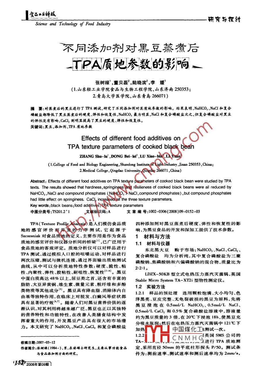 金品業(yè)科技研究與探討Saience and Techology of Food Industry不同添加劑對黑豆蒸煮后-TPA質(zhì)地參數(shù)的影響r張樹祿' ,董貝磊”,陸曉濱,李媛'(1.山東輕工業(yè)學(xué)院食品與生物工程學(xué)院,山東濟南250353;2.青島大學(xué)醫(yī)學(xué)院,山東青島266071)摘要:對蒸煮后的 黑豆進行了TPA測試,研究了不同添加劑對其質(zhì)地參數(shù)的影響。結(jié)果表明,NaHCO,、NaCl和復(fù)合磷酸鹽都降低了黑豆蒸煮后的硬度、彈性和恢復(fù)性,NaHCO,最為明顯,NaCl和復(fù)合磷酸鹽次之,但復(fù)合磷酸鹽對黑豆的彈性沒有影響,CaCl2則明顯提高了黑豆的硬度、彈性和恢復(fù)性。關(guān)鍵詞:黑豆,添加劑,TPA質(zhì)地參數(shù)Effects of different food aditives onTPA texture parameters of cooked black beanZHANG Shu-lu' ,DONG Bei-lei? ,LU Xiao- bin' ,LI Yuan'(1.College of Food and Biology Enginering,Shandong Institute of Light Industry ,Jinan 250353 ,China;2.Medical College ,Qingdao University ,Qingdao 266071 ,China)Abstract: Effects of different food additives on TPA texture parameters of cooked black bean were studied by TPAtexts. The results showed that hardness , springiness and resilieness of cooked black beans were all reduced byNaHCO, ,NaCi and compound phosphates (NaHCO, > NaCl,compound phosphates) ,but compound phosphateshad lite effect on springiness. CaCl increased all the three texture parameters.Key words :black beans;food additives; TPA texture parameters中圖分類號:TS201.2*1文獻標(biāo)識碼:A文章編號:1002-0306(2008 )09 -0152-03TPA( Texture Profile Analysis)是人們模仿食品質(zhì)四種添加劑對黑豆蒸煮后硬度、彈性和恢復(fù)性的影地的感官評價而開發(fā)的力學(xué)測試,它起源于響,為黑豆食品的開發(fā)和深加工提供了技術(shù)參數(shù)。Suczesniak對食品質(zhì)地的定義,主要作用是作為食品材料與方法質(zhì)地的感官評價和儀器分析間的橋梁",已廣泛用于1.1 材料與儀器食品質(zhì)地的客觀評定。質(zhì)地分析儀可以對樣品進行東北黑大豆購于市場;NaHCO,、NaCl、CaCl,、TPA測試,通過模擬人口腔的咀嚼運動,對樣品進行復(fù)合磷酸鹽均為分 析純,其中復(fù)合磷酸鹽為三驟兩次壓縮,測試與微機連接,通過界面輸出質(zhì)地測試磷酸鈉、焦磷酸鈉和六偏磷酸鈉的混合物,質(zhì)量比為曲線,從中可以分析質(zhì)地特性參數(shù):硬度、脆性、粘2:2:1。性、內(nèi)聚性.彈性、膠粘性、耐咀性、恢復(fù)性1'-4。黑豆LDZX- 50KB型立式電熱壓力蒸汽滅菌鍋,英國中蛋白質(zhì)高達48%以上,居豆類之首,還含有豐富的Stable Micro System TA-XT2i型物性測定儀。脂肪、大豆異黃銅、維生素、微量元素、粗纖維和多酚1.2 實驗方法類物質(zhì)等其他成分'。黑豆具有降血脂、消除體內(nèi)自1.2.1樣品的預(yù)處理 選 用顆粒飽滿大小均勻、色由基等獨特作用,在臨床上對脫發(fā)、白癜風(fēng)等癥狀都澤黑亮.豆皮完整.無龜裂破損的黑豆為原料,先將具有顯著的療效(。71。隨著人們對黑豆?fàn)I養(yǎng)價值的逐黑豆浸泡在0.5mol/L NaHCO3 0.5moL/L NaCl、漸認識,對其利用將越來越廣泛,黑豆也正以其獨特0.5moVLCaCl,和0.5%復(fù)合磷酸鹽溶液中,溶液量的營養(yǎng)特性和功能特性,在改善人類膳食結(jié)構(gòu)中發(fā)約為黑豆質(zhì)量的3倍,在20下浸泡18h,使黑豆充.揮著重大的作用,開發(fā)黑豆產(chǎn)品具有很大的市場潛分吸水脹潤;然后在電熱壓力蒸汽滅菌鍋中1219C下力。本文研究了NaHCO,、NaCl、CaCl2和復(fù)合磷酸鹽加熱中國煤化工!測試-一次。1.2.2英國SMS公司的收稿日期:2007-03-12TA-YHCNM.H進行TPA質(zhì)地測作者簡介:張樹祿(1984-),男,在讀碩士研究生。主要從事功能食品定,采用直徑50mm的平底柱形探頭P/50。測試條與食品添加劑方西的研究。件為:測前速率、測試速率和測后速率均為2mm/s,1522008年第09期)食品業(yè)種技|研究與探討Vol. 29,No.09,2008壓縮程度為40%,停留間隔5s,數(shù)據(jù)采集速率酸鹽與空白組相比,對黑豆的彈性沒有影響;CaCl2200pps ,觸發(fā)值5g,每項測試重復(fù)5次。黑豆典型的則較好地維持了黑豆的彈性,即使蒸煮120min后,TPA測試圖譜如圖1。黑豆的硬度仍為0.888 ,與未蒸煮前相當(dāng)。崢值20山0.8第0.6復(fù)個磷酸鹽40↓.,面積10.。00.2面積20 20406080100120140-10長廈門長廈之時間(min)時間(s)圖3不同添加劑對蒸煮后黑豆彈性的影響圖1 蒸煮后黑豆TPA測試的壓力- -時間圖硬度是樣品達到一-定變形時所必須的力,硬度2.3不同添加劑對蒸煮后黑豆恢復(fù)性的影響值指第一次穿沖樣品時的壓力峰值1;彈性是變形樣從圖4可以看出,與對照組相比,添加NaHCO,.品在去除變形力后恢復(fù)到變形前的條件下的高度或NaCl和復(fù)合磷酸鹽都降低了黑豆的恢復(fù)性,而CaCl2體積比率,彈性值是第二次穿沖的測量高度同第一顯著提高了其恢復(fù)性。NaHCO,降低黑豆恢復(fù)性最次測量的高度的比值(長度2/長度1);恢復(fù)性是指為顯著,蒸煮20min,黑豆的恢復(fù)性就迅速下降到變形樣品在與導(dǎo)致變形同樣的速度、壓力條件下恢0.09 ,并在此后的蒸煮過程中停留在0.05-0.1之間。復(fù)的程度,恢復(fù)性值用第一次穿刺中的“回收”階段NaCl和復(fù)合磷酸鹽雖然都降低了黑豆的恢復(fù)性,兩的面積同下壓穿剌階段面積的商(面積2/面積1)者對黑豆恢復(fù)性的影響,特別是在蒸煮30min以后,有著驚人的同步相似性.在蒸煮30min時,兩組黑豆表示。的恢復(fù)性都下降到0.15;在30~120min內(nèi)?;謴?fù)