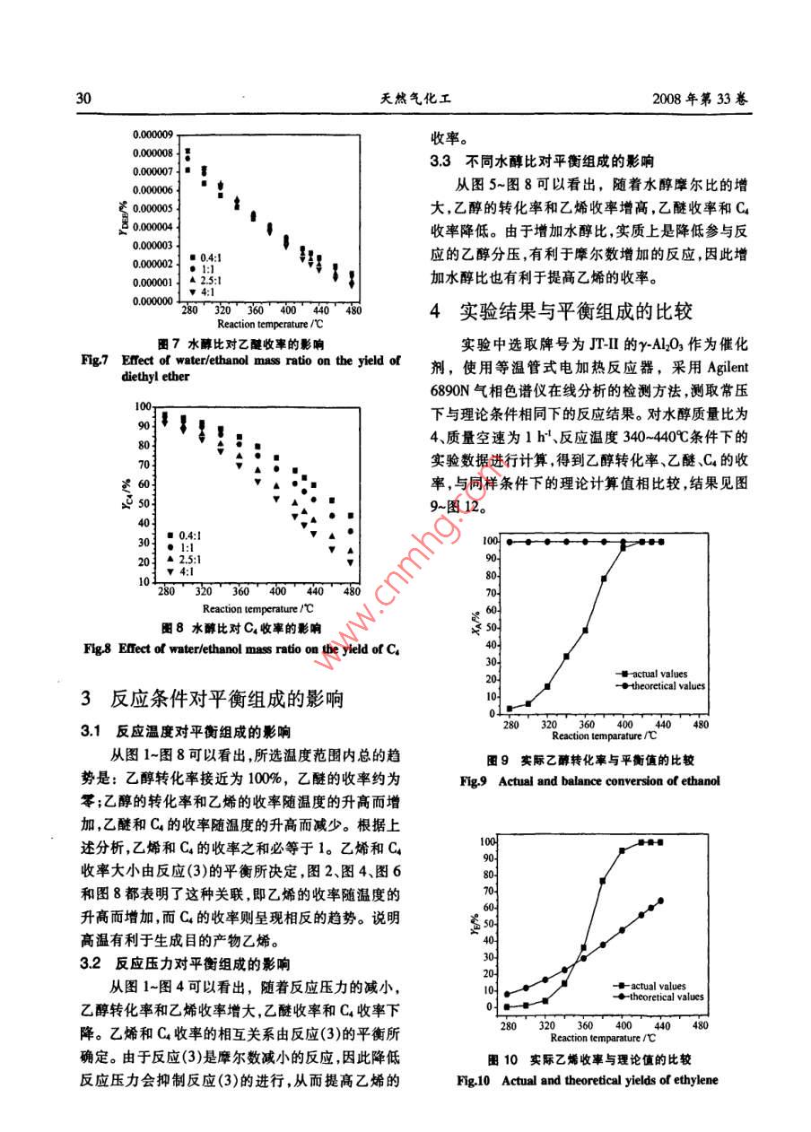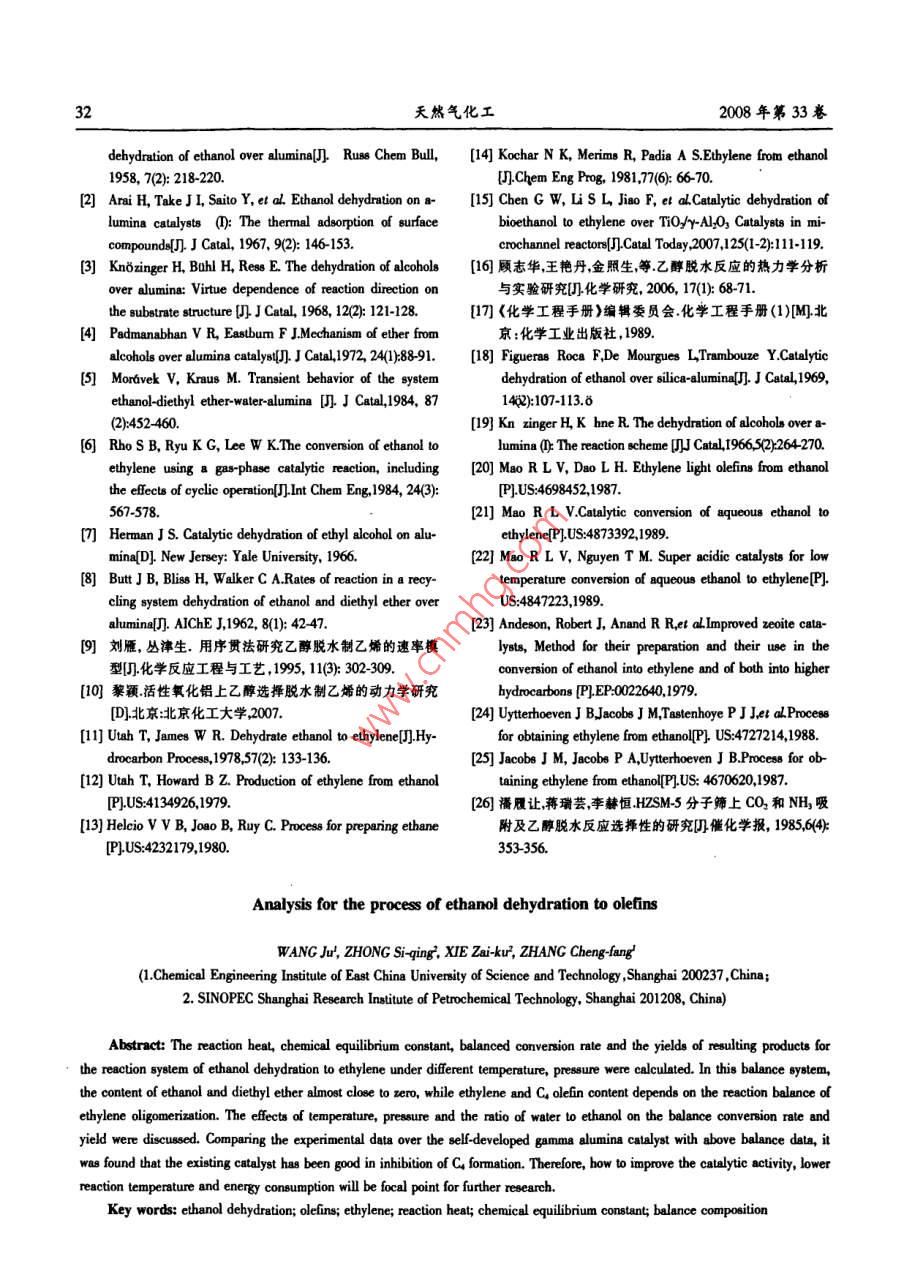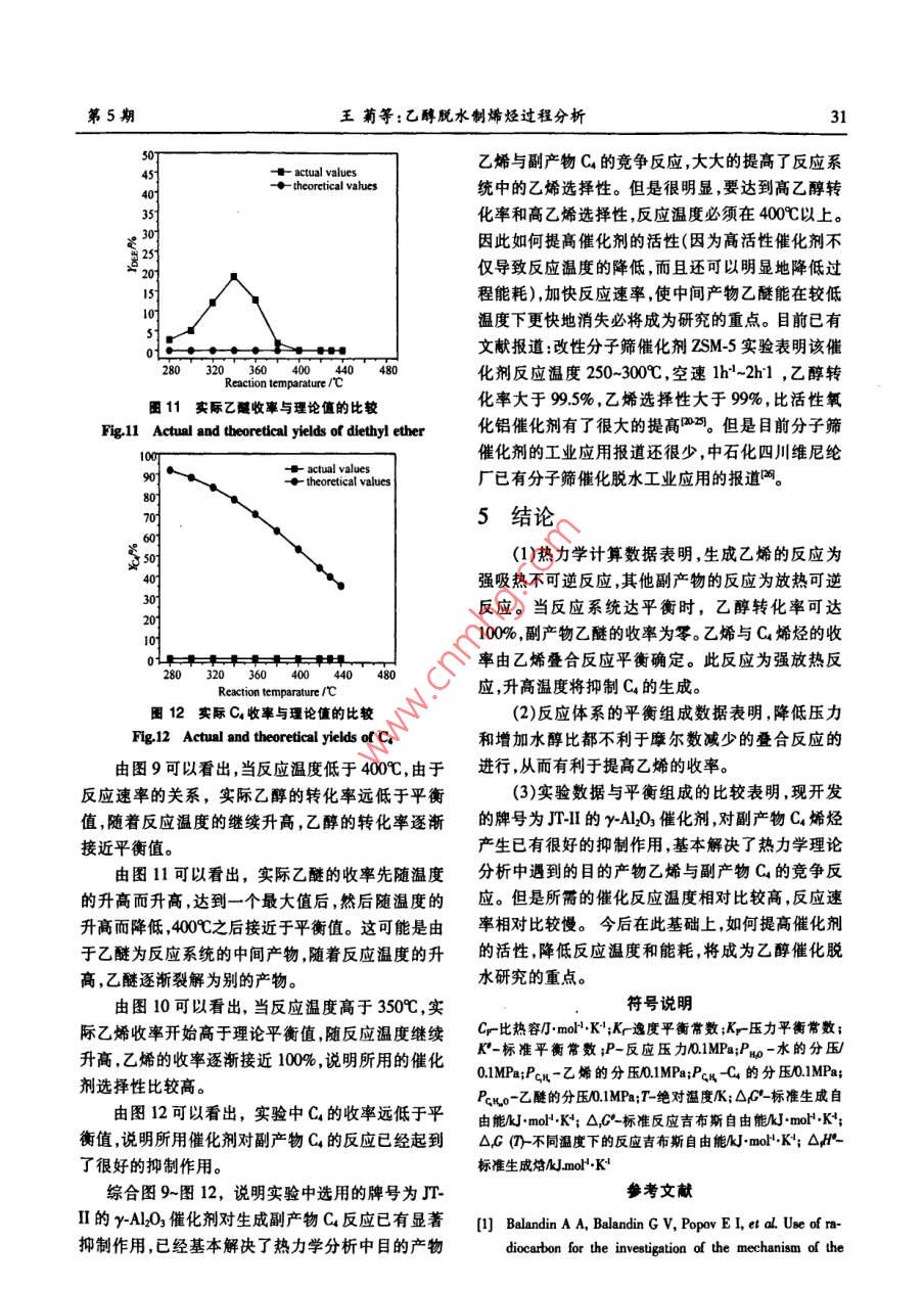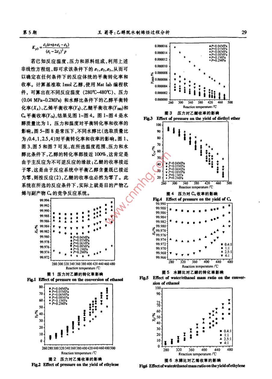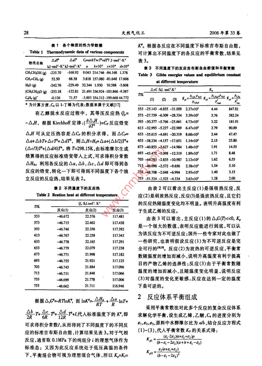 第5期王菊等:乙醇脫水制烯烴過程分析27乙醇脫水制烯烴過程分析王菊',鐘思青2,謝在庫",張成芳1(1.華東理工大學化工學院,上海200237;2.中國石油化工股份有限公司上海石油化工研究院,上海201208)摘要:針對乙醇脫水制乙烯的反應(yīng),計算了不同溫度、壓力下的反應(yīng)熱、化學平衡常數(shù)和系統(tǒng)中各組分的平衡轉(zhuǎn)化率和收率。在此平衡體系中,乙醇和乙醚的含量幾乎接近于零,而乙烯和C4烯烴的含量取決于乙烯疊合反應(yīng)的平衡。隨之,討論了溫度、壓力和水醇比對平衡轉(zhuǎn)化率和收率的影響。并將上述平衡數(shù)據(jù)與以自主研發(fā)的r-AL2O,為催化劑的實驗數(shù)據(jù)相比較,得出現(xiàn)有催化劑已具有良好的抑制生成C烯烴作用。因此,如何提高催化劑的活性,降低反應(yīng)溫度和進程能耗將成為進一步的研究重點。關(guān)鍵誦:乙醇脫水;烯烴;乙烯;反應(yīng)熱;平衡常數(shù);平衡組成中團分類號:0642.1 TQ643.32文獻標識碼:A文章編號1001-919(2008)05-27-0620世紀40年代之前,世界上幾乎所有的乙烯從國內(nèi)外的最新報告資料來看,目前的研究和都是從乙醇脫水生產(chǎn)的,后來隨著石油化工的大力發(fā)展工作主要集中在催化劑的研制和工藝研究兩發(fā)展,大量廉價石油促使烴類熱裂解生產(chǎn)的乙烯,大方面,其中催化劑較為活躍。但是針對乙醇脫水以其經(jīng)濟.上的優(yōu)勢取代了乙醇脫水法生產(chǎn)乙烯。到的反應(yīng)體系的熱力學研究的文獻很罕見,而且體系了70年代,由于石油價格的猛漲,以廉價石油為基熱力學研究又是上述研究的基礎(chǔ),因此對反應(yīng)體系礎(chǔ)發(fā)展起來的乙烯生產(chǎn)受到了很大的沖擊,加之最的熱力學研究將成為首要任務(wù)。上海石油化工研究近這十年來的石油資源的日益短缺和其價格飛速院呵僅研究了單一反應(yīng)的平衡常數(shù),沒有研究反應(yīng)上漲,因此乙醇脫水制取乙烯的路線又重新引起了系統(tǒng)的平衡組成。本文研究了乙醇脫水反應(yīng)的系統(tǒng)大家的興趣。熱力學,考察了溫度,壓力,水醇比對乙醇平衡轉(zhuǎn)化其實早在13世紀,人們就知道用乙醇催化脫率,產(chǎn)物乙烯和Cs的平衡收率的影響,并與實驗結(jié)水可制取乙烯,1797年4位荷蘭化學家發(fā)現(xiàn)了果進行比較,為反應(yīng)過程的研究和催化劑的開發(fā)提Al2O3對乙醇脫水有催化作用。其后,人們對乙醇脫供一定的依據(jù)。水反應(yīng)機理"呵、動力學[.0、催化劑和工藝叫明進行了1乙醇脫水反應(yīng)的熱效應(yīng)和平衡常大量的研究。但對具體反應(yīng)過程,由于所用的催化劑的物理性質(zhì)和化學性質(zhì)的不同,因此對機理和動數(shù)力學研究就很難達成- -致。目前已報告的乙醇脫水在y-Al2O3催化劑的作用下,反應(yīng)體系主要生催化劑有:活性氧化鋁、分子篩、TiO-SiO2、氧化鎂、成乙烯乙醚和C(其中大部分是烯烴)。由于丙烯和氧化錳、氧化鈷、氧化鉻、亞磷酸鋯、鎢酸銀等呵,但乙醛的含量很低,為簡化反應(yīng)體系,忽略生成的丙有工業(yè)應(yīng)用報道的乙醇脫水催化劑主要分為兩大烯和乙醛,只考慮乙醚和C副產(chǎn)物。因此,選擇下類,即活性氧化鋁和分子篩催化劑。自乙醇脫水制面的3個反應(yīng)為乙醇脫水制烯烴的獨立反應(yīng):乙烯開始工業(yè)化生產(chǎn)以來,從乙烯生產(chǎn)的工藝技術(shù)CH,CH.0H- +CH.=CH2+H2O(1來看,在上世紀40年代前后,主要是發(fā)展了等溫列2CH,CH0H→CH,CH2OCH,CH,+H2O(2管式反應(yīng)的脫水工藝。70年代開始轉(zhuǎn)向較先進的固2CH=CH2- +CH2=CHCHCH,(3定床絕熱反應(yīng)工藝和流化床反應(yīng)工藝。根據(jù)各種物質(zhì)的熱力學參數(shù)(見表1),可計算出其各自在不同溫度下的反應(yīng)熱(見表2)、吉布斯自由能值和以分壓表示的平衡常數(shù)(見表3)。收稿日期:2008-03-03;作者簡介:王菊(1979-),女,碩士生,電郵alice919909@163.com;*聯(lián)系人:電話021-64252686.28天然氣化工2008年第33卷表1各個物質(zhì)的熱力學數(shù)據(jù)K°。根據(jù)各反應(yīng)在不同溫度下標準吉布斯自由能,Table 1 Tbermodynamic data of various components可計算出不同溫度下的各反應(yīng)的平衡常數(shù),結(jié)果見物質(zhì)名稱OdFP OG' Cp =a+bT+eP+dT1.mol".K*'表3。kJ.mol*.Kt mol*-Kt a bx10* cx10* dx10*表3不同溫度下的反應(yīng)吉布斯自由能值和平衡常數(shù)CH,CH2OH( -235.70 -168.92 9.043 214.746 -84.168 1.378Table 3 Gibbs energies values and equilibrium constantCH=CH2(@52.5068.38 3.818 157.080 -81.648 17.606at diterent temperatureH2O (g)-242.76229.49 32344 1.930 10.588 -3.608OrG AJ. mol.K+K,(CHCH)0g -253.18122.81 21.491 336.924 -103.866 -9.387TrK^H (g)"-0.12671.57 -3.003 354.312 199.668 4.772(1)2) (3) Kn=-Ppre K,=5*為計算方便,C以1-丁烯為代表;數(shù)據(jù)來源于文獻[17]553 -25.143 -6.855 -31.009 2.37x1024.44847.81在乙醇脫水反應(yīng)過程中,其等壓反應(yīng)熱Q,=573 -27.759 -6.309 -28.334 3.39x1023.76382.24-OH,根據(jù)Kirhhf定律:(3H -)=Cp反應(yīng)焙變593 -30.377 -5.766 -25.661 4.73x1023.22181.91613 -32.995 -5.2272 -22.989 6.47x1022.7990.89△.H可從定壓熱容差OCp的積分求得,而OCp=633 -35.615 4.691 -20.319 8.68x1022.4447.47△a+ ObT+ OcT+ Od7,則O,H=Ho+ Oa+(Ob/2)7&+653 -38.234 4.157 -17.651 1.14x102.1525.80(Oc/3)T*+(Od/4)T。將T=298.15K,由標準摩爾生成673 -40.8533 -3.627 -14.984 1.48x101.9114.55焓算得的反應(yīng)標準焓變帶人上式,可求得積分常數(shù)693 - 43.472 -3.098 -12.319