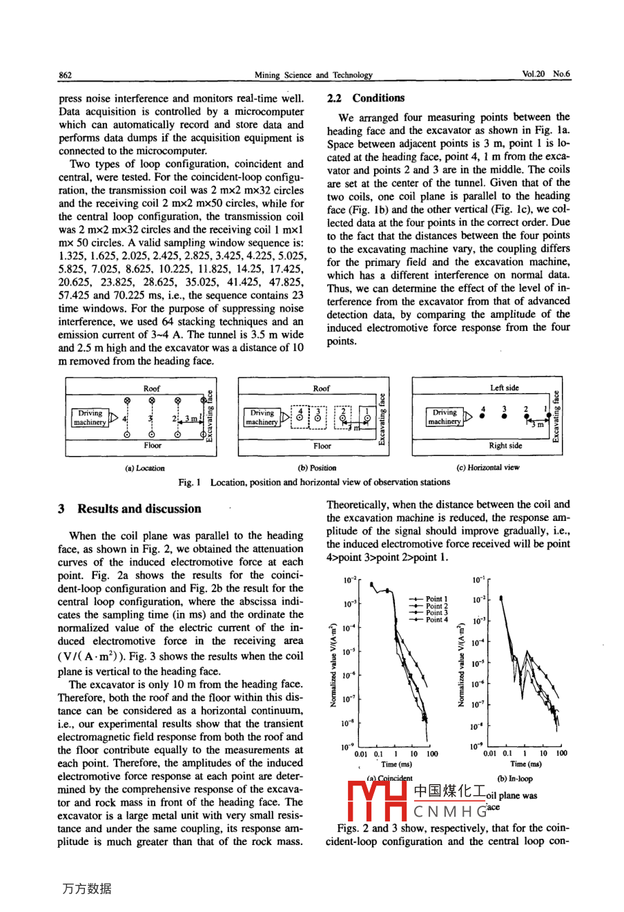 MINING. Science DirectSCIENCE ANDTECHNOLOGYELSEVIERMining Science and Technology 20(2010)0861-0863www.elsevier.com/locate/jcumtExperiment in metal disturbance during advanced detectionusing a transient electromagnetic method in coal minesJIANG Zhihai12,YUE Jianhua. Yu JirngcunSchool of Resources and Geoscience, China University of Mining Technology, Xuzhou 221008, china'State Key Laboratory of Geomechanics and Deep Underground engineerinChina University of Mining Technology, Xuzhou 221008, ChinaAbstract: Tunneling machines, or excavators, are large and good conductors and affect the reliability of data gathering and interpretation in advanced detection using transient electromagnetic methods In our experiment, we used a coincident-loop and centralloop type of configuration, where the coil plane 1)vertical to and 2) parallel to the working face. A SIROTEM instrument at different locations was used to observe the transient electromagnetic responses of the excavator and to analyze the response amplitudesThe result shows that the tunneling machine affects the advanced detection data and is related to the way the coil is coupled, Whenthe excavator is 6 m from the observatory, the interference of tunneling machine can be ignoredKeywords: transient electromagnetic method; advanced detection; metal disturbance; driving face1 IntroductionThey proposed a corresponding processing tech-nique-I5. However, research into the effect of drivWater inrush accidents commonly occur in the face ing machinery on excavation faces is rareof tunnel excavations. Therefore, in order to stay It is not easy to move the large excavators used forclear of buried water bodies, such as water transmis- tunnel excavation in a space-limited heading face. Insion lines or other water-bearing structures, geo- actual coal mining situations, when performing tran-physical techniques should be used before excavation sient electromagnetic advanced detection in the formand safety measures taken in advance are the key for of continuous-wave tracking, the longest distance thethe prevention of water related incidents in coal excavator can be moved backward is 10 m, but itmines. Since 1998, the China University of Mining cannot move forward. Because a transient electro-Technology, the Chinese Academy of Geological magnetic field occupies the whole space, the excava-Sciences and the Xi'an Branch of the Coal Research tor behind the heading face acts as a large-scale,Institute have carried out experiments on a transient low-resistance metal body, which directly affects theelectromagnetic method. This method is used to de- data acquisition of advanced detection and then alsotect the presence of water in both roofs and floors, affects the accuracy of detecting geologic anomaliesconcealed water conduits and water-bearing struc- in front of the heading face. In order to avoid or totures in front of the direction of the working face, as eliminate the interference from excavators and to im-well as water accumulation in boreholes and goaf prove reliability to interpret transient electromagneticareas.Chang an University uses this technology advanced detection data, we need to investigate theresponse characteristics of a transient electromagneticbodies in tunnels o. Facilities such as metal racks, field from excavation machines given circumstanceswire mesh, rails and heavy machinery in tunnels se- of different couplings. For this reason, we performedriously interfere with transient electromagnetic data some physical experiments in an underground tunnelin mines. Yu et al. have carried out some preliminaryinvestigations into transient electromagnetic response 2 Experimentalcharacteristic of metal racks, wire mesh and rails.2.11中國煤化工Received 12 March 2010; accepted 21 June 2010Corresponding author. Tel: 86 13645203339CN MHGspecialized TEME-mailaddress:jiangzhihai@cumt.edu.cninstrument,developed by CISCO, which is highldoi:10.1016S1674526409)×02969automated for sampling, has a good ability to sup-Mining Science and TechnologyVol20 No 6press noise interference and monitors real- time well. 2.2 ConditionsData acquisition is controlled by a microcomputerwhich can automatically record and store data ande arranged four measuring points between theperforms data dumps if the acquisition equipment isheading face and the excavator as shown in Fig. laconnected to the microcomputerSpace between adjacent points is 3 m, point 1 is lo.Two types of loop configuration, coincident and cated at the heading face, point 4, I m from the exca-or andcentral, were tested. For the coincident-loop configu- are set at the center of the tunnel. Given that of theration, the transmission coil was 2 mx2 mx32 circlestwo coils, one coil plane is parallel to the headingand the receiving coil 2 mx2 mx50 circles, while for face(Fig. Ib)and the other vertical(Fig. Ic), we col-the central loop configuration, the transmission coilwas 2 mx2 mx32 circles and the receiving coil I mxl lected data at the four points in the correct order.Duemx 50 circles. A valid sampling window sequence is: to the excavating machine vary, the coupling differs1.325,1.625,2.025,2425,2.825,3.425,4.225,5.025,5.825,7.025,8625,10.225,11.825,14.25,17425for the primary field and the excavation machine,which has a different interference on normal data.20.625, 23.825, 28.625, 35.025, 41.425, 47.825, Thus, we can determine the effect of the level of in-57. 425 and 70.225 ms, i.e, the sequence contains 23terference from the excavator from that of advancedtime windows. For the purpose of suppressing noise detection data, by comparing the amplitude of theinterference, we used 64 stacking techniques and anemission current of 3-4 A. The tunnel is 3.5 m wideduced electromotive force response from the fourand 2.5 m high and the excavator was a distance of 10 ponm removed from the heading face.Driving:3machineryFloorRight side(a) Location(b)Positionc) Horizontal viewFig 1 Location, position and horizontal view of observa