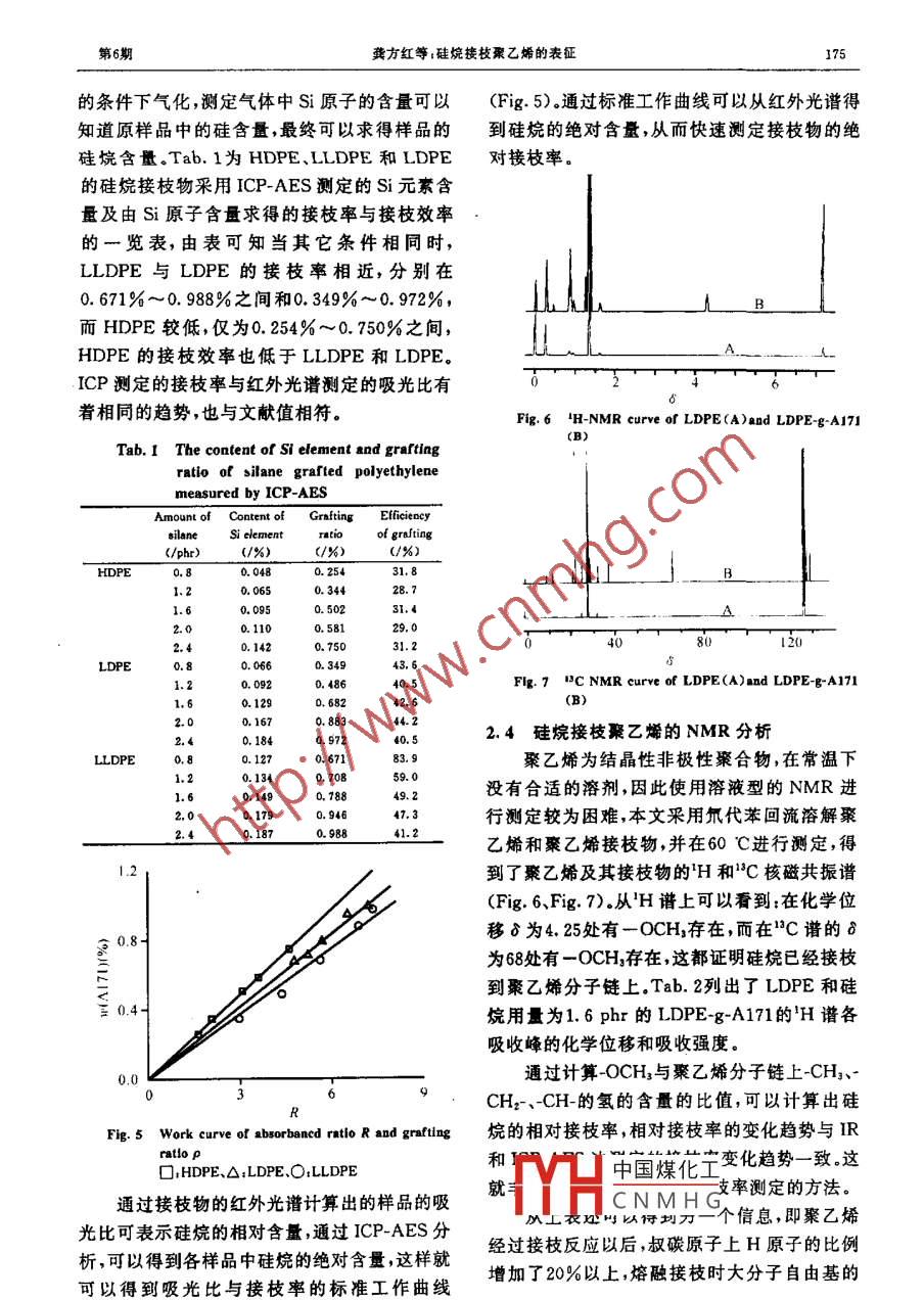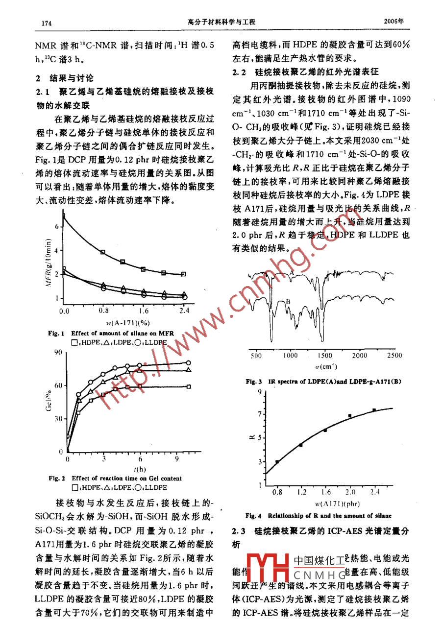 第22卷第6期高分子材料科學與工程Vol. 22,No. 62006年11月POLYMER MATERIALS SCIENCE AND ENGINEERINGNov. 2006硅烷接枝聚乙烯的表征龔方紅,蔣必彪”,劉春林*,汪信',陸路德',楊緒杰'(1.南京理工大學化工學院,江蘇南京210014; 2.江蘇工業(yè)學院材料工程系,江蘇常州213016)摘要:采用紅外光譜(IR)測定了乙烯基三甲氧基硅烷(A171)樓枝聚己端的硅烷特征吸收峰的吸光比,使用電感藕合等離子發(fā)射光譜儀(ICP-AES)測得硅烷接枝LDPE.LDPE和HDPE的接枝率分別為.0. 671%~0.988%、0. 349% ~0.972%和0.254%~0. 750%,與IR譜圍結合,得到了吸光比與接枝率的標準工作曲線;采用核磁共振儀(NMR)測定了硅烷接枝聚乙烯的"H和C譜圖,測算了接枝卑和結構變化,驗證了IR和ICP-AES的結果。關鍵詞:聚乙烯;硅烷;接枝;電感藕合等離子發(fā)射光譜儀中囝分類號:TQ325. 1+2文獻標識碼:A文章編號:1000-7555(2006)06-0173-04交聯處理是改進聚乙烯不足之處的重要方(A171):化學 純,美國奧斯佳公司;過氧化二異法之-(1.2],近幾年硅烷交聯聚乙烯的研究非常丙苯(DCP):工業(yè)品;二月桂酸二丁基錫:CR,活躍,硅烷交聯聚乙烯產品廣泛使用于中高檔天津化學試劑廠;抗氧劑1010:工業(yè)品。電纜料,上水與熱水管道,發(fā)泡材料等領域。當1.2 實驗原理與方法采用硅烷交聯法進行交聯改性時,通常先將乙在雙螺桿擠出機(TE-34,南京科亞化工烯基硅烷通過熔融接枝反應接枝到聚乙烯的分裝備有限公司)進行聚乙烯與A171的熔融接枝子鏈.上,生成硅烷接枝聚乙烯[3~]。對于硅烷接反應,制備硅烷接枝聚乙烯。接枝物水解交聯枝聚乙烯的表征,文獻報道一般都采用紅外光后,制得硅烷交聯聚乙烯,測定接枝物的熔體流譜法來測定硅烷特征基團的吸光比,但是吸光動速率(MFR)和交聯物的凝膠含量[6。比是一個相對量,往往要通過一.些轉化才能得將接枝物用二甲苯溶解成絮狀物,將絮狀到接枝率的絕對值。而本文使用等離子發(fā)射光物用丙酮抽提6h.再將抽提物在60C的真空譜(ICP-AES)來測定接枝物的Si 原子含量,并烘箱內真空 干燥5 h,進行IR,ICP和NMR分將其轉化為硅烷的接枝率,采用核磁共振儀測析。定了接枝物的'H-NMR和'C-NMR譜圖[0.10],壓制成膜,進行紅外光譜分析(紅外光譜儀并測算了碓烷的接枝率和接枝物的結構,完善為IR-460,日本島津) .計算吸光比R5I。了硅烷接枝聚乙烯的表征方法。使用電感藕合等離子體發(fā)射光譜儀(ICP-AES)(美國瓦安公司,VISTA-AX)測定樣品的1實驗部分Si原子含量,分析條件為功率:1.20 kW等離1.1 主要原料子氣流量:15.0 L/min,霧化器壓力:0.8kPa。低密度聚乙烯(LDPE):DJ210,上海石化取一定量處理過的接枝物樣品,用氘代苯公司;線性低密度聚乙烯(LLDPE): DFDC回流溶解,并保持在60 "C進行核磁共振測定7050,揚子石化公司;高密度聚乙烯(HDPE):(ARX- 300型,瑞士布魯克公司)。分別測定'H-2908,大慶石化公司;乙烯基三甲氧基硅烷中國煤化工YHCNMHG收稿日期:2005-12-13基金項目;江蘇省自然科學基金資助(BK2002100) ,江蘇省高校自然科學基金資助項目(05KJB430024)作者簡介:龔方紅,主要從事聚合物結構與性能研究, E-mail:fhgong@jpu. edu. cn174高分子材料科學與工程2006年NMR譜和3C-NMR譜,掃描時間:'H譜0.5高檔電纜料,而HDPE的凝膠含量可達到60%h,l'C譜3 h.左右,能滿足生產熱水管的要求。2.2硅烷接枝聚乙烯的紅外光譜表征2結果與討論2.1聚乙烯與乙烯基硅烷的熔融接枝及接枝用丙酮抽提接枝物,除去未反應的硅烷,測定其紅外光譜.接枝物的紅外圖譜中, 1090物的水解交聯在聚乙烯與乙烯基硅烷的熔融接枝反應過cm-'、1030 cm - '和1710 cm-'等處出現了-Si-程中,聚乙烯分子鏈與硅烷單體的接枝反應和0- CH的吸收峰(見Fig. 3),證明硅烷已經接聚乙烯分子鏈之間的偶合擴鏈反應同時發(fā)生。枝到聚乙烯大分子鏈上.本文采用2030 cm-'處Fig. 1是DCP用量為0.12 phr時硅烷接枝聚乙-CH2-的吸收峰和1710 cm-'處-Si-O-的吸收烯的熔體流動速率與硅烷用量的關系圖。從圖峰,計算吸光比R,R正比于硅烷在聚乙烯分子可以看出:隨著單體用量的增大,熔體的黏度變鏈.上的接枝率,可用來比較同種聚乙烯熔融接枝同種硅烷后接枝率的大小。Fig.4為LDPE接大、流動性變差,熔體流動速率下降。枝A171后,硅烷用量與吸光比的關系曲線,R隨著硅烷用量的增大而上升,當硅烷用量達到2.0phr后,R趨于穩(wěn)定,HDPE和LLDPE也有類似的結果。s~sE2日日fw三10.00.8162.4Flg.1 Eftect of amount of silane on MFRrVO:HDPE、0 ,LDPE.OILLDPE9050010001S0020002500o(cm')FIg.3 IR spectra of LDPE(A)ad LDPE-g-A171(B)60-7]30-工5.1(h)Fig.2 Eftect of reaction time on Gel contentO:HDPE.O;LDPE.O:LLDPE.8 1.21.6 2.0 2.4接枝物與水發(fā)生反應后,接枝鏈上的-w(AI7I)(phr)SiOCHs會水解為-SiOH,而-SiOH脫水形成-Fig.4 Relatlonship of R and the amount of silhaneSi-0-Si-交聯結構。DCP用量為0.12 phr ,2.3 硅烷接枝聚乙烯 的ICP -AES光譜定量分A171用量為1.6 phr時硅烷交聯聚乙烯的凝膠析含量與水解時間的關系如Fig. 2所示,隨著水中國煤化工k熱能、電能或光.解時間的延長,凝膠含量逐漸增大,當6h以后能cNMHG量在高、低能級凝膠含量趨于不變。當硅烷用量為1.6 phr時,間躍遷產生的譖線。本文采用電感耦合等離子LLDPE的凝膠含量可接近80%,LDPE的凝膠體(ICP-AES)為光源,測定了硅烷接枝聚乙烯含量可大于70%,它們的交聯物可用來制造中的ICP-AES譜。將硅烷接枝聚乙烯樣品在一定第6期龔方紅等;硅烷接枝聚乙婼的表征175的條件下氣化,測定氣體中Si原子的含量可以(Fig. 5)。通過標準工