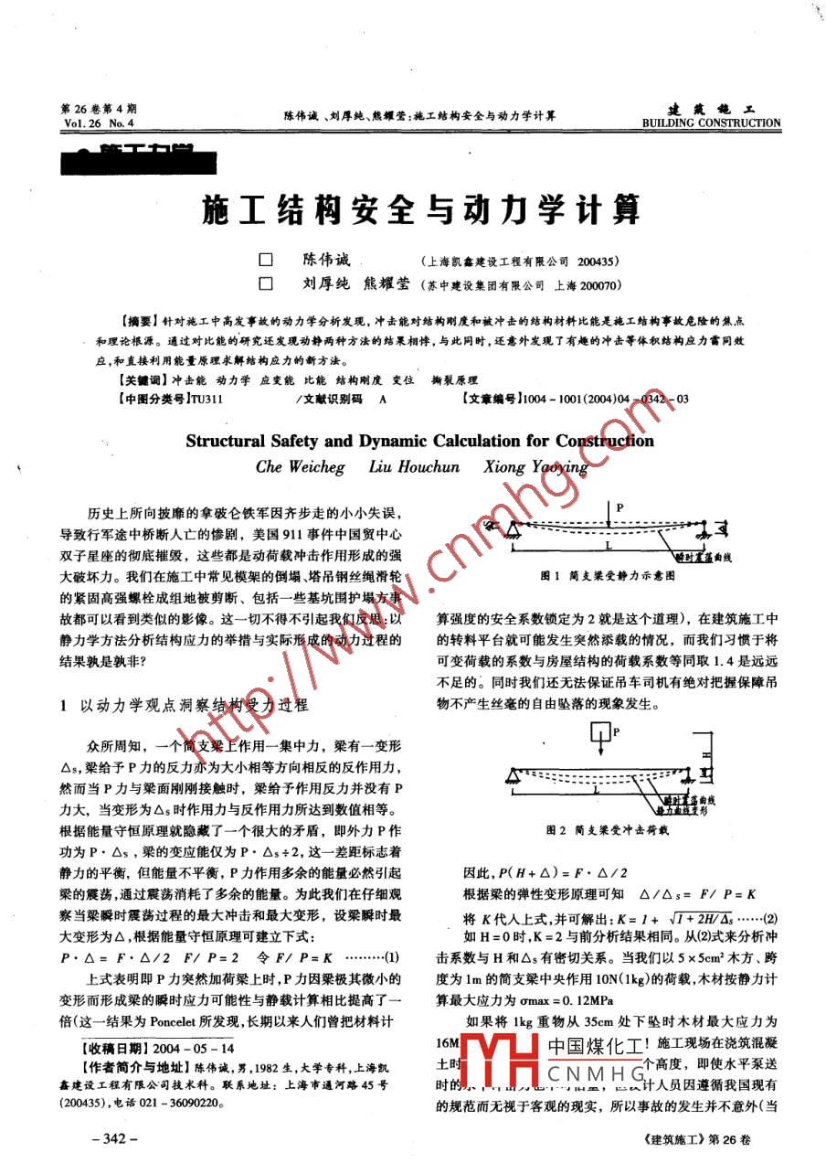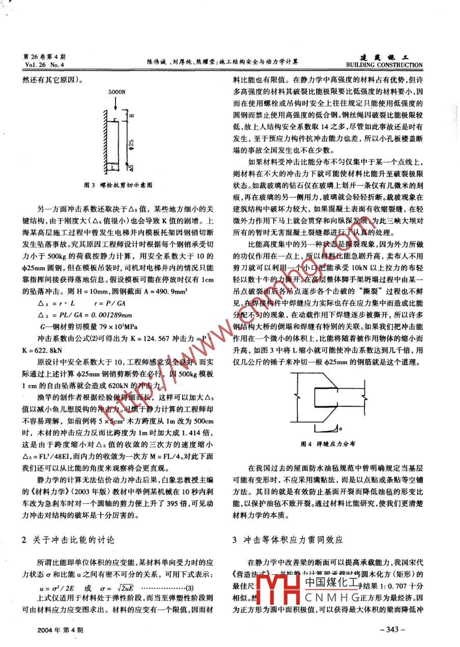 第26卷第4期Vol 26 No, 4陳偉誠(chéng)、劉厚純、熊耀瑩:施工結(jié)構(gòu)安全與動(dòng)力學(xué)計(jì)算BUILDING CONSTRUCTIOI施工結(jié)構(gòu)安全與動(dòng)力學(xué)計(jì)算口陳偉誠(chéng)(上海凱鑫建設(shè)工程有限公司200435)口劉厚純熊耀瑩(蘇中建設(shè)集團(tuán)有限公司上?!菊酷槍?duì)施工中高發(fā)事故的動(dòng)力學(xué)分析發(fā)現(xiàn),沖擊能對(duì)結(jié)構(gòu)剛度和被沖擊的結(jié)構(gòu)材料比能是施工結(jié)構(gòu)事故危險(xiǎn)的焦點(diǎn)和理論棖源。通過(guò)對(duì)比能的研究還發(fā)現(xiàn)動(dòng)靜兩種方法的結(jié)果相悖,與此同時(shí),還意外發(fā)現(xiàn)了有趣的沖擊等體積結(jié)構(gòu)應(yīng)力雷同效應(yīng),和直接利用能量原理求解結(jié)構(gòu)應(yīng)力的新方法。【關(guān)鍵詞】沖擊能動(dòng)力學(xué)應(yīng)變能比能結(jié)構(gòu)剛度變位撕裂原理【中圖分類(lèi)號(hào)】TrU311/文獻(xiàn)識(shí)別碼A【文章編號(hào)】1004-1001(2004)04-0342-03Structural Safety and Dynamic Calculation for ConstructionChe Weicheg Liu Houchun Xiong Yaoying歷史上所向披靡的拿破侖鐵軍因齊步走的小小失誤導(dǎo)致行軍途中橋斷人亡的慘劇,美國(guó)911事件中國(guó)貿(mào)中心雙子星座的徹底摧毀,這些都是動(dòng)荷載沖擊作用形成的強(qiáng)L曲線(xiàn)大破壞力。我們?cè)谑┕ぶ谐R?jiàn)模架的倒塌、塔吊鋼絲繩滑輪圖1簡(jiǎn)支梁受靜力示意圖的緊固高強(qiáng)螺栓成組地被剪斷、包括一些基坑圍護(hù)塌方事故都可以看到類(lèi)似的影像。這一切不得不引起我們反思:以算強(qiáng)度的安全系數(shù)鎖定為2就是這個(gè)道理),在建筑施工中靜力學(xué)方法分析結(jié)構(gòu)應(yīng)力的舉措與實(shí)際形成的動(dòng)力過(guò)程的的轉(zhuǎn)料平臺(tái)就可能發(fā)生突然添載的情況,而我們習(xí)慣于將結(jié)果孰是孰非?可變荷載的系數(shù)與房屋結(jié)構(gòu)的荷載系數(shù)等同取1.4是遠(yuǎn)遠(yuǎn)不足的。同時(shí)我們還無(wú)法保證吊車(chē)司機(jī)有絕對(duì)把握保障吊1以動(dòng)力學(xué)觀(guān)點(diǎn)洞察結(jié)構(gòu)受力過(guò)程物不產(chǎn)生絲毫的自由墜落的現(xiàn)象發(fā)生。眾所周知,一個(gè)簡(jiǎn)支梁上作用一集中力,梁有一變形△s,梁給予P力的反力亦為大小相等方向相反的反作用力ATER然而當(dāng)P力與梁面剛剛接觸時(shí),梁給予作用反力并沒(méi)有P力大,當(dāng)變形為△s時(shí)作用力與反作用力所達(dá)到數(shù)值相等根據(jù)能量守恒原理就隱藏了一個(gè)很大的矛盾,即外力P作圖2簡(jiǎn)支粱受沖擊荷載功為P·△s,梁的變應(yīng)能僅為P·△s÷2,這一差距標(biāo)志著靜力的平衡,但能量不平衡,P力作用多余的能量必然引起因此,P(H+△)=F·△/2梁的震蕩,通過(guò)震蕩消耗了多余的能量。為此我們?cè)谧屑?xì)觀(guān)根據(jù)梁的彈性變形原理可知△/△s=F/P=K察當(dāng)梁瞬時(shí)震蕩過(guò)程的最大沖擊和最大變形,設(shè)梁瞬時(shí)最將K代入上式,并可解出:K=1++2HA3……(2)大變形為△,根據(jù)能量守恒原理可建立下式如H=0時(shí),K=2與前分析結(jié)果相同。從(2)式來(lái)分析沖P·△=F·△/2F/P=2令F∥P=K(1)擊系數(shù)與H和△s有密切關(guān)系。當(dāng)我們以5×5cm2木方、跨上式表明即P力突然加荷梁上時(shí),P力因梁極其微小的度為1m的簡(jiǎn)支梁中央作用10N(1kg)的荷載,木材按靜力計(jì)變形而形成梁的瞬時(shí)應(yīng)力可能性與靜載計(jì)算相比提高了算最大應(yīng)力為omax=0.12MPa倍(這一結(jié)果為 Poncelet所發(fā)現(xiàn),長(zhǎng)期以來(lái)人們?cè)巡牧嫌?jì)如果將1kg重物從35cm處下墜時(shí)木材最大應(yīng)力為【收稿日期】2004-05-14Tr山中國(guó)煤化工!施工現(xiàn)場(chǎng)在澆筑混凝【作者簡(jiǎn)介與地址】陳偉誠(chéng),男,1982生,大學(xué)專(zhuān)科,上海凱鑫建設(shè)工程有限公司技術(shù)科。聯(lián)系地址:上海市通河路45號(hào)時(shí),口計(jì)人員因遵循我國(guó)現(xiàn)有(200435),電話(huà)021-3609020。的規(guī)范而無(wú)視于客觀(guān)的現(xiàn)實(shí),所以事故的發(fā)生并不意外(當(dāng)342《建筑施工》第26卷第26卷第4期Vol 26 No練偉誠(chéng)、劉厚純、熊耀瑩:施工結(jié)構(gòu)安全與動(dòng)力學(xué)計(jì)算NG CONSTRUCTION然還有其它原因)料比能也有限值。在靜力學(xué)中高強(qiáng)度的材料占有優(yōu)勢(shì),但許5000N多高強(qiáng)度的材料其破裂比能極限要比低強(qiáng)度的材料要小,因而在使用螺栓或吊鉤時(shí)安全上往往規(guī)定只能使用低強(qiáng)度的圓鋼而禁止使用高強(qiáng)度的低合鋼。鋼絲繩因破裂比能極限較低,故上人結(jié)構(gòu)安全系數(shù)取14之多,盡管如此事故還是時(shí)有發(fā)生,至于預(yù)應(yīng)力構(gòu)件抗沖擊能力也差,所以小孔板樓蓋斷塌的事故全國(guó)發(fā)生也不在少數(shù)。如果材料受沖擊比能分布不勻僅集中于某一個(gè)點(diǎn)線(xiàn)上則材料在不大的沖擊力下就可能使材料比能升至破裂極限圖3螺栓抗剪切示意圖狀態(tài)。如裁玻璃的鉆石僅在玻璃上劃開(kāi)一條僅有幾微米的刻痕,再在玻璃的另一側(cè)用力,玻璃就會(huì)輕輕折斷。裁玻現(xiàn)象在另一方面沖擊系數(shù)還取決于△s值,某些地方細(xì)小的關(guān)建筑結(jié)構(gòu)中破