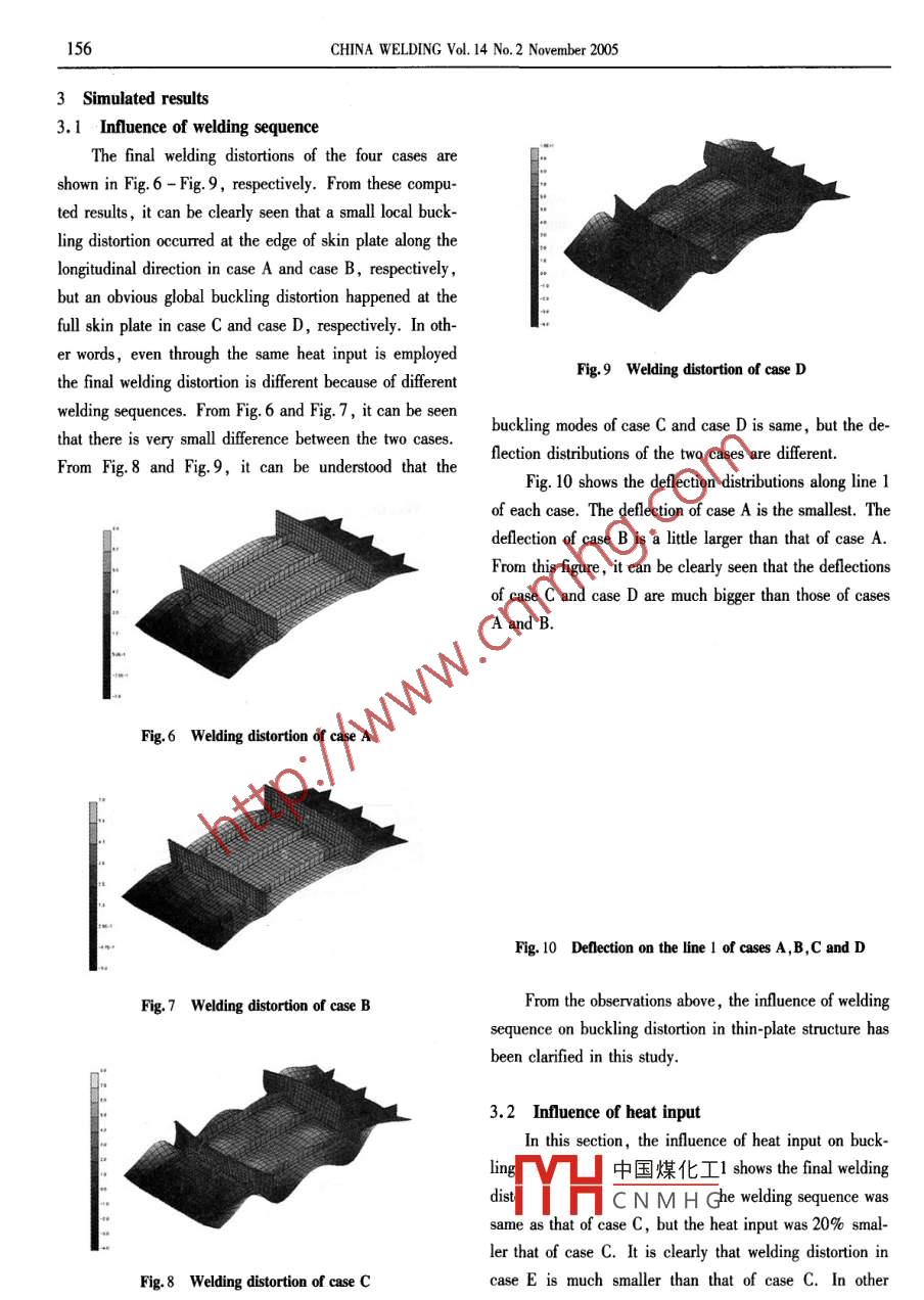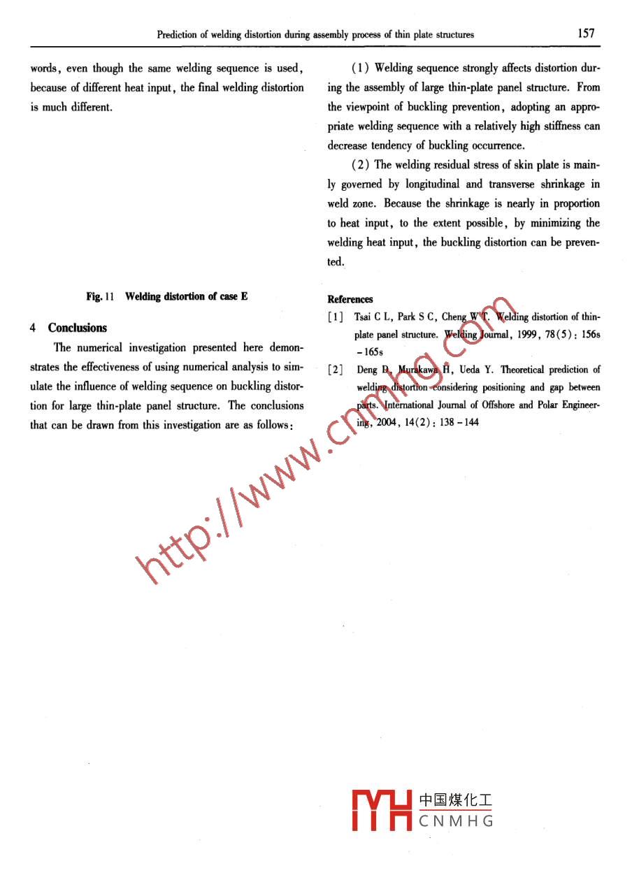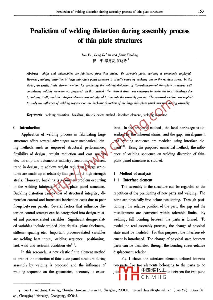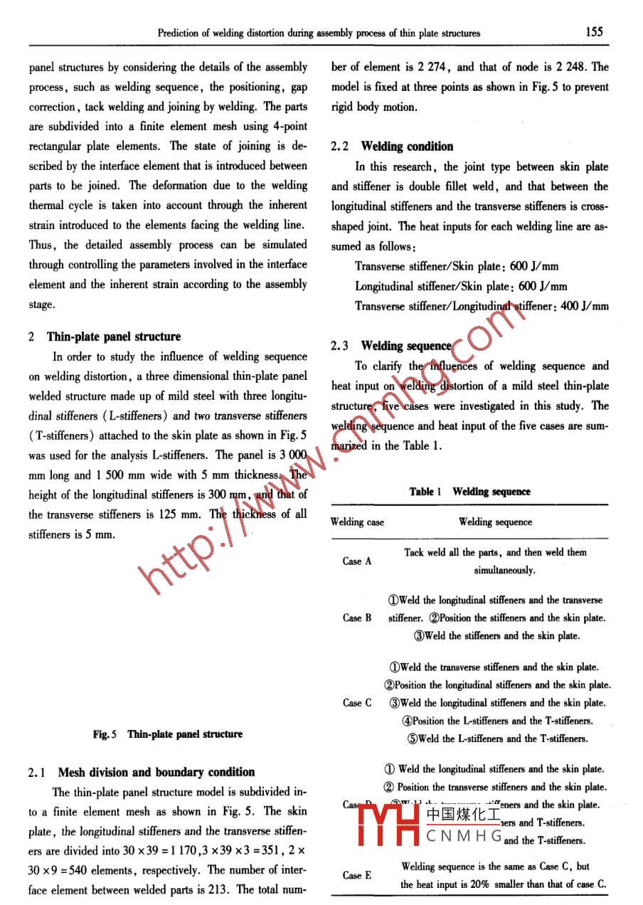 Prediction of welding distortion during assembly process of thin plate structures153Prediction of welding distortion during assembly processof thin plate structuresLuo Yu, Deng De' an and Jjiang Xiaoling羅宇,鄧德安,江曉玲*Abstract Ships and automobiles are fabricated from thin plates To assemble parts, welding is commonly employed.Houerer, welding distortion in large thin-plate panel structure is usually cased by buckling due to the residual sress In thisstudy, an elastic finite element method for predicting the welding distortion of three -dimensional thin-plate structures withconsidering welding sequence was proposed. In this method, the inherent strain was employed t0 model the local shrinkage dueto welding itself, and the inteface element was introduced to simulate the assembly process. The proposed method was appliedl0 study the in/luence of welding sequence on the buckling distortion of the large thin plate panel structure during assembly.Key words welding distortion, buckling, finite element metod , interface element, welding sequence0 Introductionined. In the proposed method, the local shrinkage is de-Application of welding process in fabricating largescribed by the inherent strain , and the gap, misalignmentstructures ofers several advantages over mechanical join-and welding sequence are modeled using interface ele-ing methods such as improved structural performance ,ment!2). Using the proposed numerical method, the influ-flexibility of design, weight reduction and cost savingsence of welding sequence on welding distortion of thin-etc. In ship and automobile industry,according to currentplate panel structure is studied.trend in design, to achieve weight reduction, large struc-tures are made up of relatively thin section of high strength1 Method of analysissteels. However, buckling is a common problem occurring.1 Interface elementin the welding fabrication of thin-plate panel structure.The assembly of the structure can be regarded as theBuckling distortion causes loss of structural integrity, di-retition of the positioning of new parts and welding. Themension control and increased fabrication costs due to poorparts are physically free before positioning. Through posi-fit-up between panels. Several factors that infuence dis-tioning, the relative position of the part, the gap and thetortion control strategy can be categorized into design-relat-misalignment are corrected within tolerable limits. Byed and process -related variables. Significant design relat-welding, full bonding between the parts is formned. Toed variables include welded joint details ,plate thickness,nodel the real assembly process, the change of physicalsifener spacing etc. Important process-related variablesstate must be modeled. For this purpose, the interface el-are welding heat input, welding sequence ,positioning,ement is introduced. The change of physical state betweentack weld and restraint condition etec"].parts can be described through the bonding stress-relativeIn this research, a new elastic finite element methoddisplacement relation.to predict the distortion of thin-plate panel structure duringFig. 1 shows the interface element defined betweenassembly by welding is proposed and the influence oftwo narts ( or two elements belonging to the parts to bewelding sequence on the geometrical accuracy is exam-中國煤化工nts btween the two partsYHCNMHG●Luo Yu and Jjang Xiaoling, Shanghai Jiaotong University, Shanghai, 200030. E-mail:!uoyu@ sjtu. edu. cn (Luo Yu) Deng De'an, Chongqing University , Chongqing, 4044.154CHINA WELDINC Vol. 14 No. 2 November 2005are normal opening δw,transverse opening δr,longitudi-sitioning and welding. The property of the interface ele-nal sliding δ and relative rotation δgx. Similarly, thement is mostly defined by the scale parameter r。and bond-stresses acting between the parts are denoted as σv, σr,ing strength y. The scale parameter To gives the precisionσl and σax,respectively.in positioning and a small enough value must be selectedto ensure the required precision at the positioning stage.Except for the positioning stage, large value can be usedfor r。. On the other hand,the bonding strength γ must besmall when the parts are free. At the positioning stage, arelatively small value such as 10-* MPa corresponds toweak positioning which is not strong enough to close thegap. For the strong positioning which is strong enough to .close the gap, a large value such as 10° MPa can be giv-Fig. 1 Types of gap described in the interface elementn. In this research, the value is assumed to be 10-1MPa. As shown in Fig. 3, the precision of the positioningThe relationships between the stress σ and the dis-can be controlled through adjusting the scale parameter ro.placerment δ are schematically shown in Fig. 2a andWhen the full bonding formed by welding, a large valueFig. 2b. Due to the symmetry of the shear deformation andlike 10'0 MPa can be used. The gap between parts remai-rotational deformation, the relation between displacermentning after the positioning stage, δc, is fixed and intro-and stress is symmetric as shown in Fig. 2b. While that induced into the function describing the state after weldingnormal direction is not symmetric as shown in Fig. 2a.as shown in Fig. 4.?!鉽Y~|_0170.1δ(mm)8Fig.3 Relationship between bonding stress and(a) Normal directiondisplacement during positioning葉, Oex .n..20x10%Y&.8, δox一)I8cv8N(b) Shear and rotational direction中國煤化工r for welded joint with gapFig.2 Relationship between bonding stress and displacementYHCNMHG1.2 Procedure of analysisThe physical relation between parts during the assem-The finite element method proposed in this study isbly process can be separated into three , namely, free, po~ developed to predict the distortion of the large thin-plate.Prediction of welding distortion during assembly process of thin plate structures155panel structures by considering the details of the assemblyber of element is 