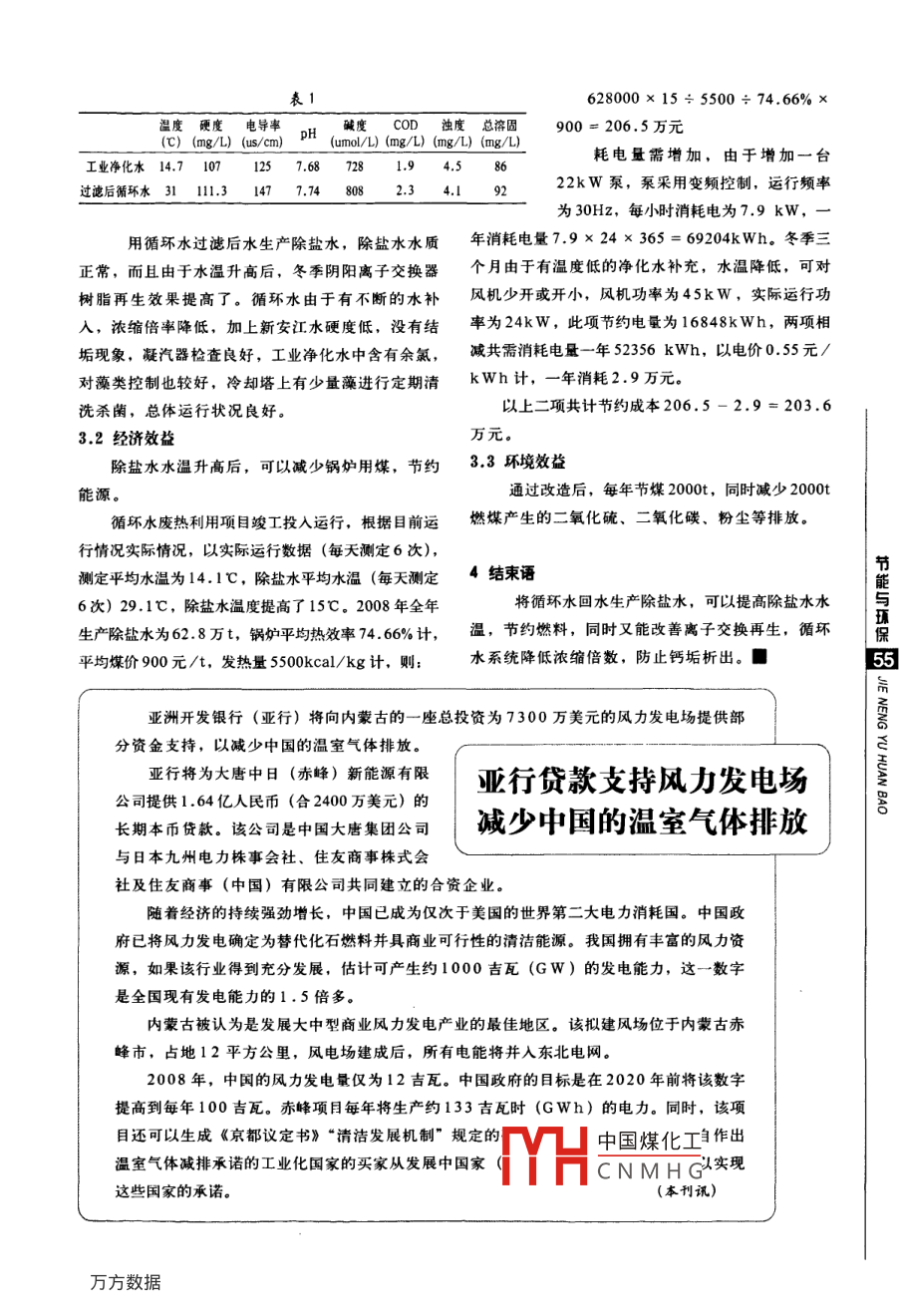利用循環(huán)水回水王期敵水的造劉紅春(浙江新安化工集團股份有限公司,新江杭州311600)浙江新安化工集團股份有限公司建德熱電廠共有兩臺6000kW發(fā)電機組,其中一臺抽背機組,臺抽凝機組。電廠循環(huán)水主要用于抽凝機組冷凝器換熱,循環(huán)水換熱后經(jīng)冷卻塔冷卻后循環(huán)使用。由于抽凝式汽輪機冷源熱損失很大,乏汽在凝結(jié)成凝摘要循環(huán)水回水經(jīng)過的熱交換后,溫度在25~結(jié)水過程中所釋放出的熱量通過循環(huán)水換熱被循環(huán)37℃左右,比生產(chǎn)除鹽水的原水溫度高,用循環(huán)水吸收而浪費掉了,造成了能源的浪費。循環(huán)水系水生產(chǎn)除鹽水,可以提高除鹽水水溫,降低循環(huán)節(jié)統(tǒng)保有水量450m3,循環(huán)水出水水溫度24~32℃水濃縮倍率,節(jié)約燃料,降低消耗,減少污染。唾回水溫度28-36℃,工廠除鹽水生產(chǎn)原水取于新安關(guān)鍵詞:熱電廠;循環(huán)水;除鹽水孤江江水,新安江江水是新安江大壩水下60m深的水保發(fā)電時排出的,因此長年水溫恒定,平均水溫在152改造后的工藝℃左右。江水經(jīng)預(yù)處理后為工業(yè)凈化水,再供陰陽將循環(huán)水系統(tǒng)與除鹽水生產(chǎn)系統(tǒng)聯(lián)在一起,將離子交換器生產(chǎn)除鹽水,現(xiàn)有除鹽水生產(chǎn)共有兩套凈化水作為循環(huán)水補充水,將原工業(yè)凈化水改為循60t/h、兩套35t/h的陰陽離子交換器,一開一備,環(huán)水補水,將循環(huán)水回水通過回壓泵加壓再經(jīng)雙層毎小時用水量在70~90t左右。用循環(huán)水生產(chǎn)除鹽濾料機械過濾器過濾后,到陰陽離子交換器交換水可以將除鹽水水溫提高15℃以上,全年可節(jié)約大生產(chǎn)除鹽水,使除鹽水水溫提高,如圖2。量的燃料。陽離子交換器1改造前的循環(huán)水除鹽水工藝(圖1)除碳器工業(yè)凈化水回水中間水池28~36℃24~32℃陽離子交換器陰離子交換械過濾工業(yè)凈化水工業(yè)水(少量補水)除碳器鹽水箱凝汽器循環(huán)水池水溫平均30d鍋爐除氧器陰離子交換器出水圖228-36℃+24-32c除鹽水箱L疑汽器3實際效果水溫平均5c中國煤化工鍋爐除氧器CNMHG增加了,陰陽離子交換器進求水質(zhì)還到要,我1是循環(huán)水經(jīng)過濾后水質(zhì)與凈化水水質(zhì)對比情況表(℃)(mgu)(scm)DH。堿度coD濁度總?cè)芤?00=206.5萬元溫度硬度電導(dǎo)率(umol/L)(mg/L)(mg/L)(mg/L)耗電量需增加,由于增加一臺工業(yè)凈化水14.71071257.687281.94.5過濾后循環(huán)水3111.31477.74808234.l22kW泵,泵采用變頻控制,運行頻率為30H2,每小時消耗電為7.9kW,一用循環(huán)水過濾后水生產(chǎn)除鹽水,除鹽水水質(zhì)年消耗電量79×24×365=69204kWh。冬季三正常,而且由于水溫升高后,冬季陰陽離子交換器個月由于有溫度低的凈化水補充,水溫降低,可對樹脂再生效果提高了。循環(huán)水由于有不斷的水補風機少開或開小,風機功率為45kW,實際運行功入,濃縮倍率降低,加上新安江水硬度低,沒有結(jié)率為24kW,此項節(jié)約電量為16848kWh,兩項相垢現(xiàn)象,凝汽器檢查良好,工業(yè)凈化水中含有余氯,減共需消耗電量一年52356KWh,以電價0.55元/對藻類控制也較好,冷卻塔上有少量藻進行定期清kWh計,一年消耗2.9萬元。洗殺菌,總體運行狀況良好。以上二項共計節(jié)約成本206.5-2.9=203.63.2經(jīng)濟效益除鹽水水溫升高后,可以減少鍋爐用煤,節(jié)約3,3環(huán)境效益能源。通過改造后,每年節(jié)煤2000t,同時減少2000t循環(huán)水廢熱利用項目竣工投入運行,根據(jù)目前運燃煤產(chǎn)生的二氧化硫、二氧化碳、粉塵等排放。行情況實際情況,以實際運行數(shù)據(jù)(每天測定6次),測定平均水溫為14.1℃,除鹽水平均水溫(每天測定4結(jié)束語6次)29.1℃,除鹽水溫度提高了15℃。2008年全年生產(chǎn)除鹽水為62.8萬t,鍋爐平均熱效率74.66%計,溫,節(jié)約燃料,同時又能改善離子交換再生,循環(huán)平均煤價900元/t,發(fā)熱量5500kcal/kg計,則水系統(tǒng)降低濃縮倍數(shù),防止鈣垢析出?!雠c保5將循環(huán)水回水生產(chǎn)除鹽水,可以提高除鹽水水與亞洲開發(fā)銀行(亞行)將向內(nèi)蒙古的一座總投資為7300萬美元的風力發(fā)電場提供部分資金支持,以減少中國的溫室氣體排放。重行將為大質(zhì)中日晴)新能有亞行貸款支持風力發(fā)電場提供1.64億人民幣(合2400萬美元)的長期本幣貸款。該公司是中國大唐集團公司減少中國的溫室氣體排放與日本九州電力株事會社、住友商事株式會社及住友商事(中國)有限公司共同建立的合資企業(yè)隨著經(jīng)濟的持續(xù)強勁增長,中國已成為僅次于美國的世界第二大電力消耗國。中國政府已將風力發(fā)電確定為替代化石燃料并具商業(yè)可行性的清潔能源。我國擁有豐富的風力資源,如果該行業(yè)得到充分發(fā)展,估計可產(chǎn)生約1000吉瓦(GW)的發(fā)電能力,這一數(shù)字是全國現(xiàn)有發(fā)電能力的1.5倍多。蒙古被認為是發(fā)展大中型商業(yè)風力發(fā)電產(chǎn)業(yè)的最佳地區(qū)。該擬建風場位于內(nèi)蒙古赤峰市,占地12平方公里,風電場建成后,所有電能將并入東北電網(wǎng)。2008年,中國的風力發(fā)電量僅為12吉瓦。中國政府的目標是在2020年前將該數(shù)字提高到每年100吉瓦。赤峰項目每年將生產(chǎn)約133吉瓦時(Gwh)的電力。同時,該項目還可以生成《京都議定書》“