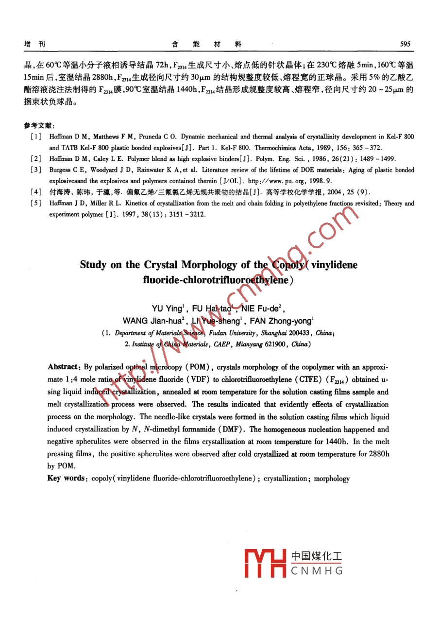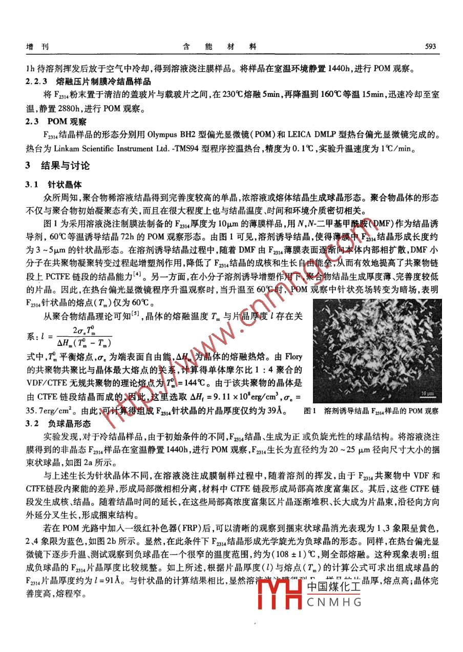 592能材料第12卷偏氟乙烯/三氟氯乙烯共聚物結(jié)晶形態(tài)研究于瀛',付海濤',聶福德’,王建華2,李越生',范仲勇'(1.復(fù)旦大學材料科學系,上海200433;2.中國工程物理研究院化工材料研究所,四川綿陽621900)摘要:在不同條件下,用偏光顯微鏡觀察了單體摩爾比1 :4聚合的偏氟乙烯(VDF)和三氟氯乙烯(CTFE)共聚物(F2u4)的結(jié)晶形態(tài)。實驗結(jié)果表明:Fxu結(jié)晶過程和環(huán)境對晶體的形態(tài)有很大影響。在DMF溶劑誘導下,溶液澆鑄膜樣品生成針狀晶。在室溫處理1440h,溶液澆注膜樣品按均相成核結(jié)晶機理,形成負球晶形態(tài)。采用熔融壓膜技術(shù)制備的Fr樣品,偏光顯微鏡觀察形成正球晶形態(tài)。關(guān)鍵詞:偏氟乙烯~三氟氯乙烯共聚物;結(jié)晶;形態(tài)1引言迄今為止,對炸藥粘結(jié)劑用氟聚合物材料的凝聚態(tài)研究,文獻對單體摩爾比為1 : 3的偏氟乙烯( VDF)和三氟氯乙烯( CTFE)共聚物( Kel F-800)的結(jié)構(gòu)及其結(jié)晶行為進行了報道[1-] ,而對其結(jié)晶形態(tài)的研究尚未見有詳細研究報道。近期,對國產(chǎn)按單體摩爾比1 : 4聚合的VDF/CTFE無規(guī)共聚物(F2314)的結(jié)晶行為的研究發(fā)現(xiàn)4),在40~80C的溫度區(qū)間內(nèi)長時間退火,FE234內(nèi)部的凝聚態(tài)結(jié)構(gòu)變化,發(fā)生結(jié)晶,結(jié)晶熔點隨退火溫度的升高和時間延長而升高;在80C等溫60天后,F314的結(jié)晶熔融溫度升高到118C。在對應(yīng)于室溫儲存影響的40C退火實驗中,實驗發(fā)現(xiàn)雖然退火溫度接近F2314的玻璃化轉(zhuǎn)變溫度,但是長時間的溫度效應(yīng)累積會引起分子鏈段的局部有序運動從而產(chǎn)生一定的結(jié)晶度,此聚合物經(jīng)過60天的長時間等溫后,結(jié)晶熔點為97C ,結(jié)晶度可達到11%左右。由此可見,F2314在作為炸藥粘結(jié)劑的加工和使用過程中聚集態(tài)結(jié)構(gòu)會發(fā)生變化,因此研究F2314的聚集態(tài)結(jié)構(gòu)特點及形成條件,對于了解其凝聚轉(zhuǎn)變機制,聚集態(tài)結(jié)構(gòu)和應(yīng)用性能具有重要意義。然而,目前對Fzsu的晶體生長形態(tài)熱歷史或成型條件對晶粒的凝聚堆積影響等結(jié)晶形態(tài)學的研究仍屬空白。本文在對F214結(jié)晶行為研究的基礎(chǔ)上,采用熱臺偏光顯微鏡(POM)對不同條件下得到的結(jié)晶樣品進行了形態(tài)觀察,探討了樣品的初始條件,溫度及時間對F3n結(jié)晶生長方式的影響,并對由此生成的不同光學特性的球晶結(jié)構(gòu)的形成機理進行初探。2實驗2.1原料Fa為成都晨光化工研究院提供的偏氟乙烯和三氟氯乙烯1 :4的共聚物。乙酸乙酯和N,N-二甲基甲酰胺(DMF)均為分析純試劑。2.2樣品制備2.2.1溶液澆注 膜的溶劑誘導結(jié)晶樣品將F234配成濃度為1%(w/v)的乙酸乙酯溶液,在77C使其充分溶解后,于培養(yǎng)皿中澆鑄成膜,待溶劑揮發(fā)后在20C的真空烘箱中干燥96h去除殘留溶劑,得到厚度約10μm的薄膜。在膜表面滴-滴DMF溶劑后密封放置在60C的等溫爐中誘導結(jié)晶72h,得到溶劑誘導結(jié)晶樣品。2.2.2溶液澆注膜冷結(jié)晶樣品將F2314配成5%的乙酸乙酯溶液,779充分溶解后,取數(shù)滴滴加于清潔的玻璃片上,在90C的等溫爐中等溫中國煤化工基金項目:中國工程物理研究院與復(fù)旦大學院校科技合作項目。CNMHG作者簡介:于瀛(1972-) ,女,碩士,講師,研究方向為聚合物結(jié)構(gòu)與性能。e maul: yuyng@ 203. net增刊含能材料5931h待溶劑揮發(fā)后放于空氣中冷卻,得到溶液澆注膜樣品。將樣品在室溫環(huán)境靜置1440h, 進行POM觀察。2.2.3熔融壓片 制膜冷結(jié)晶樣品將F2314粉末置于清潔的蓋玻片與載玻片之間,在230C熔融5min ,再降溫到160C等溫15min,迅速冷卻至室溫,靜置2880h,進行POM觀察。2.3 POM 觀察F2314結(jié)晶樣品的形態(tài)分別用OlympusBH2型偏光顯微鏡(POM)和LEICADMLP型熱臺偏光顯微鏡完成的。熱臺為Linkam Scientific Instrument Ltd. -TMS94型程序控溫熱臺,精度為0.1C ,實驗升溫速度為19C/min。3結(jié)果與討論3.1針狀晶體眾所周知,聚合物稀溶液結(jié)晶得到完善度較高的單晶,濃溶液或熔體結(jié)晶生成球晶形態(tài)。聚合物晶體的形態(tài)不僅與聚合物初始凝聚態(tài)有關(guān),而且在很大程度上也與結(jié)晶溫度、時間和環(huán)境介質(zhì)密切相關(guān)。圖1為采用溶液澆注制膜法制備的Fz14厚度為10μum的薄膜樣品,用N,N-二甲基甲酰胺( DMF)作為結(jié)晶誘導劑,60C等溫誘導結(jié)晶72h的POM觀察形態(tài)。由圖1可見,溶劑誘導結(jié)晶,使得薄膜中F31結(jié)晶形成長度約為3 ~ 5uμm的針狀晶形態(tài)。在溶劑誘導結(jié)晶過程中,隨著DMF由Fzm薄膜表面逐漸向本體內(nèi)部相擴散, DMF小分子在共聚物凝聚轉(zhuǎn)變過程起增塑劑作用,降低了Fx14結(jié)晶的成核和生長自由能壘,從而有效地提高了共聚物鏈段上PCTFE鏈段的結(jié)晶能力4。另-方面,在小分子溶劑誘導增塑作用下,聚合物結(jié)晶生成厚度薄、完善度較低的片晶。因此,在熱臺偏光顯微鏡程序升溫觀察時,當升溫至60C時,POM觀察中針狀亮場轉(zhuǎn)變?yōu)榘祱?表明Fz214針狀晶的熔點(T_)僅為60C。從聚合物結(jié)晶理論可知[5),晶體的熔融溫度T與片晶厚度l存在關(guān)2σ.r°AH.(T- T.)式中,T。平衡熔點,σ。為端表面自由能,AH.為晶體的熔融熱焓。由Flory的共聚物共聚比與晶體最大熔點的關(guān)系,計算得單體摩爾比1