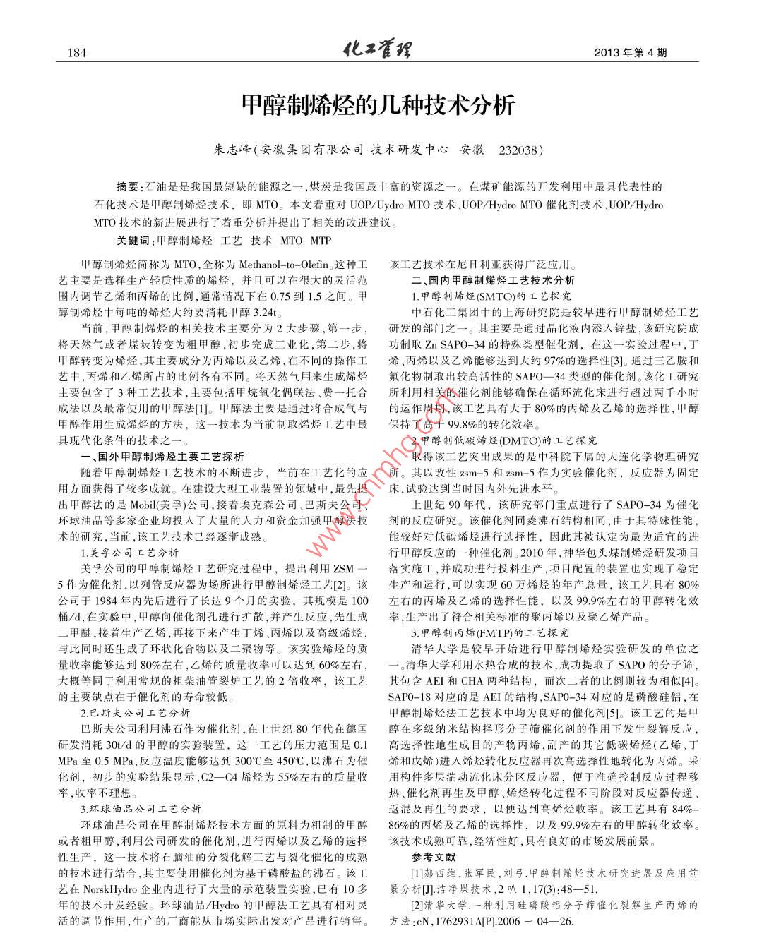 184化工管理2013年第4期.甲醇制烯烴的幾種技術(shù)分析朱志峰(安徽集團(tuán)有限公司技術(shù)研發(fā)中心安徽232038)摘要:石油是是我國最短缺的能源之一,煤炭是我國最豐富的資源之--。在煤礦能源的開發(fā)利用中最具代表性的石化技術(shù)是甲醇制烯烴技術(shù),即MTO。本文著重對UOP/Uydro MTO技術(shù).UOP/Hydro MTO催化劑技術(shù)、U0OP/ HydroMTO技術(shù)的新進(jìn)展進(jìn)行了著重分析并提出了相關(guān)的改進(jìn)建議。關(guān)鍵詞:甲醇制烯烴工藝技術(shù)MTO MTP甲醇制烯烴簡稱為MTO,全稱為Methanol--to--Olein。這種工該工藝技術(shù)在尼日利亞獲得廣泛應(yīng)用。藝主要是選擇生產(chǎn)輕質(zhì)性質(zhì)的烯烴,并且可以在很大的靈活范二、國內(nèi)甲醇制烯烴工藝技術(shù)分析圍內(nèi)調(diào)節(jié)乙烯和丙烯的比例,通常情況下在0.75到1.5之間。甲1.甲醇制烯烴(SMTO)的工藝探究醇制烯烴中每噸的烯烴大約要消耗甲醇3.24t。中石化工集團(tuán)中的上海研究院是較早進(jìn)行甲醇制烯烴工藝當(dāng)前,甲醇制烯烴的相關(guān)技術(shù)主要分為2大步驟,第一步,研發(fā)的部門之--。其主要是通過晶化液內(nèi)添人鋅鹽,該研究院成將天然氣或者煤炭轉(zhuǎn)變?yōu)榇旨状?初步完成工業(yè)化,第二步,將功制取 Zn SAP0-34的特殊類型催化劑,在這一實(shí)驗(yàn)過程中,丁甲醇轉(zhuǎn)變?yōu)橄N,其主要成分為丙烯以及乙烯,在不同的操作工烯、丙烯以及乙烯能夠達(dá)到大約97%的選擇性[3]。通過三乙胺和藝中,丙烯和乙烯所占的比例各有不同。將天然氣用來生成烯烴氟化物制取出較高活性的SAP0-34類型的催化劑。該化工研究主要包含了3種工藝技術(shù),主要包括甲烷氧化偶聯(lián)法、費(fèi)-托合所利用相關(guān)的催化劑能夠確保在循環(huán)流化床進(jìn)行超過兩千小時(shí)成法以及最常使用的甲醇法[]。甲醇法主要是通過將合成氣與的運(yùn)作周期,該工藝具有大于80%的丙烯及乙烯的選擇性,甲醇甲醇作用生成烯烴的方法,這一技術(shù)為當(dāng)前制取烯烴工藝中最保持 了高于99.8%的轉(zhuǎn)化效率。具現(xiàn)代化條件的技術(shù)之-一。2.甲醇制低碳烯烴(DMTO)的工藝探究一、國外甲醇制烯烴主要工藝探析取得該工藝突出成果的是中科院下屬的大連化學(xué)物理研究隨著甲醇制烯烴工藝技術(shù)的不斷進(jìn)步,當(dāng)前在工藝化的應(yīng)所。 其以改性zsm -5和zsm- -5作為實(shí)驗(yàn)催化劑,反應(yīng)器為固定用方面獲得了較多成就。在建設(shè)大型工業(yè)裝置的領(lǐng)域中,最先提床,試驗(yàn)達(dá)到當(dāng)時(shí)國內(nèi)外先進(jìn)水平出甲醇法的是Mobil(美乳)公司,接著??松?、巴斯夫公司、上世紀(jì) 90年代,該研究部門重點(diǎn)進(jìn)行了SAP0- -34為催化環(huán)球油品等多家企業(yè)均投入了大量的人力和資金加強(qiáng)甲醇法技劑的反應(yīng)研究。該催化劑同菱沸石結(jié)構(gòu)相同,由于其特殊性能,術(shù)的研究,當(dāng)前,該工藝技術(shù)已經(jīng)逐漸成熟。能較好對低碳烯烴進(jìn)行選擇性,因此其被認(rèn)定為最為適宜的進(jìn)1.美孚公司工藝分析行甲醇反應(yīng)的-.種催化劑。2010年,神華包頭煤制烯烴研發(fā)項(xiàng)目美孚公司的甲醇制烯烴工藝研究過程中,提出利用ZSM一落 實(shí)施工,并成功進(jìn)行投料生產(chǎn),項(xiàng)目配置的裝置也實(shí)現(xiàn)了穩(wěn)定5作為催化劑,以列管反應(yīng)器為場所進(jìn)行甲醇制烯烴工藝[2]。該生產(chǎn)和運(yùn)行,可以實(shí)現(xiàn)60萬烯烴的年產(chǎn)總量,該工藝具有80%公司于1984 年內(nèi)先后進(jìn)行了長達(dá)9個(gè)月的實(shí)驗(yàn),其規(guī)模是100左右的丙烯 及乙烯的選擇性能,以及99.9%左右的甲醇轉(zhuǎn)化效桶/d,在實(shí)驗(yàn)中,甲醇向催化劑孔進(jìn)行擴(kuò)散,并產(chǎn)生反應(yīng),先生成率,生產(chǎn)出了符合相關(guān)標(biāo)準(zhǔn)的聚丙烯以及聚乙烯產(chǎn)品。二甲醚,接著生產(chǎn)乙烯,再接下來產(chǎn)生丁烯、丙烯以及高級烯烴,3.甲醇制丙烯(FMTP)的工藝探究與此同時(shí)還生成了環(huán)狀化合物以及二聚物等。該實(shí)驗(yàn)烯烴的質(zhì)清華大學(xué)是較早開始進(jìn)行甲醇制烯烴實(shí)驗(yàn)研發(fā)的單位之量收率能夠達(dá)到80%左右,乙烯的質(zhì)量收率可以達(dá)到60%左右,清華大學(xué)利用水熱合成的技術(shù),成功提取了SAP0的分子篩,大概等同于利用常規(guī)的粗柴油管裂爐工藝的2倍收率,該工藝其包含AEI和CHA兩種結(jié)構(gòu),而次二者的比例則較為相似[4]。的主要缺點(diǎn)在于催化劑的壽命較低。SAP0-18對應(yīng)的是AEI的結(jié)構(gòu),SAP0-34對應(yīng)的是磷酸硅鋁,在2.巴斯夫公司工藝分析甲醇制烯烴法工藝技術(shù)中均為良好的催化劑[5]。該工藝的是甲巴斯夫公司利用沸石作為催化劑,在上世紀(jì)80年代在德國醇 在多級納米結(jié)構(gòu)擇形分子篩催化劑的作用下發(fā)生裂解反應(yīng),研發(fā)消耗30u/d的甲醇的實(shí)驗(yàn)裝置,這一工藝的壓力范圍是0.1高 選擇性地生成目的產(chǎn)物丙烯,副產(chǎn)的其它低碳烯烴(乙烯、丁MPa至0.5MPa,反應(yīng)溫度能夠達(dá)到300C至450C,以沸石為催烯和戊烯)進(jìn)人烯烴轉(zhuǎn)化反應(yīng)器再次高選擇性地轉(zhuǎn)化為丙烯。采化劑,初步的實(shí)驗(yàn)結(jié)