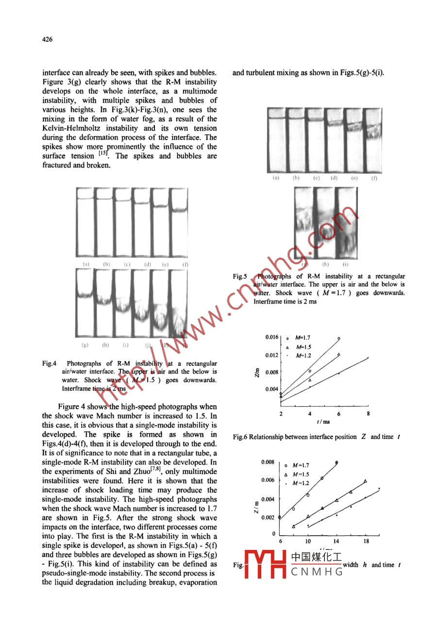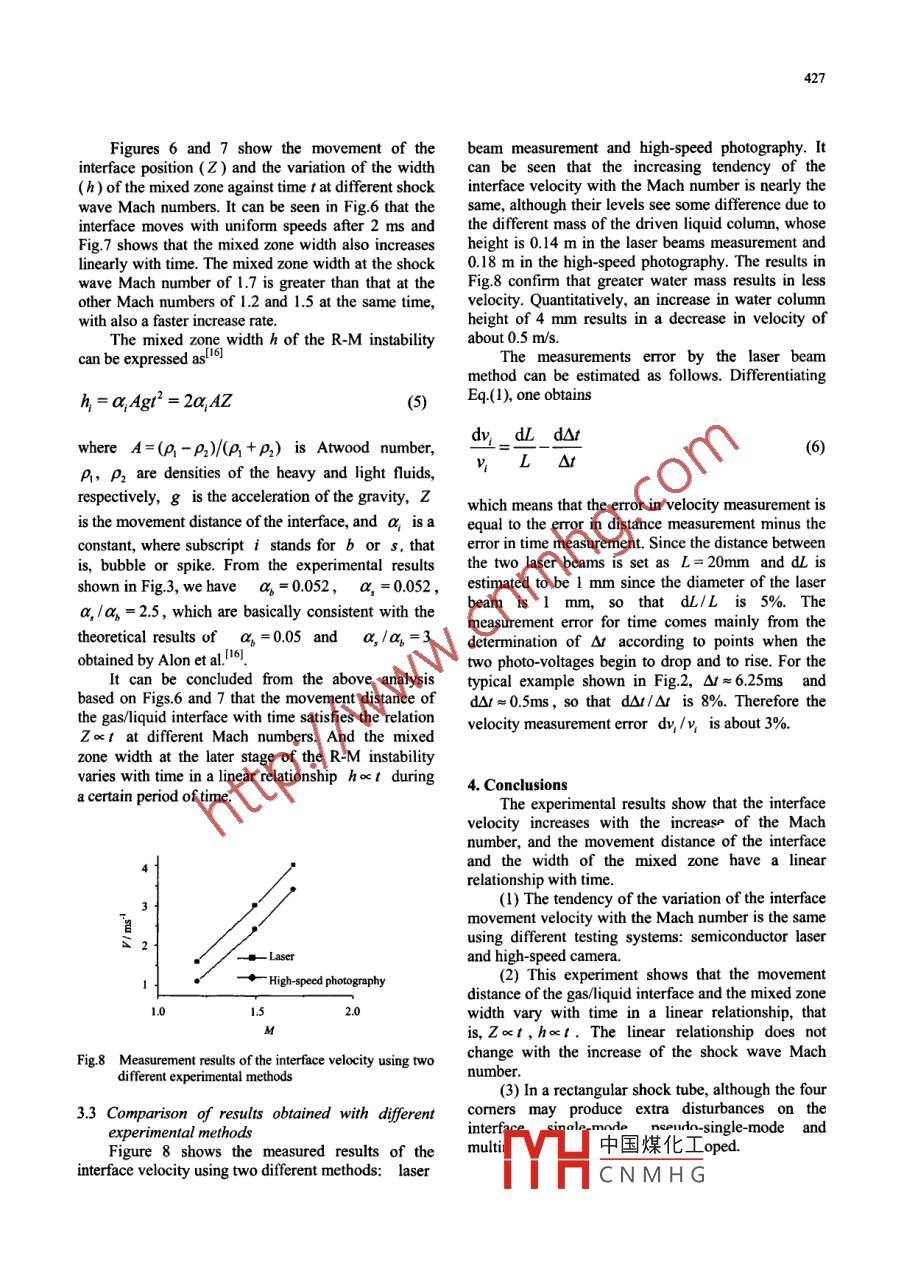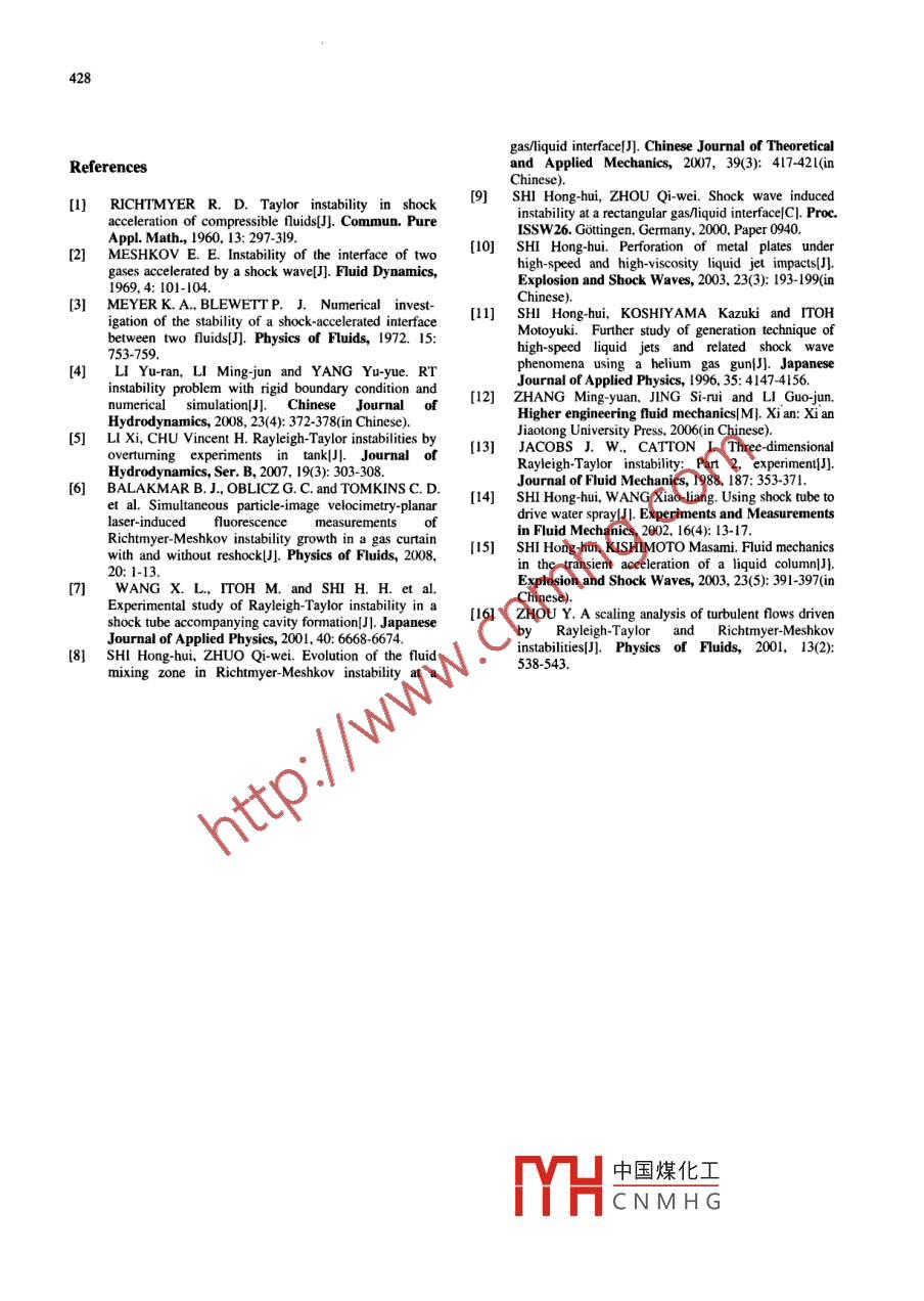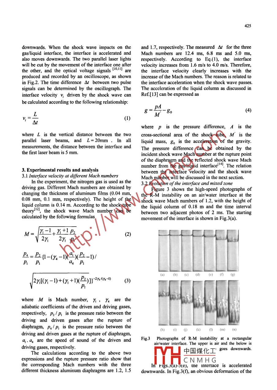 423Available online at www.sciencedirect.comScienceDirectJoumal of Hydrodynamicswww. sciencedirect .com/ELSEVIER2009,21(3):423-428DOI: 10.1016/S1001-6058(08)60166-3science/jounal/10016058EXPERIMENTAL STUDY ON THE MECHANISM OF THE RICHTMYER-MESHKOV INSTABILITY AT A GAS-LIQUID INTERFACE*SHI Hong-hui, ZHANG Ga, DU Kai, JIA Hui-xiaCollege of Mechanical Engineering and Automation, Zhejiang University of Science and Technology, Hangzhou310018, China, E-mail: hhshi@ zstu.edu.cn(Received November 3, 2008, Revised December 31, 2008)Abstract: The mechanism of the Richtmyer Meshkov instability was experimentally studied in a vertical rectangular shock tube. Thevelocity of the interface driven by the shock wave was measured by a self-designed measurement system, which consists ofsemiconductor lasers, signal amplification circuits, digital oscilloscope and computer. Tests were carried out at several shock waveMach numbers. In addition, the movement of the interface and the variation of the mixed zone width with time were recorded byhigh-speed photography. The experimental results show that the interface velocity increases with the increase of the Mach number,and the distance of the interface's movement and the width of the mixed zone vary with time in a linear relationship.Key words: Richtmyer Meshkov insability, shock wave, shock tube, laser, interface1. Introductioncarried out by Meshkov2! Meyer and Blewet'3The shock wave induced instability, so-calledcarried out a numerical simulation on the R-MRichtmyer-Meshkov (R-M) instabilityh.2, occursinstability using a two-dimensional Lagrangianwhen a shock wave passes through an interfaceinviscid hydrocode and a good qualitative agreementbetween two fluids with different densities. Thiswas found with the measured experimental data byinstability has important applications in a wide rangeMeshkov4. Numerical simulation about instabilityof technology fields. For example, it can be seen inwas also carried out by Li et al.*" and Li and Chu'S.InInertial Confined Fusion (ICF), Scramjet engine,2008, Balakumaro conducted the R-M experimentalunderwater supersonic jet, supersonic combustion, andstudy in a gas curtain.others. In addition, the R-M instability can also beIt is shown that the interface accelerated by theused to explain some natural phenomena, for instance,shock wave in the early stage is compressible andSupernova explosion.behaves almost in a linear manner, while in the laterThe R-M instability was first discovered in thestage it is nearly incompressible and behaves in anumerical research by Richtmyer in 1960, in whichnonlinear way. The main factor that makes thethe Richtmyer pulse model and the compresibleperturbation finally stabilize is the non-linear factors,theory of the R-M instability were proposed. In 1969,which include fluid compressibility, fluid property,the first experimental study on the R-M instability wasetc.. Therefore, a comprehensive research into theR-M instability phenomenon is necessary.The existing studies on the R-M instability* Project supported by the National Natural Sciencemostly focus on a gas/gas interface. For the R-MFoundation of China (Grant No. 10672144), the Naturalinstabil中國(guó)煤化工Wang et al."TScience Foundation of Zhejiang Province (Grant Noinventeof applying aY 107073).verticalYHC N M H Gtical rectangularBiography: SHI Hong-hui (1962-), Male, Ph. D.. Professorshock tube, Shi and Zhul!' investigated the R-M424instability using a CCD camera with framing rate ofThe high pressure and the low pressure sections100 fps. Based on their results, in this study, theare separated by a 0.04 mm or 0.1 mm thickinterface velocity driven by the shock wave wasaluminum diaphragm. The low pressure and themeasured by a measurement system which consists ofdischarging sections are separated by a tinfoil of 0.01semiconductor laser, signal amplification circuits,mm in thickness. The low pressure section is fileddigital oscilloscope and computer. Furthermore, thewith liquid, with two side windows for observation.movement of the interface was recorded by aAt the bottom of the liquid column, a 10 mm thick andhigh-speed camera with framing rate of 500 fps. The33 mm long square polytetrafluoroethylene (PTFE)experimental results were analyzed and discussed.plate is placed to ensure that the lower liquid surfacekeeps a plane shape in motion.When thehigh-pressure gas in the high pressure section reaches2. Experimental setupthe rupture pressure for the diaphragm, a shock wave2.1 General descriptionforms and moves downwards. When the shock waveFigure 1 shows the experimental setup of theimpacts on the liquid column and makes it accelerate,vertical rectangular shock tube, which mainly consiststhe R-M instability occurs. At the gas/liquid interface,of (1) a 500 mm long high pressure section fllingthe gas and the liquid are air and water, respectively.with nitrogen gas, (2) a 750 mm long low pressure2.2 Detailed experimental stepssection at atmosphere, and (3) a 200 mm longFirst, an aluminum diaphragm is placed betweendischarging section. All sections have the same squarethe high pressure and the low pressure sections and aCross section with inner width of 35 mm. The lengthtinfoil between the low pressure and the dischargingof the high pressure section is 2.5 times of that usedsections, respectively. Second, a certain amount ofby Shi and Zhuo's, for increasing the shock loadingwater is flled into the low pressure section. Third, thetime and improving the gas quality.laser and the oscilloscope are turned on, the parallelA pressure gauge and a valve are connected withbeams andne position of the Photodiode are adjusted.the high pressure section to control the pressure in theThen, the valve between the pressure reservoir andsection. The laser measurement system is placed onhigh pressure section is opened until the rupturethe both sides of the observation part of the lowpressure for the diaphragm is reached, and the instantpressure section. For the 