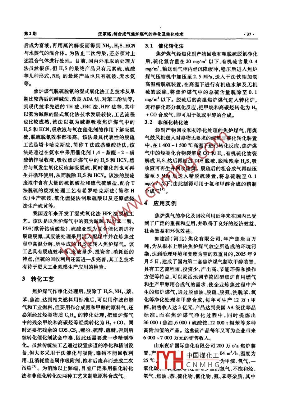 第2期汪家銘:制合成氣焦?fàn)t煤氣的凈化及轉(zhuǎn)化技術(shù)制合成氣焦?fàn)t媒氣的凈化及轉(zhuǎn)化技術(shù)汪家銘(川化集團(tuán)有限責(zé)任公司,四川成都610300)摘要:焦?fàn)t煤氣的凈化是其綜合利用的最為關(guān)健的工藝過程。本文簡逑了焦?fàn)t煤氣除焦油、除纂、洗氨、脫苯、脫硫脫氰等凈化工藝,介紹了采用催化轉(zhuǎn)化和非催化轉(zhuǎn)化制取氨和甲醇合成氣的工藝技術(shù),并用山東兗礦國際焦化有限公司焦?fàn)t煤氣凈化制取甲醇合成氣的實(shí)例來說明焦?fàn)t煤氣凈化處理工藝及其應(yīng)用。關(guān)鍵詞:焦?fàn)t煤氣;凈化;精制;合成氣中圖分類號(hào):TQ546文獻(xiàn)標(biāo)識(shí)碼B文章編號(hào):1003-3467(2008)02-0035-041概述2凈化技術(shù)焦?fàn)t煤氣是焦炭生產(chǎn)過程中煤炭經(jīng)高溫干餾出焦炭生產(chǎn)過程中煤炭干餾溫度為550℃,焦?fàn)t來的氣體產(chǎn)物,在煉焦產(chǎn)品中,按質(zhì)量計(jì)算,焦?fàn)t煤煤氣中有大量的H2S、COS、CS2、NH3、HCN、噻吩、硫氣占15%~18%,為全部產(chǎn)品的第二位。據(jù)統(tǒng)計(jì),黃、硫醚、焦油、萘、苯等化學(xué)物質(zhì)。焦?fàn)t煤氣經(jīng)過凈我國現(xiàn)有鋼鐵年生產(chǎn)能力已達(dá)32億t,按煉鐵每噸化和提取回收化工產(chǎn)品后成為回爐煤氣,回爐煤氣耗焦炭L.3t計(jì),焦炭年用量達(dá)4.16億’,煤炭煉焦的氣體組分一般為(%,以體積分?jǐn)?shù)計(jì)):H254-59,按1t煤焦產(chǎn)出焦?fàn)t煤氣320m3計(jì),每年可產(chǎn)生焦CH423-~28,C05.5~7,CO21.5~2.5,N23~5,爐煤氣1331.2億m3,若其中一半用作燃料回收利CHn2~3,O20.3-0.7。用,其余可供開發(fā)利用的焦?fàn)t煤氣也有665.6億2.1凈化工序m3,但目前僅有不到10%的焦?fàn)t煤氣被回收用于焦?fàn)t煤氣凈化工藝技術(shù)從20世紀(jì)50~60年代城市煤氣、發(fā)電燃料和生產(chǎn)化工產(chǎn)品,大量的焦?fàn)t煤的硫銨流程和濃氨水流程開始,到逐漸采用較為先氣直接排放燃燒,每年白白燒掉的焦?fàn)t煤氣有300進(jìn)的脫硫脫氰和氨回收技術(shù),如TH法、MEA法、AS多億m3,相當(dāng)于兩個(gè)西氣東輸工程設(shè)計(jì)的年輸氣法、真空碳酸鹽法等脫硫技術(shù),Pham法濃氨氣分量造成的經(jīng)濟(jì)損失達(dá)數(shù)百億元僅山西省每年就有解等氨回收技術(shù)。近年來采用的新技術(shù)有輕質(zhì)焦油150億m3焦?fàn)t煤氣直接排放燃燒極大地浪費(fèi)了寶初級(jí)洗萘磷銨溶液吸氨制取無水氨濃氨水制取碳貴的稀缺資源和能源嚴(yán)重污染了環(huán)境。酸氫銨、PDS法脫硫等。煤炭在焦?fàn)t中干餾時(shí)產(chǎn)生的混有焦油霧和水氣在具體應(yīng)用焦?fàn)t煤氣凈化工藝時(shí),應(yīng)根據(jù)生產(chǎn)以及各種雜質(zhì)的混合氣稱為粗煤氣,又稱荒煤氣,粗企業(yè)的實(shí)際情況及后續(xù)各類煤氣用戶對(duì)煤氣質(zhì)量的煤氣必須經(jīng)煤氣凈化裝置進(jìn)行處理將其焦油霧和要求,因地制宜選取合理的凈化工藝。焦?fàn)t煤氣的水以及各種雜質(zhì)除去得到凈煤氣后,才能用作工業(yè)凈化通常由煤氣冷卻、除萘除焦煙霧、煤氣輸送洗燃料、城市煤氣,并精制處理后才能作為化學(xué)合成的氨、脫苯脫硫脫氰等7個(gè)基本工序所組成雖然在原料氣具體應(yīng)用時(shí)工藝流程有所不同,但基本上是這7個(gè)焦?fàn)t煤氣凈化是將從焦?fàn)t炭化室中產(chǎn)生的粗煤工序的先后組合的匹配氣進(jìn)行各種相應(yīng)的工藝處理,除去雜質(zhì)得到凈煤氣從整體上看,目前國內(nèi)企業(yè)的焦?fàn)t煤氣凈化技同時(shí)回收各種化學(xué)產(chǎn)品的技術(shù)。本文簡要介紹焦?fàn)t術(shù)已達(dá)到國際先進(jìn)水平,凈化后的焦?fàn)t煤氣質(zhì)量達(dá)煤氣凈化處理的工藝技術(shù)及其應(yīng)用情況。到或超過國外同譽(yù)型化廠(數(shù)據(jù)見下頁表1)。在中國煤化工收稿日期:2007-10-22CNMHG作者簡介:汪家銘(1949-),男,工程師從事大型引進(jìn)化肥裝置設(shè)備管理和維5年后叢學(xué)化⊥L科夜期刊編輯及化工情報(bào)信息工作電話:(028)83621163。河南化工36HENAN CHEMICAL INDUSTRY2008年第25卷焦?fàn)t煤氣凈化的各工序中可供采用的凈化技術(shù)如氨。噴灑式飽和器生產(chǎn)硫銨、無飽和器生產(chǎn)硫銨蒸下:①煤氣冷卻。兩段式多段冷卻、上升管氣化冷卻氨槽蒸汽射節(jié)能、濃氨氣分解。⑤脫苯。高效填料與荒煤氣顯熱利用、循環(huán)氨水余熱利用。②除萘。吸收塔與旋流板捕霧器、高效換熱設(shè)備、高效加熱輕質(zhì)焦油洗萘、蒽油除萘與再生、富油洗萘與再生。爐、高效脫苯塔。⑥脫硫脫氰。FRC法、HPF法、AS③除焦油霧。蜂窩形電捕器與熱氨水清掃、電捕器循環(huán)洗滌法、真空碳酸鹽法、代亞毛克斯法、萘醌酸絕緣箱氮封、電捕器高效高壓直流電場整流。④洗鹽法。衰1國內(nèi)外相關(guān)企業(yè)焦?fàn)t煤氣凈化后的工藝指標(biāo)企業(yè)名稱焦油NHHaSHCN萘苯日本新日鐵大分廠0.50.50.3美國Amoo廠0.050.500.2中國寶鋼一期工程0.0l~0.0.05-0.010.060.08~0.011中國寶鋼二期工程01-00.050.19中國天津煤氣二廠0.050.03-0.010.020.01-0.020.2~0.3近年來國內(nèi)開發(fā)成功的投資省技術(shù)可行、運(yùn)行H1含量≤250mg/m3,HCN含量≤150mg/m3,因成本低的吸附法凈化工藝,其原理是利用多孔、高比此選用AS循環(huán)洗滌法脫除H2S和HCN就能滿足表面積