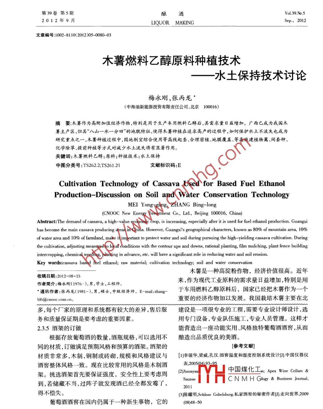 第39卷第5期2012年9月LIQUOR MAKING文章編號(hào):1002-8110(2012)05-0080-0木薯燃料乙醇原料種植技術(shù)水土保持技術(shù)討論梅永剛,張丙龍(中海油新能源投資有限責(zé)任公司,北京100016)摘要:木薯作為高附加值經(jīng)濟(jì)作物,特別是用于生產(chǎn)車用燃料乙醇后,其需求量日益增加。廣西已成為我國(guó)木薯主產(chǎn)區(qū),但其“八山一水一分田”的地貌特征,使得木薯種植在追求高產(chǎn)的過(guò)程中,如何保護(hù)水土不流失也成為研究重點(diǎn)之一,木薯種植過(guò)程中,因地制宜綜合使用等高線起壟、合理密植、地膜覆蓋、等高線建植物籬、間套種化學(xué)除草、提前種植等方式對(duì)減少水土流失將有顯著作用。關(guān)鍵詞:木薯燃料乙醇;原料;種植技術(shù);水土保持中圖分類號(hào):TS2622TS26121文獻(xiàn)標(biāo)識(shí)碼:ECultivation Technology of Cassava Used for Based Fuel EthanolProduction-Discussion on Soil and Water Conservation TechnologyMEI Yong-gang, ZHANG Bing-long(CNOOC New Energy Investment Co, Ltd, Beijing 100016, China)Abstract: The demand of cassava, a high-value economic crop, is inereasing, especially after it is used for fuel ethanol production. Guangxihas become the main cassava producing areas in China. However, Guangxi,'s geographical characters, known as 80% of mountain area, 10%of water area and 10% of farmland, make it important to protect water and soil during pursuing the high-yielding cassava cultivation. Duringthe cultivation, adjusting measures to local conditions with the contour ups and downs, rational planting, film mulching, plant fence buildingintercropping, chemical weeding, planting in advance, etc. will have a significant role in reducing water and soil erosion.Key words: cassava based fuel ethanol; raw material; cultivation technology; soil and water conservation木薯是一種高淀粉作物,經(jīng)濟(jì)價(jià)值很高。近年收稿日期:2012-08-15作者簡(jiǎn)介:梅永剛(1976-),男,學(xué)士,工程師。來(lái),作為現(xiàn)代工業(yè)原料的需求量日益增加,特別是用通訊作者:張丙龍(1981-),男,碩士,中級(jí)經(jīng)濟(jì)師。E-mail: zhang-于車用燃料乙醇原料后,國(guó)家已經(jīng)把木薯作為一個(gè)重要的經(jīng)濟(jì)作物加以發(fā)展。我國(guó)栽培木薯主要在北多,每個(gè)廠家的原理和系統(tǒng)都有較大的差異,售后服建設(shè)是一項(xiàng)很專業(yè)的工程,需要專業(yè)設(shè)計(jì)師設(shè)計(jì),選務(wù)和質(zhì)量保證期是要考慮的重要因素。用專門設(shè)備,專業(yè)隊(duì)伍施工,專業(yè)人員管理。這樣才23.5酒架的訂做能營(yíng)造出一座功能實(shí)用、風(fēng)格獨(dú)特葡萄酒酒窖,從而根據(jù)存放葡萄酒的數(shù)量,酒瓶規(guī)格,可以選用不釀造出品質(zhì)優(yōu)良的美酒。同的材質(zhì),訂做滿足預(yù)期風(fēng)格和預(yù)算的酒架。酒架的參考文獻(xiàn)]材質(zhì)非常多,木制,鋼制或磚砌,規(guī)模和風(fēng)格建議與[李銀華梁威孔漢酒客溫度和濕度控制系統(tǒng)設(shè)計(jì)中國(guó)儀器儀酒窖整體風(fēng)格一致?,F(xiàn)在比較常用的風(fēng)格是木制酒架。挑選酒架首先要保證強(qiáng)度,安全性上要考nm中國(guó)煤化工 s: Apex Wine Cellar&CNMH Glogy& Business Journal到,若儲(chǔ)藏不當(dāng),過(guò)陣子就發(fā)現(xiàn)酒已經(jīng)全都發(fā)霉了,2011得不償失。阝3陳耀明 Schloss gobelsburg.私家酒窖的秘密作者J走向世界,2009葡萄酒酒窖在國(guó)內(nèi)仍屬于一種新生事物,它的第五期梅永剛,等:木薯燃料乙醇原料種植技術(shù)——水土保持技術(shù)討論2012緯26度以南種植,主產(chǎn)區(qū)分布在廣西、廣東兩省造成嚴(yán)重的水土流失,導(dǎo)致土壤瘠薄干旱。(區(qū)),海南、云南次之。廣西地處亞熱帶,北回歸線橫貫中部,陽(yáng)光充足,雨量充沛,木薯種植面積僅次于水稻、水果、甘蔗。豐富的木薯資源,使廣西發(fā)展木薯燃料乙醇產(chǎn)業(yè)具有得天獨(dú)厚的優(yōu)勢(shì),但廣西“八山水一分田”的地貌特征,使得木薯種植在追求高產(chǎn)的過(guò)程中,如何保護(hù)水土不流失也成為研究重點(diǎn)之一。木薯種植水土保持問(wèn)題的提出木薯多在雨季開始時(shí)種植,因木薯株行距較寬,苗期生育期長(zhǎng)、生長(zhǎng)慢,難以及早覆蓋地表,且傳統(tǒng)方式種植很少采取水土保持措施,當(dāng)木薯苗期遇上較大的降雨量和降雨強(qiáng)度大,缺少覆蓋的口露地表坡地等高耕作起壟有助于水土保持。當(dāng)雨水和極易造成嚴(yán)重沖刷,特別是遇上暴雨時(shí),短時(shí)間內(nèi)就表土順坡流下時(shí),往往被高壟節(jié)節(jié)攔截,自然留下泥流失大量土壤,嚴(yán)重的甚至沖毀木薯,并形成溝狀侵土、養(yǎng)分,同時(shí)雨水可以自然順著壟間低洼處的疏松蝕。因此,相對(duì)其他作物,木薯地的水土流失情況相泥土浸漏入下層。即使大雨,也不易沖走大土塊,發(fā)對(duì)嚴(yán)重。揮較好的水土保持作用水土流失不僅與當(dāng)?shù)赝寥蕾|(zhì)地、坡度、降雨量及2.2合理密植降雨時(shí)間長(zhǎng)短等自然條件有關(guān),而且與木薯的種植過(guò)度密植,不利木薯健康生長(zhǎng)和增產(chǎn),而木薯疏方法有極大的相關(guān)性,如木薯地過(guò)度犁耙整地、不起植且疏于管理,造成長(zhǎng)時(shí)間難以封行,易引起嚴(yán)重水畦或順坡起畦、疏植等傳統(tǒng)種植方法,是造成木薯地土流失,也難以提高木薯產